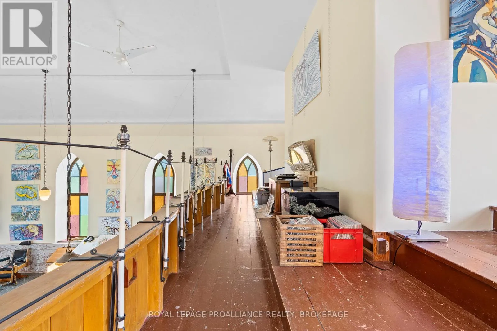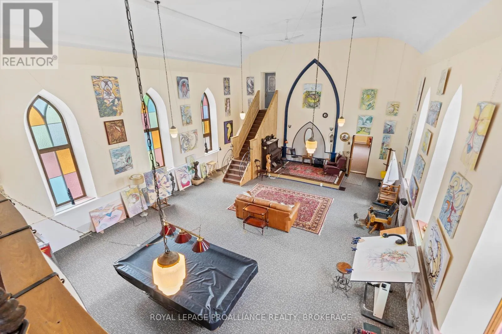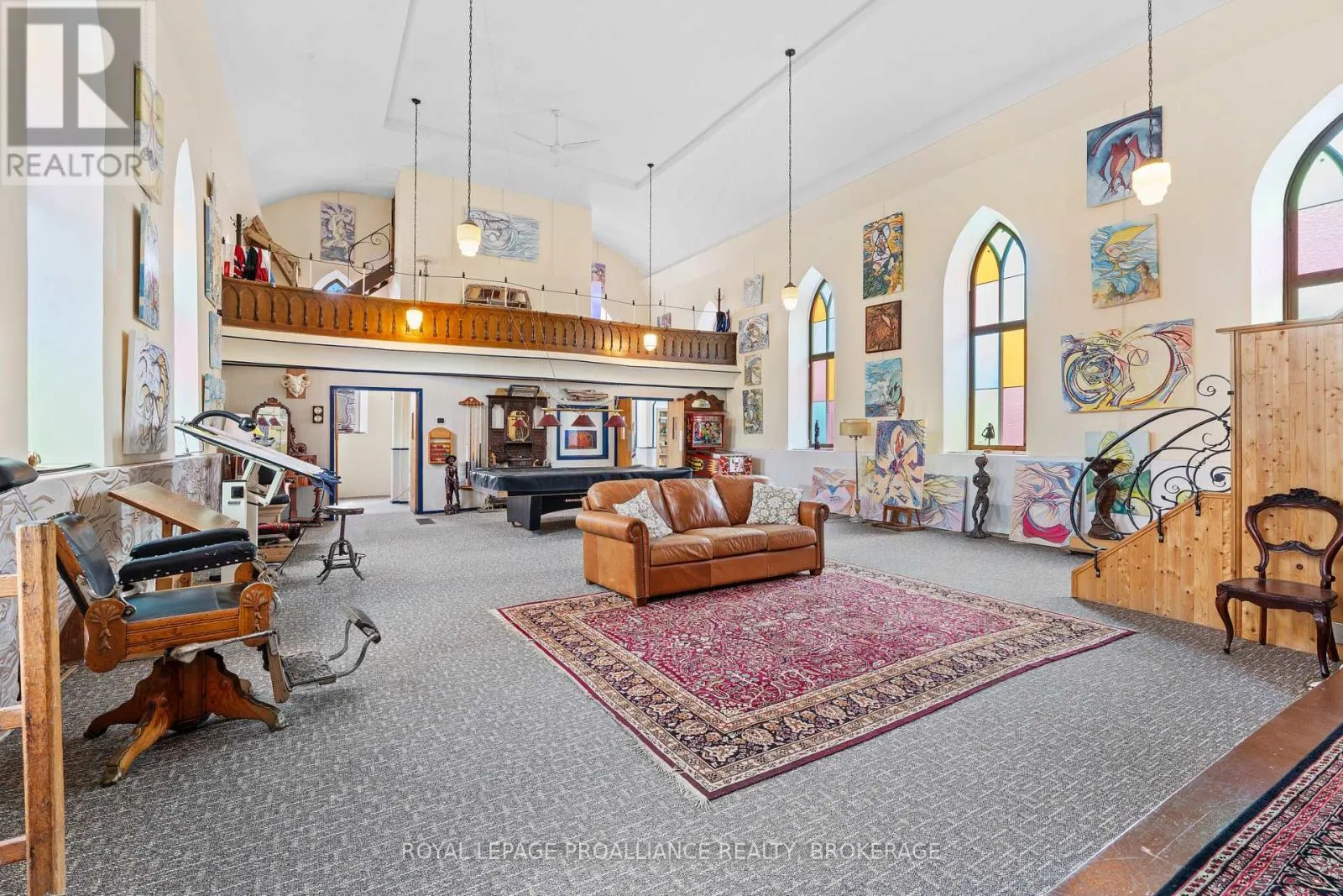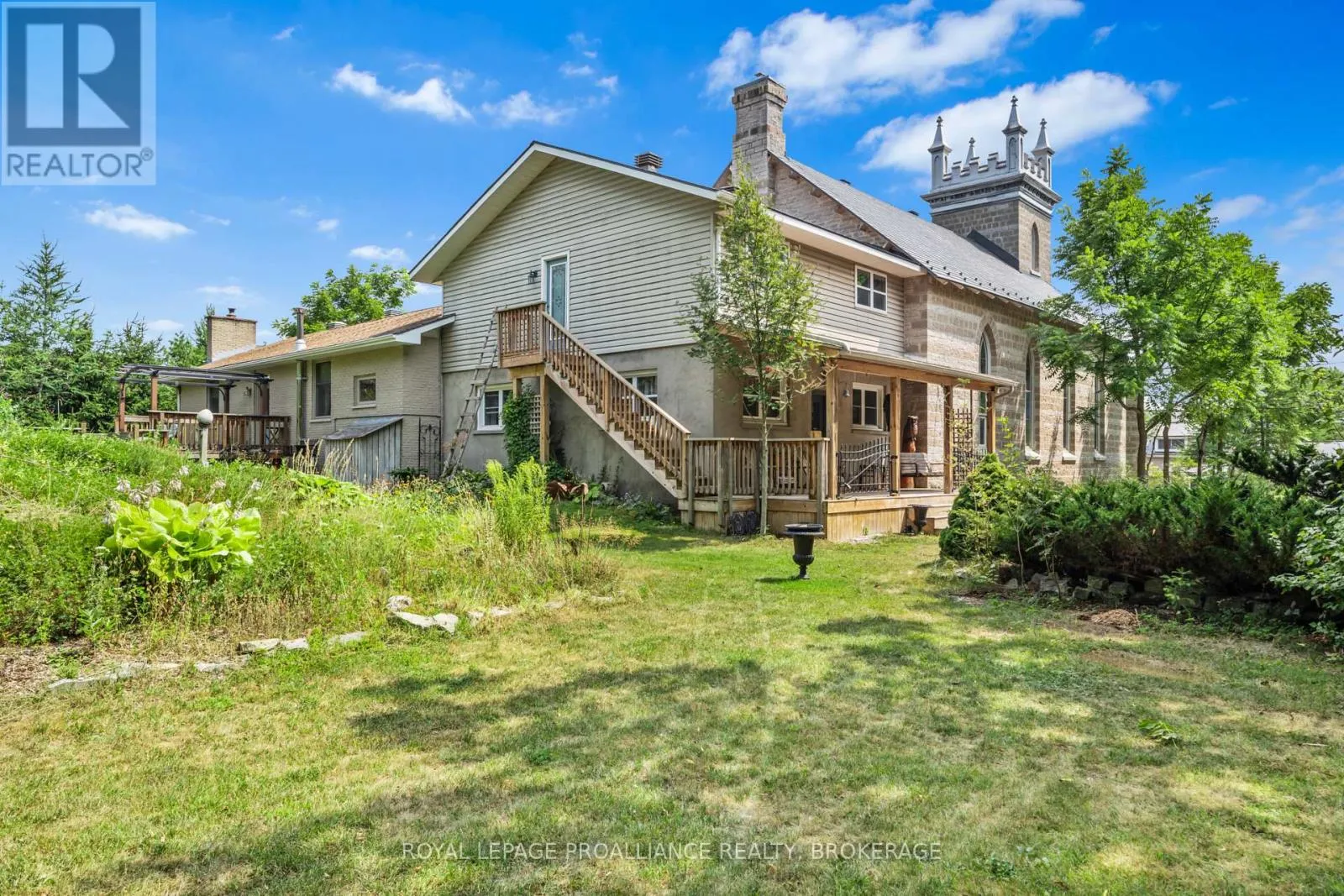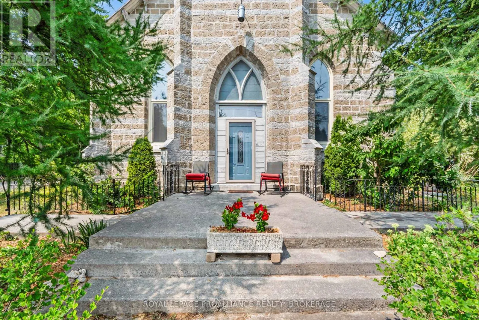 Highway 38 to Harrowsmith Road Welcome to 3958 Harrowsmith Road -- a truly unique property in the heart of the charming village of Harrowsmith. This former church with a spacious residential addition presents a rare opportunity for personal living, business potential, or both. Zoned UC-1 (commercial), its perfect for a home office or other venture! The original church showcases stunning limestone architecture, with a bright, open "Nave" featuring soaring ceilings and vibrant stained glass windows. The bell tower remains intact with stairs to the top offering potential to finish and a bathroom rough-in adds future flexibility. The upper balcony/gallery is in excellent condition and provides ample space for creative use. The rear addition offers a generous amount of living space, beginning with a large foyer and flowing into the main living area with a cozy wood-burning fireplace and walkout to a spacious deck. The kitchen features a unique split layout with ample cabinetry. Two bedrooms are on the main level, including a primary suite with a 4-piece ensuite, plus a large 2-piece bath. The lower level includes two more bedrooms, an office/den, a 4-piece bath, and a laundry area, perfect for families or in-law suite potential. Upstairs, a 600 sq. ft. loft is currently used as a workshop. The back section has a block foundation and is independently serviced by air, a furnace, a heat pump, and its own eco septic system. The front section of the home is on a stone foundation with a holding tank and is serviced by a hot water tank, a furnace, and a heat pump. Electric baseboards are also a source of heat. The property has ample parking for residential and commercial needs, an EV charger, and fibre-optic high-speed internet is available and is just a short walk from the K&P and Cataraqui Trails. Come see it for yourself! (id:27476)