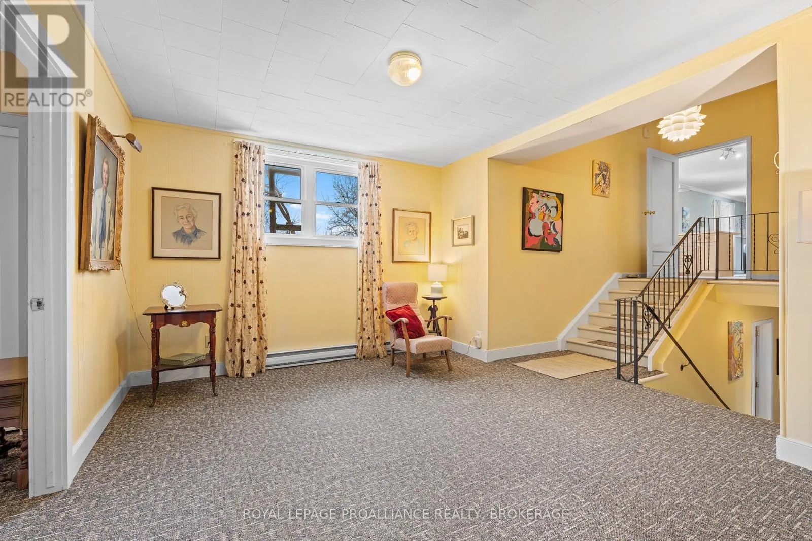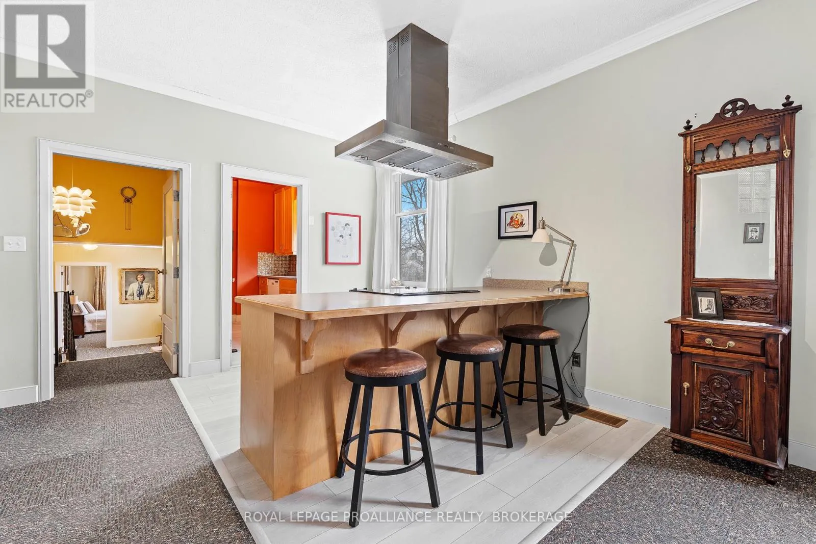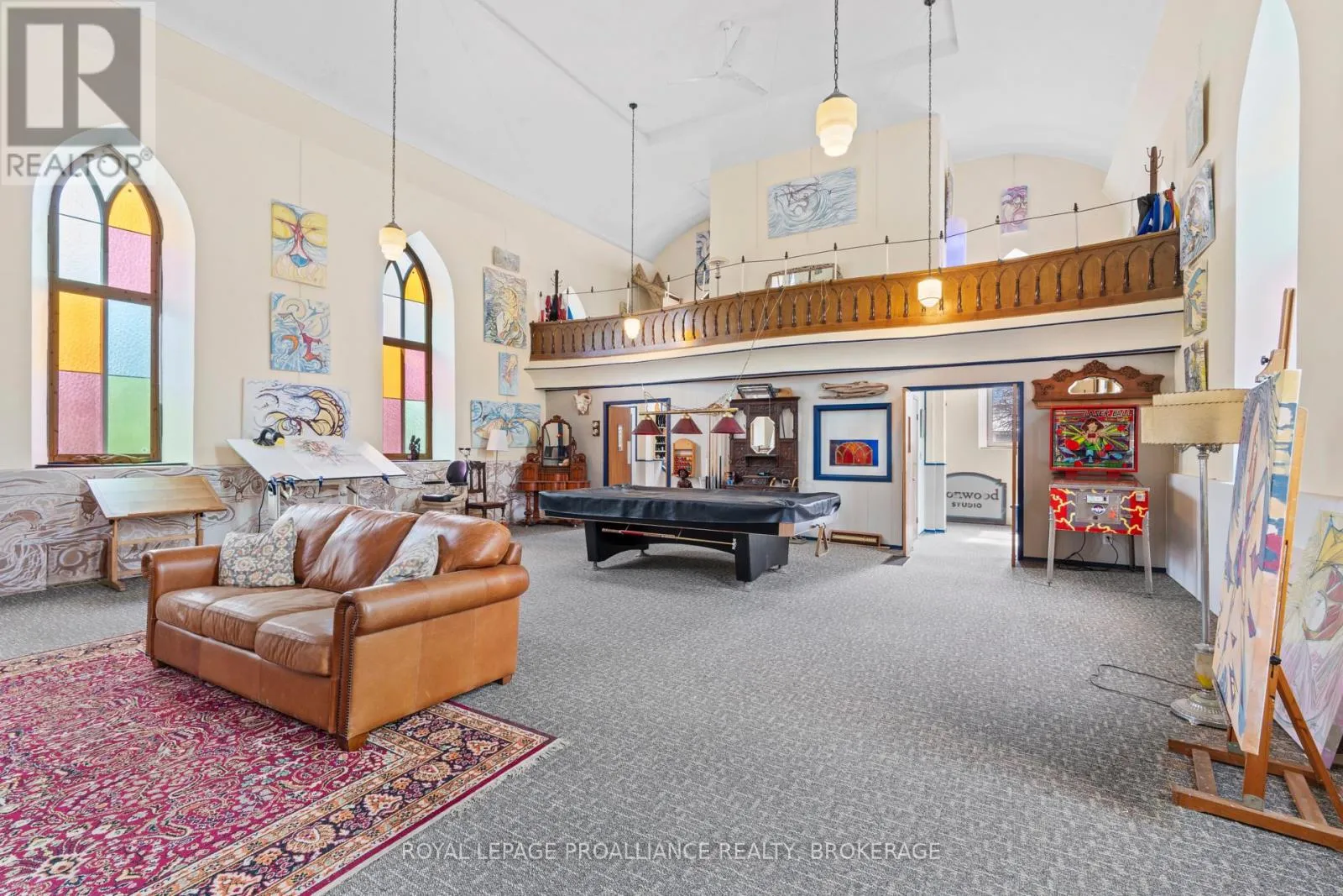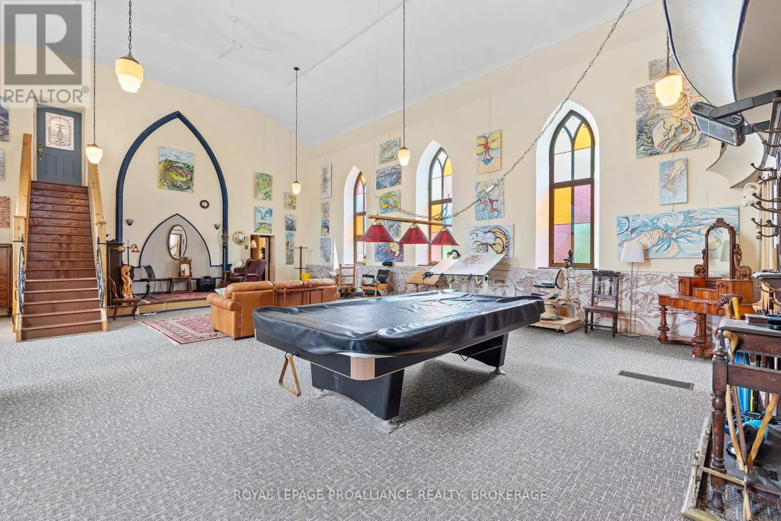 Highway 38 to Harrowsmith Road Welcome to 3958 Harrowsmith Road -- a truly unique property in the heart of the charming village of Harrowsmith. This former church with a spacious residential addition presents a rare opportunity for personal living, business potential, or both. Zoned UC-1 (commercial), its perfect for a home office or other venture! The original church showcases stunning limestone architecture, with a bright, open "Nave" featuring soaring ceilings and vibrant stained glass windows. The bell tower remains intact with stairs to the top offering potential to finish and a bathroom rough-in adds future flexibility. The upper balcony/gallery is in excellent condition and provides ample space for creative use. The rear addition offers a generous amount of living space, beginning with a large foyer and flowing into the main living area with a cozy wood-burning fireplace and walkout to a spacious deck. The kitchen features a unique split layout with ample cabinetry. Two bedrooms are on the main level, including a primary suite with a 4-piece ensuite, plus a large 2-piece bath. The lower level includes two more bedrooms, an office/den, a 4-piece bath, and a laundry area, perfect for families or in-law suite potential. Upstairs, a 600 sq. ft. loft is currently used as a workshop. The back section has a block foundation and is independently serviced by air, a furnace, a heat pump, and its own eco septic system. The front section of the home is on a stone foundation with a holding tank and is serviced by a hot water tank, a furnace, and a heat pump. Electric baseboards are also a source of heat. The property has ample parking for residential and commercial needs, an EV charger, and fibre-optic high-speed internet is available and is just a short walk from the K&P and Cataraqui Trails. Come see it for yourself! (id:27476)