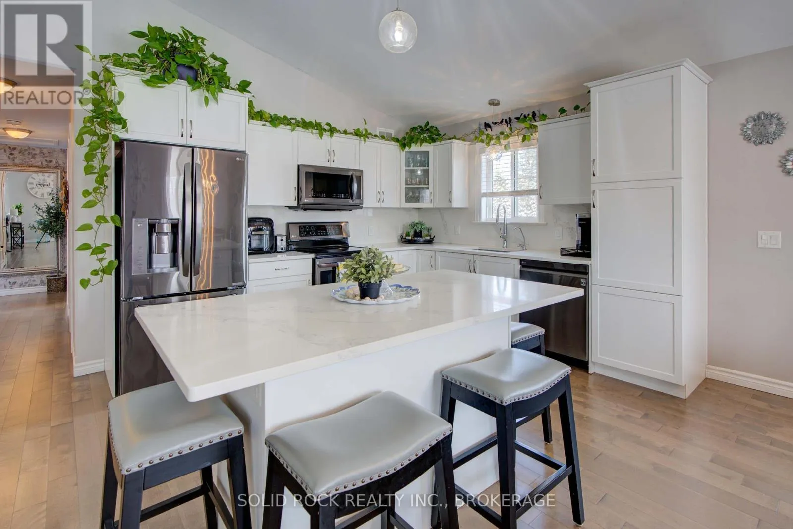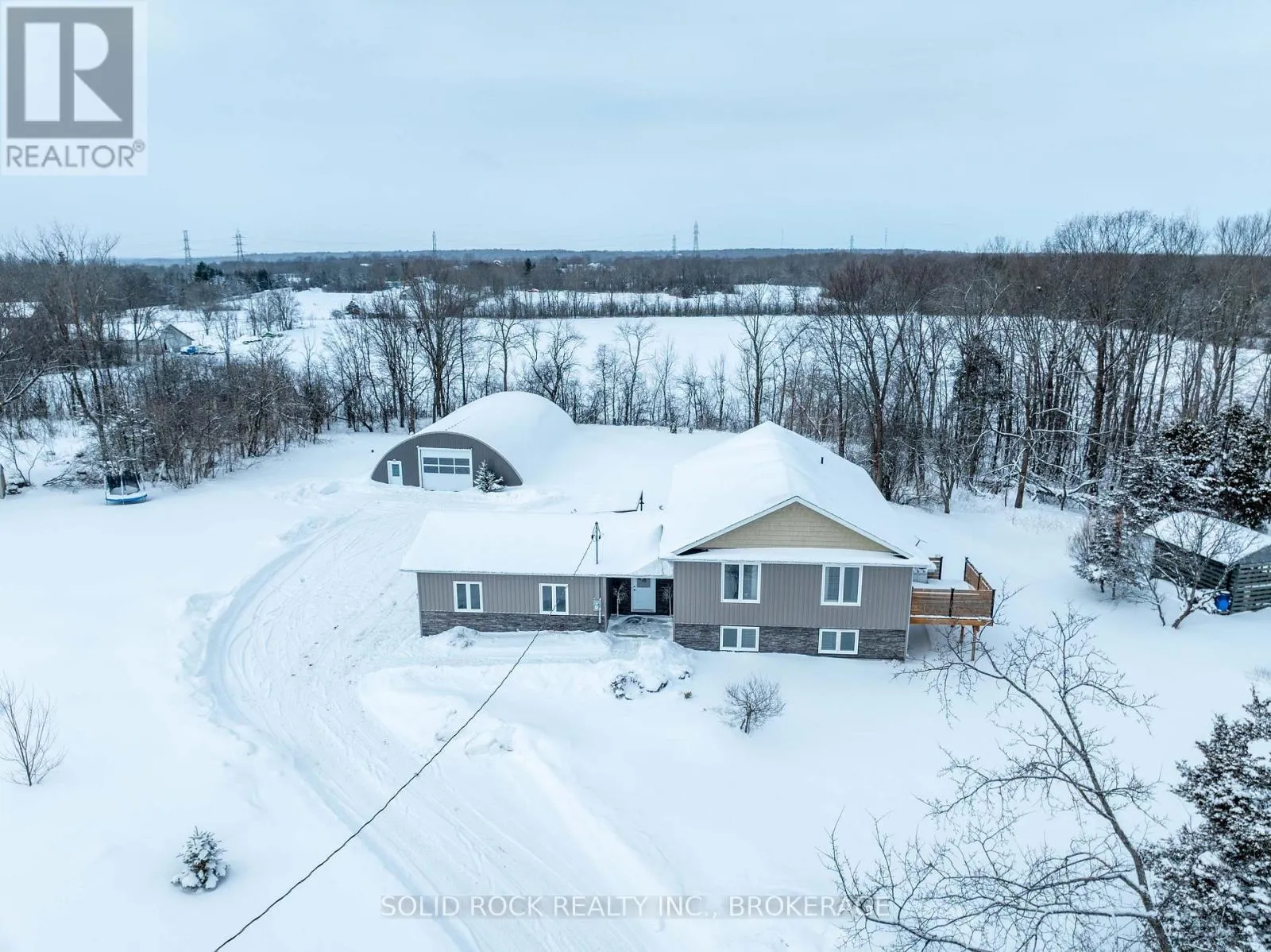 Cross Streets: Murton Rd. ** Directions: Hwy 38 to Murton Rd to Murvale Rd. Peaceful country living just 15 minutes north of Kingston! This meticulously maintained, 4-bedroom, 3-bath elevated bungalow offers space, privacy, and modern comfort. Bright open-concept main level with large windows, quartz kitchen countertops and backsplash, and brand-new hardwood floors throughout. French doors off the dining area lead to a spacious deck for easy indoor-outdoor living, while a custom fireplace adds warmth to the living room. The main floor includes 3 bedrooms, including a primary with ensuite and an additional stylish full bathroom. The fully finished lower level features a large rec room with fireplace, 4th bedroom, and a full bath with walk-in shower - ideal for guests or extended family. Pool table included. Bonus: impressive 36' x 60' Quonset hut perfect for a workshop, oversized garage, storage, or home-based business. Move-in ready with room to live, work, and play. (id:27476)