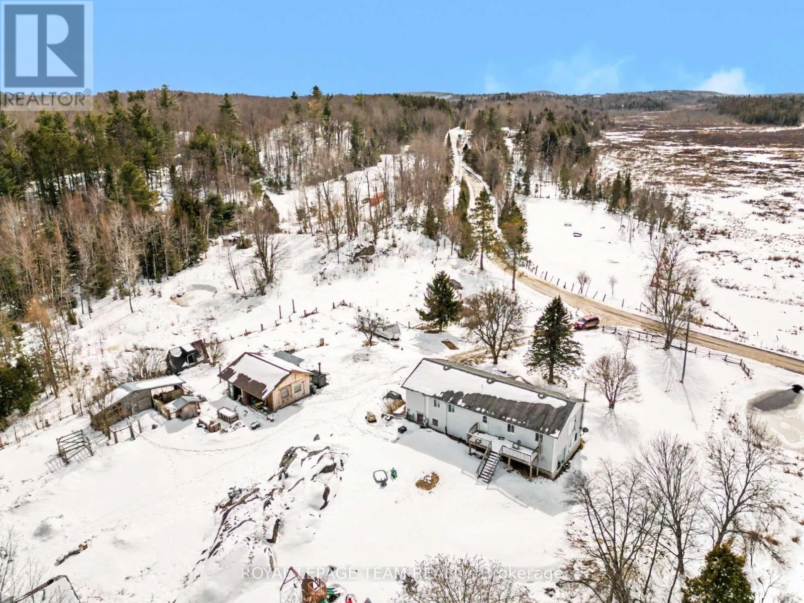 Cross Streets: Seouls Corner Lane & Bell Line Rd. ** Directions: From Kingston, North on Road 38, Left on Hwy 7, Right on 509 Road, Left on Bell Line Road to #4237. Welcome to 4237 Bell Line Road, a country lover's dream and the perfect setting for those seeking a peaceful, SELF-SUFFICIENT lifestyle with HOBBY FARM potential. Ideally located on a QUIET ROAD yet only 5 minutes from Highway 7, this beautiful property offers the best of rural living with convenient access to nearby amenities. Set on 13.6 ACRES of rolling hills and mature forest, the property features stunning rock outcroppings, a private pond, and a GENTLE CREEK flowing alongside the land. The home offers 2400+ sq ft living space on two levels, 4 BEDROOMS and 2 FULL BATHROOMS, second level laundry room with deck access, plus a HUGE 2ND FLOOR DEN used as an office and recreation space. The bright, OPEN MAIN FLOOR features a welcoming country kitchen, dining area with yard access, and a cozy living room with wood stove. A full bathroom and utility room/basement complete the main level. Many areas of the home have been freshly painted with new flooring installed on stairs and den as well as in the laundry room. The home can be heated with an exterior WOOD FURNACE, with wood easily harvested from the property; while an additional PROPANE FURNACE was installed in 2026. With currently only electricity connected to municipal services, this property could go completely OFF-GRID if solar panels are installed. Outside you'll find a OVERSIZED GARAGE, utility shed, a two storey cow/feed BARN, and not one but two CHICKEN COOPS. SCHOOL BUS SERVICE stops right at the driveway, and the road is prioritized for winter maintenance as part of the bus route. Located just 15 MINUTES FROM SHARBOT LAKE, where you'll find grocery, pharmacy, bank, marina, restaurants, brewery, LCBO, schools, parks, and a beautiful public beach. If you are looking for space, privacy, and a connection to nature without sacrificing convenience, 4237 Bell Line Road offers a rare opportunity to enjoy the very best of country living. (id:27476)