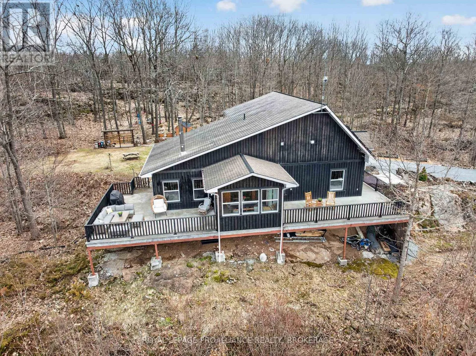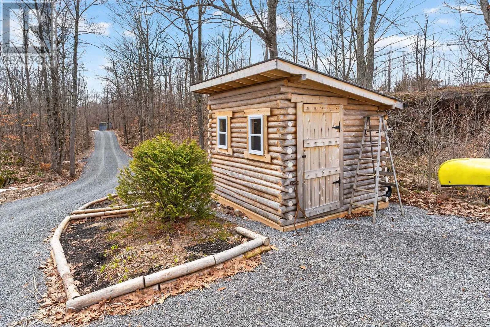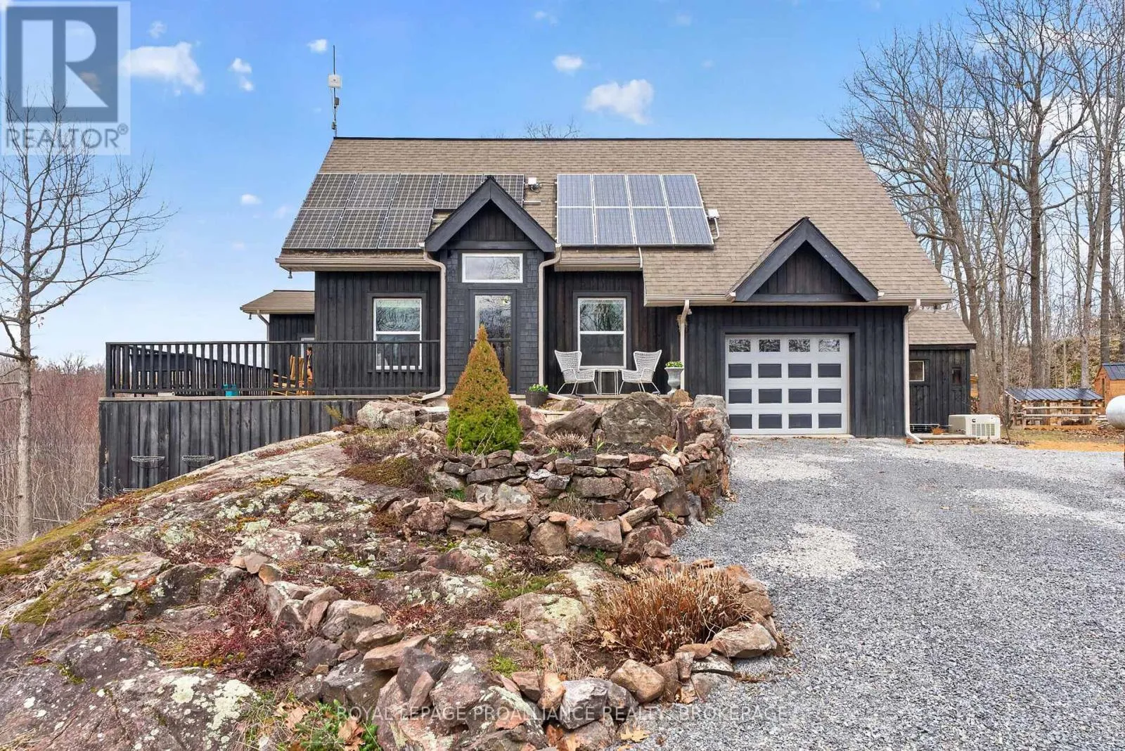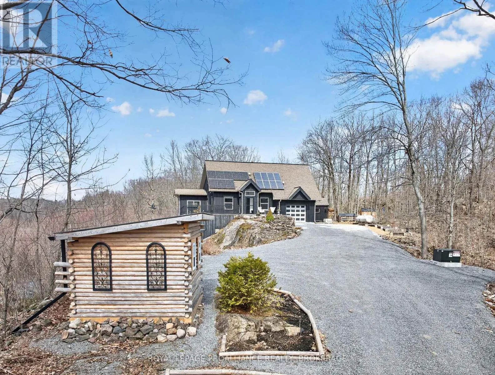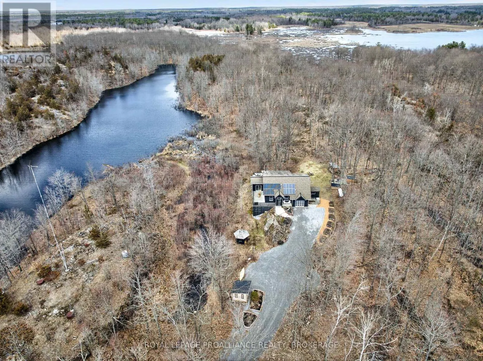 Cross Streets: North Shore Road / North Shore Crescent. ** Directions: North Shore Road just North of Lobourough Lake. Follow to #5025. Discover complete privacy on this 20 acre property surrounded in hardwood forest, located just 25 minutes north of Kingston. Surrounded by nature and set well back from the road, this secluded retreat features winding trails throughout the property, perfect for walking, exploring, and enjoying the peaceful landscape year-round. At the heart of the property sits a beautifully updated 2-storey slab-on-grade home, designed for both comfort and efficiency. Featuring a Legalett radiant heating system, slate flooring in select areas, and a ductless heat pump for air conditioning and an on-demand generator, this home delivers modern, energy-conscious living. The home has an attached garage and is fully connected to the hydro grid, while also benefiting from solar panels and a wind turbine system that feeds power back to the grid, offering valuable supplemental income and long-term sustainability. The main floor offers two spacious bedrooms, including a primary suite with a 4-piece ensuite, along with a 3-piece main bathroom. The living room is enhanced by custom built-in cabinetry and cozy window seats, creating a warm and functional space to unwind. A welcoming family room with a Jotul woodstove adds charm and comfort, while the recently renovated custom kitchen provides a stylish hub for cooking and entertaining. Upstairs, a large third bedroom offers flexible space for guests, a home office, or studio. The house has plenty of storage throughout including a fully accessible attic. There is a bright 4-season sunroom/dining room located just off the kitchen which gives access to expansive concrete decks overlooking the pond, offering peaceful, uninterrupted views of abundant wildlife in total seclusion. Outdoors, enjoy your own private wellness retreat featuring a sauna, two cold plunge tubs, and a fire pit area - all surrounded by nature. The trails located throughout the property allow you to experience the full beauty of the property right from your doorstep. (id:27476)