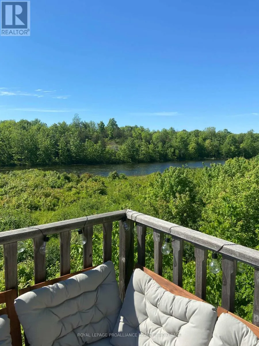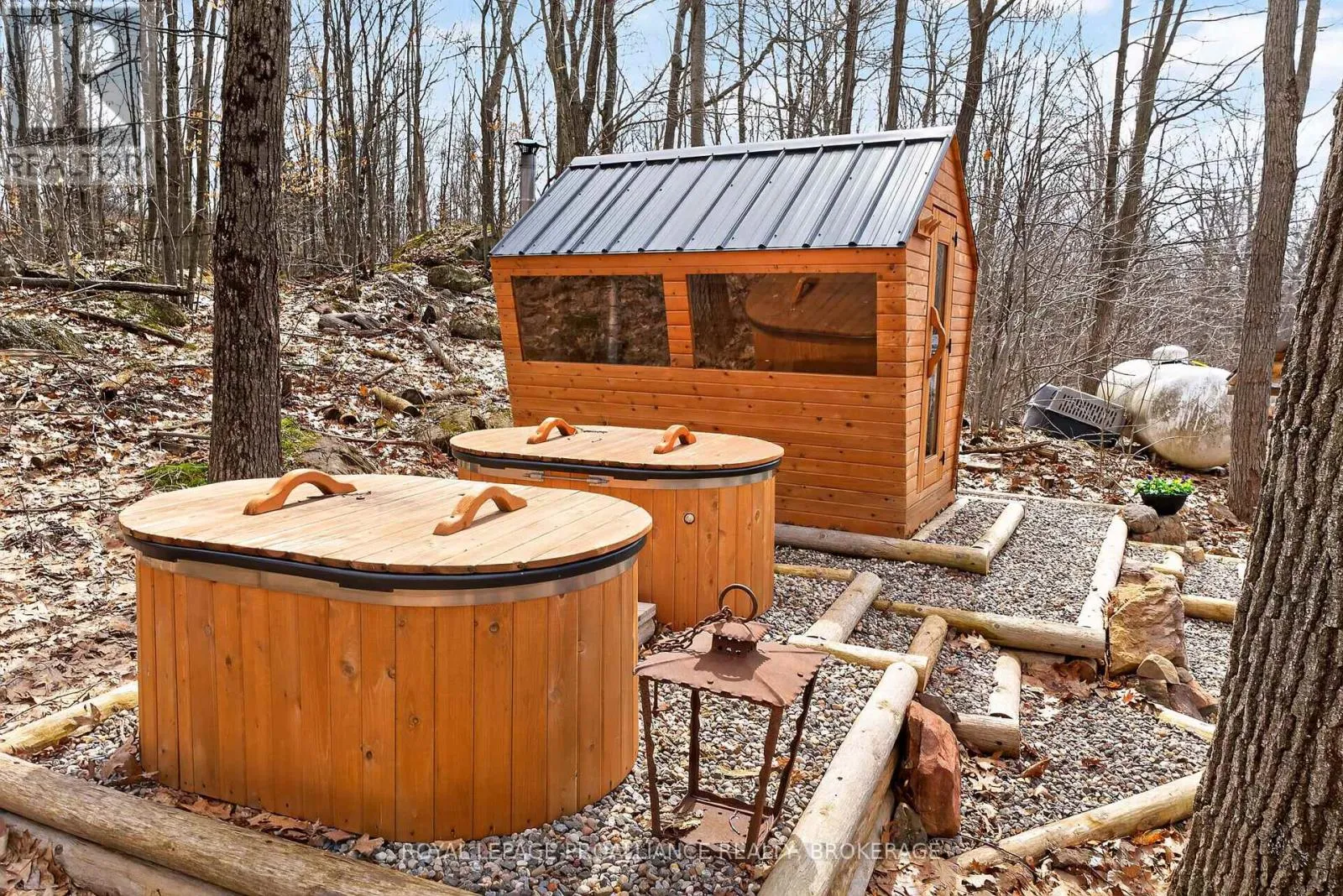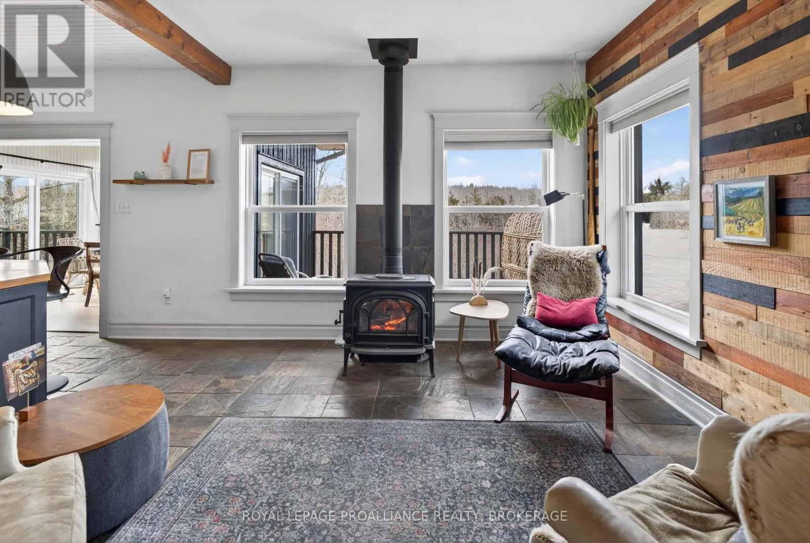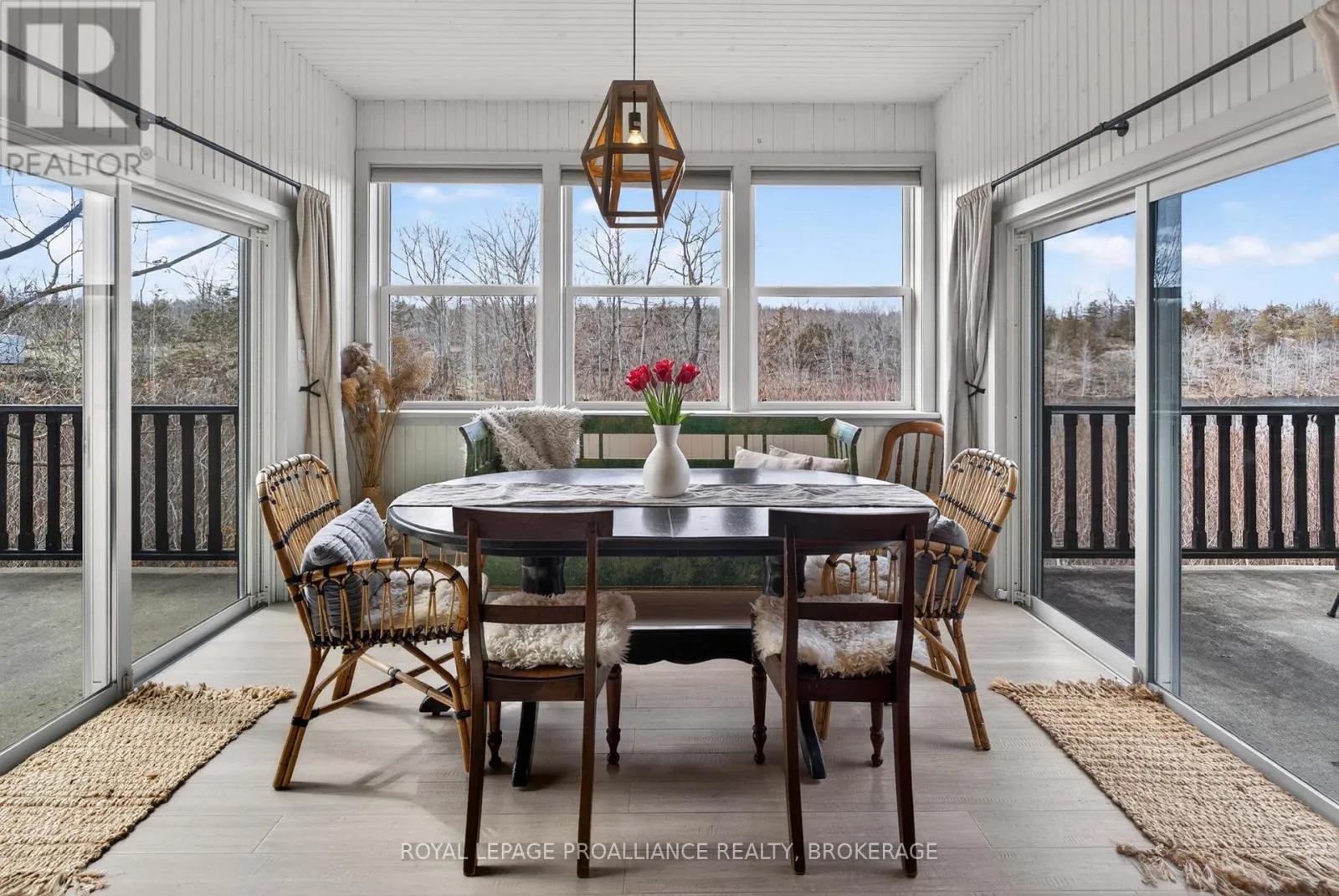 Cross Streets: North Shore Road / North Shore Crescent. ** Directions: North Shore Road just North of Lobourough Lake. Follow to #5025. Discover complete privacy on this 20 acre property surrounded in hardwood forest, located just 25 minutes north of Kingston. Surrounded by nature and set well back from the road, this secluded retreat features winding trails throughout the property, perfect for walking, exploring, and enjoying the peaceful landscape year-round. At the heart of the property sits a beautifully updated 2-storey slab-on-grade home, designed for both comfort and efficiency. Featuring a Legalett radiant heating system, slate flooring in select areas, and a ductless heat pump for air conditioning and an on-demand generator, this home delivers modern, energy-conscious living. The home has an attached garage and is fully connected to the hydro grid, while also benefiting from solar panels and a wind turbine system that feeds power back to the grid, offering valuable supplemental income and long-term sustainability. The main floor offers two spacious bedrooms, including a primary suite with a 4-piece ensuite, along with a 3-piece main bathroom. The living room is enhanced by custom built-in cabinetry and cozy window seats, creating a warm and functional space to unwind. A welcoming family room with a Jotul woodstove adds charm and comfort, while the recently renovated custom kitchen provides a stylish hub for cooking and entertaining. Upstairs, a large third bedroom offers flexible space for guests, a home office, or studio. The house has plenty of storage throughout including a fully accessible attic. There is a bright 4-season sunroom/dining room located just off the kitchen which gives access to expansive concrete decks overlooking the pond, offering peaceful, uninterrupted views of abundant wildlife in total seclusion. Outdoors, enjoy your own private wellness retreat featuring a sauna, two cold plunge tubs, and a fire pit area - all surrounded by nature. The trails located throughout the property allow you to experience the full beauty of the property right from your doorstep. (id:27476)