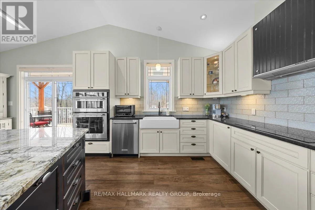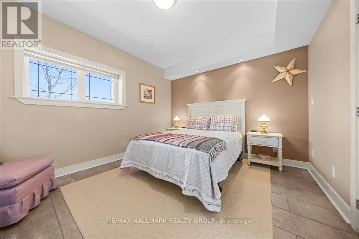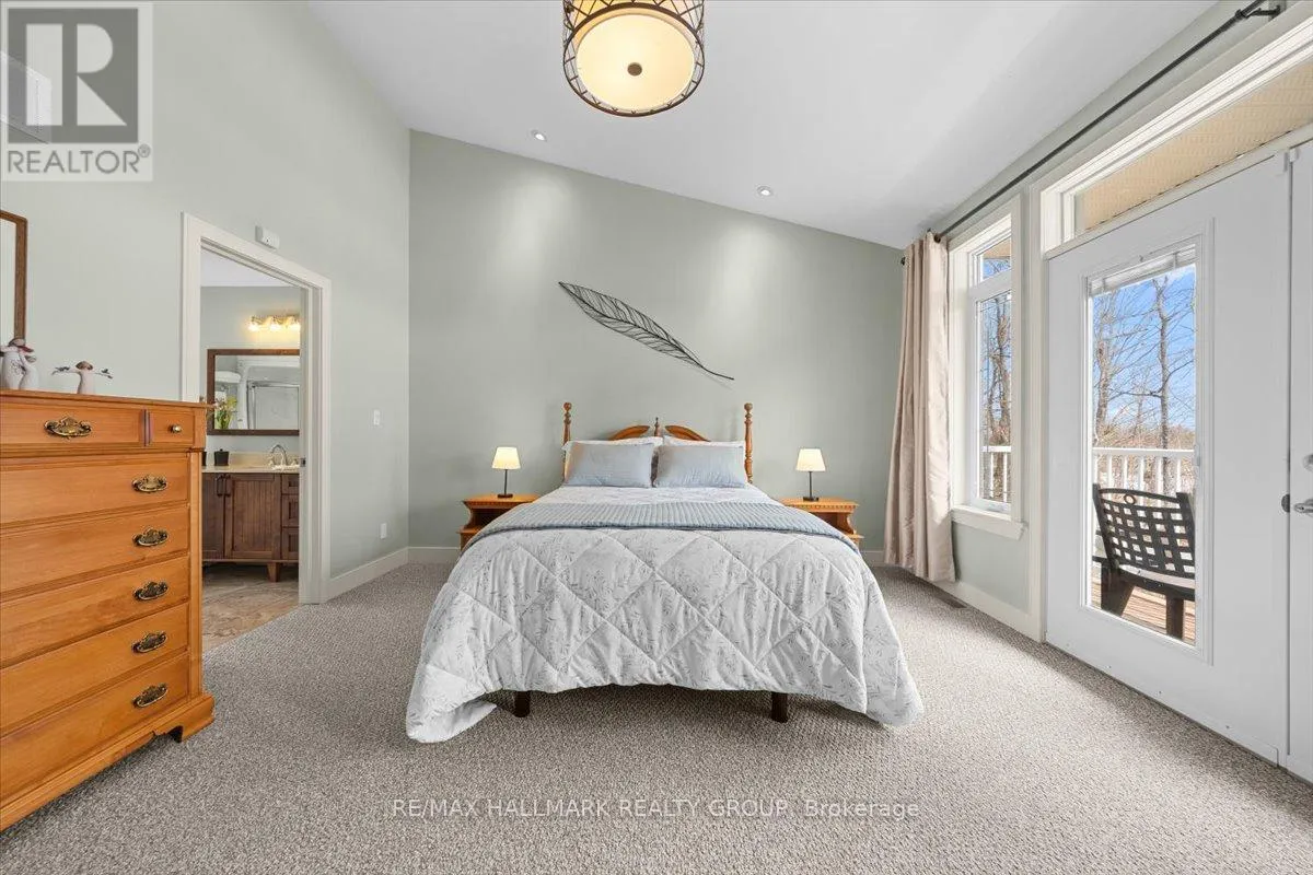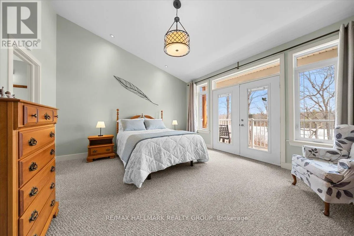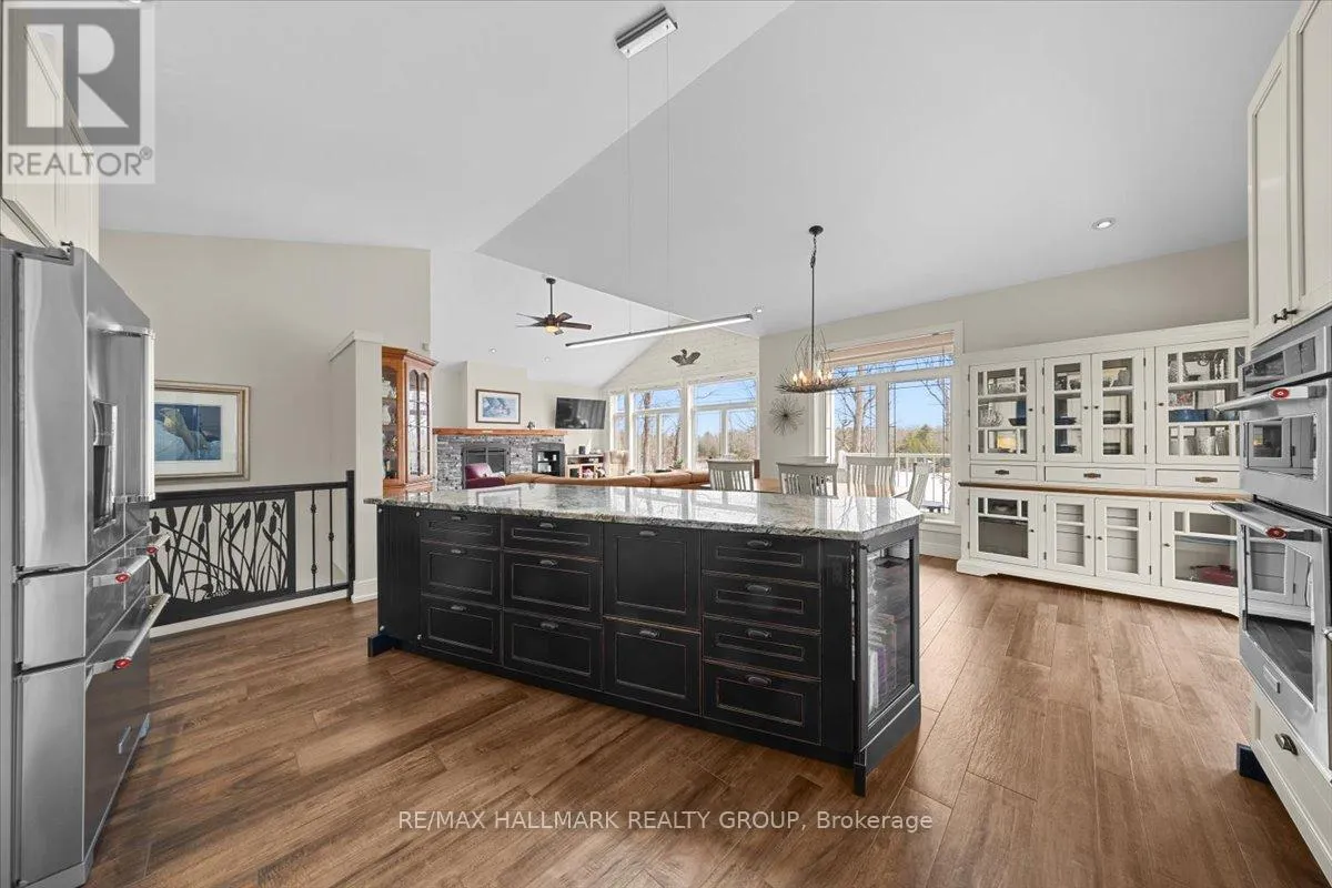 From HWY 15 near Elgin, South on County Road 42, Left onto Bedford, Continue onto Salem Rd, Continue onto S Frontenac Rd 8 which turns into Westport Road, Entrance to property on the left Welcome to a rare, custom-built waterfront bungalow with walkout, set on a private 13-acre estate with over 500 ft of shoreline on exclusive Fermoy Lake, a non-public lake known for its peaceful setting, excellent swimming, and fishing. Surrounded by mature hardwood forest and abundant wildlife, this property offers true privacy and a connection to nature that is increasingly hard to find. Thoughtfully designed with over 3,200 sq ft of living space, this 5-bedroom home blends upscale finishes with practical, low-maintenance living. The sun-filled, south-facing main level features 9'-12' ceilings, expansive windows, and an open-concept layout with a stunning great room, natural stone fireplace, and a chef-inspired kitchen complete with a 10' granite island, farmhouse sink, and premium KitchenAid appliances. Continuous porcelain plank flooring enhances durability and flow. The walkout lower level offers radiant heated floors, bright living spaces, additional bedrooms, a full bath, and flexible space for recreation, work, or guests, plus a reinforced concrete safe room/cold storage. Built with high-performance construction including ICF foundation, spray foam insulation, radiant heating (home & garage), HRV, tankless water heater, and generator-ready systems. Outdoors, enjoy a sandy beach, floating dock, swim raft, lakeside firepit, multiple patios, and professionally landscaped grounds. Includes an oversized heated garage (2020) and a fully insulated Bunkie with Wi-Fi, heat & A/C. A truly one-of-a-kind waterfront lifestyle property. (id:27476)