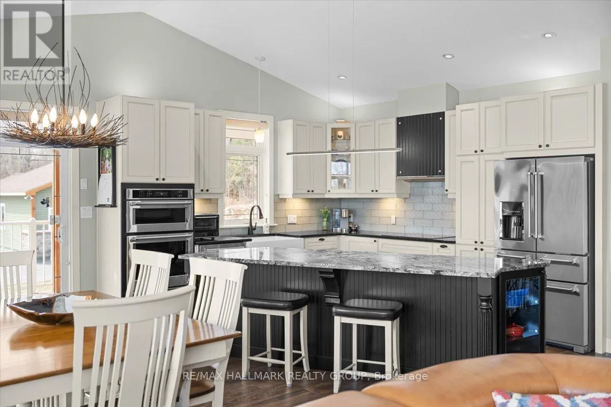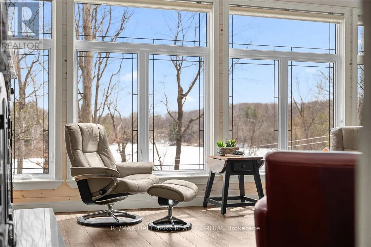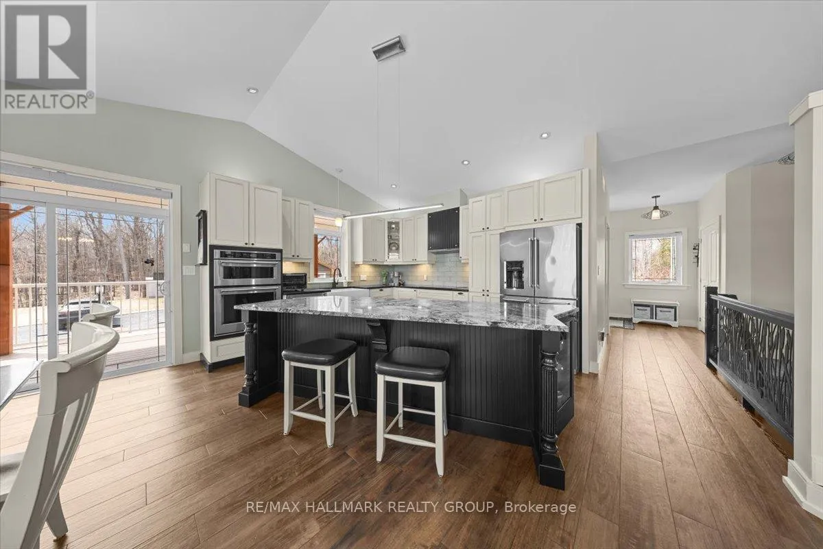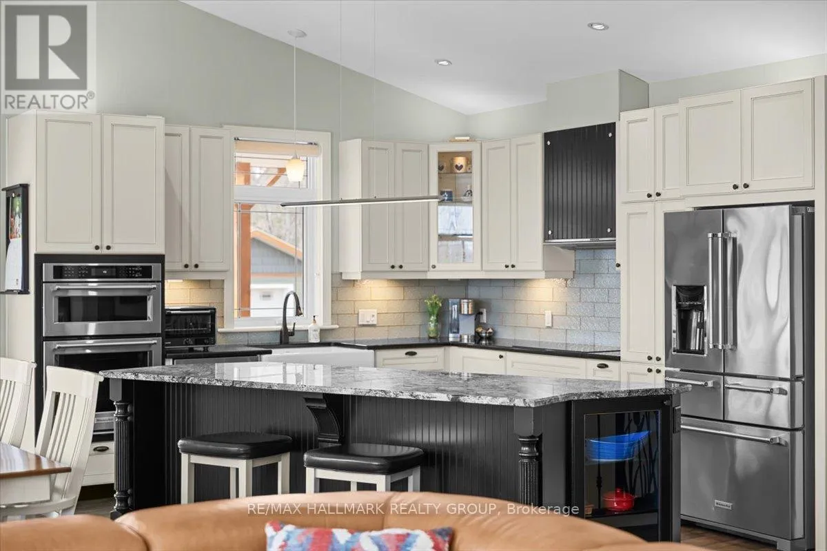 From HWY 15 near Elgin, South on County Road 42, Left onto Bedford, Continue onto Salem Rd, Continue onto S Frontenac Rd 8 which turns into Westport Road, Entrance to property on the left Welcome to a rare, custom-built waterfront bungalow with walkout, set on a private 13-acre estate with over 500 ft of shoreline on exclusive Fermoy Lake, a non-public lake known for its peaceful setting, excellent swimming, and fishing. Surrounded by mature hardwood forest and abundant wildlife, this property offers true privacy and a connection to nature that is increasingly hard to find. Thoughtfully designed with over 3,200 sq ft of living space, this 5-bedroom home blends upscale finishes with practical, low-maintenance living. The sun-filled, south-facing main level features 9'-12' ceilings, expansive windows, and an open-concept layout with a stunning great room, natural stone fireplace, and a chef-inspired kitchen complete with a 10' granite island, farmhouse sink, and premium KitchenAid appliances. Continuous porcelain plank flooring enhances durability and flow. The walkout lower level offers radiant heated floors, bright living spaces, additional bedrooms, a full bath, and flexible space for recreation, work, or guests, plus a reinforced concrete safe room/cold storage. Built with high-performance construction including ICF foundation, spray foam insulation, radiant heating (home & garage), HRV, tankless water heater, and generator-ready systems. Outdoors, enjoy a sandy beach, floating dock, swim raft, lakeside firepit, multiple patios, and professionally landscaped grounds. Includes an oversized heated garage (2020) and a fully insulated Bunkie with Wi-Fi, heat & A/C. A truly one-of-a-kind waterfront lifestyle property. (id:27476)
