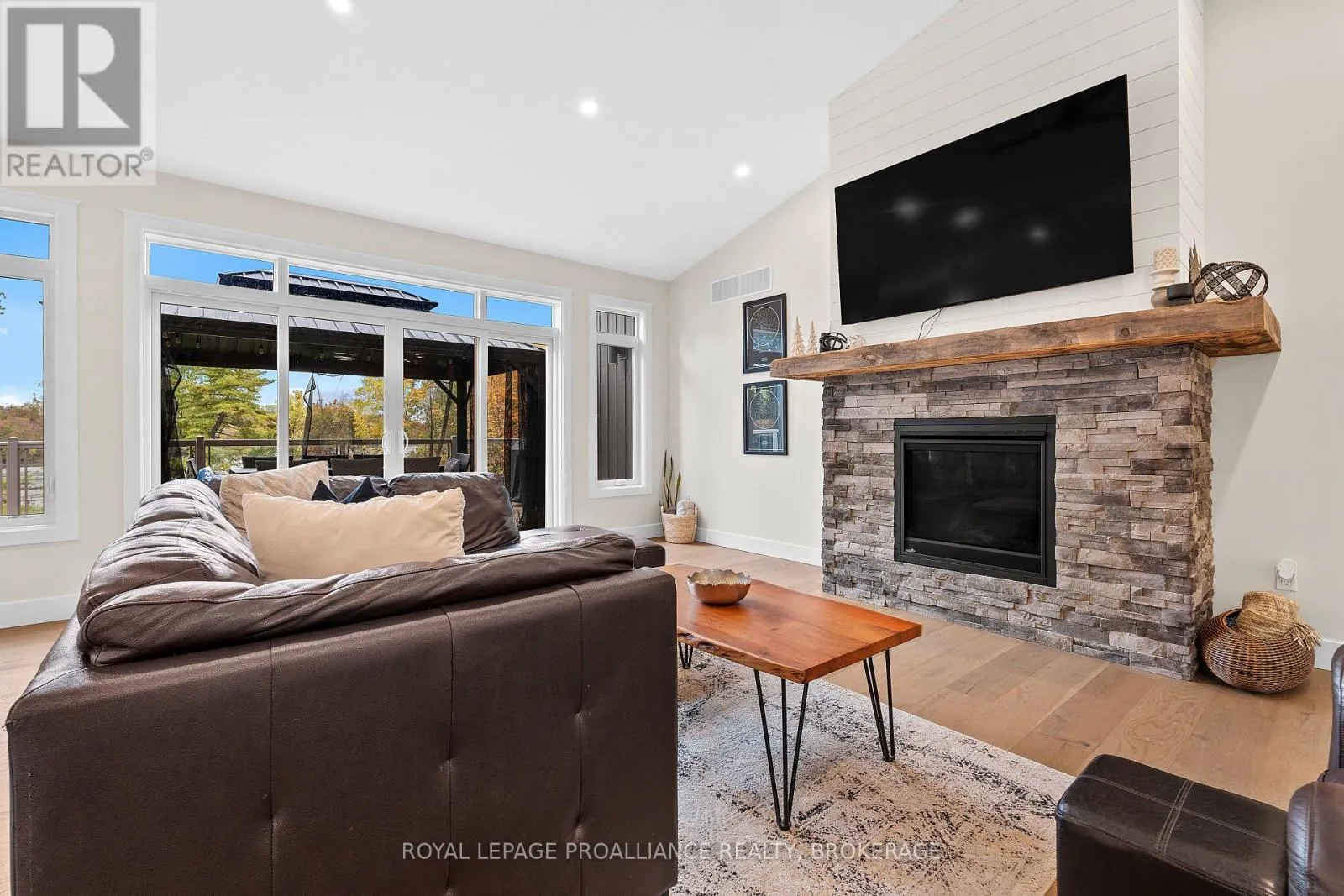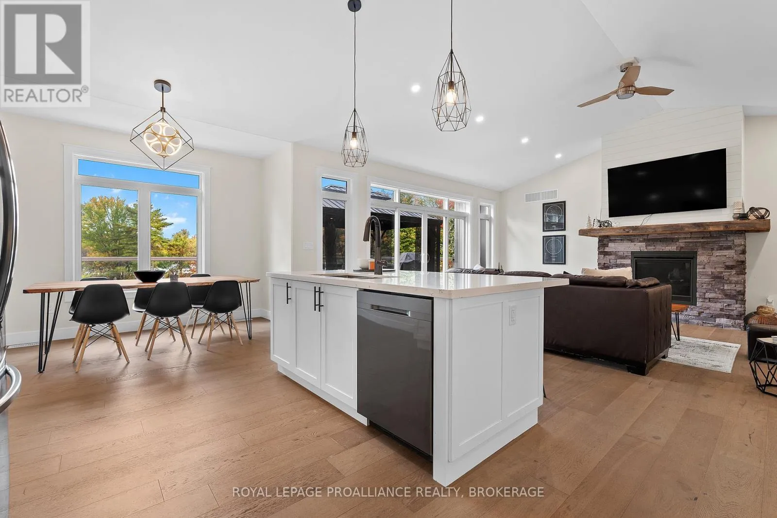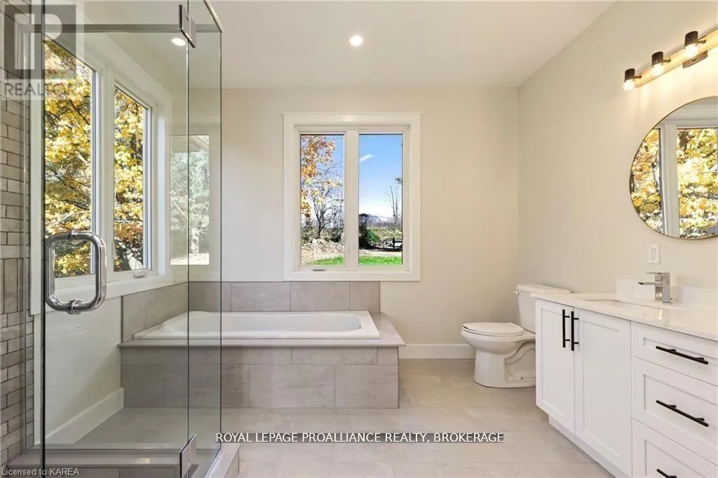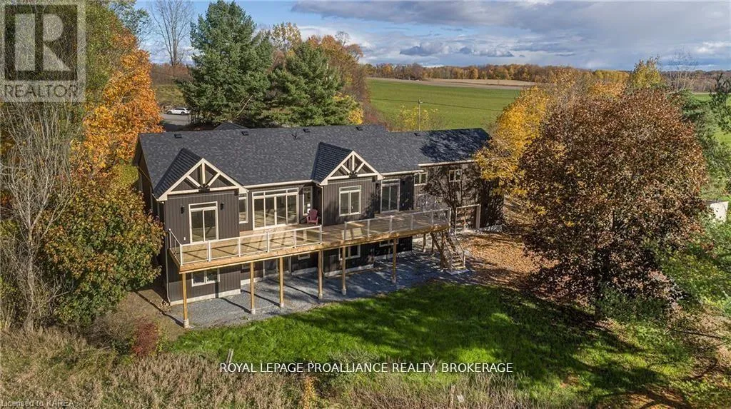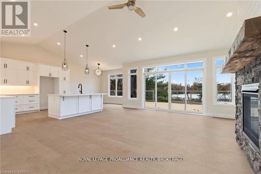 Cross Streets: Highway 15/Sunbury Rd. ** Directions: Highway 15 to Sunbury Road. Discover lakeside living at its best with this stunning custom-built bungalow, offering over 2,000 sq. ft. of main floor living space and nearly 60' of shoreline on Dog Lake. Crafted with both quality and comfort in mind, this home features an ICF foundation, soaring 10' ceilings, a vast partially finished walk-out lower level, and engineered hardwood & tile flooring throughout. The open concept impresses, with the bright kitchen featuring quartz countertops, premium cabinetry and large separate dining area open to the spacious living room - highlighted by a gas fireplace and 12-foot patio doors leading to a 650 sq. ft. deck with glass and aluminum railings providing breathtaking panoramic views of the area. The primary suite is tucked away at one end of the home offering privacy, and finished with cove ceilings and a spa inspired 5-piece ensuite with glass-enclosed shower and soaker tub. Two other bedrooms and a full bath are also here on the main level. The walk-out lower level provides extra flex space and finds in-floor heating roughed-in, and the attached SIX-car garage with epoxy flooring is incredible. This one is a beauty - with wonderful curb appeal from the stamped concrete front porch all the way around the yard space right to the waterfront with a new floating dock. Packed with upgrades and with high end finishes throughout, this one should not be missed. Survey, floor plans and supporting documents are available upon request. (id:27476)