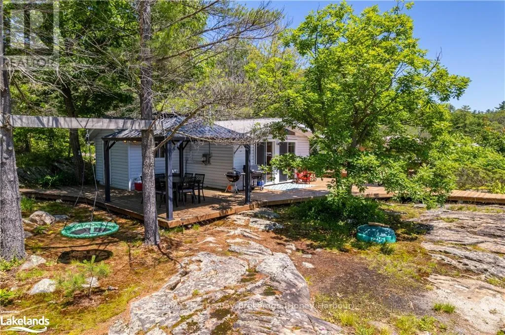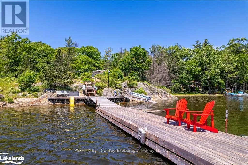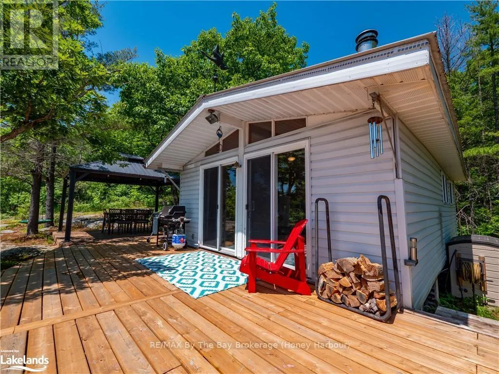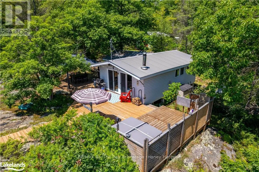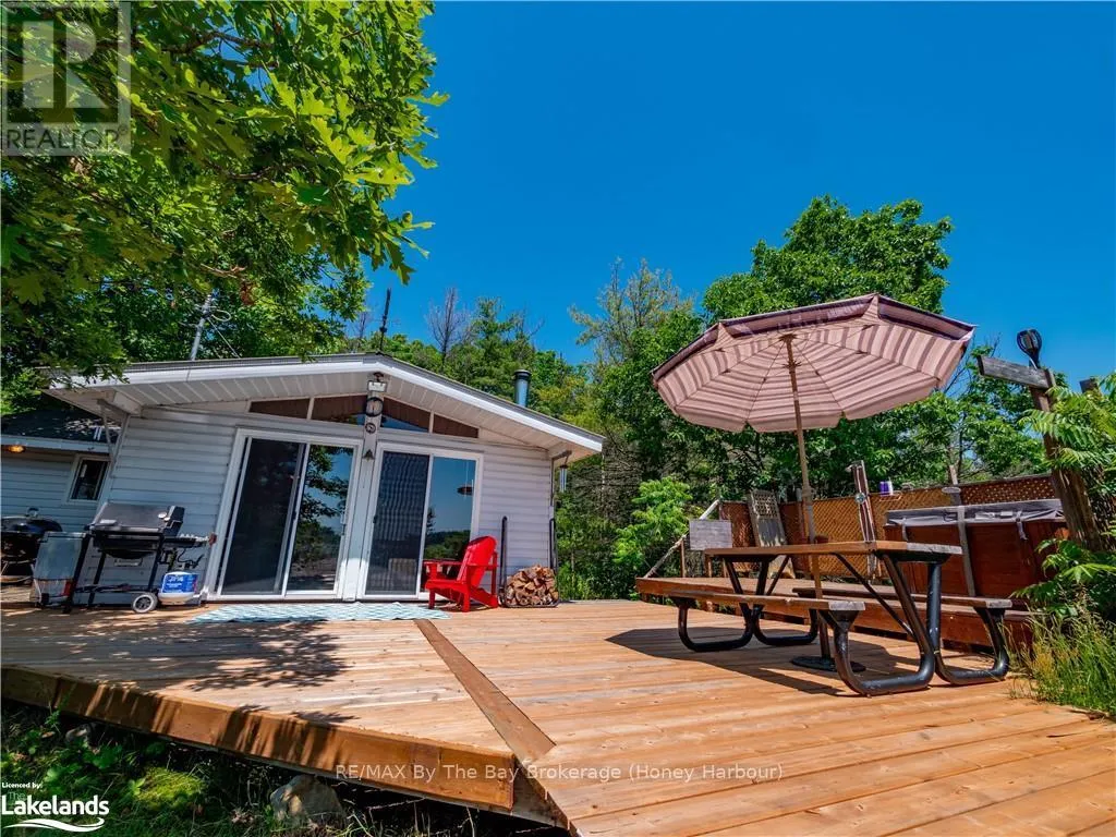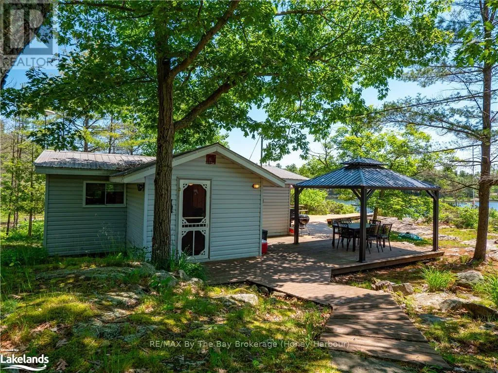 By Boat to Bone Island. Approximately a 20 minute boatride from Honey Harbour Marinas. This old fashioned, two bedroom family cottage is located in tranquil Stewart's Bay on the west shore of Bone Island. It has been lovingly maintained with a large sundeck, hot tub and sheltered seating areas over looking spectacular long south views of Georgian Bay. A large, dock accommodates four boats with a minimum of four feet of water depth. There is a great workshop/bunkie with one bedroom and storage. The property has 240 feet of rocky shore and just under one acre of land. (id:27476)