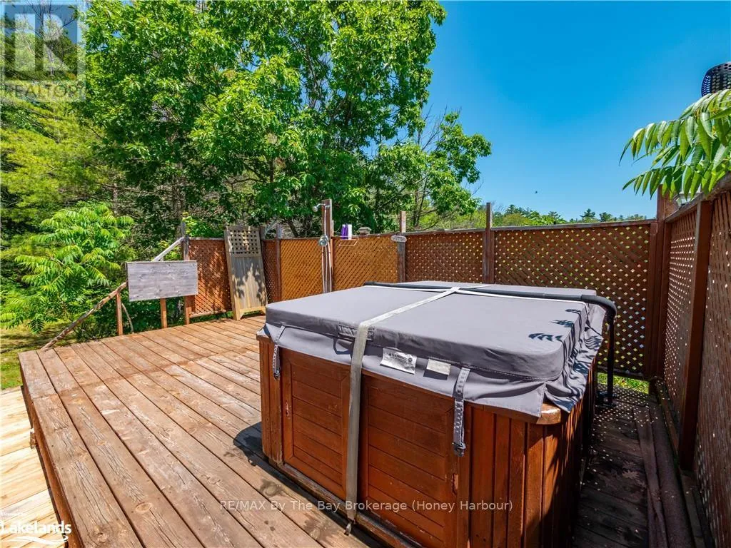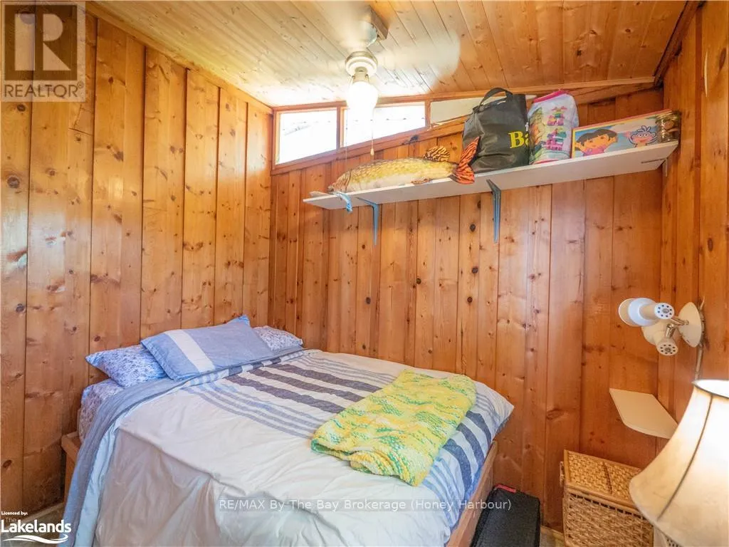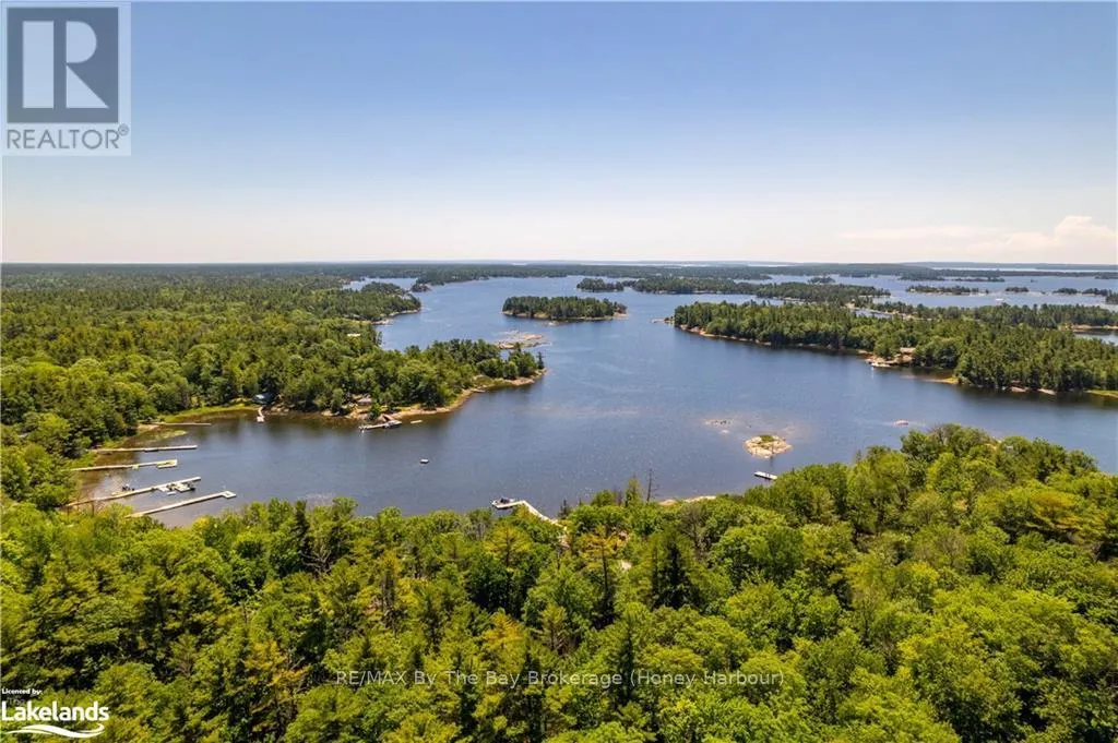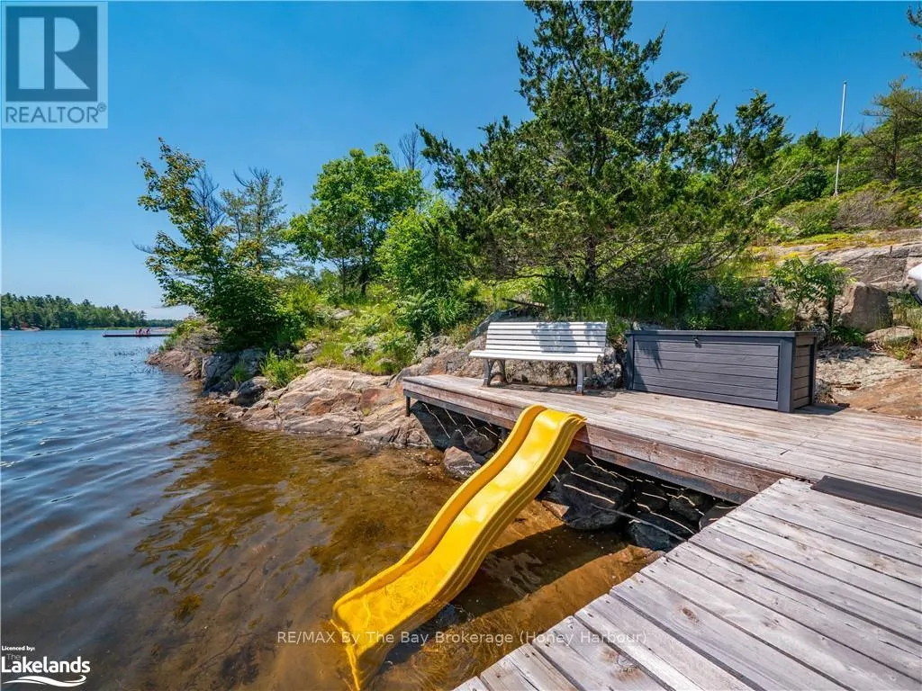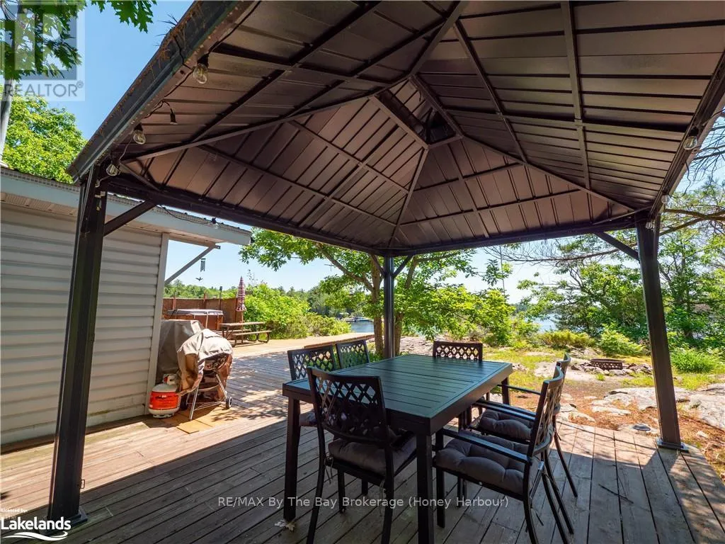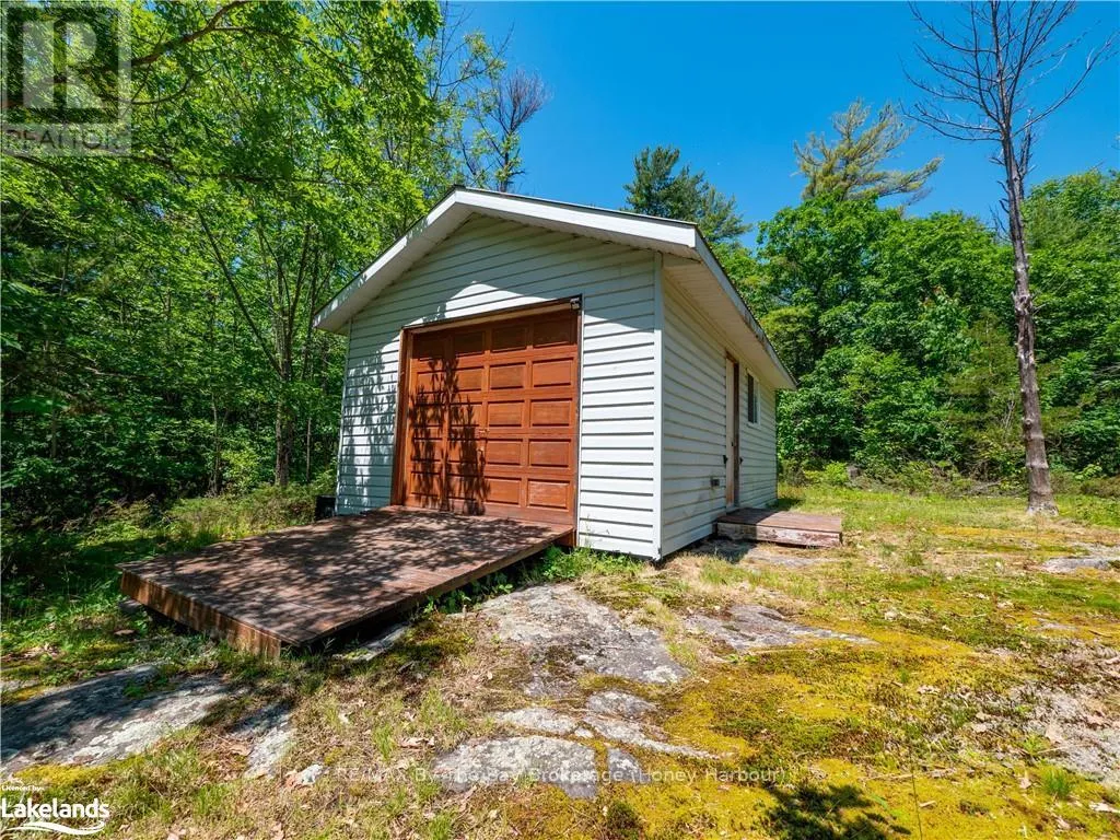 By Boat to Bone Island. Approximately a 20 minute boatride from Honey Harbour Marinas. This old fashioned, two bedroom family cottage is located in tranquil Stewart's Bay on the west shore of Bone Island. It has been lovingly maintained with a large sundeck, hot tub and sheltered seating areas over looking spectacular long south views of Georgian Bay. A large, dock accommodates four boats with a minimum of four feet of water depth. There is a great workshop/bunkie with one bedroom and storage. The property has 240 feet of rocky shore and just under one acre of land. (id:27476)