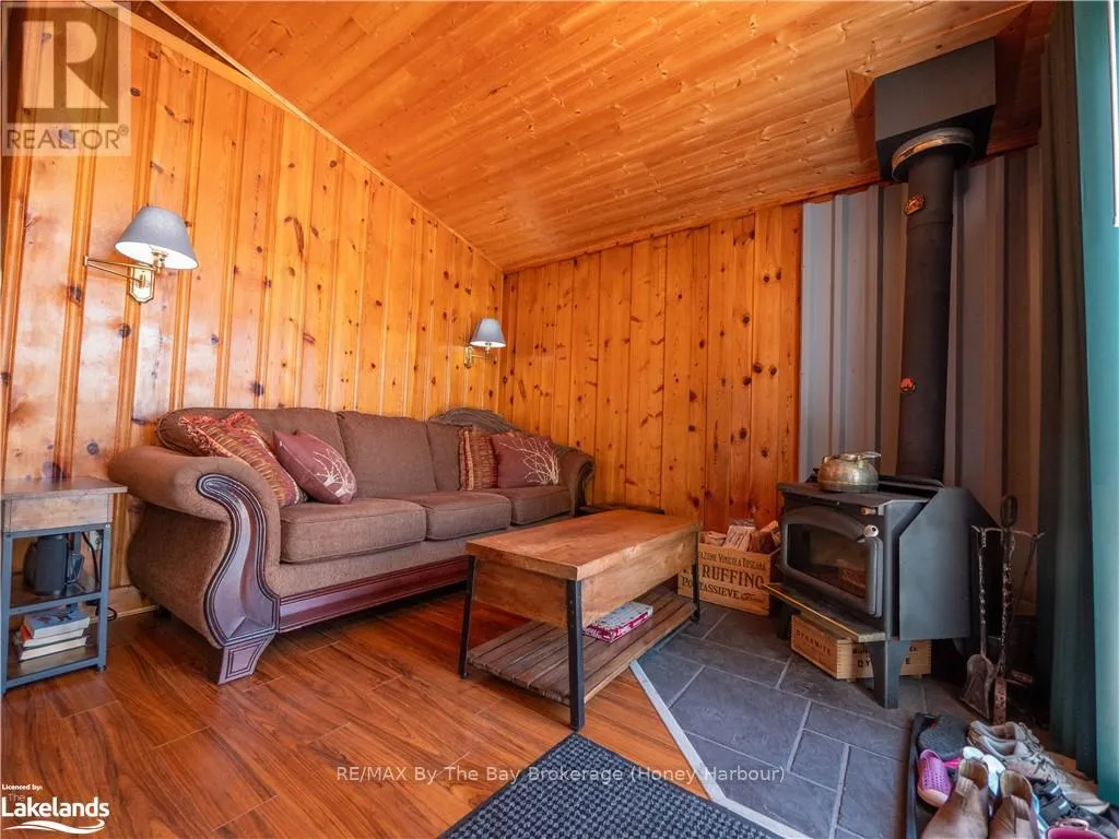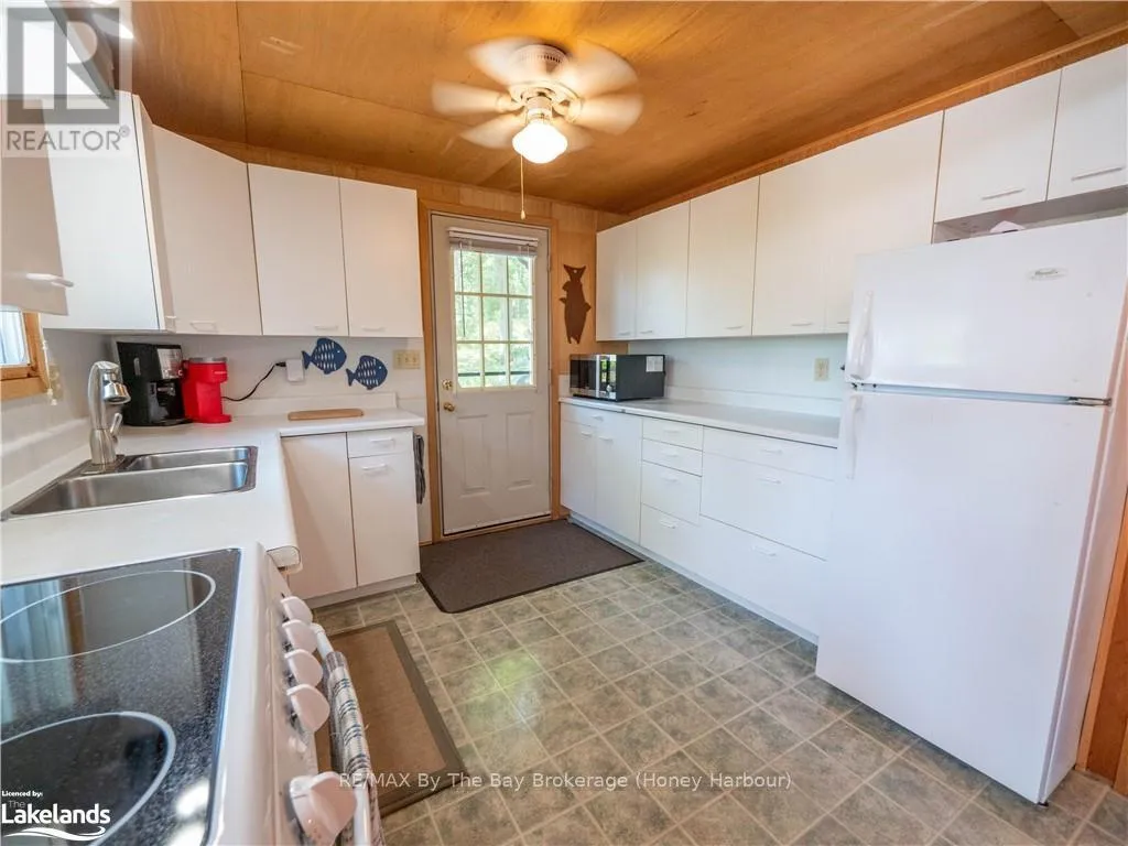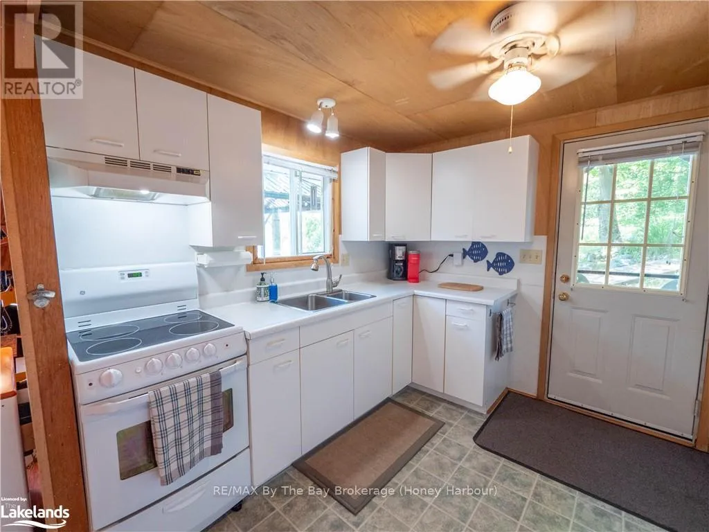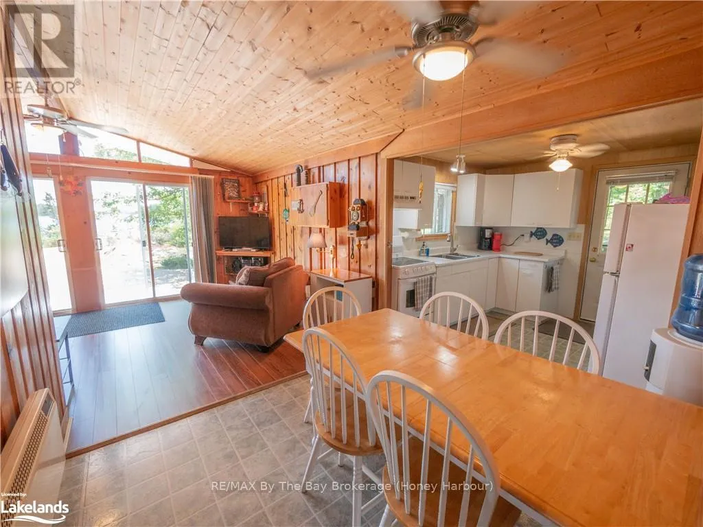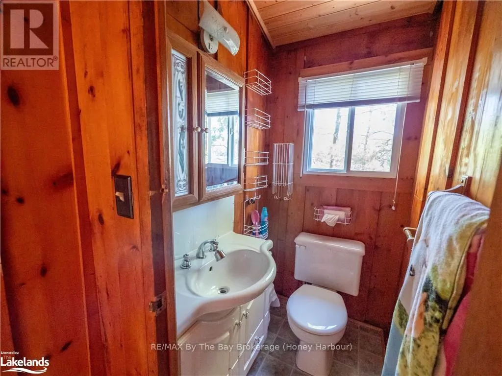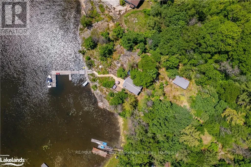 By Boat to Bone Island. Approximately a 20 minute boatride from Honey Harbour Marinas. This old fashioned, two bedroom family cottage is located in tranquil Stewart's Bay on the west shore of Bone Island. It has been lovingly maintained with a large sundeck, hot tub and sheltered seating areas over looking spectacular long south views of Georgian Bay. A large, dock accommodates four boats with a minimum of four feet of water depth. There is a great workshop/bunkie with one bedroom and storage. The property has 240 feet of rocky shore and just under one acre of land. (id:27476)