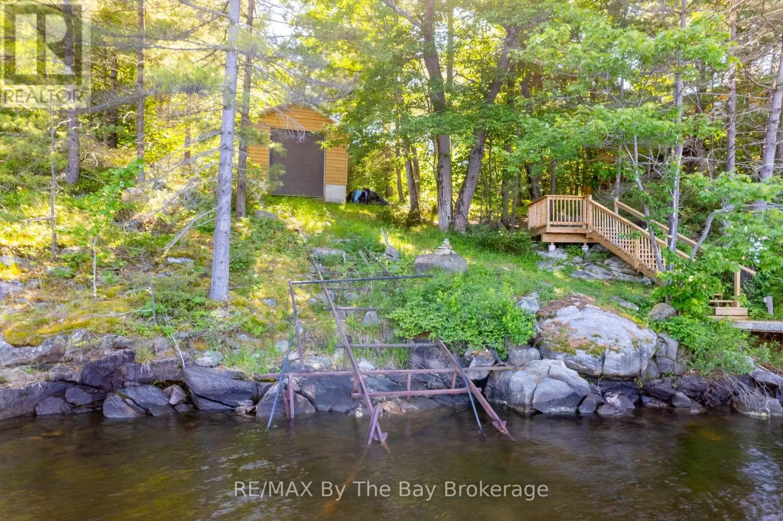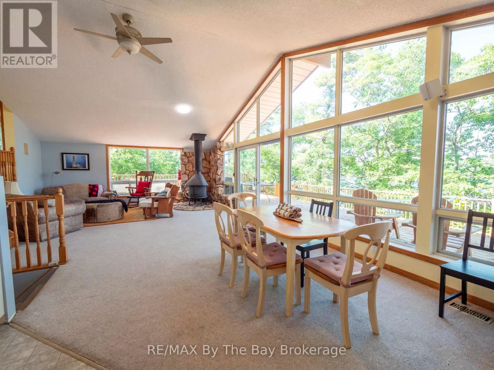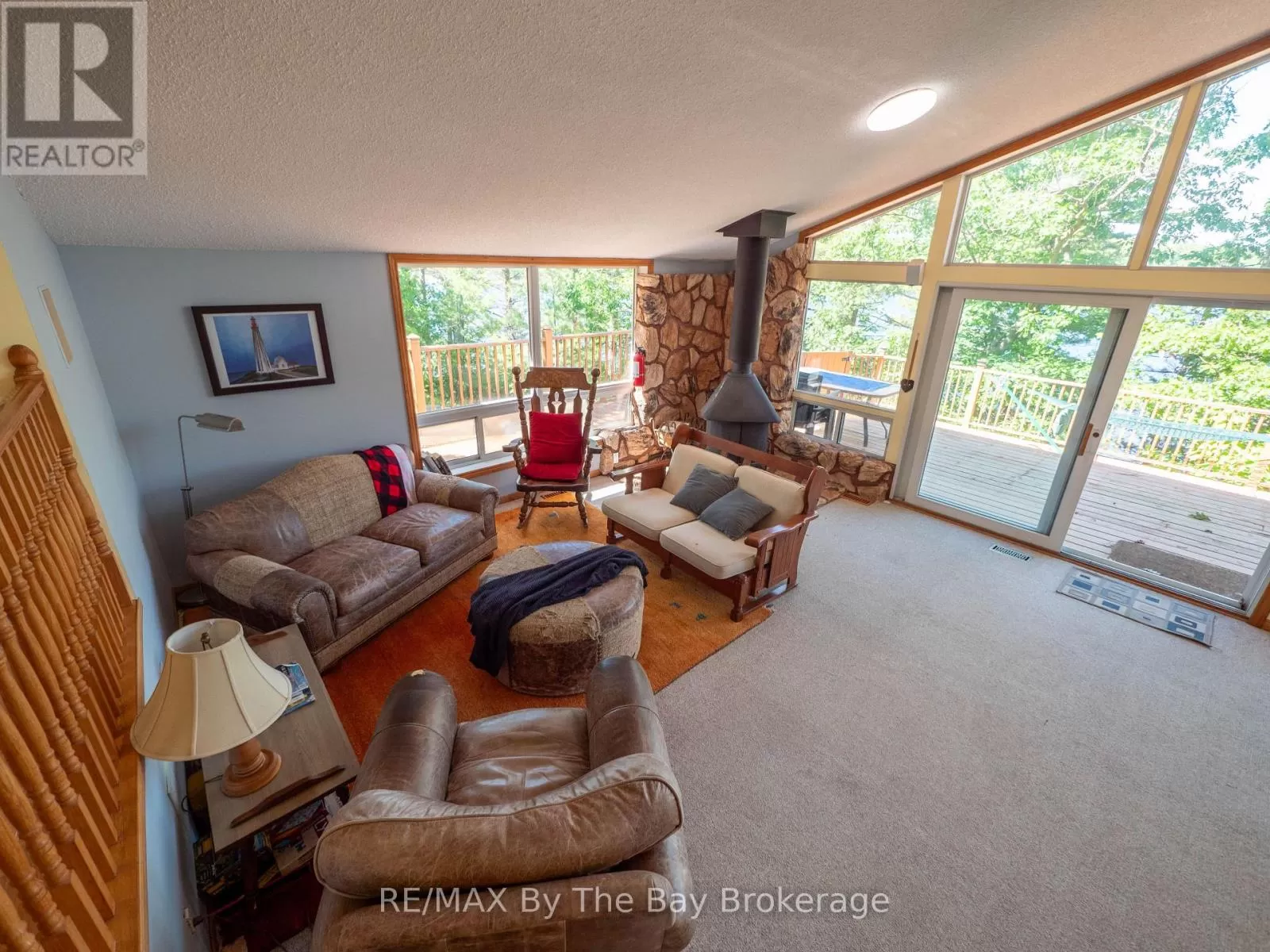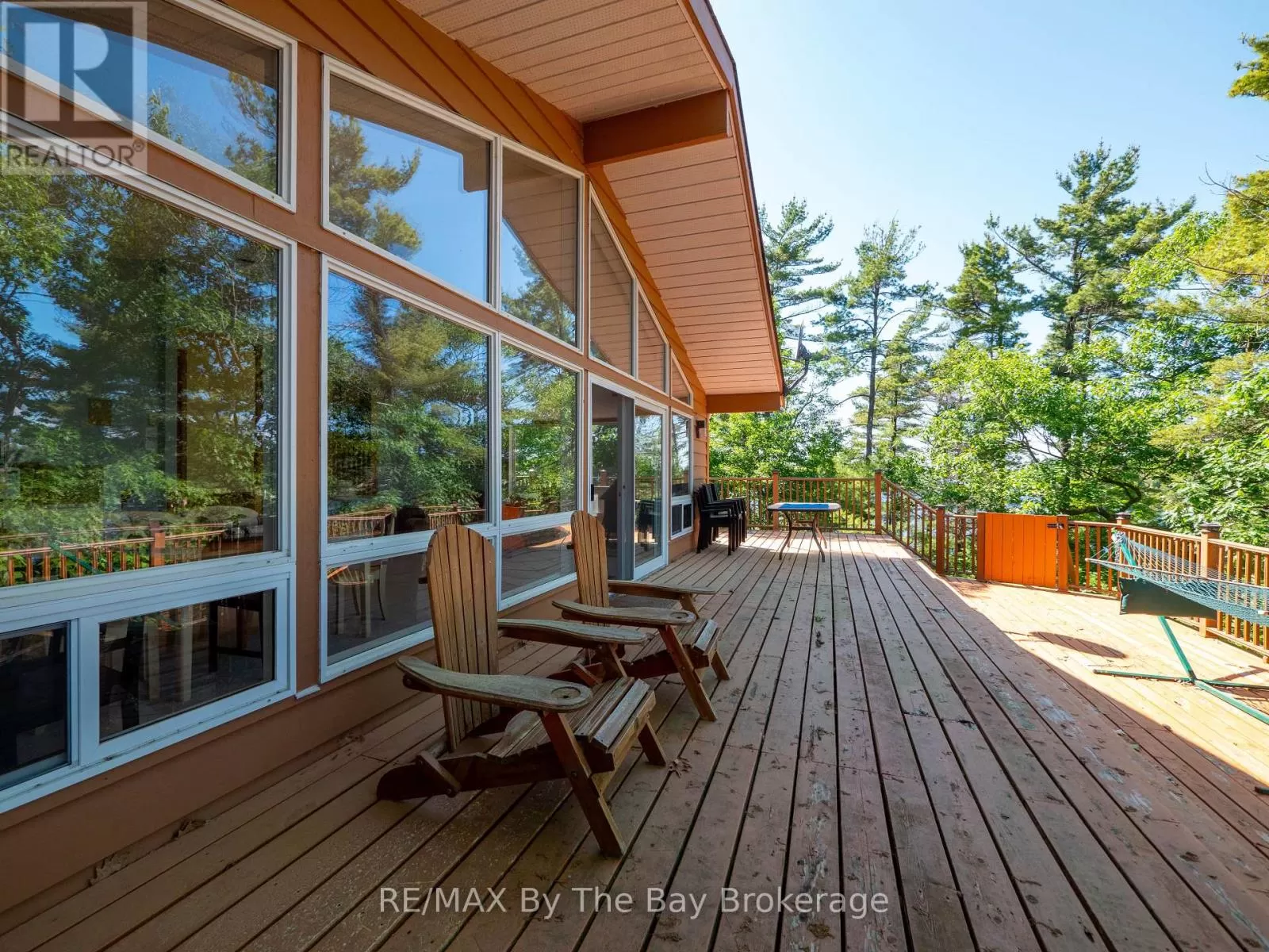 By boat to North side of Bone Island/Island 1810 Escape to your exclusive waterfront sanctuary on Bone Island. This boat-access-only retreat is nestled on a spacious 3 -acre lot with 400 feet of mesmerizing water frontage, offering you the ultimate getaway from the hustle and bustle of daily life. Enjoy relaxing on the wrap-around deck and immerse yourself in the essence of cottage life. Gather around the firepit for cozy evenings under the stars, or retreat to the enclosed patio for added privacy. Inside, the charm continues with interior windows that frame picturesque water views, while a fireplace in the main living area adds the perfect warming touch. With 3 bedrooms and 2 full bathrooms, this cottage offers ample space for hosting and entertaining. Located just a 20-minute boat ride from Honey Harbour, this private property provides the perfect blend of seclusion and accessibility. (id:27476)