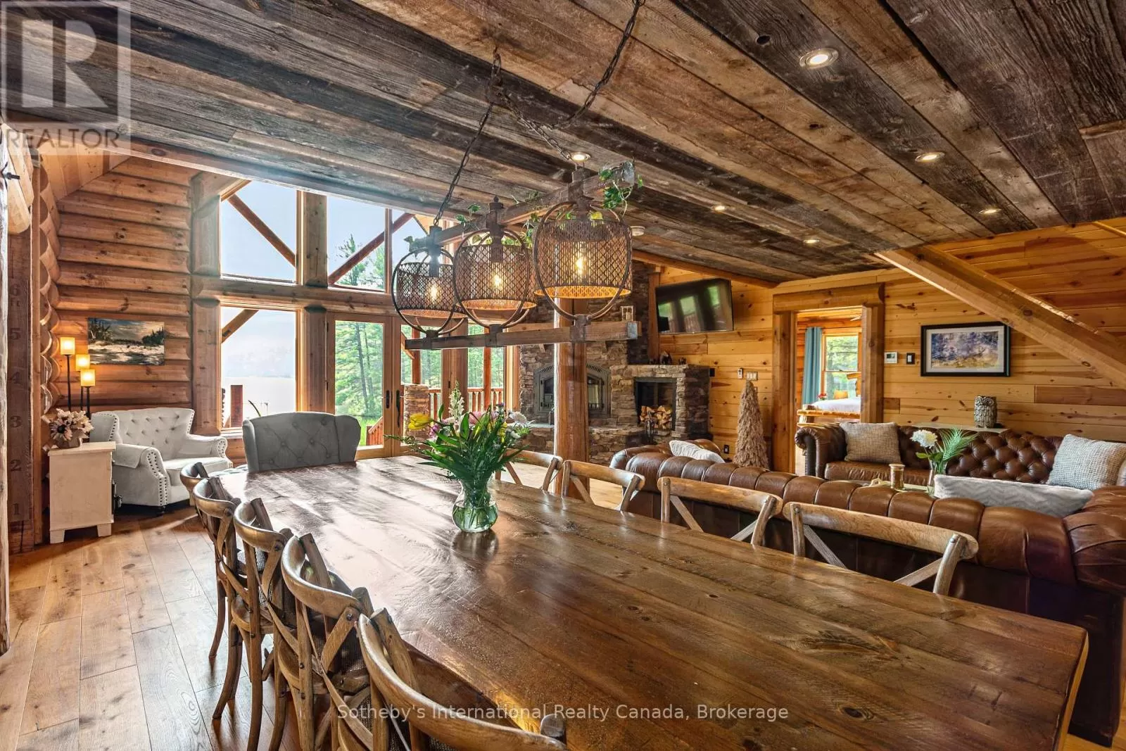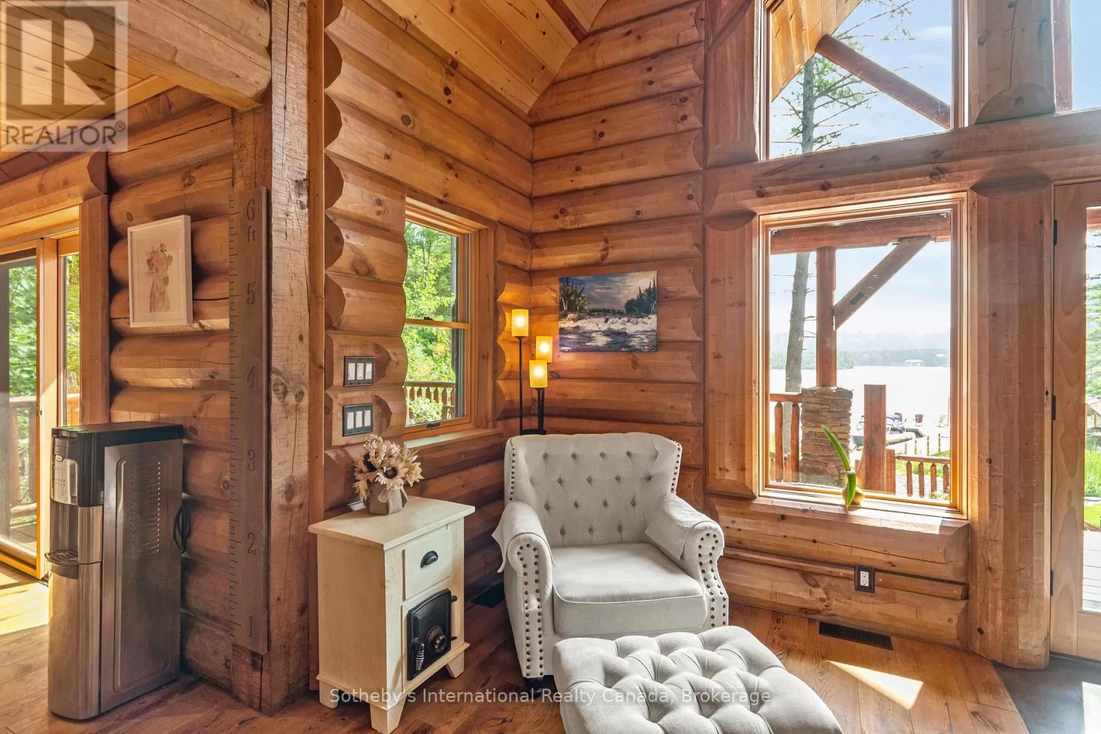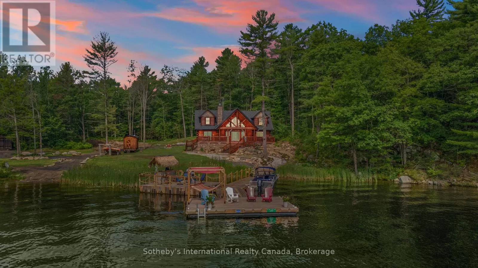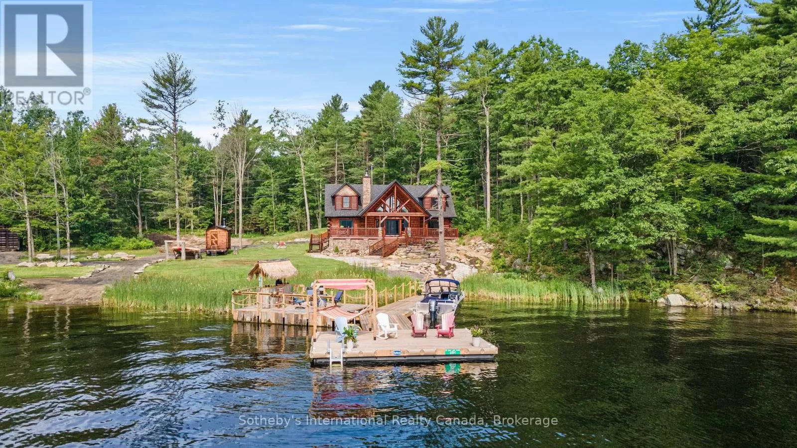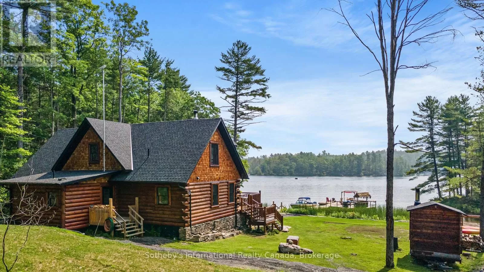 Cross Streets: HWY400/EXIT 177/GHLMarina/Boat. ** Directions: Hwy 400 to Exit 177. Then go Home Lake Road to Go Home Lake Marina. By Boat to Crystal Bay. Welcome to your dream waterfront retreat in Crystal Bay on Go Home Lake! This stunning winterized Golden Eagle log home boasts 3 bedrooms, 3 bathrooms, and 2,642 square feet of luxurious living space. Step inside and be captivated by the beauty of the 10" white Wisconsin pine logs that frame the home. Accessed by boat, you are under 10 minutes from the marina. Enjoy the serene ambiance with 558 feet of water frontage, set on a spacious 1.56-acre lot. The southeast exposure fills the home with natural light, creating a warm and inviting atmosphere. The main floor features a stunning ledge rock fireplace in the spacious living room while the dining room offers ample seating for gatherings. The gourmet kitchen is a chef's delight, equipped with stainless steel appliances, a moveable island, granite countertops, and a beautiful stone backsplash. The spacious primary suite boasts a walk-out to the deck, complete with an ensuite that includes a jacuzzi tub, custom granite shower, and double sink. The attention to detail is evident with custom stonework throughout. Rounding out this level is a bathroom designed to resemble an outhouse, adding a unique touch to the home and a convenient stackable laundry pair. Upstairs, the loft area overlooks floor-to-ceiling windows, creating a cozy retreat. Here you will also find two generously sized bedrooms with vaulted ceilings and a 4-piece bath that provides comfortable accommodations for family and guests. This home is beautifully furnished throughout, showcasing quality furniture and log beds that perfectly complement the rustic charm. Outside, the tastefully landscaped property features a flagstone front yard, a tiki bar on the dock, and a sand beach area creating the ideal space for outdoor entertaining. Relax and enjoy the soothing sounds of your own personal waterfall. The adjacent property is also for sale, offering the potential for a family compound, complete with a spacious 3 bedroom log home (see MLS # X12016866). (id:27476)