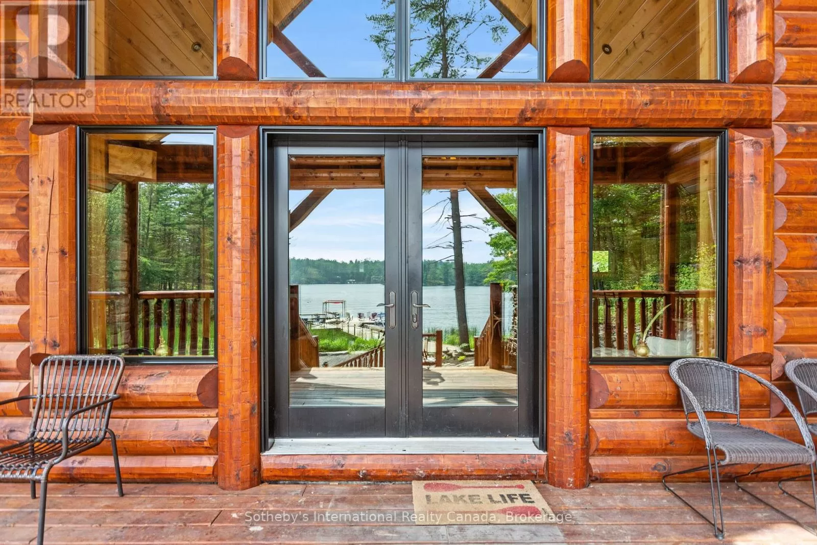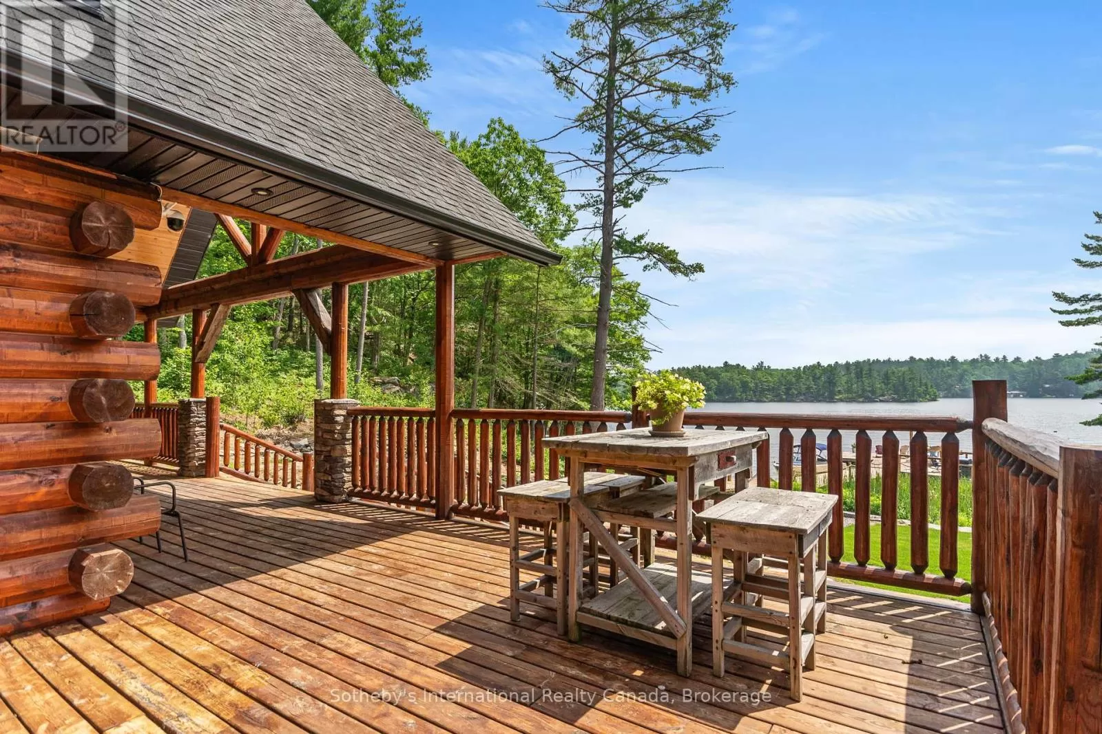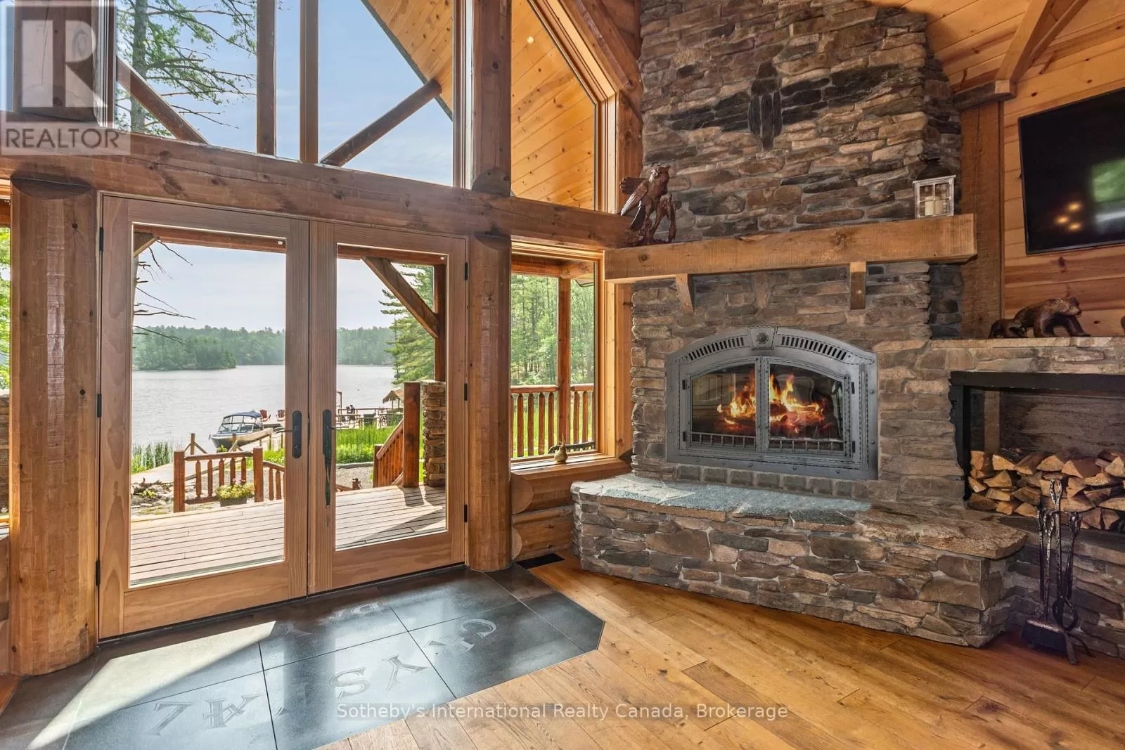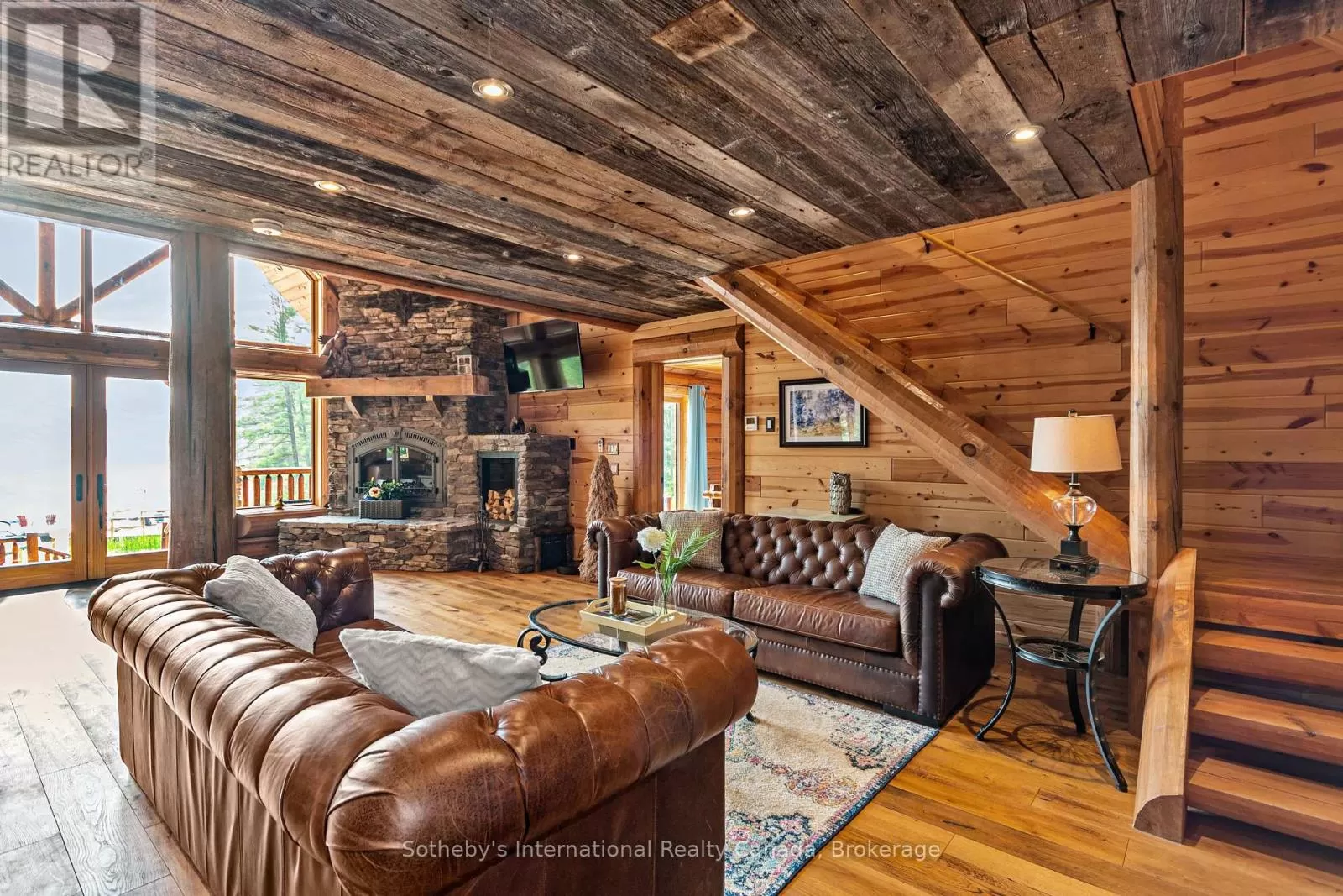 Cross Streets: HWY400/EXIT 177/GHLMarina/Boat. ** Directions: Hwy 400 to Exit 177. Then go Home Lake Road to Go Home Lake Marina. By Boat to Crystal Bay. Welcome to your dream waterfront retreat in Crystal Bay on Go Home Lake! This stunning winterized Golden Eagle log home boasts 3 bedrooms, 3 bathrooms, and 2,642 square feet of luxurious living space. Step inside and be captivated by the beauty of the 10" white Wisconsin pine logs that frame the home. Accessed by boat, you are under 10 minutes from the marina. Enjoy the serene ambiance with 558 feet of water frontage, set on a spacious 1.56-acre lot. The southeast exposure fills the home with natural light, creating a warm and inviting atmosphere. The main floor features a stunning ledge rock fireplace in the spacious living room while the dining room offers ample seating for gatherings. The gourmet kitchen is a chef's delight, equipped with stainless steel appliances, a moveable island, granite countertops, and a beautiful stone backsplash. The spacious primary suite boasts a walk-out to the deck, complete with an ensuite that includes a jacuzzi tub, custom granite shower, and double sink. The attention to detail is evident with custom stonework throughout. Rounding out this level is a bathroom designed to resemble an outhouse, adding a unique touch to the home and a convenient stackable laundry pair. Upstairs, the loft area overlooks floor-to-ceiling windows, creating a cozy retreat. Here you will also find two generously sized bedrooms with vaulted ceilings and a 4-piece bath that provides comfortable accommodations for family and guests. This home is beautifully furnished throughout, showcasing quality furniture and log beds that perfectly complement the rustic charm. Outside, the tastefully landscaped property features a flagstone front yard, a tiki bar on the dock, and a sand beach area creating the ideal space for outdoor entertaining. Relax and enjoy the soothing sounds of your own personal waterfall. The adjacent property is also for sale, offering the potential for a family compound, complete with a spacious 3 bedroom log home (see MLS # X12016866). (id:27476)