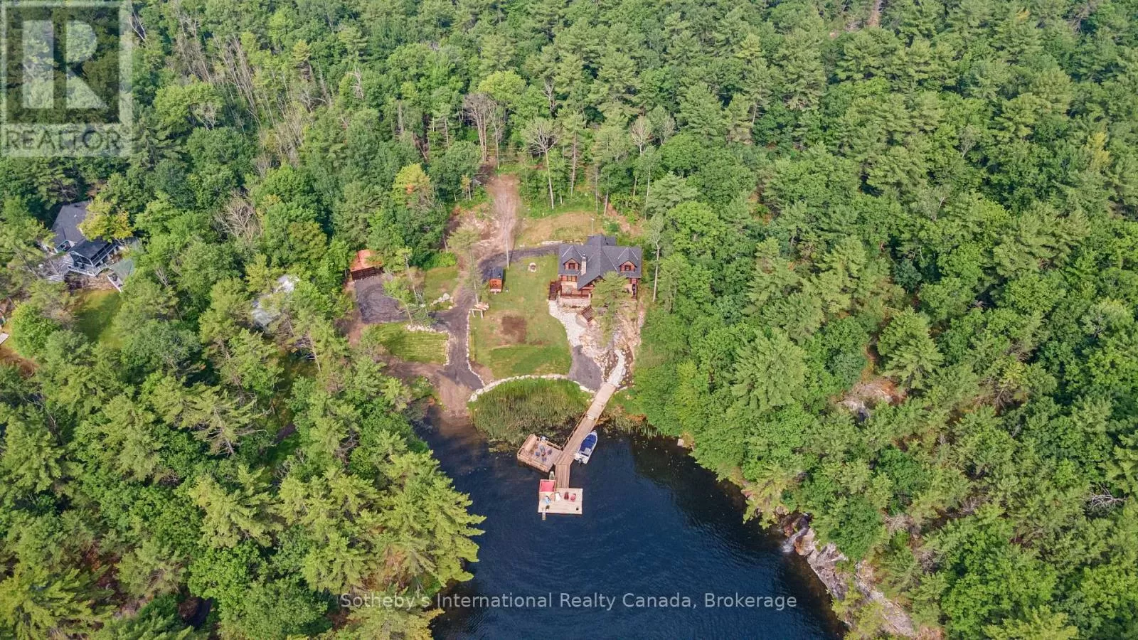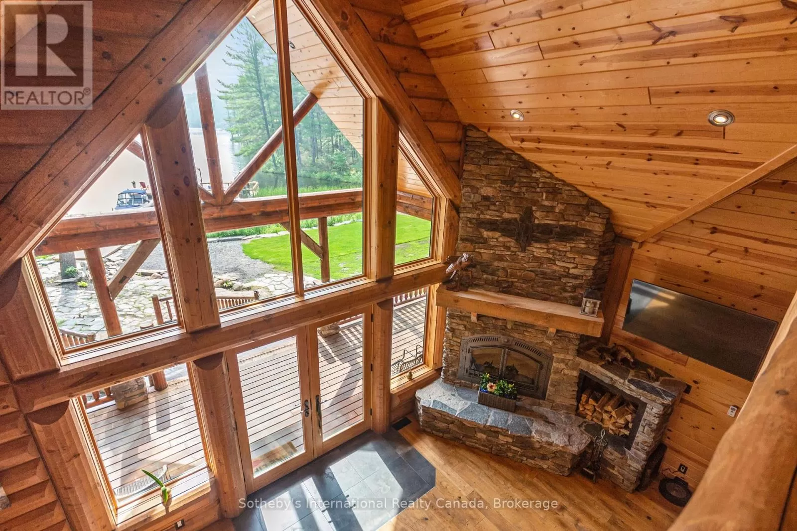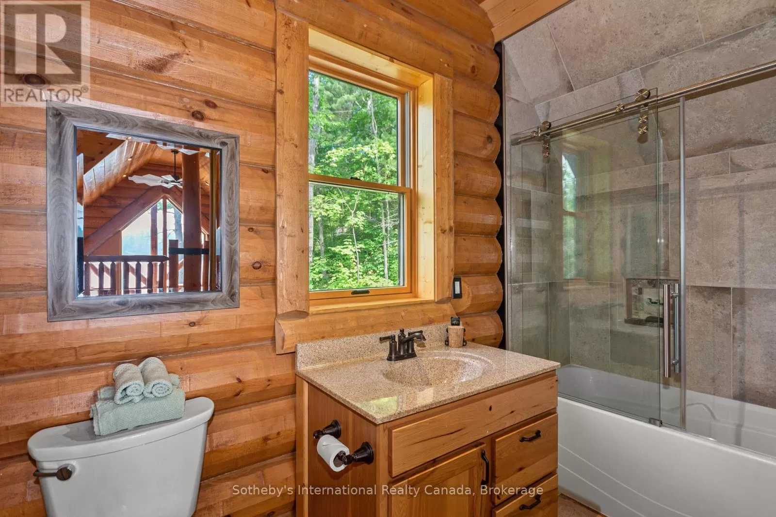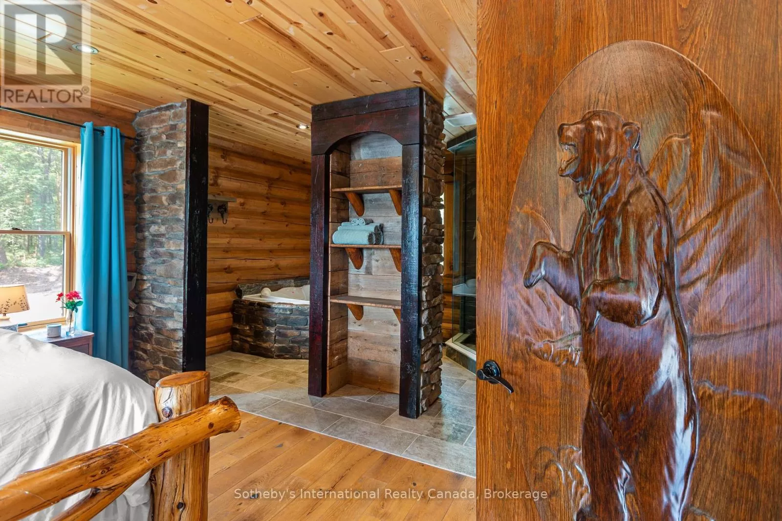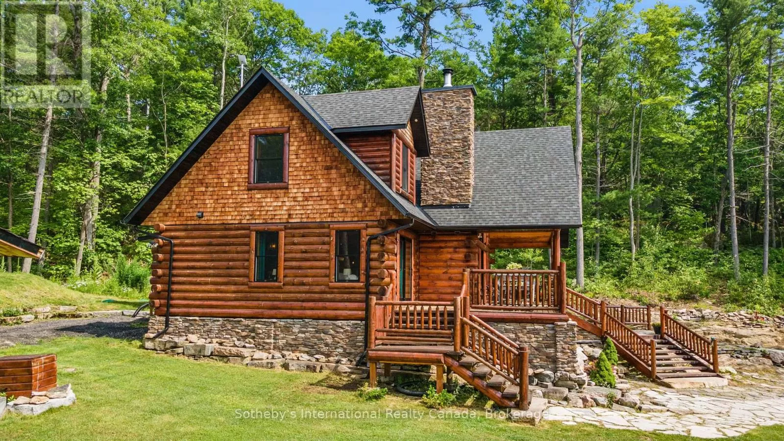 Cross Streets: HWY400/EXIT 177/GHLMarina/Boat. ** Directions: Hwy 400 to Exit 177. Then go Home Lake Road to Go Home Lake Marina. By Boat to Crystal Bay. Welcome to your dream waterfront retreat in Crystal Bay on Go Home Lake! This stunning winterized Golden Eagle log home boasts 3 bedrooms, 3 bathrooms, and 2,642 square feet of luxurious living space. Step inside and be captivated by the beauty of the 10" white Wisconsin pine logs that frame the home. Accessed by boat, you are under 10 minutes from the marina. Enjoy the serene ambiance with 558 feet of water frontage, set on a spacious 1.56-acre lot. The southeast exposure fills the home with natural light, creating a warm and inviting atmosphere. The main floor features a stunning ledge rock fireplace in the spacious living room while the dining room offers ample seating for gatherings. The gourmet kitchen is a chef's delight, equipped with stainless steel appliances, a moveable island, granite countertops, and a beautiful stone backsplash. The spacious primary suite boasts a walk-out to the deck, complete with an ensuite that includes a jacuzzi tub, custom granite shower, and double sink. The attention to detail is evident with custom stonework throughout. Rounding out this level is a bathroom designed to resemble an outhouse, adding a unique touch to the home and a convenient stackable laundry pair. Upstairs, the loft area overlooks floor-to-ceiling windows, creating a cozy retreat. Here you will also find two generously sized bedrooms with vaulted ceilings and a 4-piece bath that provides comfortable accommodations for family and guests. This home is beautifully furnished throughout, showcasing quality furniture and log beds that perfectly complement the rustic charm. Outside, the tastefully landscaped property features a flagstone front yard, a tiki bar on the dock, and a sand beach area creating the ideal space for outdoor entertaining. Relax and enjoy the soothing sounds of your own personal waterfall. The adjacent property is also for sale, offering the potential for a family compound, complete with a spacious 3 bedroom log home (see MLS # X12016866). (id:27476)