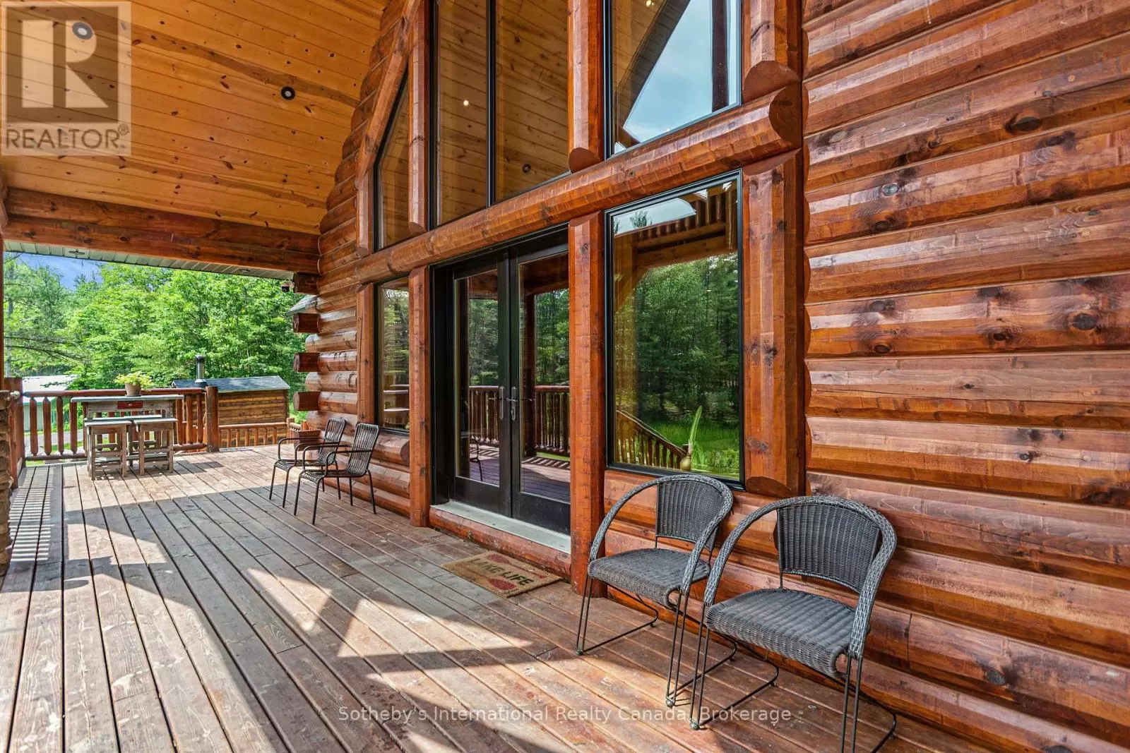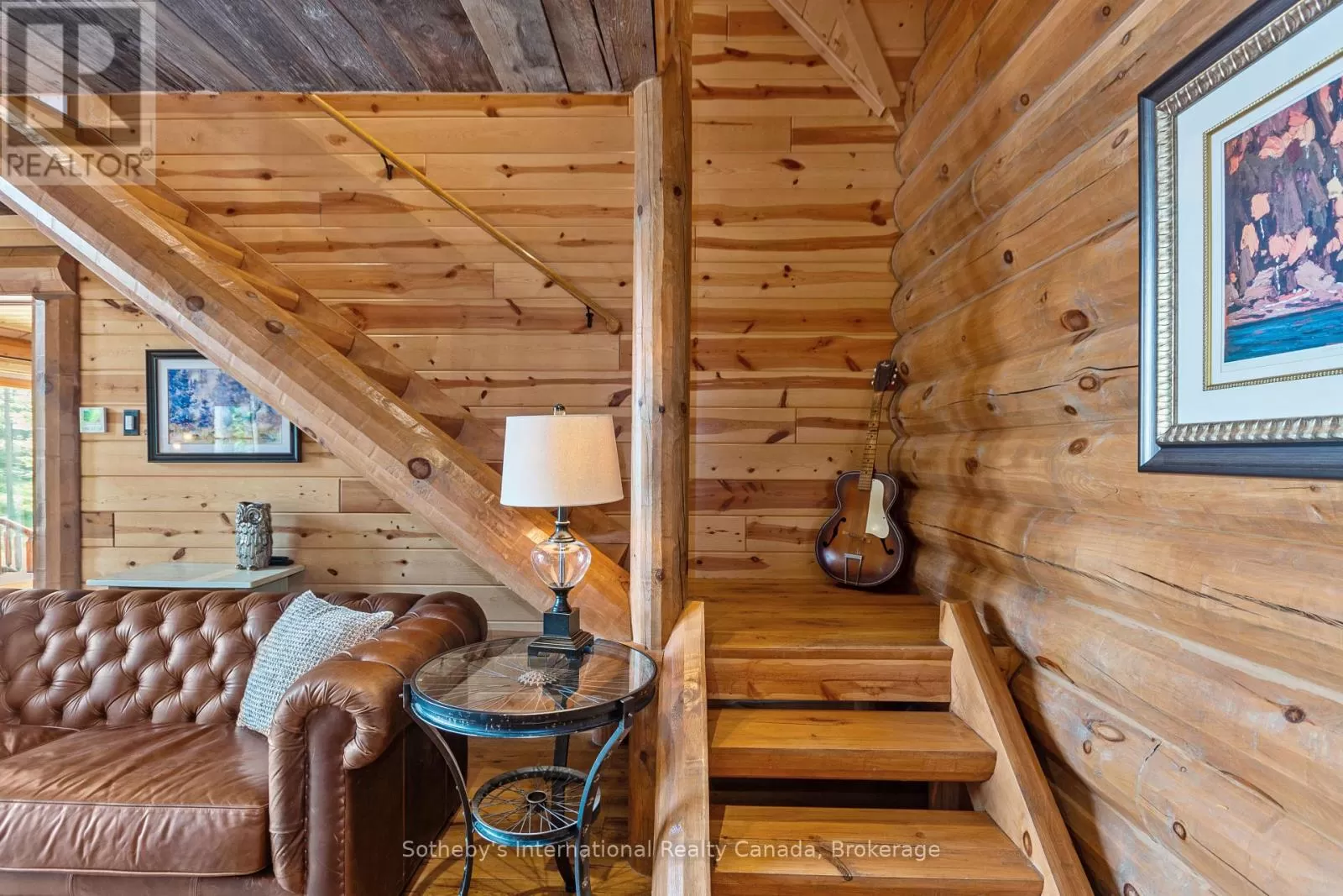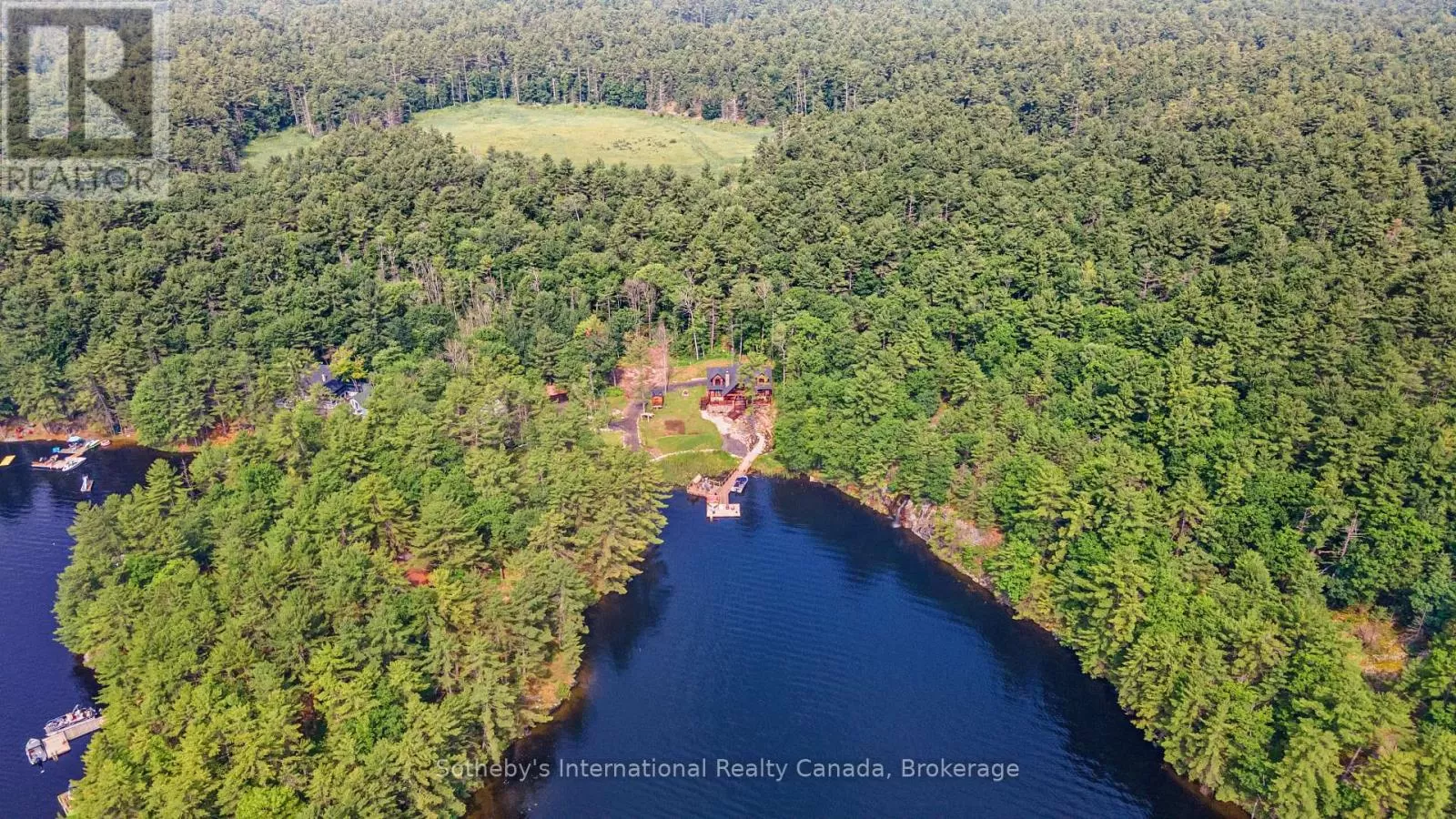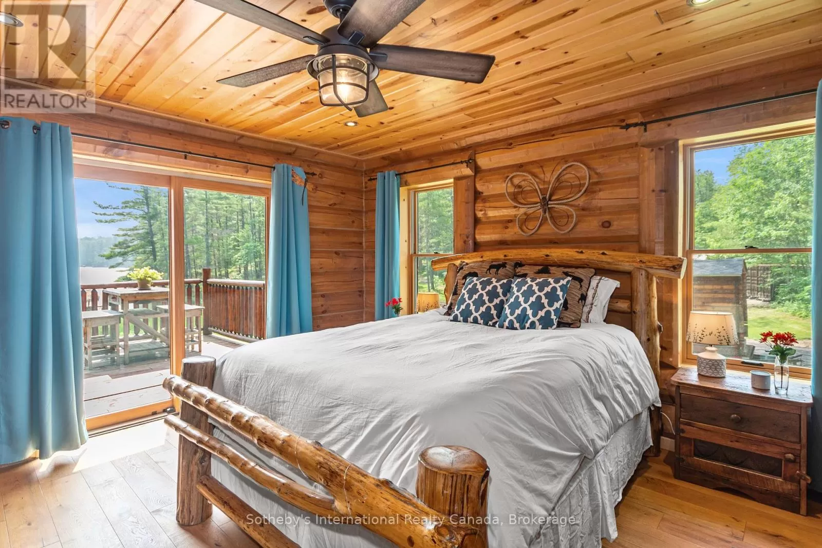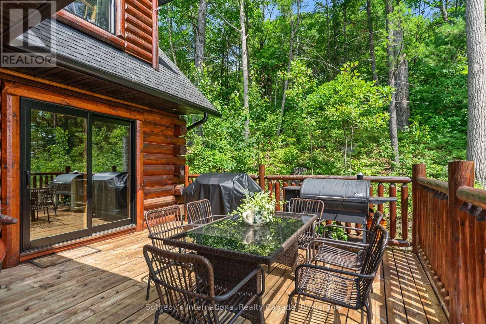 Cross Streets: HWY400/EXIT 177/GHLMarina/Boat. ** Directions: Hwy 400 to Exit 177. Then go Home Lake Road to Go Home Lake Marina. By Boat to Crystal Bay. Welcome to your dream waterfront retreat in Crystal Bay on Go Home Lake! This stunning winterized Golden Eagle log home boasts 3 bedrooms, 3 bathrooms, and 2,642 square feet of luxurious living space. Step inside and be captivated by the beauty of the 10" white Wisconsin pine logs that frame the home. Accessed by boat, you are under 10 minutes from the marina. Enjoy the serene ambiance with 558 feet of water frontage, set on a spacious 1.56-acre lot. The southeast exposure fills the home with natural light, creating a warm and inviting atmosphere. The main floor features a stunning ledge rock fireplace in the spacious living room while the dining room offers ample seating for gatherings. The gourmet kitchen is a chef's delight, equipped with stainless steel appliances, a moveable island, granite countertops, and a beautiful stone backsplash. The spacious primary suite boasts a walk-out to the deck, complete with an ensuite that includes a jacuzzi tub, custom granite shower, and double sink. The attention to detail is evident with custom stonework throughout. Rounding out this level is a bathroom designed to resemble an outhouse, adding a unique touch to the home and a convenient stackable laundry pair. Upstairs, the loft area overlooks floor-to-ceiling windows, creating a cozy retreat. Here you will also find two generously sized bedrooms with vaulted ceilings and a 4-piece bath that provides comfortable accommodations for family and guests. This home is beautifully furnished throughout, showcasing quality furniture and log beds that perfectly complement the rustic charm. Outside, the tastefully landscaped property features a flagstone front yard, a tiki bar on the dock, and a sand beach area creating the ideal space for outdoor entertaining. Relax and enjoy the soothing sounds of your own personal waterfall. The adjacent property is also for sale, offering the potential for a family compound, complete with a spacious 3 bedroom log home (see MLS # X12016866). (id:27476)