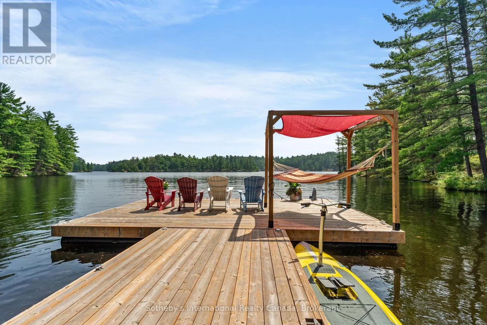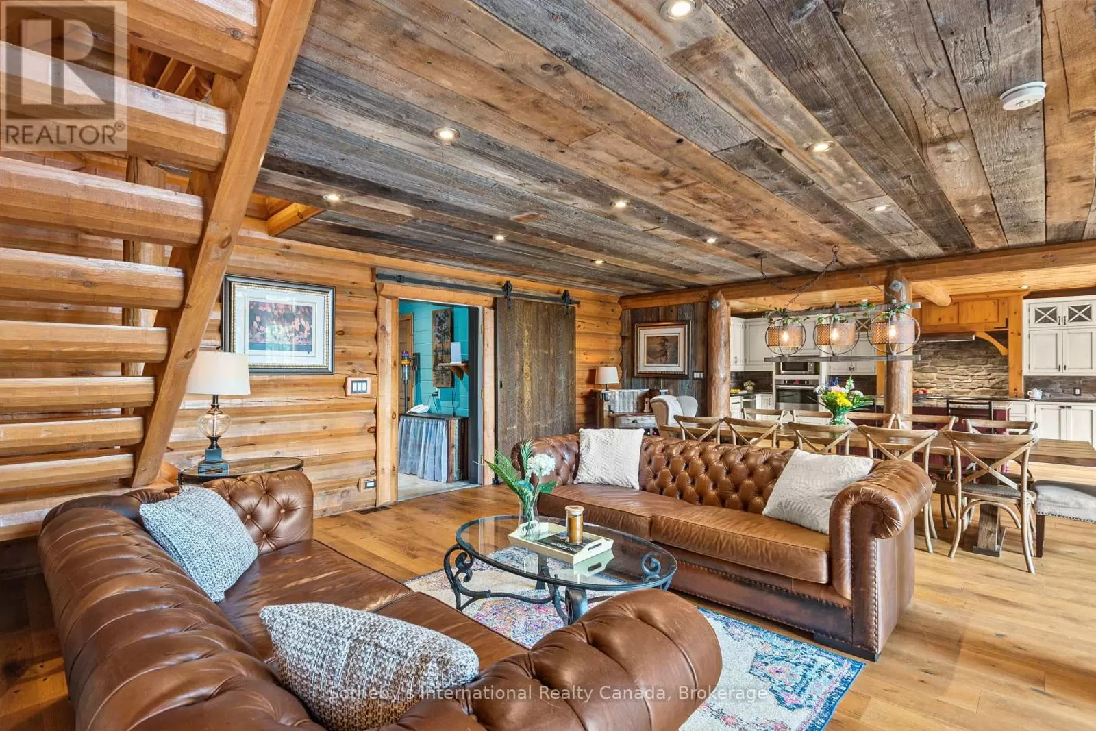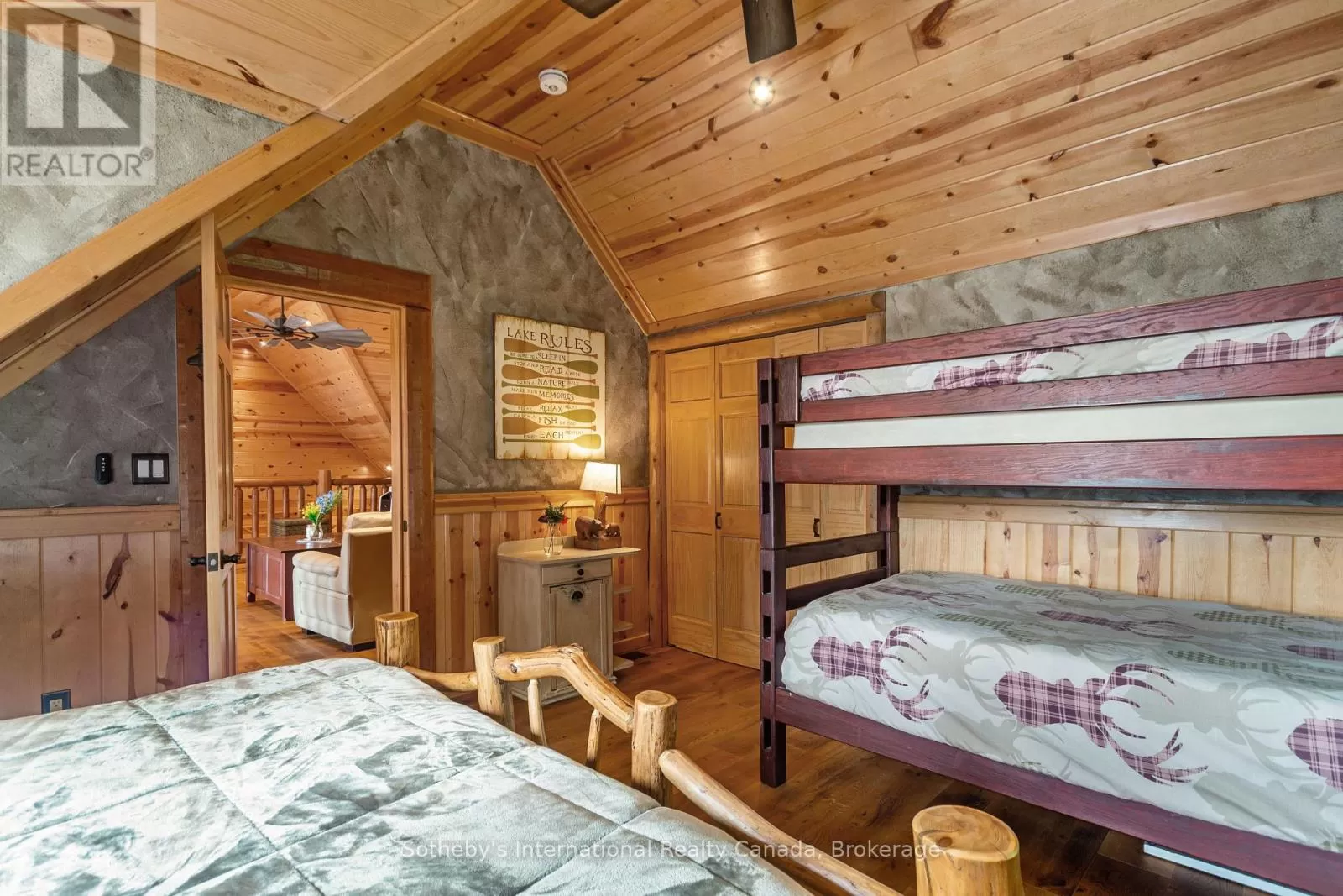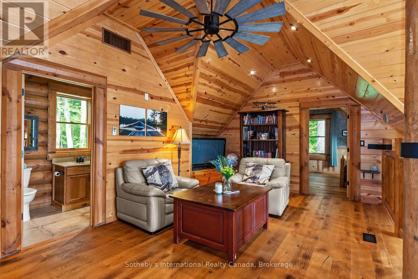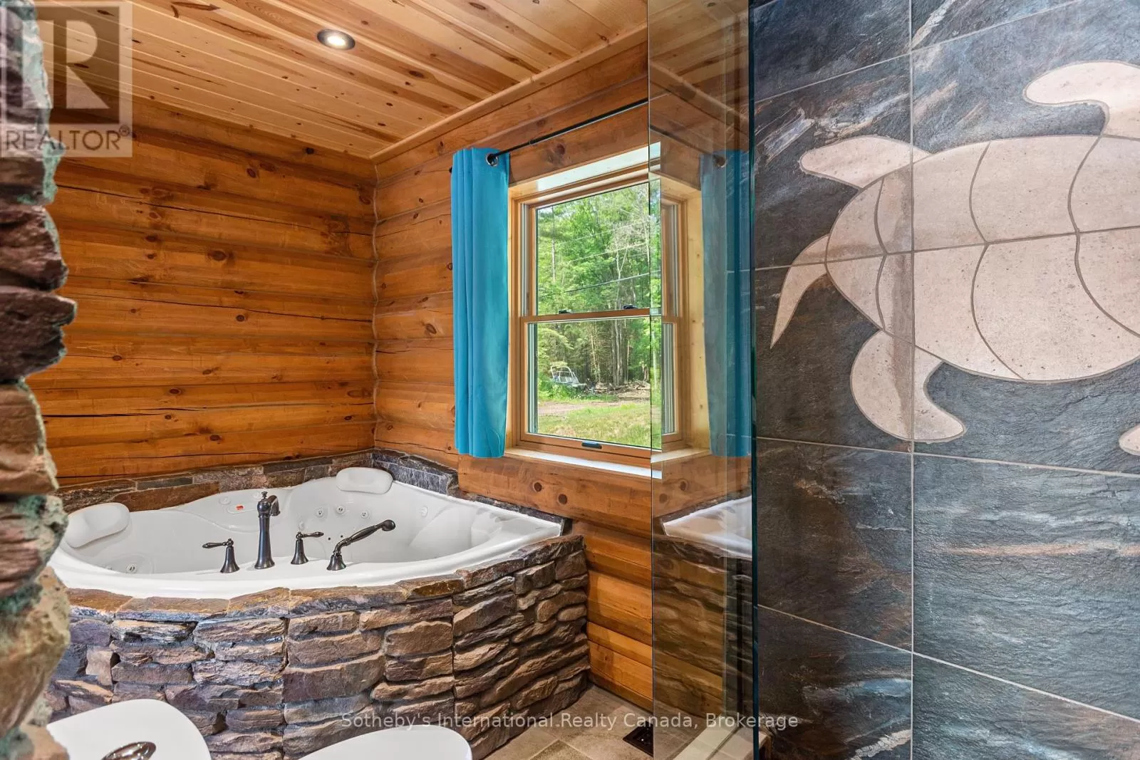 Cross Streets: HWY400/EXIT 177/GHLMarina/Boat. ** Directions: Hwy 400 to Exit 177. Then go Home Lake Road to Go Home Lake Marina. By Boat to Crystal Bay. Welcome to your dream waterfront retreat in Crystal Bay on Go Home Lake! This stunning winterized Golden Eagle log home boasts 3 bedrooms, 3 bathrooms, and 2,642 square feet of luxurious living space. Step inside and be captivated by the beauty of the 10" white Wisconsin pine logs that frame the home. Accessed by boat, you are under 10 minutes from the marina. Enjoy the serene ambiance with 558 feet of water frontage, set on a spacious 1.56-acre lot. The southeast exposure fills the home with natural light, creating a warm and inviting atmosphere. The main floor features a stunning ledge rock fireplace in the spacious living room while the dining room offers ample seating for gatherings. The gourmet kitchen is a chef's delight, equipped with stainless steel appliances, a moveable island, granite countertops, and a beautiful stone backsplash. The spacious primary suite boasts a walk-out to the deck, complete with an ensuite that includes a jacuzzi tub, custom granite shower, and double sink. The attention to detail is evident with custom stonework throughout. Rounding out this level is a bathroom designed to resemble an outhouse, adding a unique touch to the home and a convenient stackable laundry pair. Upstairs, the loft area overlooks floor-to-ceiling windows, creating a cozy retreat. Here you will also find two generously sized bedrooms with vaulted ceilings and a 4-piece bath that provides comfortable accommodations for family and guests. This home is beautifully furnished throughout, showcasing quality furniture and log beds that perfectly complement the rustic charm. Outside, the tastefully landscaped property features a flagstone front yard, a tiki bar on the dock, and a sand beach area creating the ideal space for outdoor entertaining. Relax and enjoy the soothing sounds of your own personal waterfall. The adjacent property is also for sale, offering the potential for a family compound, complete with a spacious 3 bedroom log home (see MLS # X12016866). (id:27476)