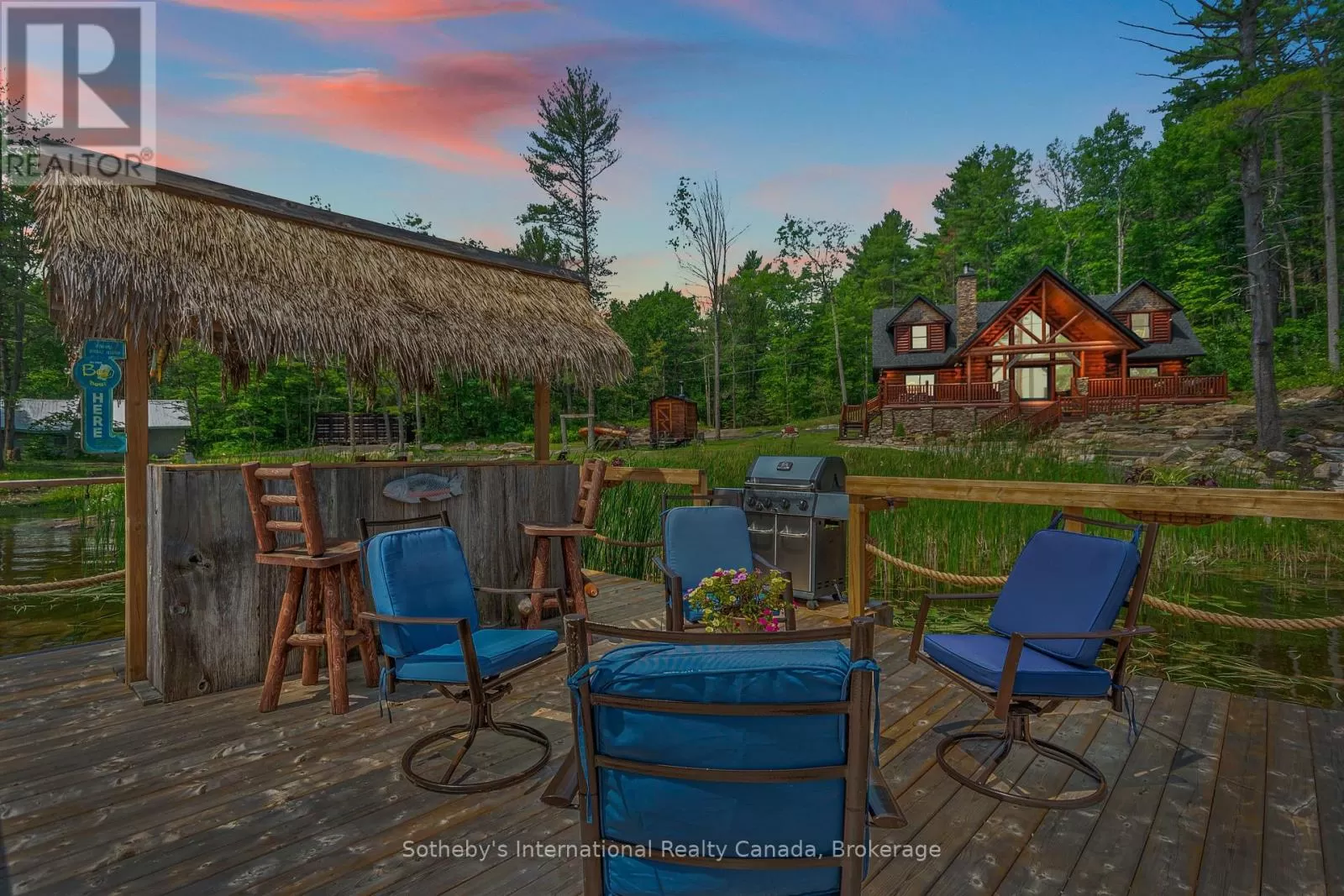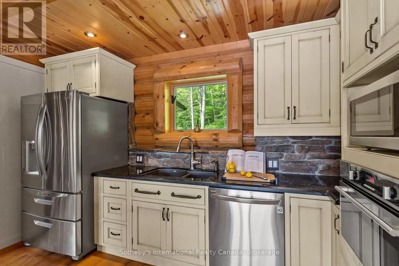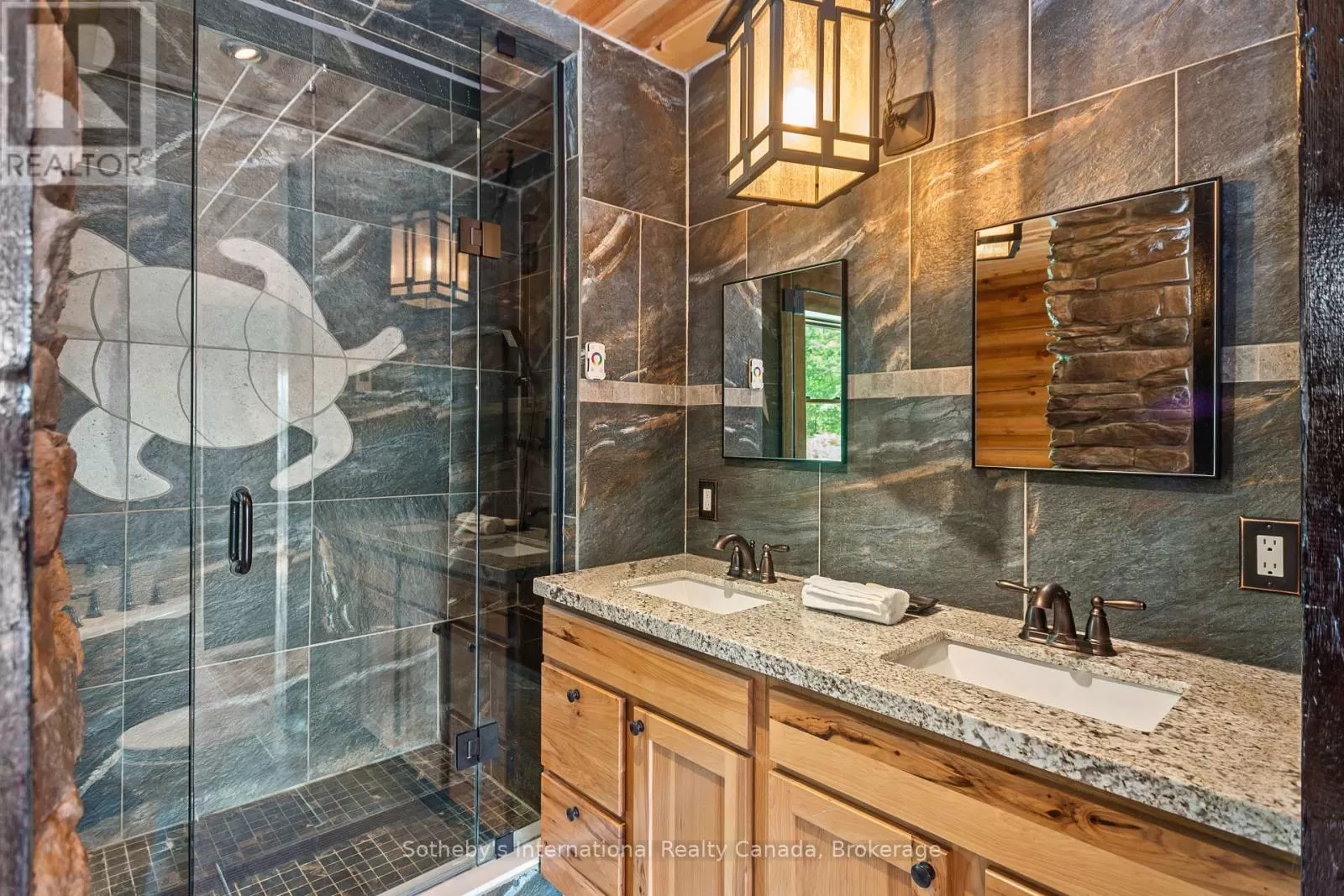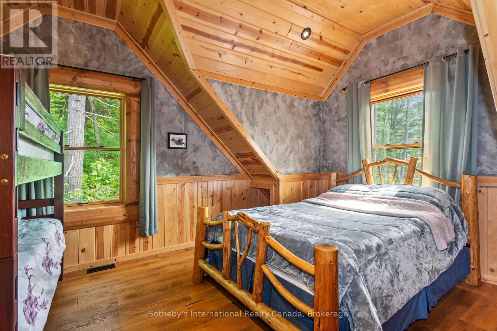 Cross Streets: HWY400/EXIT 177/GHLMarina/Boat. ** Directions: Hwy 400 to Exit 177. Then go Home Lake Road to Go Home Lake Marina. By Boat to Crystal Bay. Welcome to your dream waterfront retreat in Crystal Bay on Go Home Lake! This stunning winterized Golden Eagle log home boasts 3 bedrooms, 3 bathrooms, and 2,642 square feet of luxurious living space. Step inside and be captivated by the beauty of the 10" white Wisconsin pine logs that frame the home. Accessed by boat, you are under 10 minutes from the marina. Enjoy the serene ambiance with 558 feet of water frontage, set on a spacious 1.56-acre lot. The southeast exposure fills the home with natural light, creating a warm and inviting atmosphere. The main floor features a stunning ledge rock fireplace in the spacious living room while the dining room offers ample seating for gatherings. The gourmet kitchen is a chef's delight, equipped with stainless steel appliances, a moveable island, granite countertops, and a beautiful stone backsplash. The spacious primary suite boasts a walk-out to the deck, complete with an ensuite that includes a jacuzzi tub, custom granite shower, and double sink. The attention to detail is evident with custom stonework throughout. Rounding out this level is a bathroom designed to resemble an outhouse, adding a unique touch to the home and a convenient stackable laundry pair. Upstairs, the loft area overlooks floor-to-ceiling windows, creating a cozy retreat. Here you will also find two generously sized bedrooms with vaulted ceilings and a 4-piece bath that provides comfortable accommodations for family and guests. This home is beautifully furnished throughout, showcasing quality furniture and log beds that perfectly complement the rustic charm. Outside, the tastefully landscaped property features a flagstone front yard, a tiki bar on the dock, and a sand beach area creating the ideal space for outdoor entertaining. Relax and enjoy the soothing sounds of your own personal waterfall. The adjacent property is also for sale, offering the potential for a family compound, complete with a spacious 3 bedroom log home (see MLS # X12016866). (id:27476)