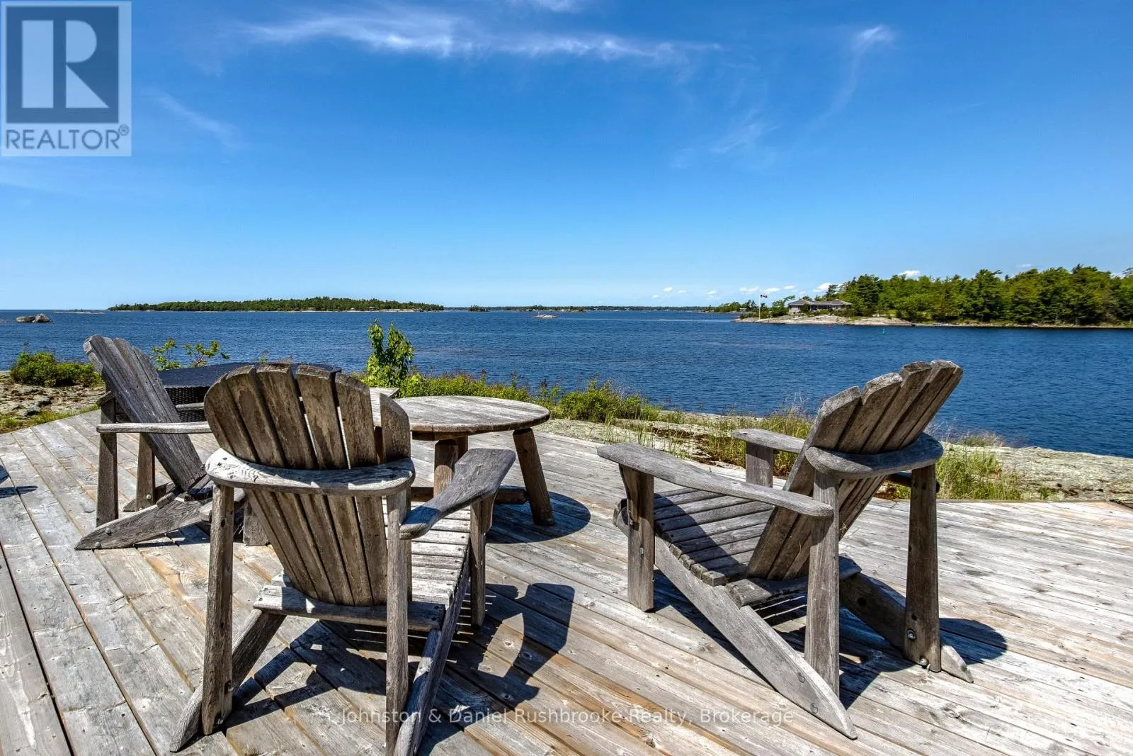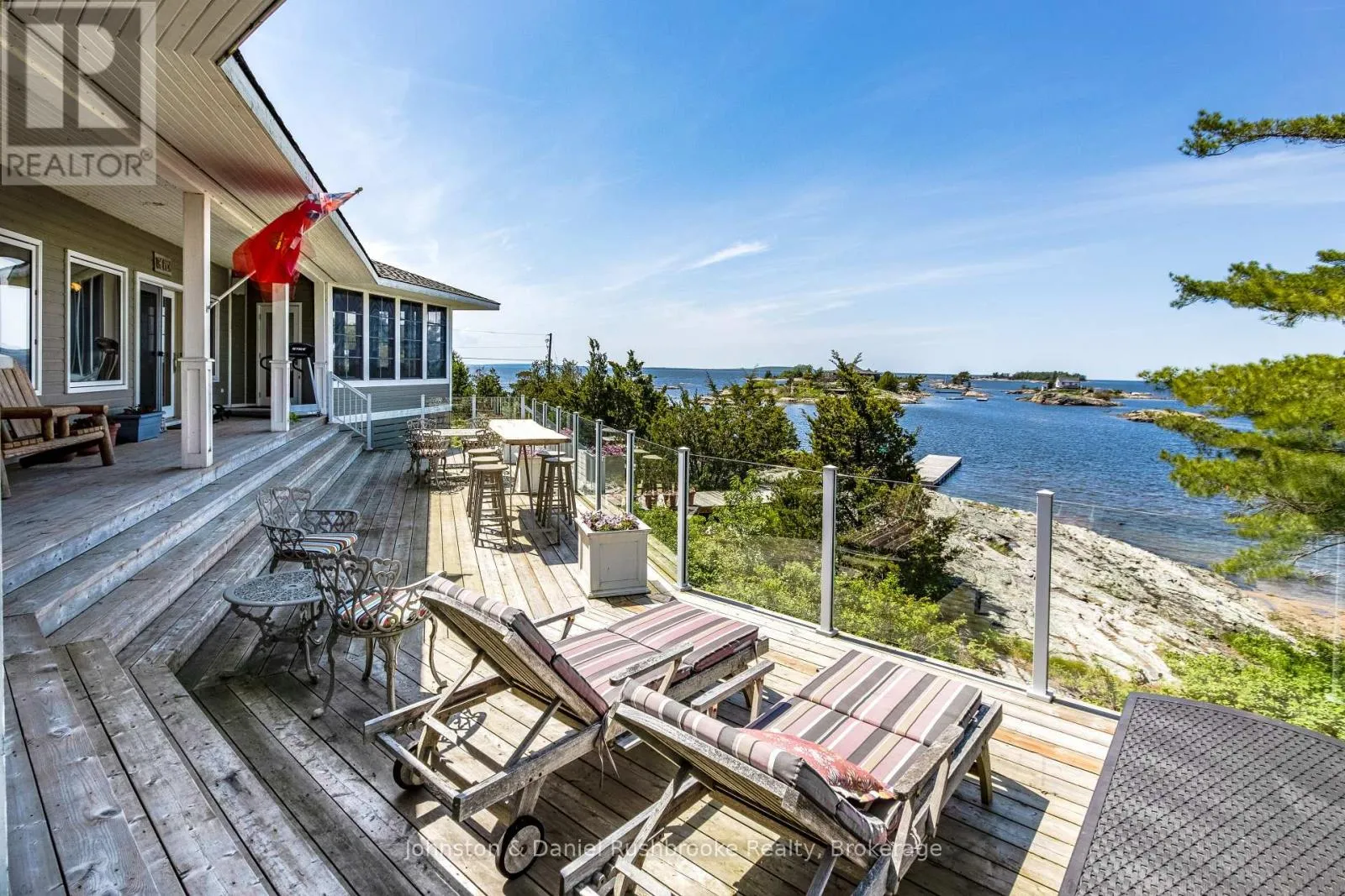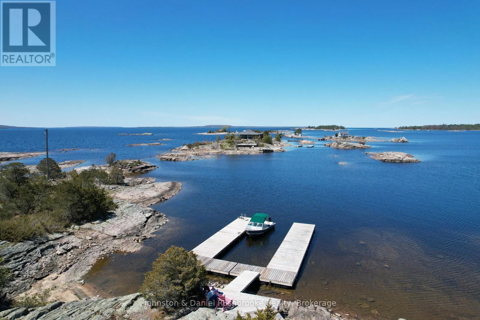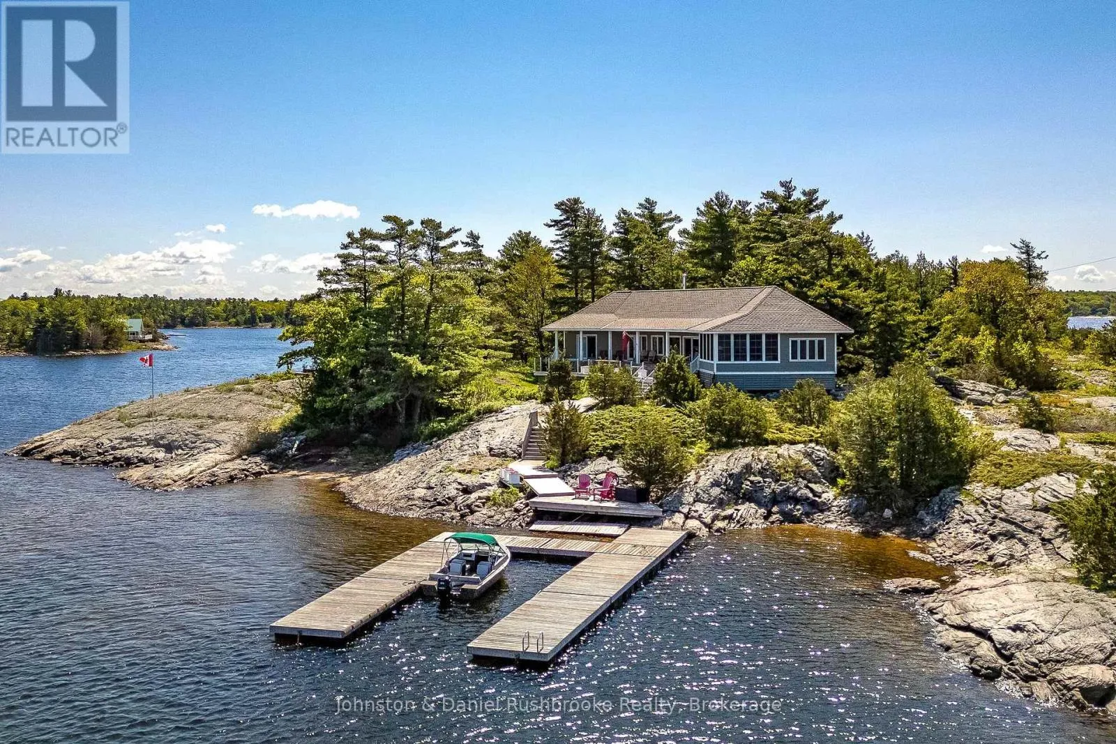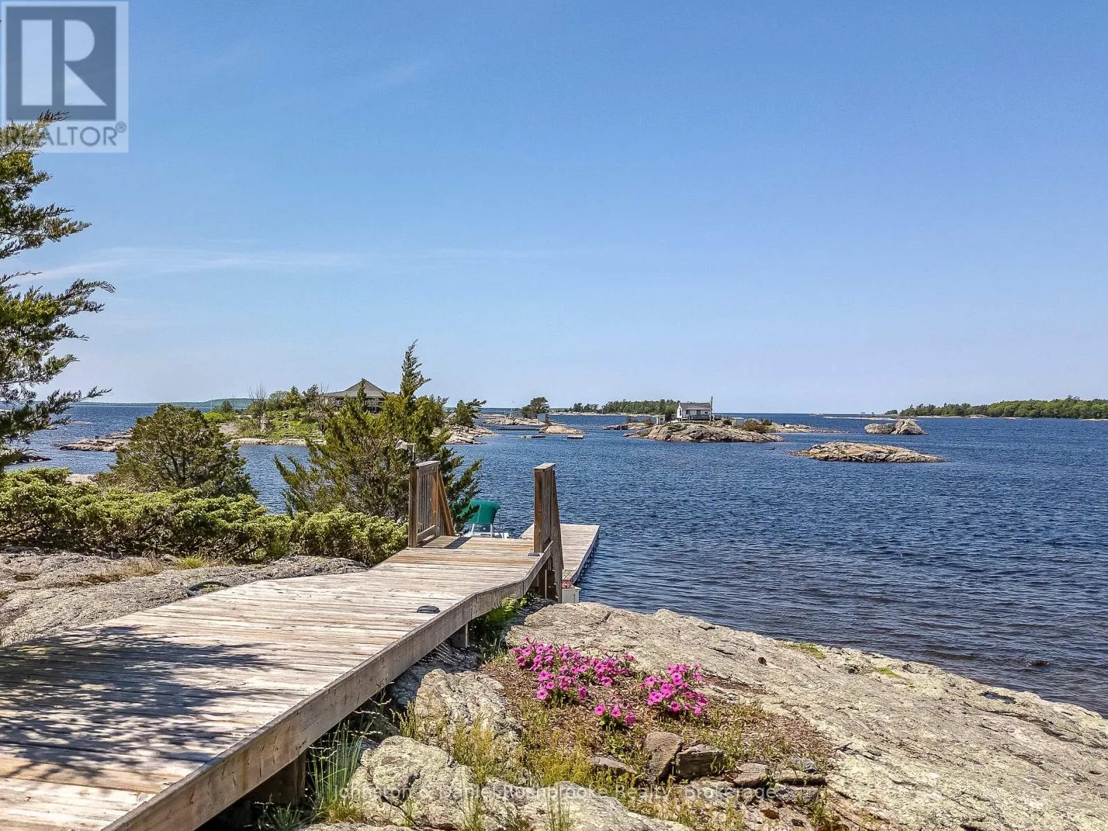Cross Streets: Honey Harbour. ** Directions: By boat from Honey Harbour. Carved from granite and framed by windswept pines, this stunning island in Georgian Bay's prized Cognashene area offers 520 feet of pristine shoreline. The custom-built cottage is anchored by vaulted ceilings, a stone fireplace, and expansive windows that bring the Bay into every room. Hickory hardwood runs throughout most of the room. The Muskoka Room, with its pine flooring and retractable Weatherwall windows, provides a seamless transition between indoors and out, perfect for summer evenings or cozy fall afternoons. The open-concept kitchen offers generous prep space and looks out over the water. The main cottage features 3 bedrooms and 3 bathrooms, including a tranquil primary with an ensuite, a guest bedroom with a 2-piece bath, and a third bedroom perfect for teens with a separate entrance, and a 3-piece bath. All bathrooms feature heated tile floors. The 620 sq. ft. guest bunkie provides 2 additional bedrooms, a sitting area, a shared bath, and its own kitchenette, plus a private deck and hot tub for star-filled evenings. Outdoor living is effortless with an 800 sq. ft. partially covered deck offering panoramic Bay views, and a 400 sq. ft. waterside deck with sun from dawn to dusk. Boaters will love the deep-water dockage at the U-shaped floating dock, with quick access to open water. This timeless retreat is designed for a new family's effortless connection to the splendour and serenity of the Bay. A spectacular adjoining vacant lot is also available for those seeking extended privacy or future expansion. Just a 15-minute boat ride from the nearest Honey Harbour marina, yet completely removed from the rhythm of everyday life, this rare island offering is more than a cottage. It is a story waiting to be lived in one of Georgian Bay's most coveted areas. Discover the mystique of Georgian Bay island cottaging, it's unmatched by any other cottage destination. (id:27476)