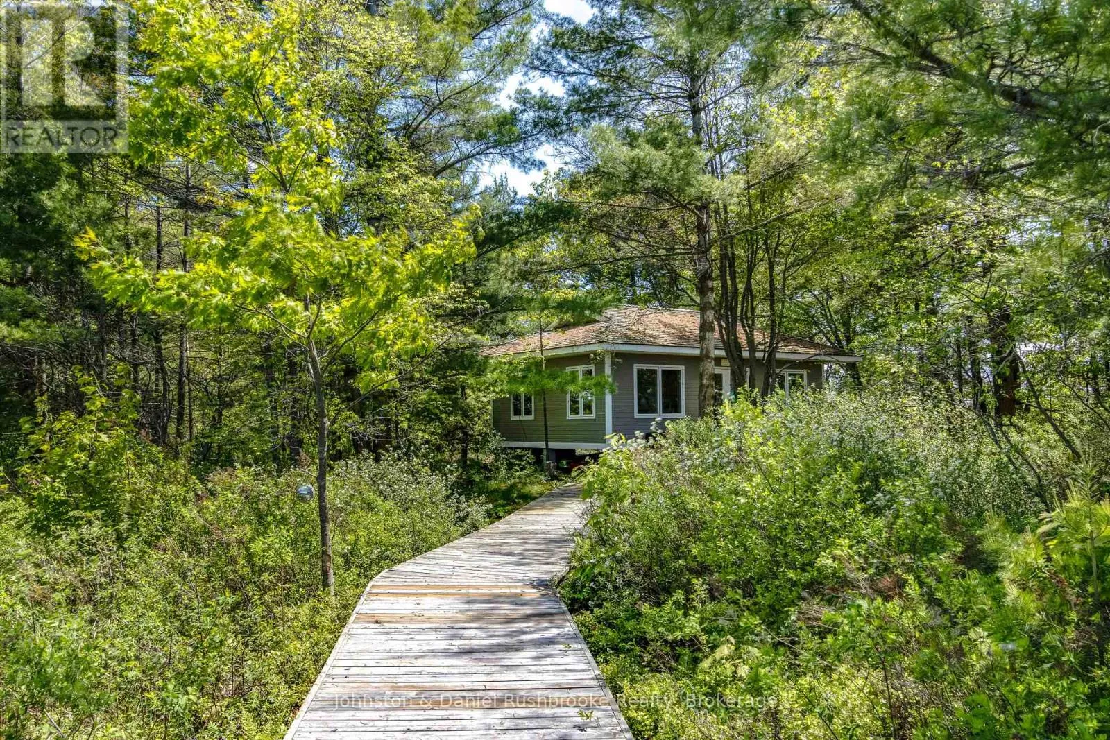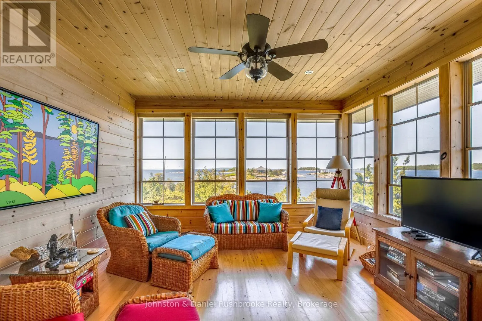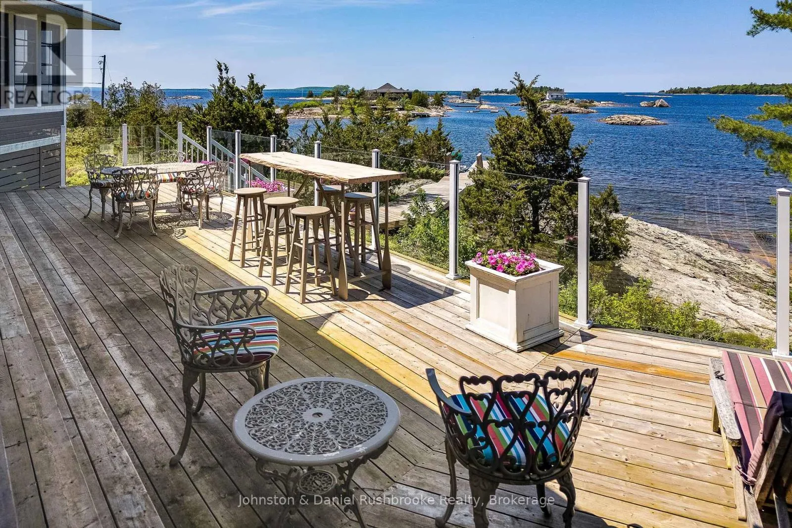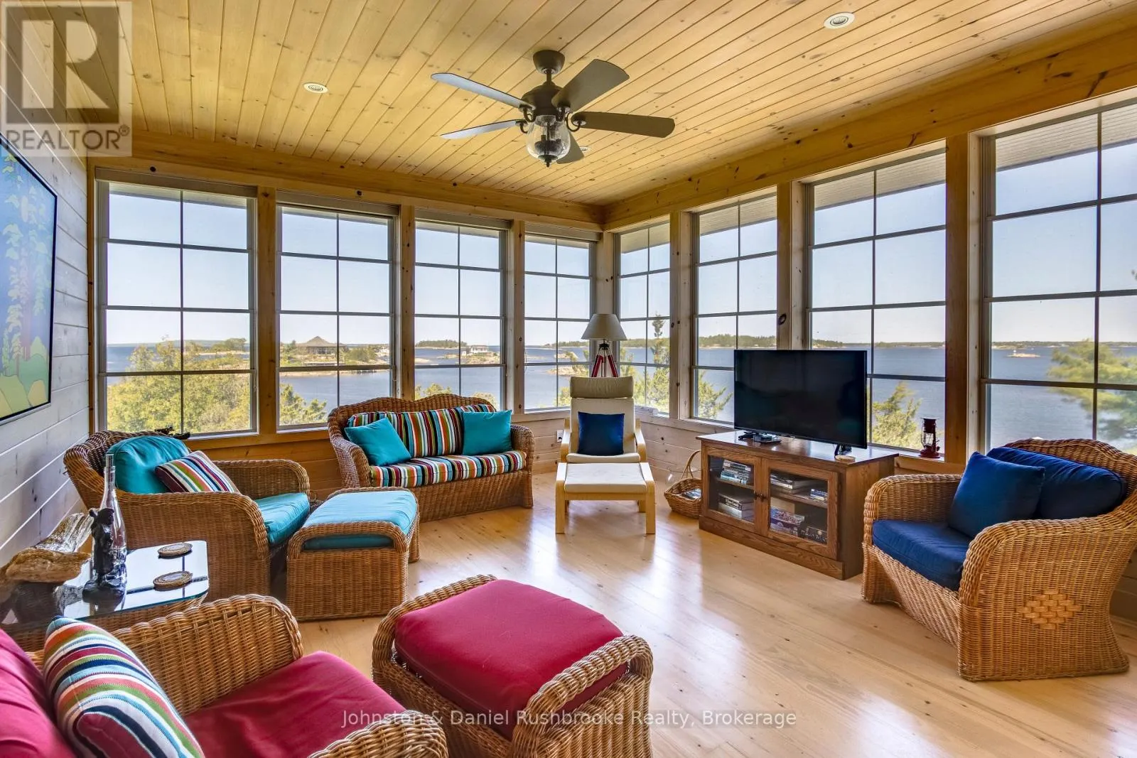 Cross Streets: Honey Harbour. ** Directions: By boat from Honey Harbour. Carved from granite and framed by windswept pines, this stunning island in Georgian Bay's prized Cognashene area offers 520 feet of pristine shoreline. The custom-built cottage is anchored by vaulted ceilings, a stone fireplace, and expansive windows that bring the Bay into every room. Hickory hardwood runs throughout most of the room. The Muskoka Room, with its pine flooring and retractable Weatherwall windows, provides a seamless transition between indoors and out, perfect for summer evenings or cozy fall afternoons. The open-concept kitchen offers generous prep space and looks out over the water. The main cottage features 3 bedrooms and 3 bathrooms, including a tranquil primary with an ensuite, a guest bedroom with a 2-piece bath, and a third bedroom perfect for teens with a separate entrance, and a 3-piece bath. All bathrooms feature heated tile floors. The 620 sq. ft. guest bunkie provides 2 additional bedrooms, a sitting area, a shared bath, and its own kitchenette, plus a private deck and hot tub for star-filled evenings. Outdoor living is effortless with an 800 sq. ft. partially covered deck offering panoramic Bay views, and a 400 sq. ft. waterside deck with sun from dawn to dusk. Boaters will love the deep-water dockage at the U-shaped floating dock, with quick access to open water. This timeless retreat is designed for a new family's effortless connection to the splendour and serenity of the Bay. A spectacular adjoining vacant lot is also available for those seeking extended privacy or future expansion. Just a 15-minute boat ride from the nearest Honey Harbour marina, yet completely removed from the rhythm of everyday life, this rare island offering is more than a cottage. It is a story waiting to be lived in one of Georgian Bay's most coveted areas. Discover the mystique of Georgian Bay island cottaging, it's unmatched by any other cottage destination. (id:27476)