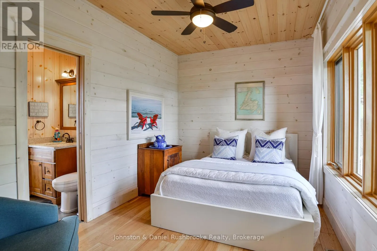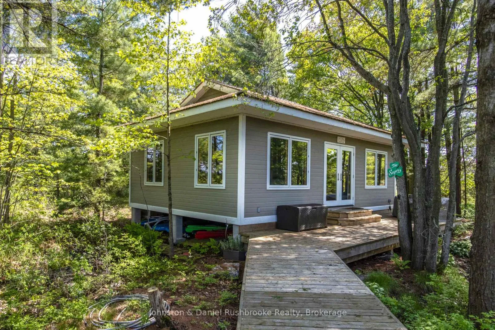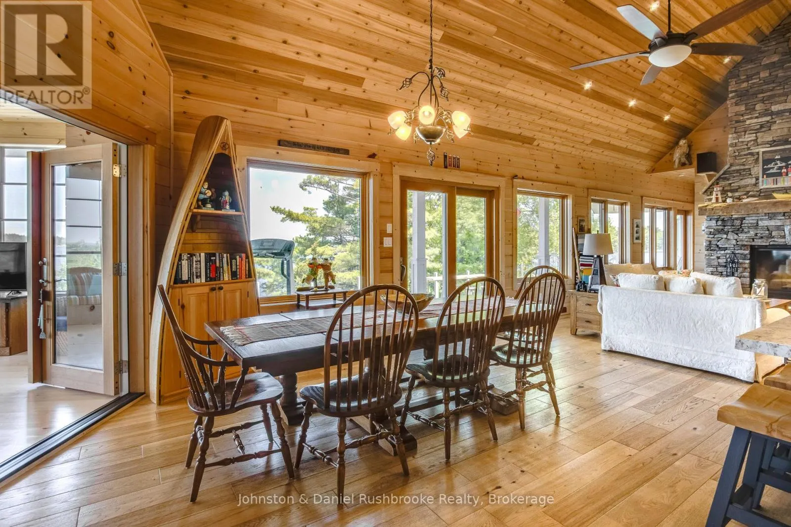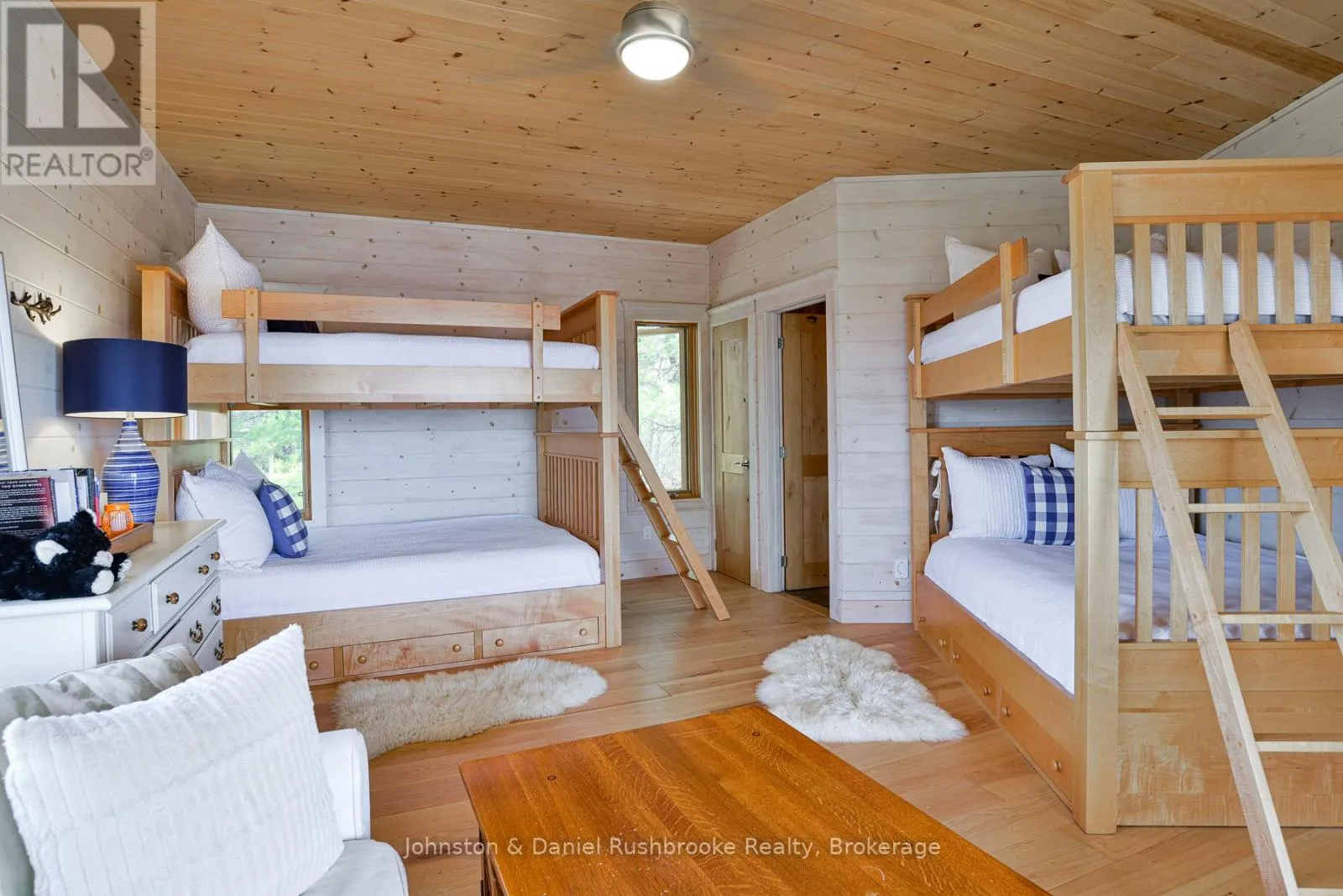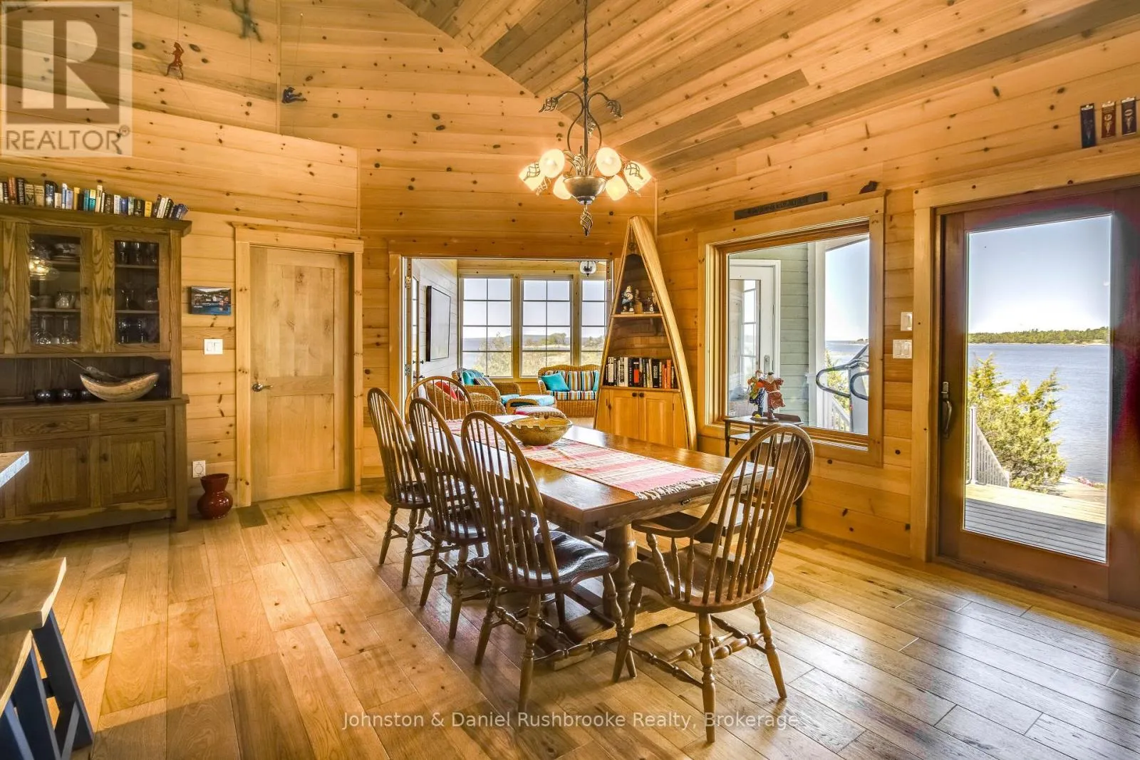 Cross Streets: Honey Harbour. ** Directions: By boat from Honey Harbour. Carved from granite and framed by windswept pines, this stunning island in Georgian Bay's prized Cognashene area offers 520 feet of pristine shoreline. The custom-built cottage is anchored by vaulted ceilings, a stone fireplace, and expansive windows that bring the Bay into every room. Hickory hardwood runs throughout most of the room. The Muskoka Room, with its pine flooring and retractable Weatherwall windows, provides a seamless transition between indoors and out, perfect for summer evenings or cozy fall afternoons. The open-concept kitchen offers generous prep space and looks out over the water. The main cottage features 3 bedrooms and 3 bathrooms, including a tranquil primary with an ensuite, a guest bedroom with a 2-piece bath, and a third bedroom perfect for teens with a separate entrance, and a 3-piece bath. All bathrooms feature heated tile floors. The 620 sq. ft. guest bunkie provides 2 additional bedrooms, a sitting area, a shared bath, and its own kitchenette, plus a private deck and hot tub for star-filled evenings. Outdoor living is effortless with an 800 sq. ft. partially covered deck offering panoramic Bay views, and a 400 sq. ft. waterside deck with sun from dawn to dusk. Boaters will love the deep-water dockage at the U-shaped floating dock, with quick access to open water. This timeless retreat is designed for a new family's effortless connection to the splendour and serenity of the Bay. A spectacular adjoining vacant lot is also available for those seeking extended privacy or future expansion. Just a 15-minute boat ride from the nearest Honey Harbour marina, yet completely removed from the rhythm of everyday life, this rare island offering is more than a cottage. It is a story waiting to be lived in one of Georgian Bay's most coveted areas. Discover the mystique of Georgian Bay island cottaging, it's unmatched by any other cottage destination. (id:27476)