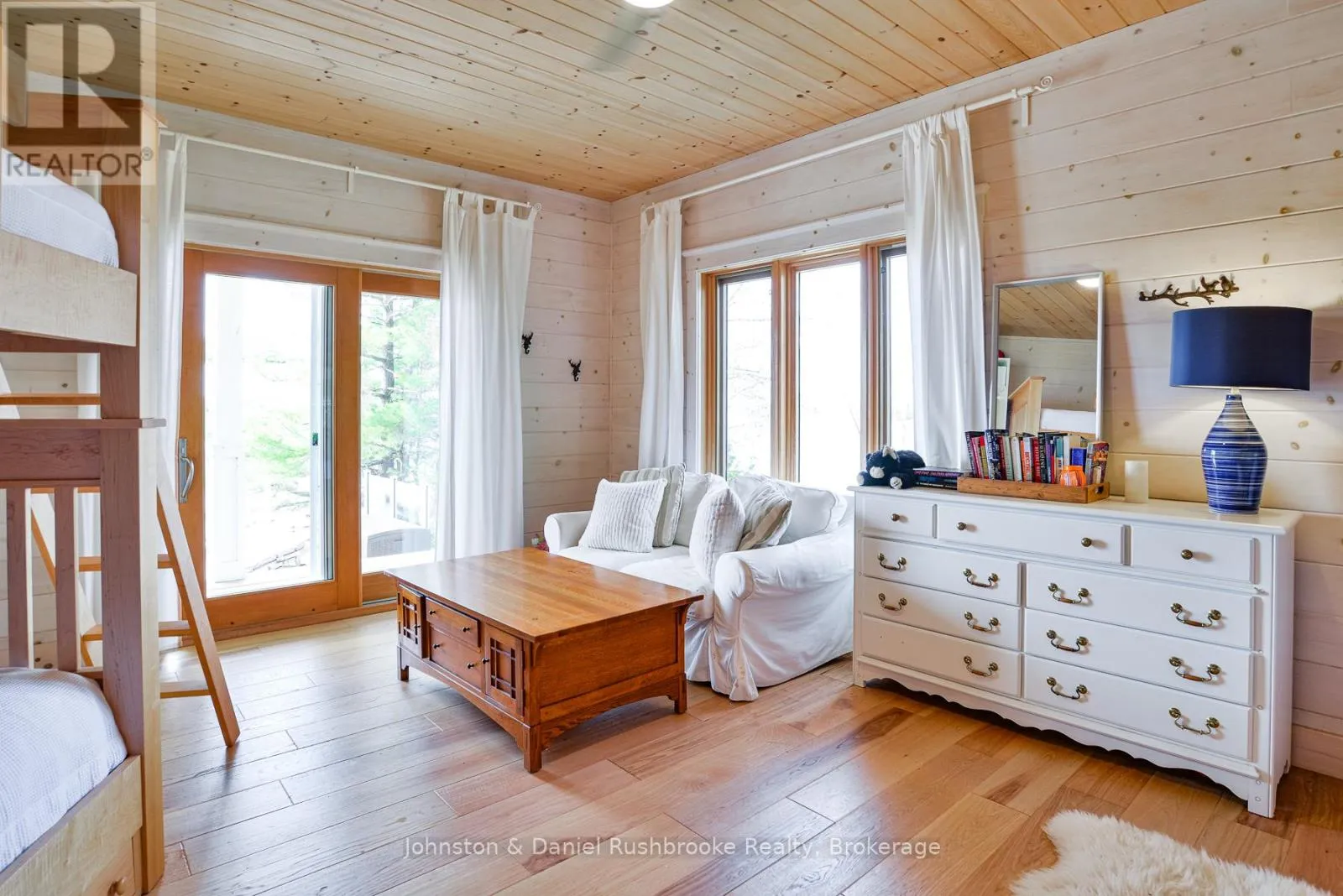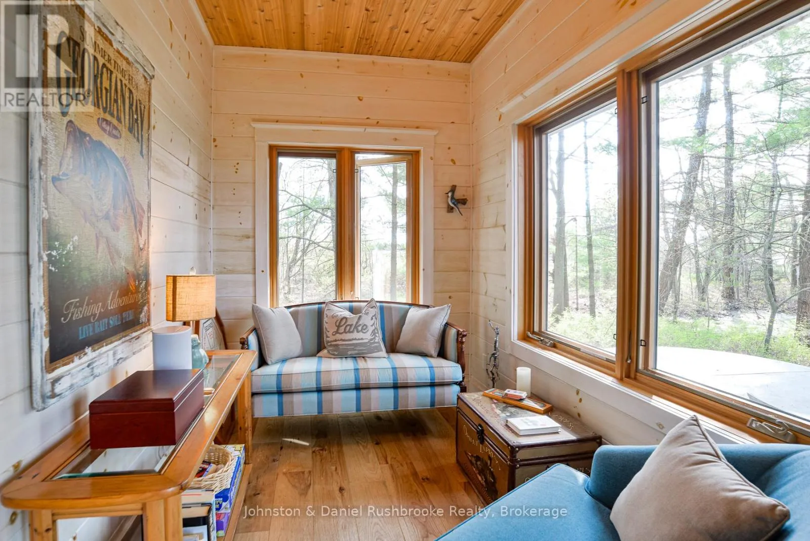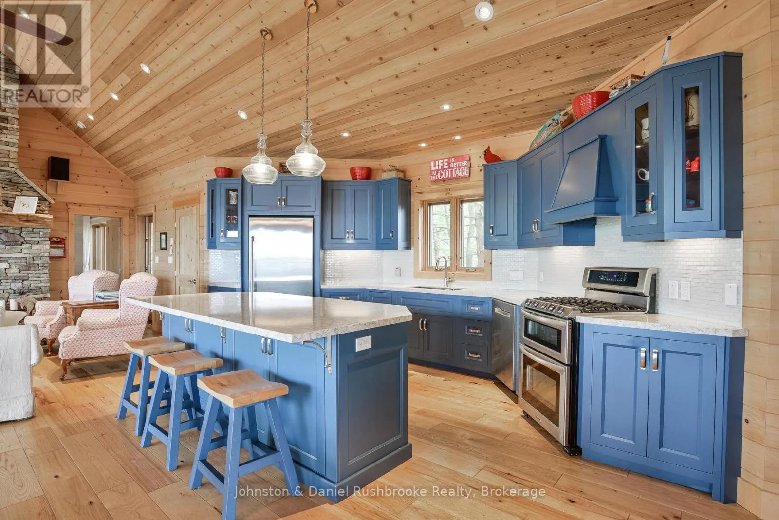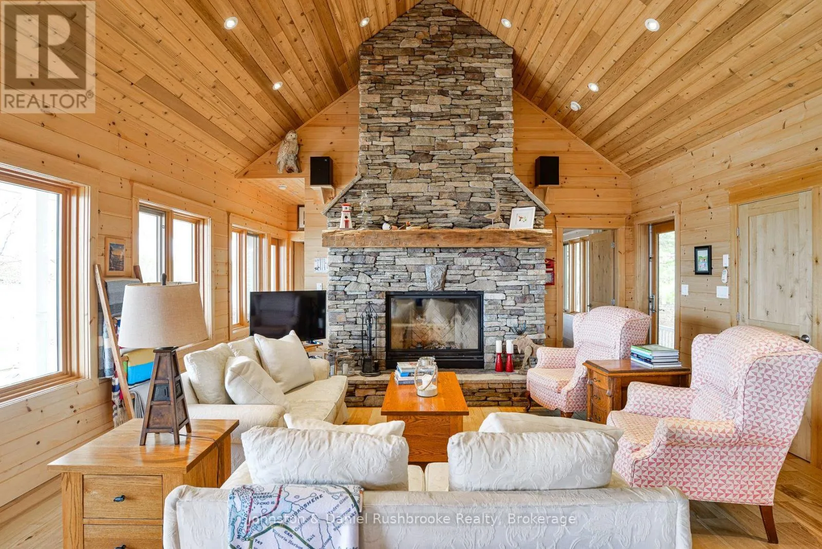 Cross Streets: Honey Harbour. ** Directions: By boat from Honey Harbour. Carved from granite and framed by windswept pines, this stunning island in Georgian Bay's prized Cognashene area offers 520 feet of pristine shoreline. The custom-built cottage is anchored by vaulted ceilings, a stone fireplace, and expansive windows that bring the Bay into every room. Hickory hardwood runs throughout most of the room. The Muskoka Room, with its pine flooring and retractable Weatherwall windows, provides a seamless transition between indoors and out, perfect for summer evenings or cozy fall afternoons. The open-concept kitchen offers generous prep space and looks out over the water. The main cottage features 3 bedrooms and 3 bathrooms, including a tranquil primary with an ensuite, a guest bedroom with a 2-piece bath, and a third bedroom perfect for teens with a separate entrance, and a 3-piece bath. All bathrooms feature heated tile floors. The 620 sq. ft. guest bunkie provides 2 additional bedrooms, a sitting area, a shared bath, and its own kitchenette, plus a private deck and hot tub for star-filled evenings. Outdoor living is effortless with an 800 sq. ft. partially covered deck offering panoramic Bay views, and a 400 sq. ft. waterside deck with sun from dawn to dusk. Boaters will love the deep-water dockage at the U-shaped floating dock, with quick access to open water. This timeless retreat is designed for a new family's effortless connection to the splendour and serenity of the Bay. A spectacular adjoining vacant lot is also available for those seeking extended privacy or future expansion. Just a 15-minute boat ride from the nearest Honey Harbour marina, yet completely removed from the rhythm of everyday life, this rare island offering is more than a cottage. It is a story waiting to be lived in one of Georgian Bay's most coveted areas. Discover the mystique of Georgian Bay island cottaging, it's unmatched by any other cottage destination. (id:27476)