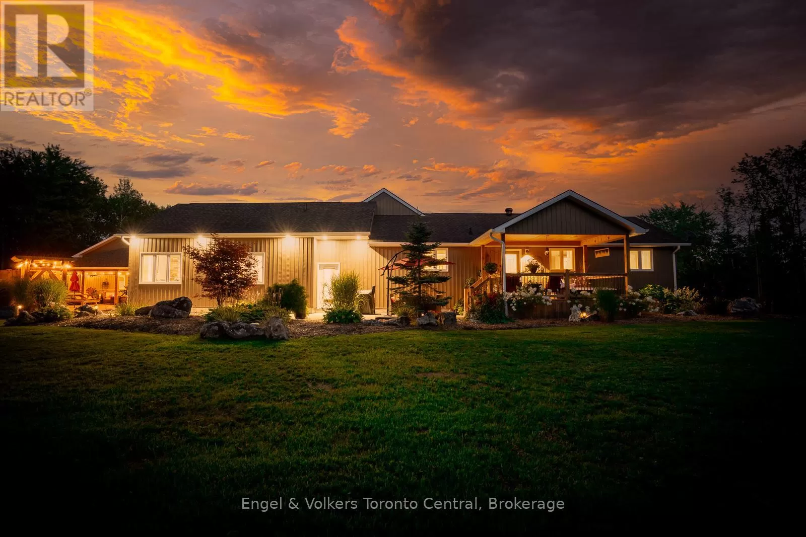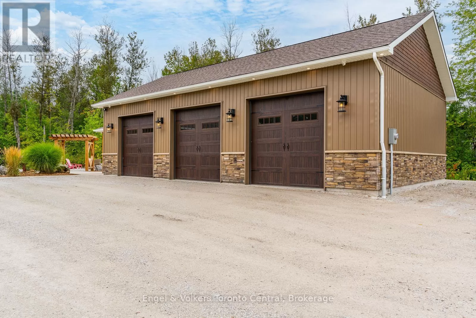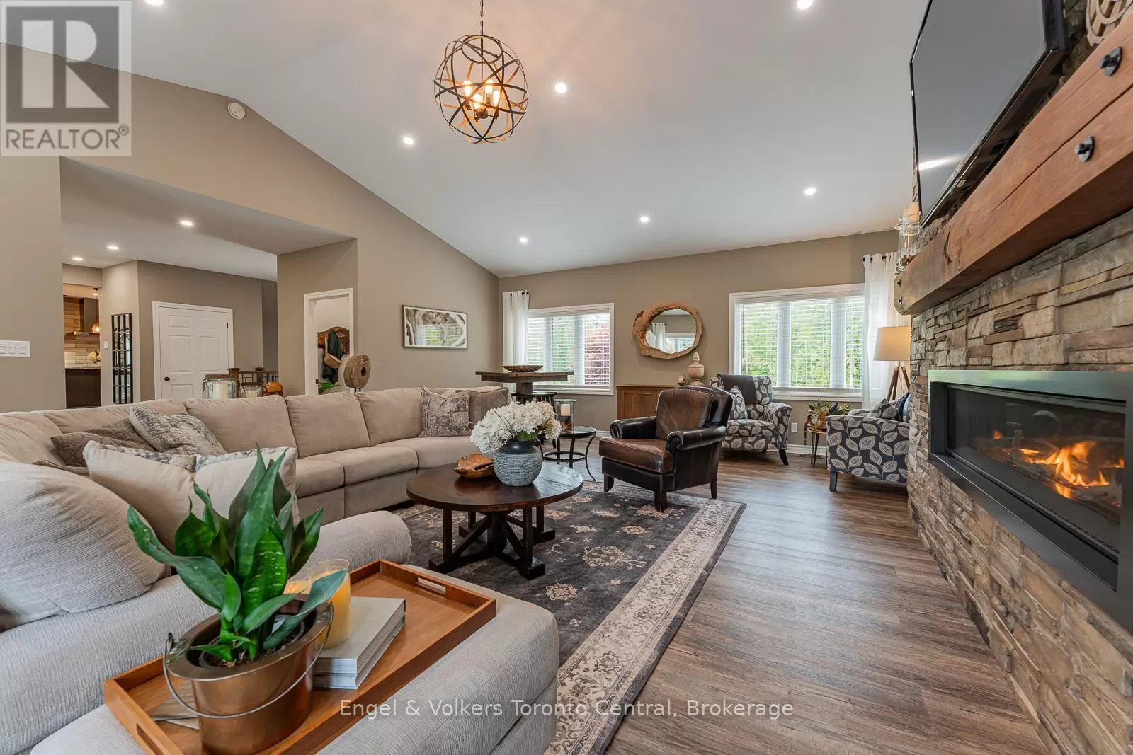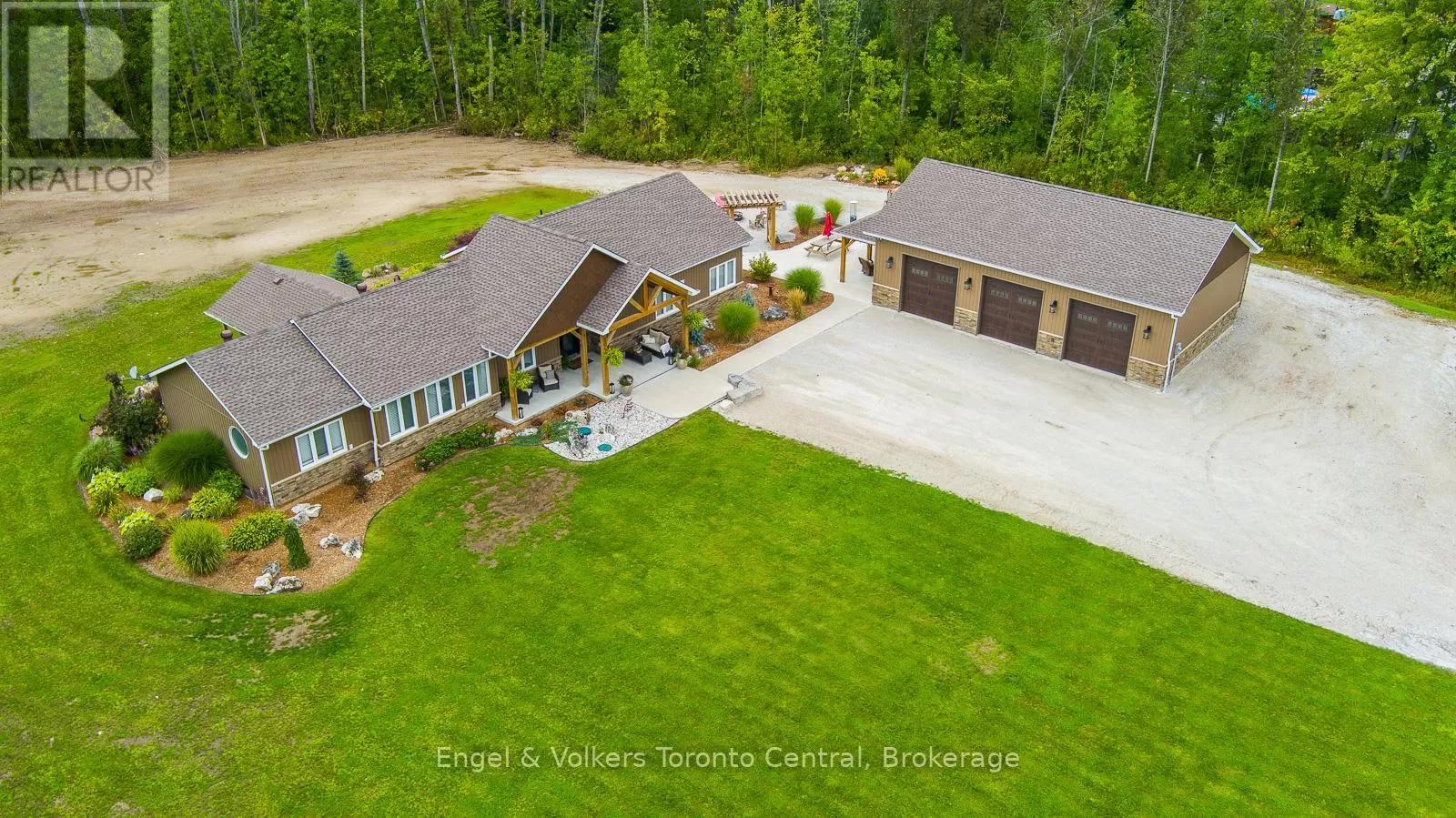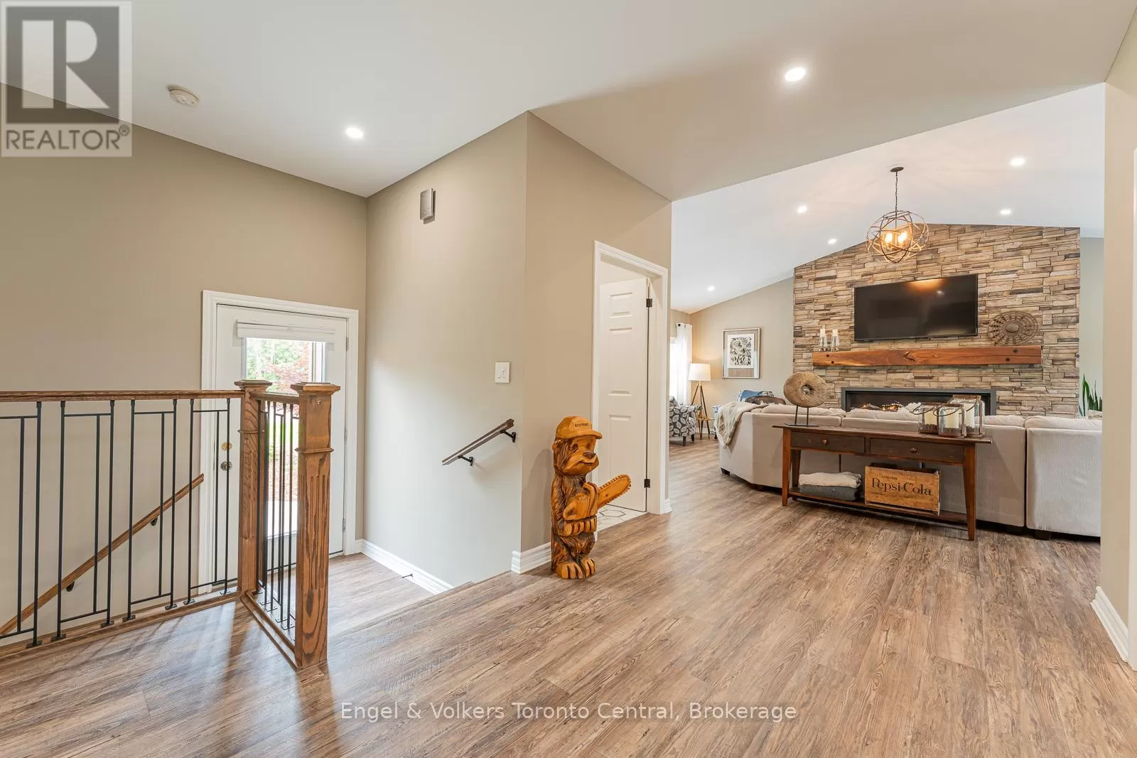 From Grey Road 17B turn onto Somers Street. Continue on Somers St to #242 on the left hand side. Indulge in Refined Country Living. This stunningly renovated bungalow, set on a private five-acre woodland, offers an unparalleled lifestyle of luxury and tranquility. The gourmet kitchen is a culinary masterpiece, boasting high-end stainless steel appliances and durable, elegant Cambria Quartz countertops. The open-concept layout flows beautifully into a grand living area with a breathtaking 13-foot vaulted ceiling and a striking stone fireplace. Enjoy formal dining with picturesque views. The primary suite is a true oasis, featuring a spa-inspired 4-piece ensuite with a steam shower and heated floors, plus private access to a covered hot tub porch. The finished lower level adds versatile living space with two bedrooms and a bath. A standout feature is the fully insulated and heated 3-bay workshop. Embrace outdoor living with a covered patio, fire pit, and the peaceful presence of local wildlife. Enjoy the best of both worlds: serene country living with easy access to Owen Sound's conveniences and outdoor adventures. (id:27476)
