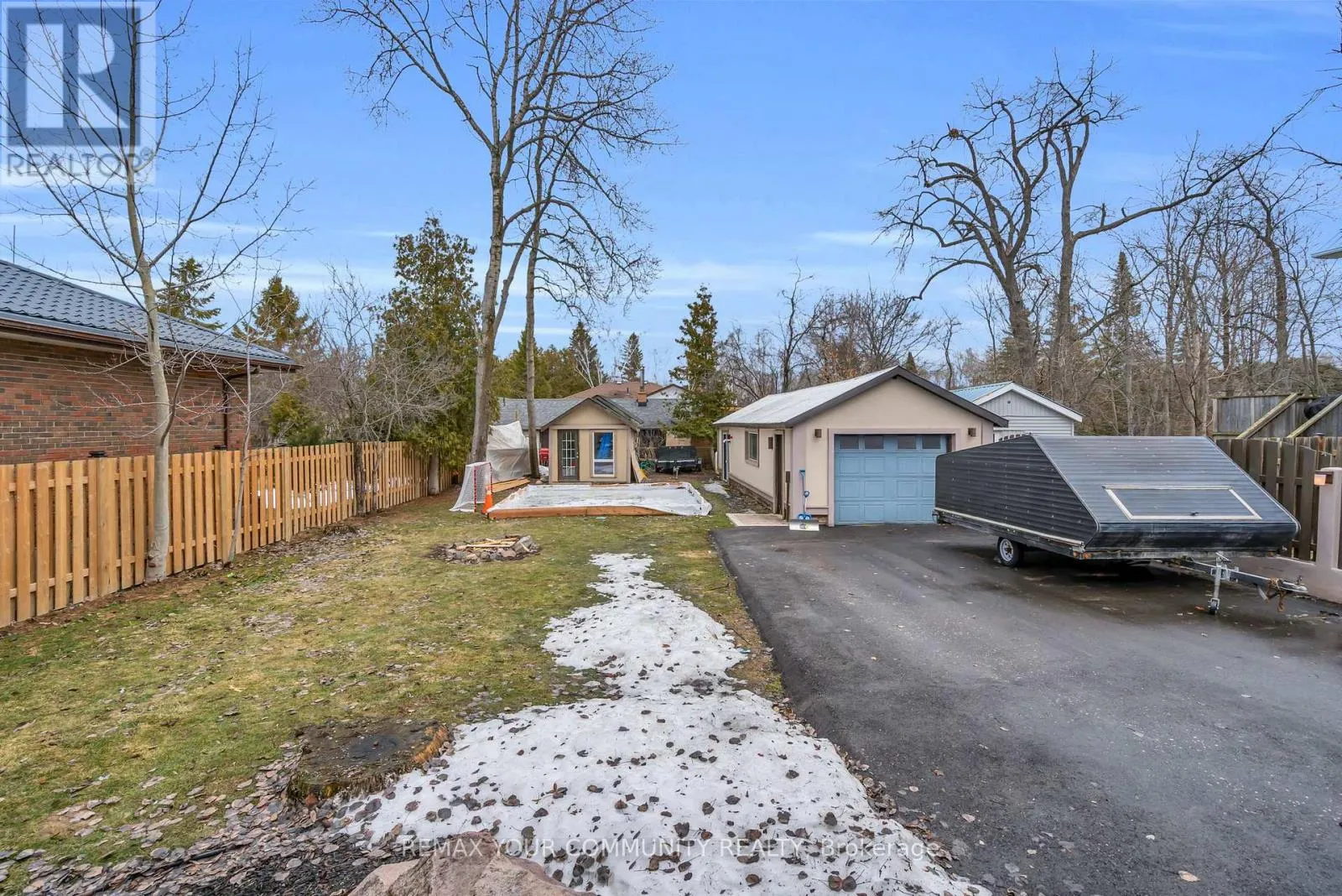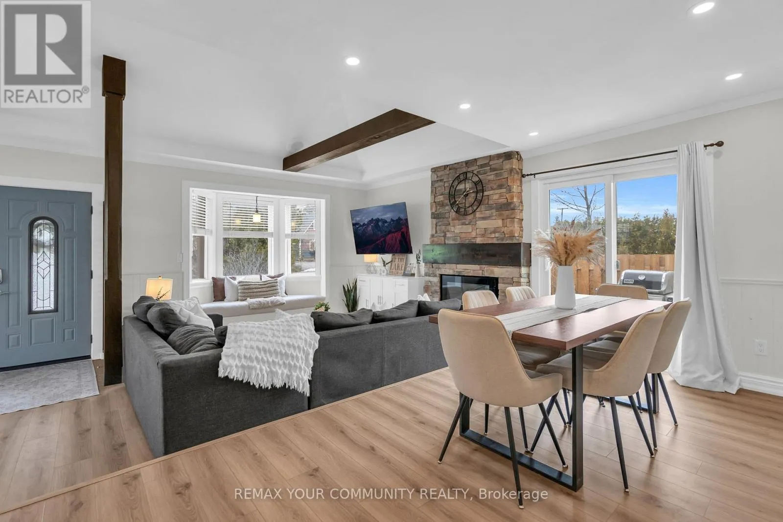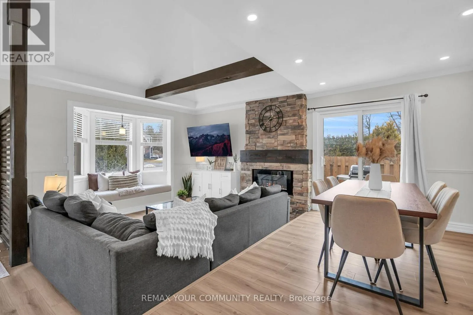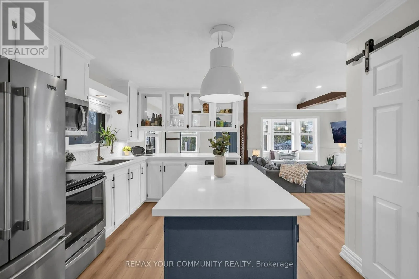Cross Streets: Kennedy Rd /Metro Rd N. ** Directions: Metro Rd to Farley Circle. Just steps from Lake Simcoe with exclusive residents only lake access, this well maintained home features a bright updated kitchen with quartz countertops, new flooring throughout the main floor, fresh paint, and plenty of natural light. The sunken living room is full of character with cathedral ceilings, wooden beams, a cozy bow window nook, and a beautiful new fireplace feature. The spacious primary suite offers a private ensuite and walkout to a balcony perfect for peaceful mornings. Sliding doors off the dining room lead to a fully fenced, beautifully landscaped backyard with a spacious driveway that leads right to the back, a shed for extra storage and a large detached garage with heat & hydro. Located in a sought after lakeside community, this home is perfect for relaxed living near the water. (id:27476)