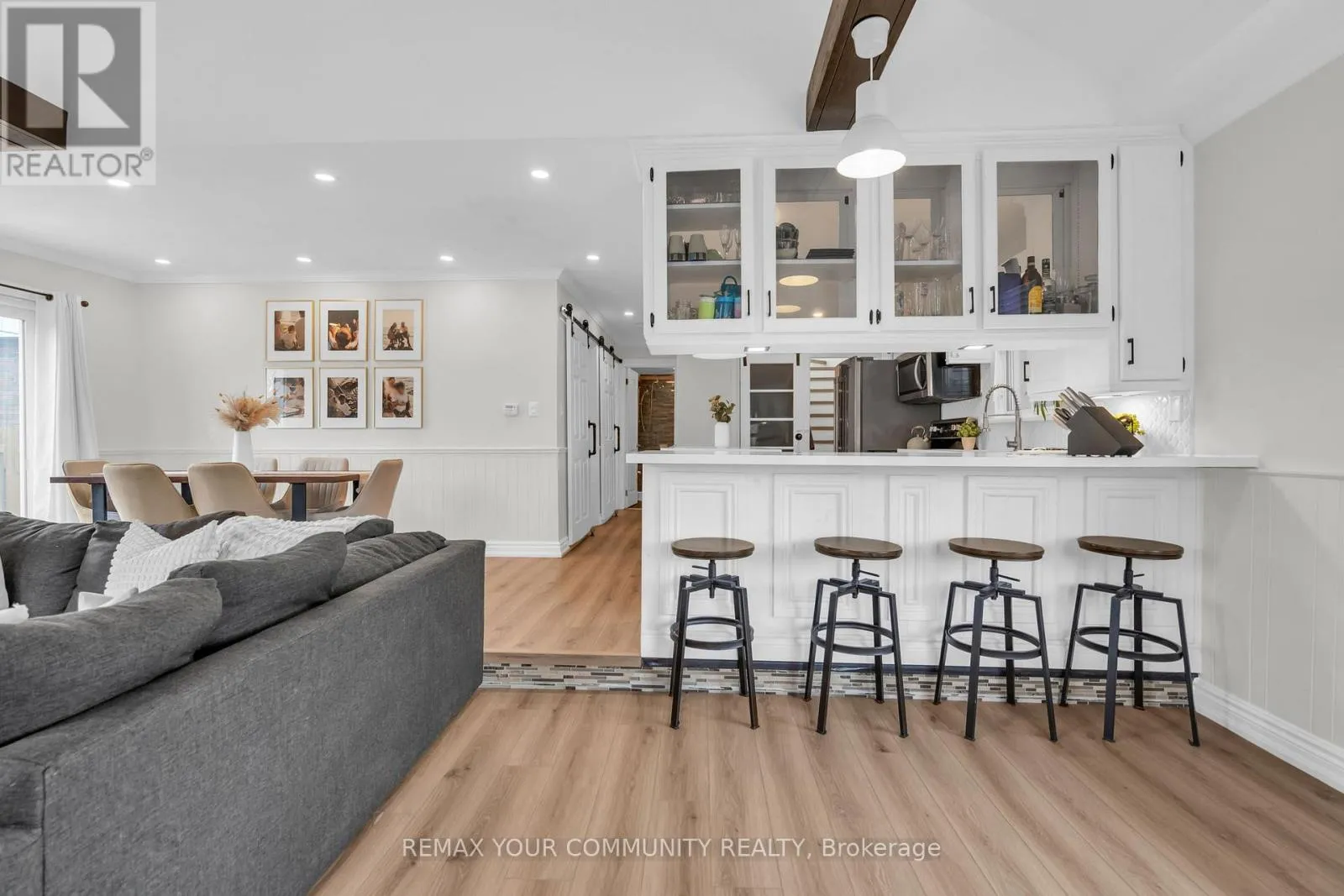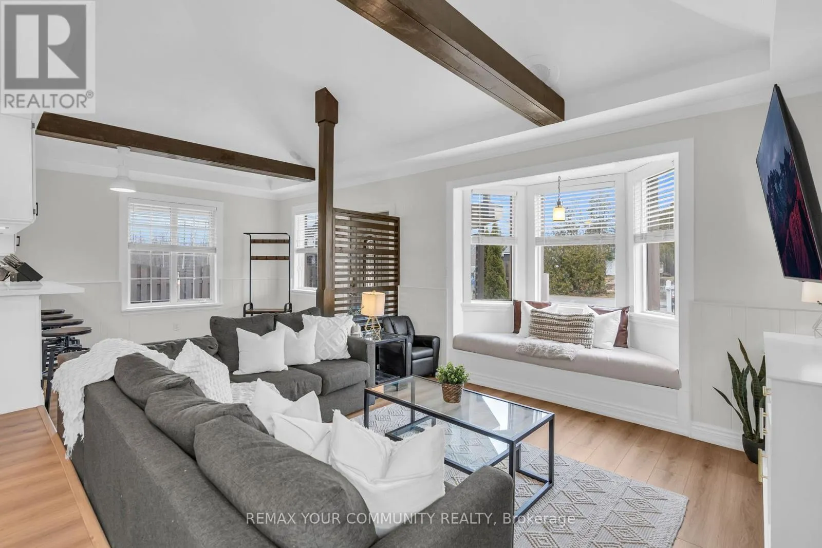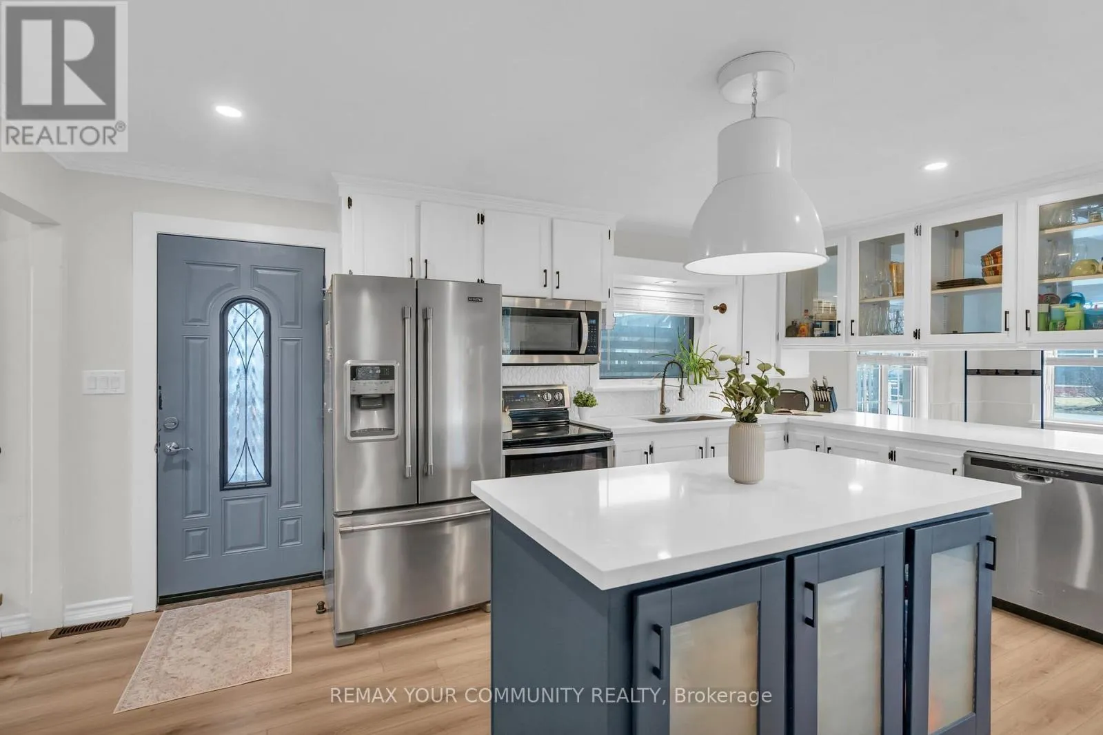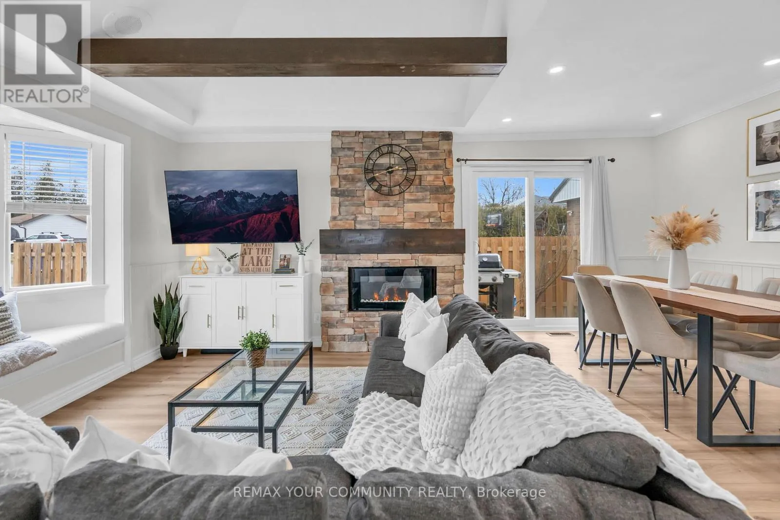 Cross Streets: Kennedy Rd /Metro Rd N. ** Directions: Metro Rd to Farley Circle. Just steps from Lake Simcoe with exclusive residents only lake access, this well maintained home features a bright updated kitchen with quartz countertops, new flooring throughout the main floor, fresh paint, and plenty of natural light. The sunken living room is full of character with cathedral ceilings, wooden beams, a cozy bow window nook, and a beautiful new fireplace feature. The spacious primary suite offers a private ensuite and walkout to a balcony perfect for peaceful mornings. Sliding doors off the dining room lead to a fully fenced, beautifully landscaped backyard with a spacious driveway that leads right to the back, a shed for extra storage and a large detached garage with heat & hydro. Located in a sought after lakeside community, this home is perfect for relaxed living near the water. (id:27476)