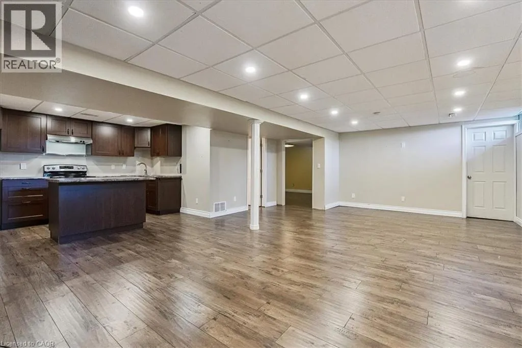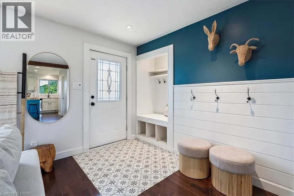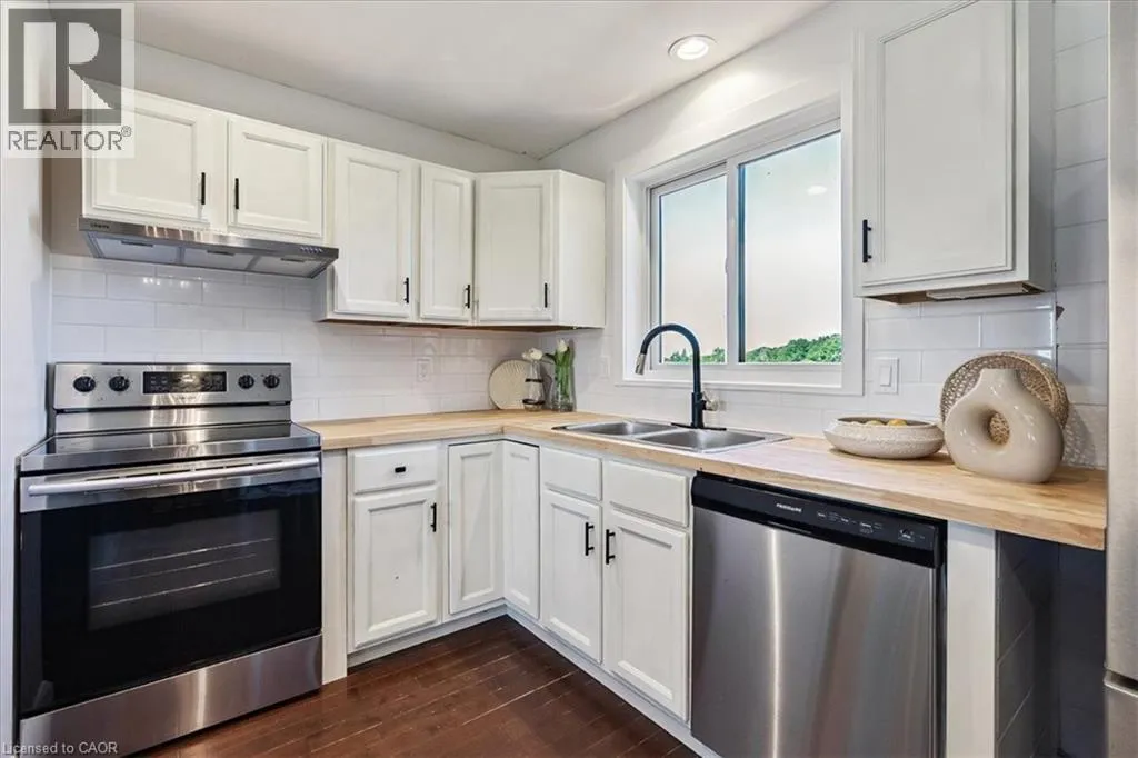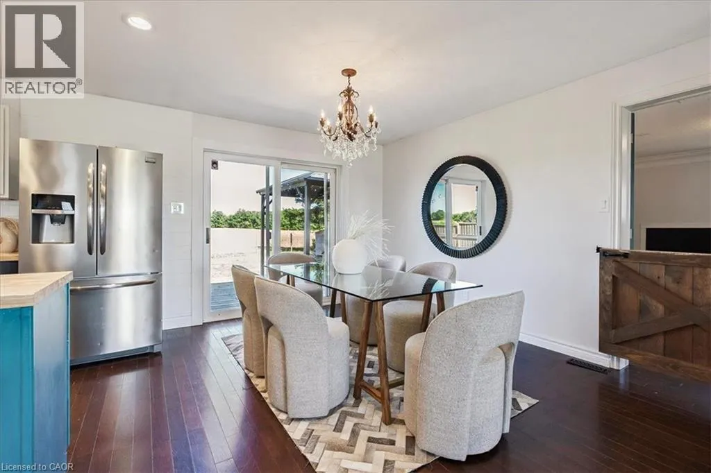At hwy #56 & RR #9, go East then turn left onto Sinclairville Road. Set on just over an acre and backing onto peaceful farmland, this beautifully updated 4+1 bedroom, 4-bath bungalow delivers the perfect balance of space, privacy, and modern comfort. Nestled in a highly desirable pocket of Glanbrook, you're minutes from Hamilton, Binbrook, and Ancaster-offering effortless access to city amenities while enjoying the serenity of country living. The bright, open-concept main floor features hardwood throughout the kitchen, dining, living areas, and hallway. The updated kitchen is both stylish and functional, complete with block countertops, tile backsplash, pot lights, and a skylight that fills the space with natural light. Sliding doors from the dining room lead to the rear yard-ideal for entertaining, family gatherings, or quiet evenings outdoors. The inviting living room showcases a large bay window and a striking wood-burning fireplace with stone surround and a custom live-edge mantel. An oversized family room adds exceptional versatility with crown moulding and another sun-filled bay window. The primary suite offers a private 3-piece ensuite and a newly added walk-in closet, complemented by an updated main 4-piece bath. A brand-new powder room and refreshed front entry enhance both flow and functionality. Laundry on both the main and lower levels adds everyday convenience. A separate rear entrance leads to a fully self-contained in-law suite, renovated in 2016, featuring an open-concept kitchen and living area with pot lights throughout-perfect for extended family or excellent rental potential. Notable upgrades include 200-amp electrical service, new LED pot lights, a 2024 heat pump and air conditioning system, and a complete water purification system with UV and charcoal filtration. This is a rare opportunity to enjoy modern living surrounded by natural beauty, in a prime location just outside the city-where comfort, flexibility, and lifestyle come together seamlessly. (id:27476)