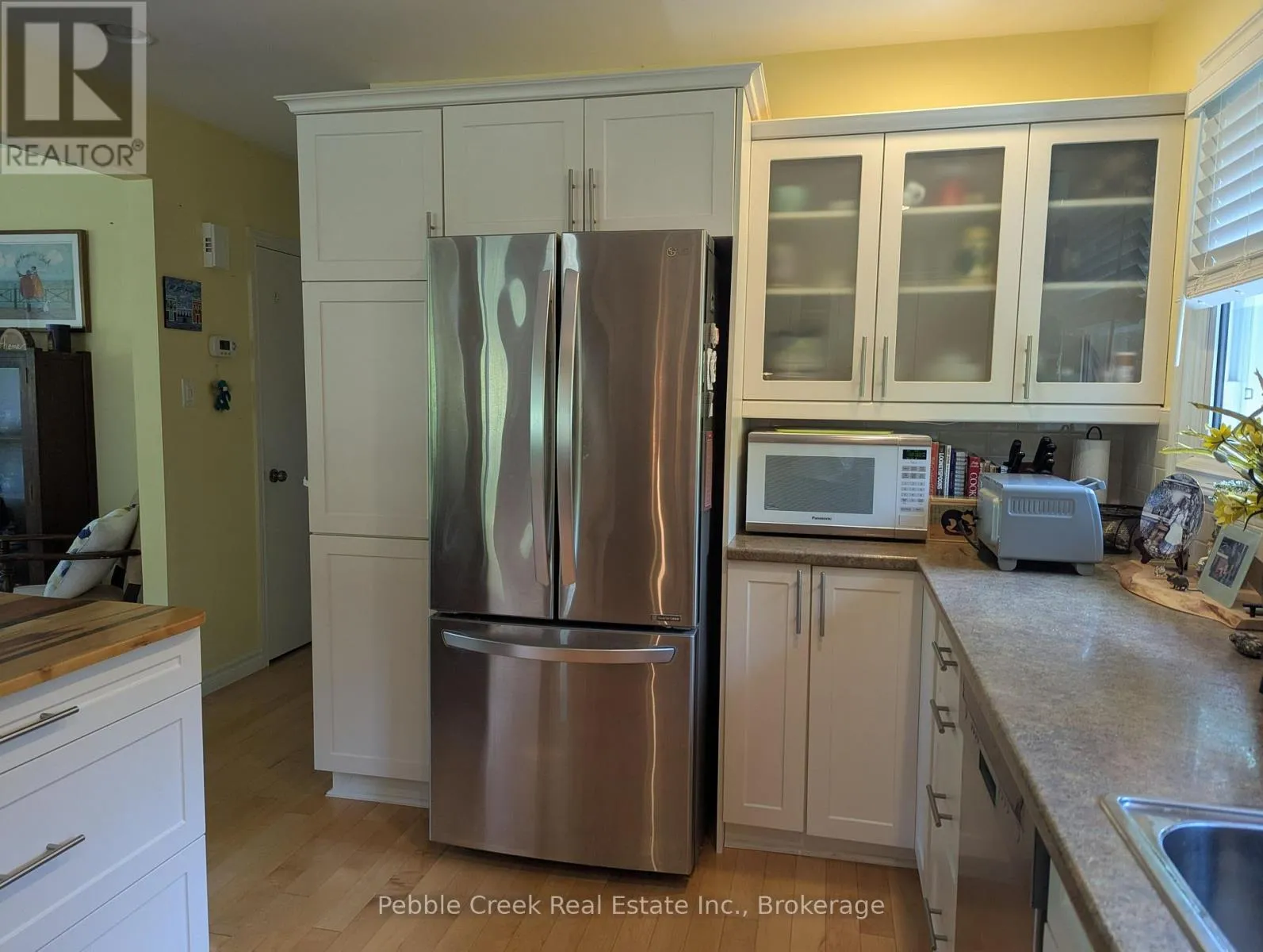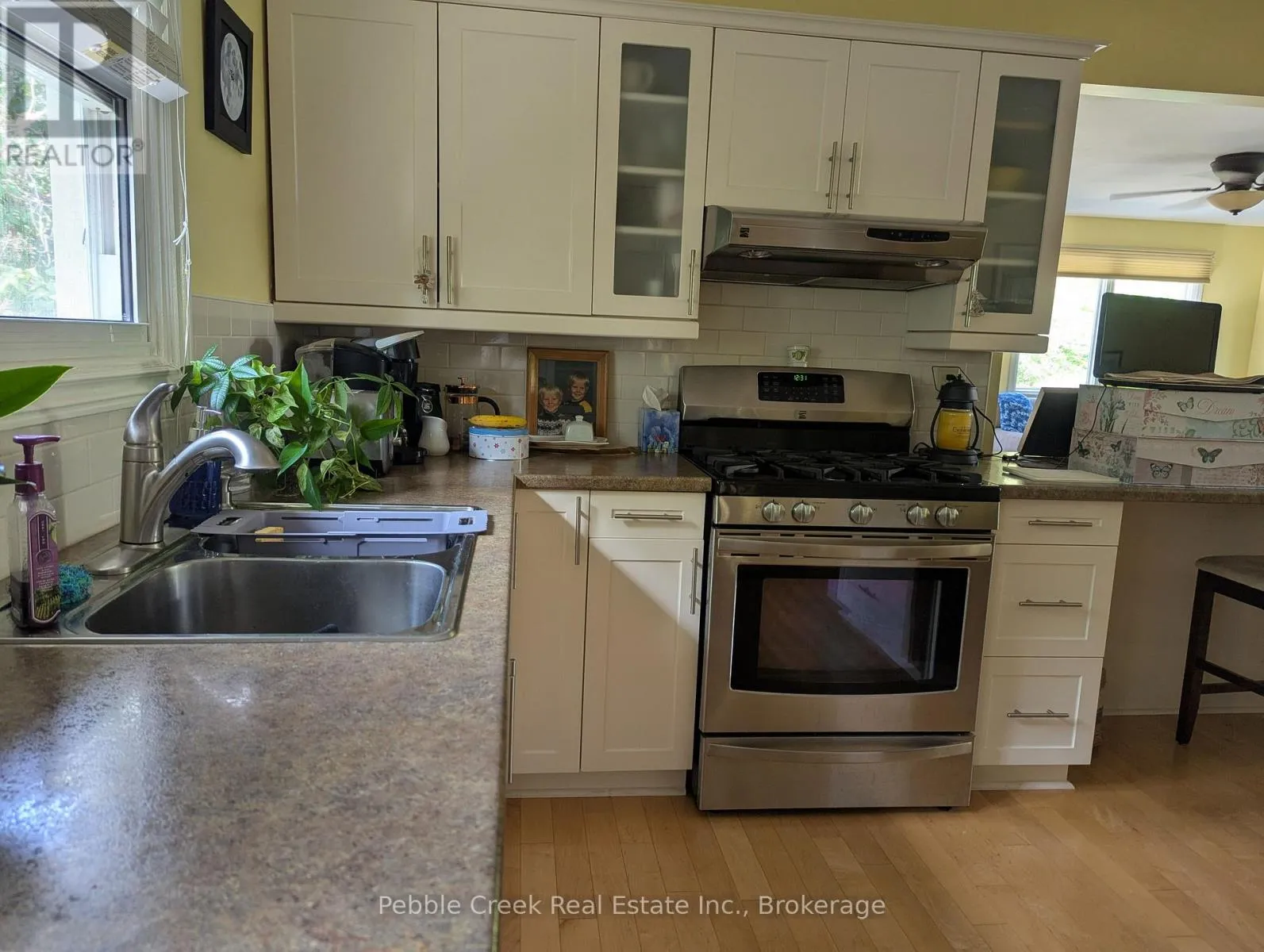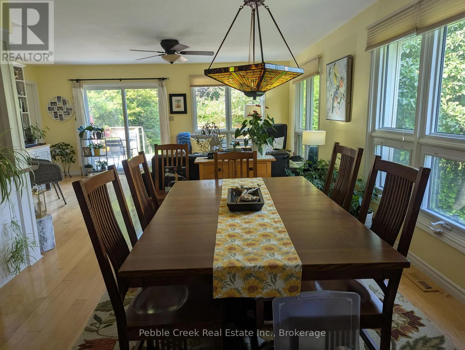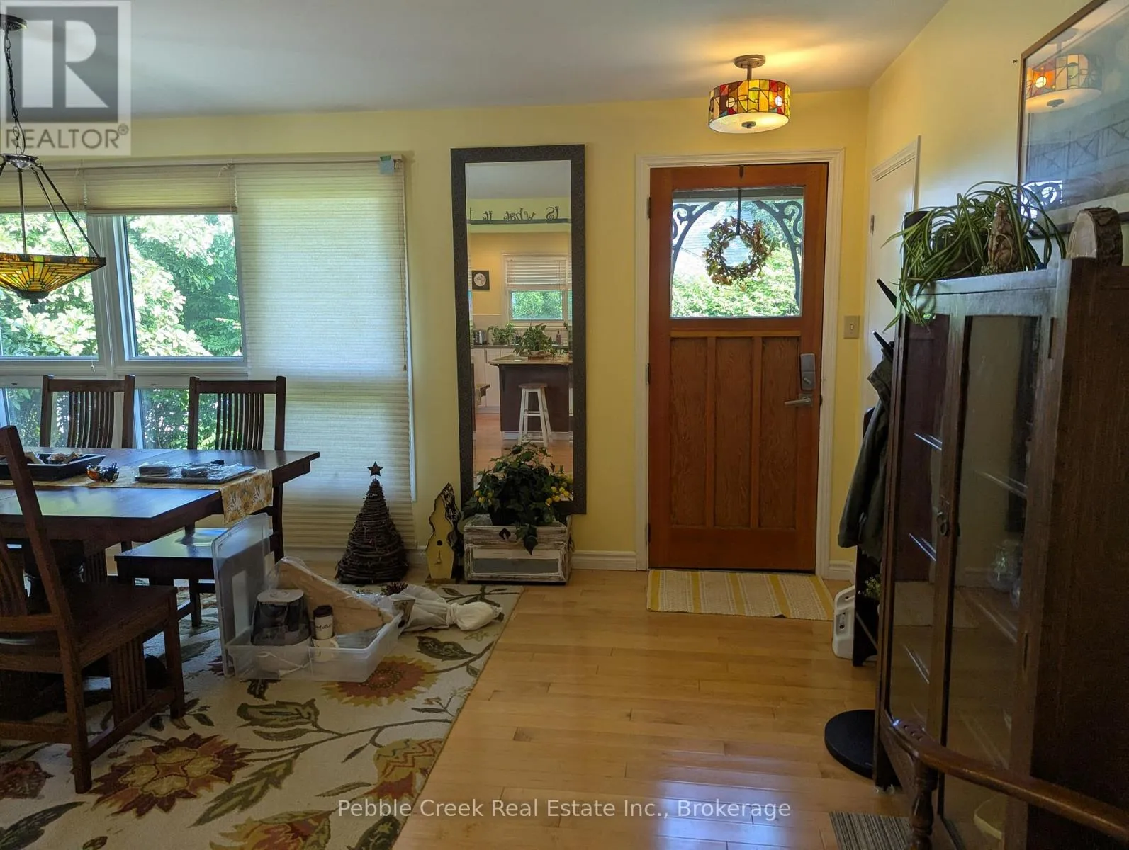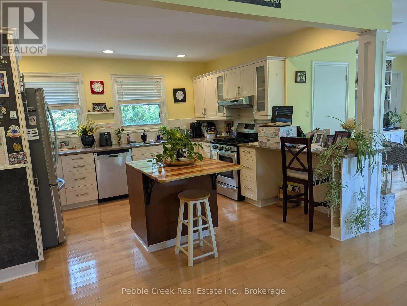 Cross Streets: Arthur & Waterloo. ** Directions: From Highway 21, turn west on Nelson St. At the five points, go leftish, and then to Arthur Street. Look for sign. This charming 2-bedroom home combines warmth, comfort, and location just a short walk from Goderich's historic Courthouse Square. Inside, the home is filled with natural light from large windows overlooking lush gardens. The open-concept living and dining area offers a welcoming flow, highlighted by hardwood floors, a cozy atmosphere, and easy access to the backyard through sliding glass doors. The kitchen connects seamlessly to the main space, making entertaining and everyday living effortless. Both bedrooms are comfortable and inviting, with garden views that enhance the peaceful, retreat-like feel of the home. Outdoors, enjoy a private backyard sanctuary framed by mature trees and greenery perfect for relaxing, gardening, or hosting summer get-togethers. With its prime walkable location, beautiful gardens, and bright, functional interior, this home is a rare opportunity in the heart of Canada's Prettiest Town. (id:27476)