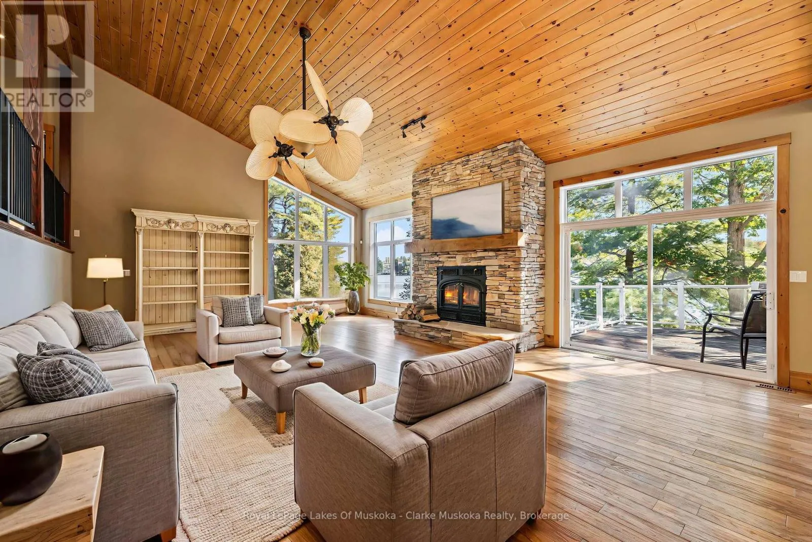 Cross Streets: PARKERS PT ROAD. ** Directions: PARKERS PT ROAD TO ROAD 3200. Nestled on a private 3.2 acre lot with 540 feet of shoreline on Lake Muskoka, this stunning property is built for family, entertaining, and year-round enjoyment. The 6,432 + sq. ft. cottage has 6 bedrooms, 5 bathrooms, and endless space for relaxing. Natural light pours through the wall-to-wall windows, with expansive living areas on both the main and lower levels, the main floor is anchored by a gorgeous stone wood fireplace, while the basement living area features a stone propane fireplace. The kitchen is a chefs dream, with a Sub-Zero fridge/freezer, KitchenAid island cooktop, double oven, and bar fridge. Theres even a cigar/TV lounge for cozy nights in. Step outside to a wrap-around patio with a built-in Viking BBQ, perfect for summer nights by the lake. A 3-season sunroom offers a peaceful spot to take in the views. Upstairs, the primary suite is a retreat of its own complete with a fireplace, walk-in closet, private deck, and spa-like ensuite with jacuzzi and glass shower. With a bunkie, two-storey garage, and plenty of privacy, this is more than just a cottage its Muskoka living at its finest. (id:27476)