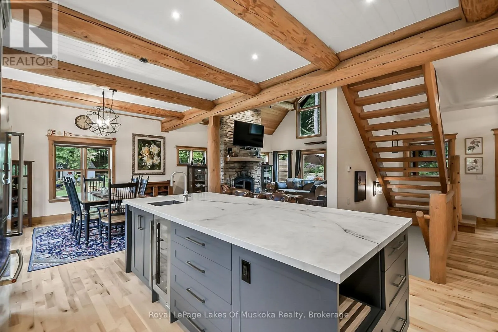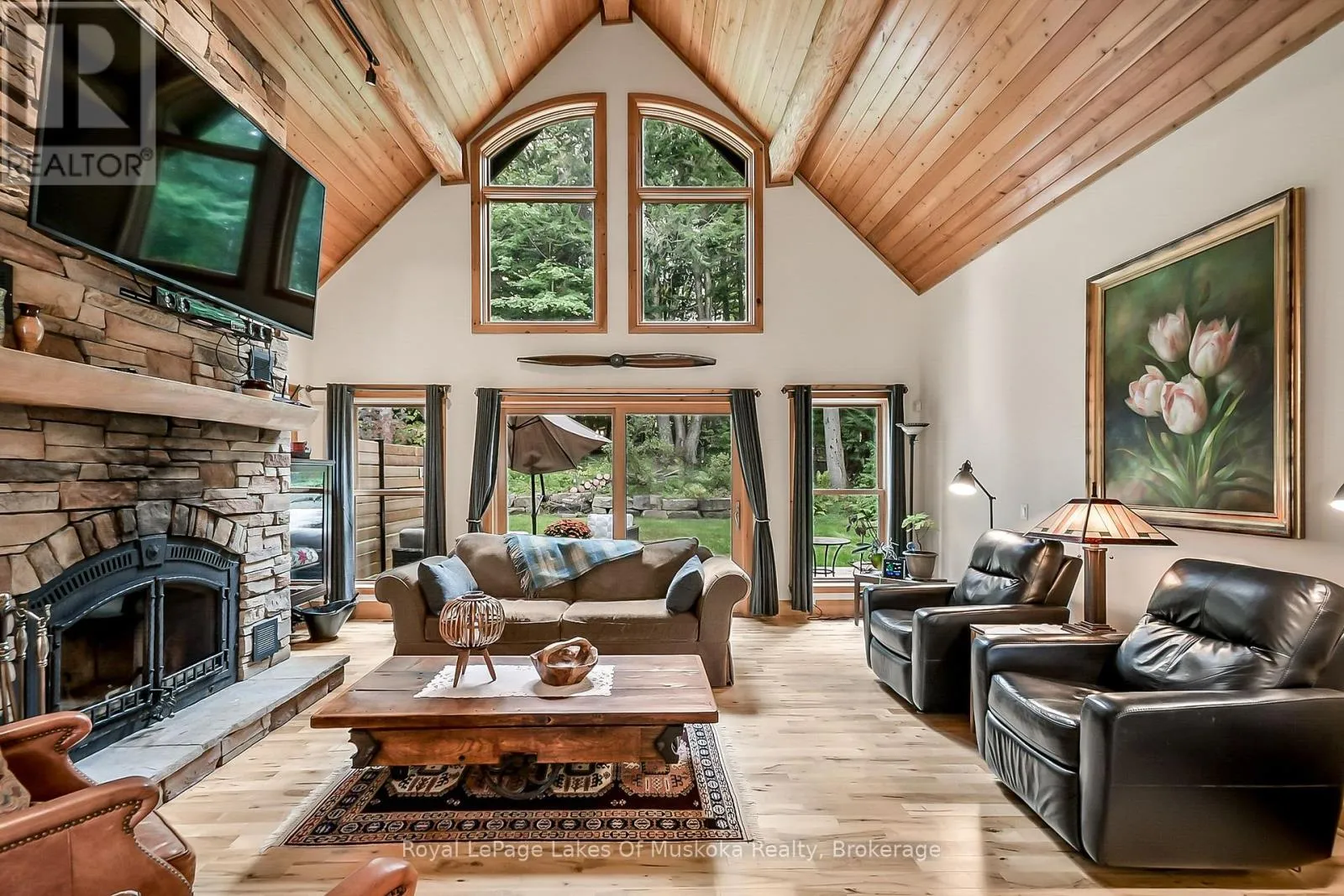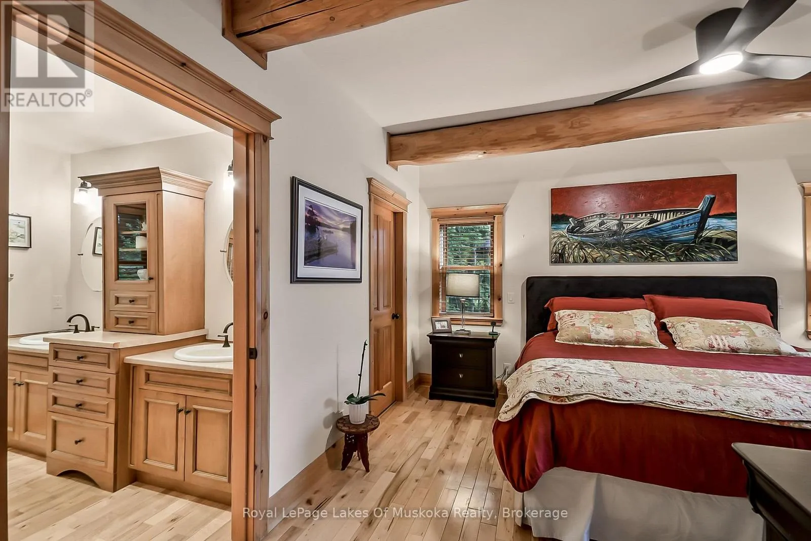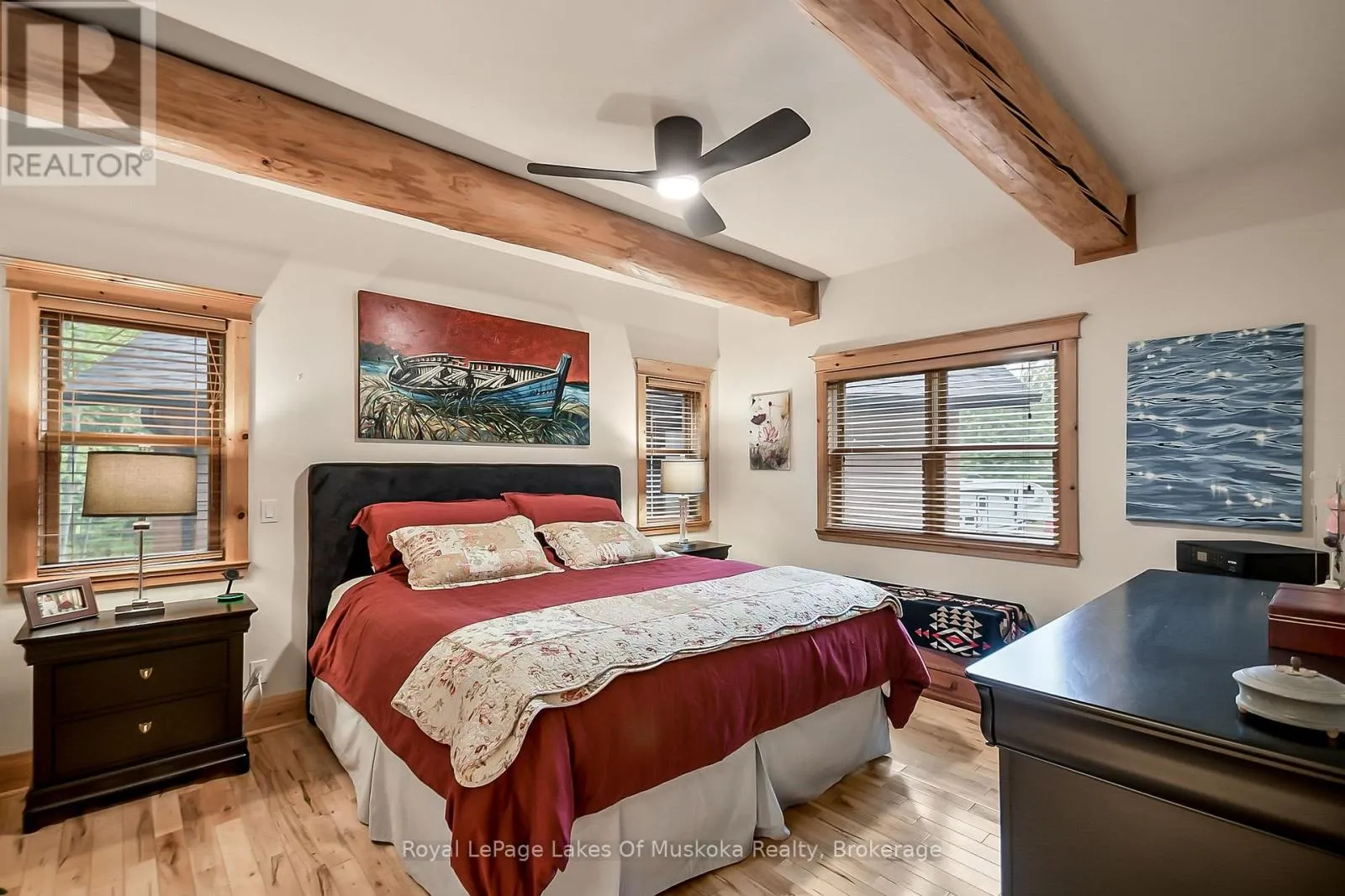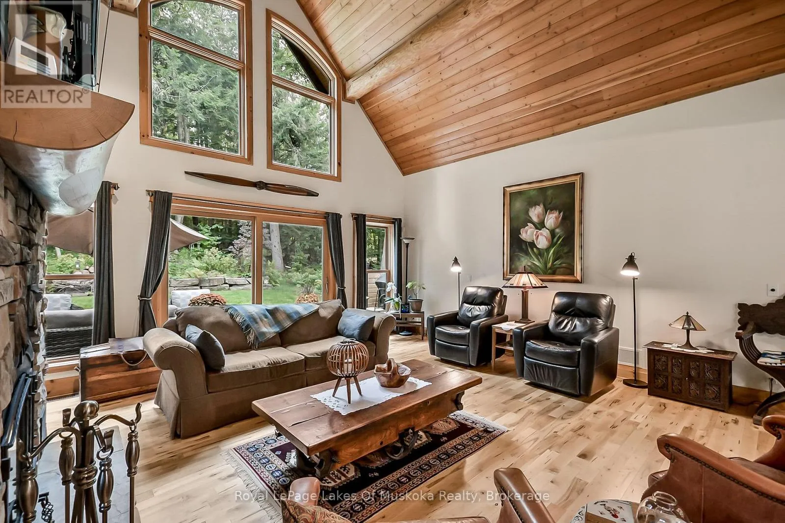 Cross Streets: Alexander St/Brydon's Bay Road. ** Directions: Muskoka Beach Road to Palmer Drive to Alexander to #465. Welcome to this beautiful Cedar Coast Timber Frame home, built in 2006, showcasing large posts and beams, custom timber staircase and railings and cathedral ceilings of tongue and groove cedar. This home exudes charm, warmth and the big Wow factor upon entry. An open concept great room design features a stunning custom kitchen with walk-in pantry, complimented by a spacious, bright dining room and breathtaking living room with a floor-to-ceiling stone wood-burning fireplace, large windows with a mature forest view and a walk out to a private back deck. Main floor living is made easy with a laundry/powder room and primary bedroom, accented with cedar beams, a 4 pc ensuite and walk-in closet. Climb the timber stairs to a gorgeous loft overlooking the living room and forest view, providing a wonderful work, play or quiet space, together with a 2nd generous sized bedroom with large finished storage spaces and a 3 pc. bathroom. Maple flooring on the main level and cedar plank floors on the upper level,. The finished lower level of this well cared for home has a generous sized family room, bright with morning sunlight, a 3rd bedroom with large egress window and an office/den with similar window and storage closet. This level has under-stair storage, two double hallway closets and a 3 pc bathroom, with large walk-in shower. A very large mechanical/storage room completes this level. An automatic back-up Generac Guardian Series generator provides peace of mind during power outages, to almost the entire home. Custom designed to match this wonderful home is a large, bright double car garage with 2-10x10 garage doors, plywood walls, a mezzanine loft and a Trustcore ceiling. Pictures are worth a thousand words but this home must be seen to be appreciated. (id:27476)