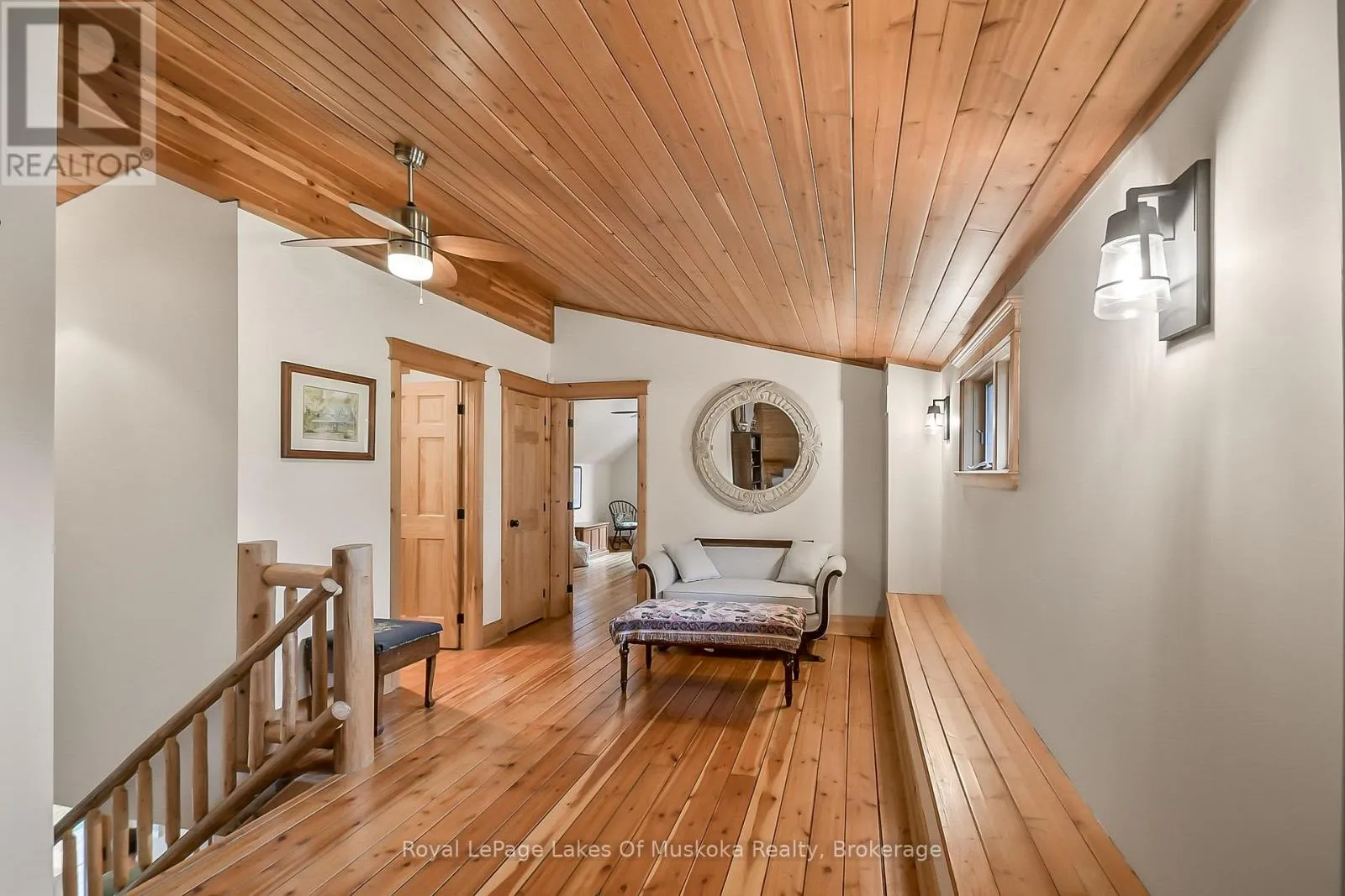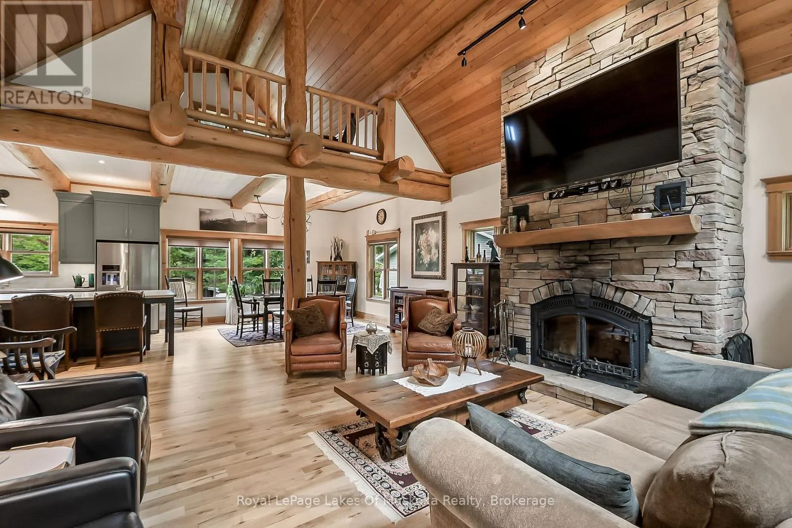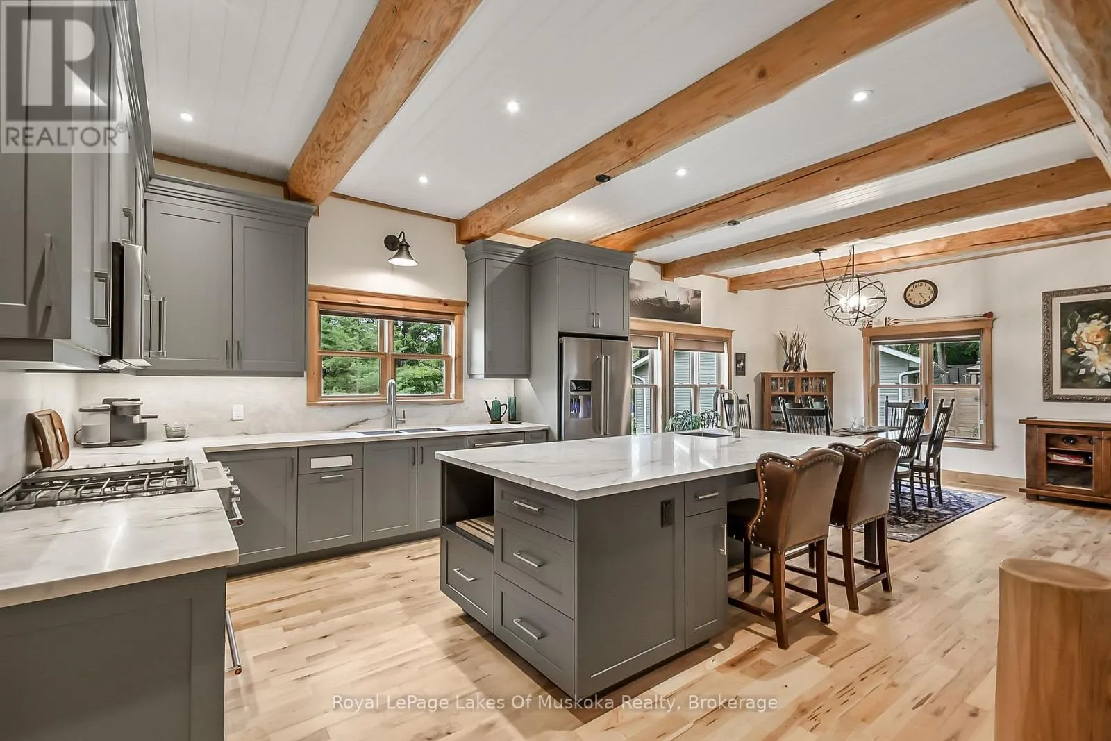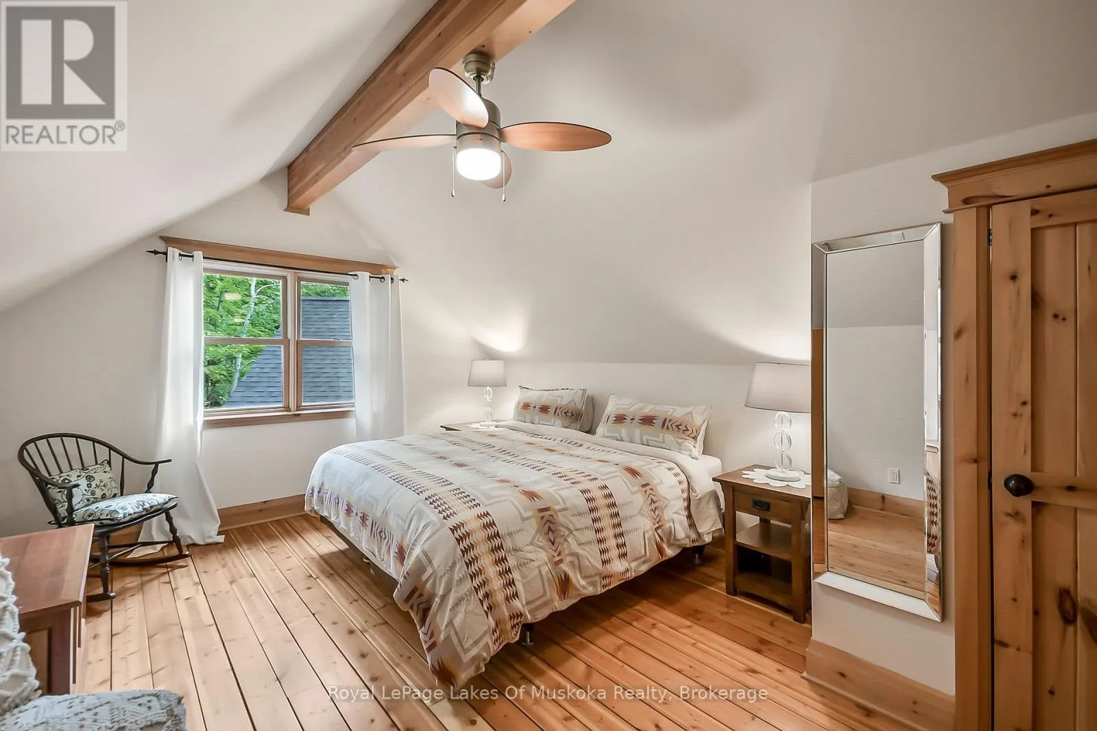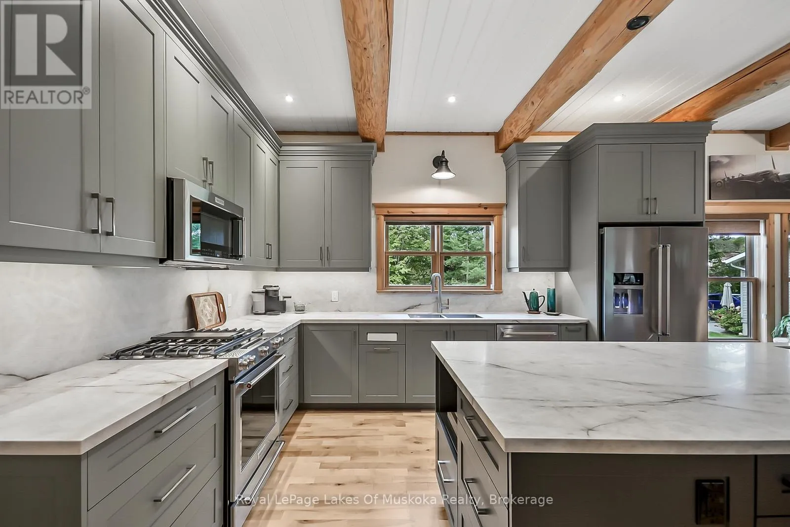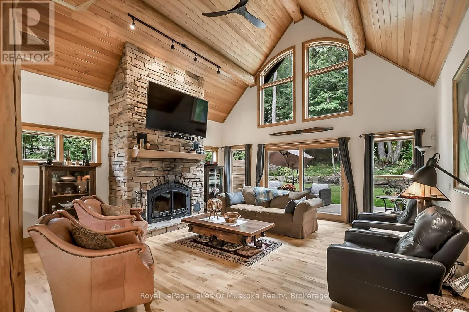 Cross Streets: Alexander St/Brydon's Bay Road. ** Directions: Muskoka Beach Road to Palmer Drive to Alexander to #465. Welcome to this beautiful Cedar Coast Timber Frame home, built in 2006, showcasing large posts and beams, custom timber staircase and railings and cathedral ceilings of tongue and groove cedar. This home exudes charm, warmth and the big Wow factor upon entry. An open concept great room design features a stunning custom kitchen with walk-in pantry, complimented by a spacious, bright dining room and breathtaking living room with a floor-to-ceiling stone wood-burning fireplace, large windows with a mature forest view and a walk out to a private back deck. Main floor living is made easy with a laundry/powder room and primary bedroom, accented with cedar beams, a 4 pc ensuite and walk-in closet. Climb the timber stairs to a gorgeous loft overlooking the living room and forest view, providing a wonderful work, play or quiet space, together with a 2nd generous sized bedroom with large finished storage spaces and a 3 pc. bathroom. Maple flooring on the main level and cedar plank floors on the upper level,. The finished lower level of this well cared for home has a generous sized family room, bright with morning sunlight, a 3rd bedroom with large egress window and an office/den with similar window and storage closet. This level has under-stair storage, two double hallway closets and a 3 pc bathroom, with large walk-in shower. A very large mechanical/storage room completes this level. An automatic back-up Generac Guardian Series generator provides peace of mind during power outages, to almost the entire home. Custom designed to match this wonderful home is a large, bright double car garage with 2-10x10 garage doors, plywood walls, a mezzanine loft and a Trustcore ceiling. Pictures are worth a thousand words but this home must be seen to be appreciated. (id:27476)