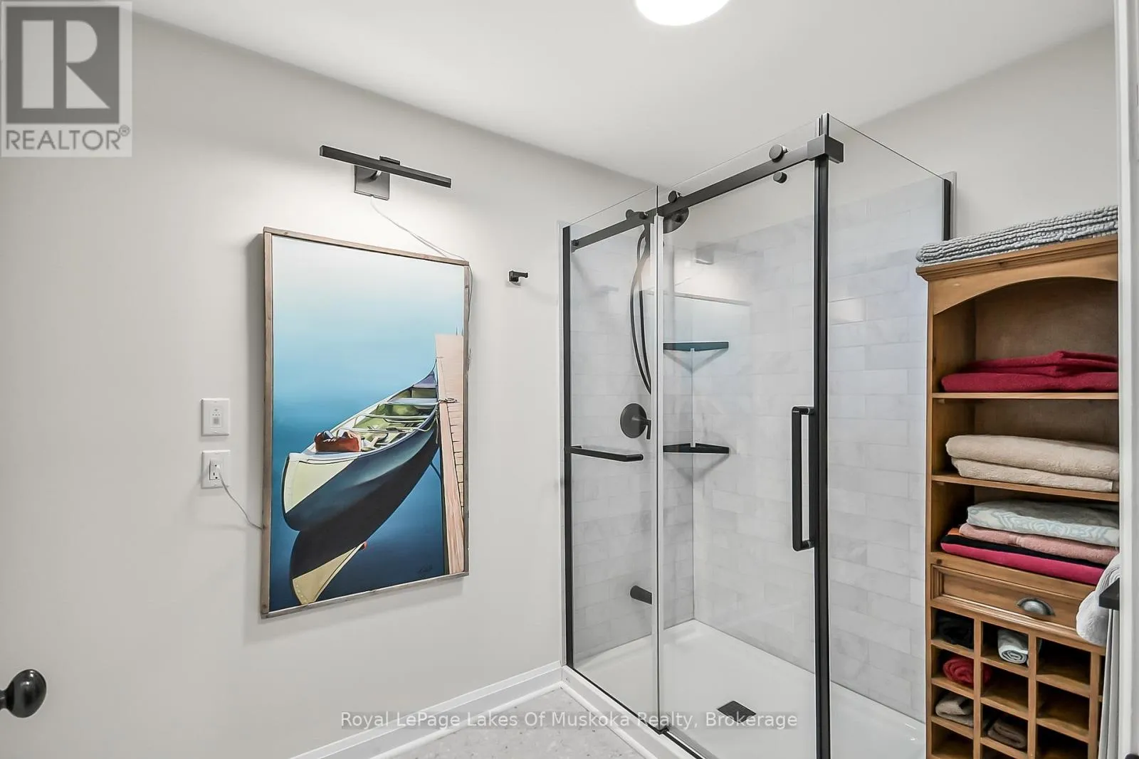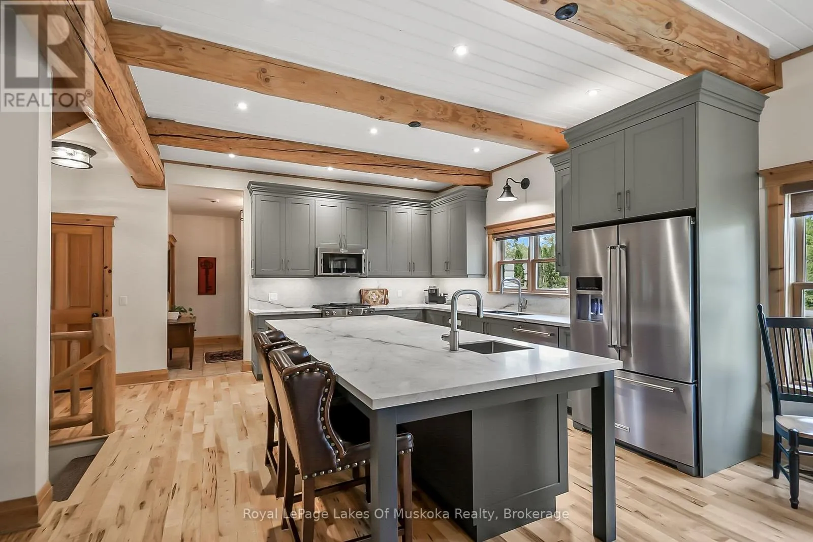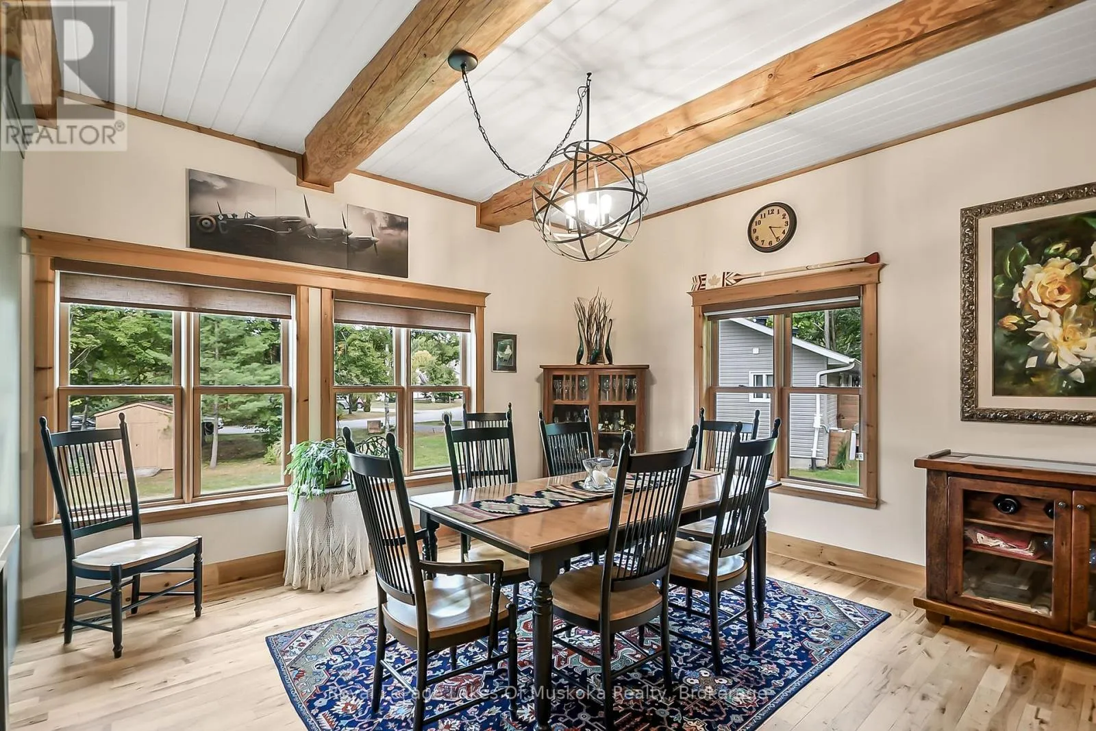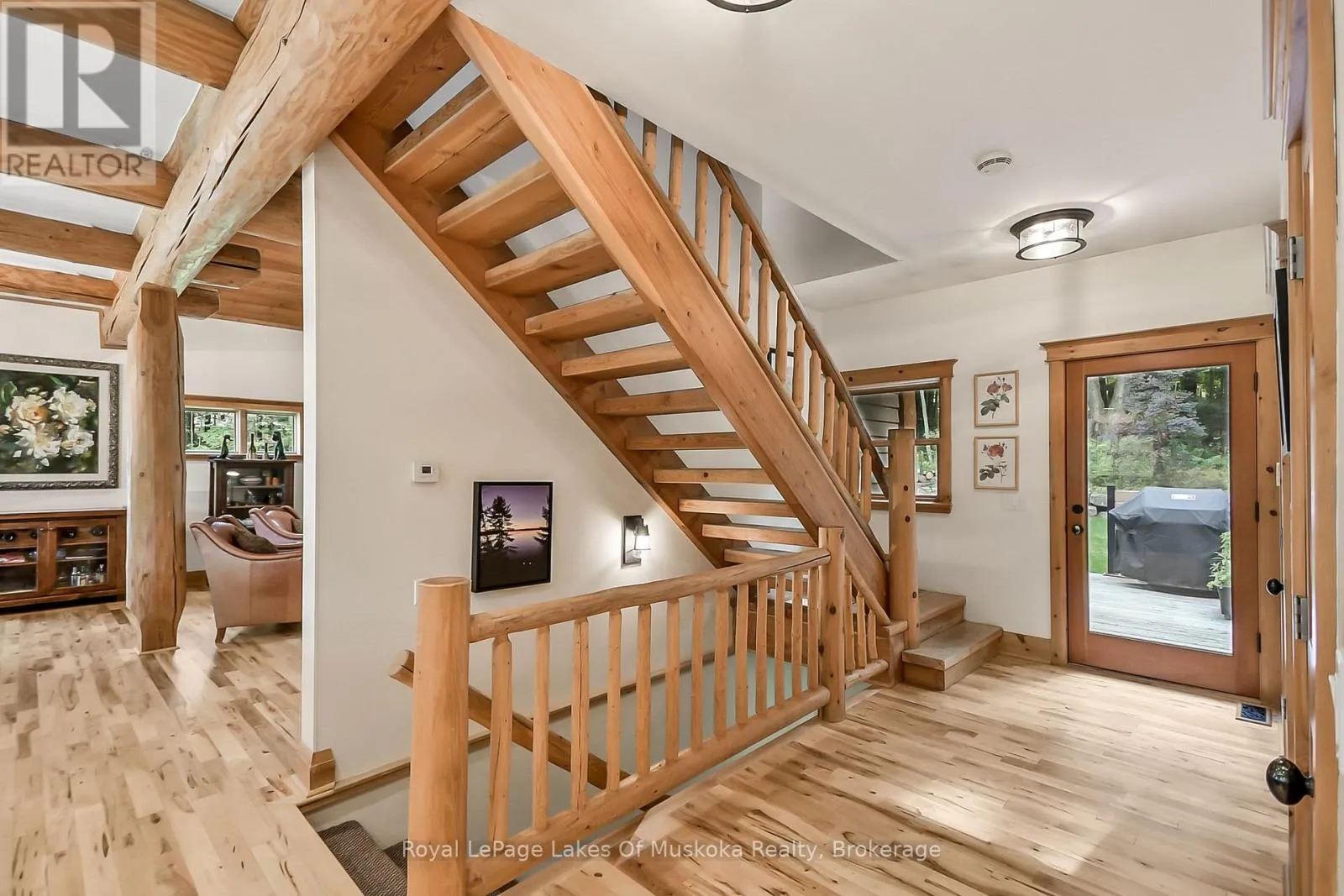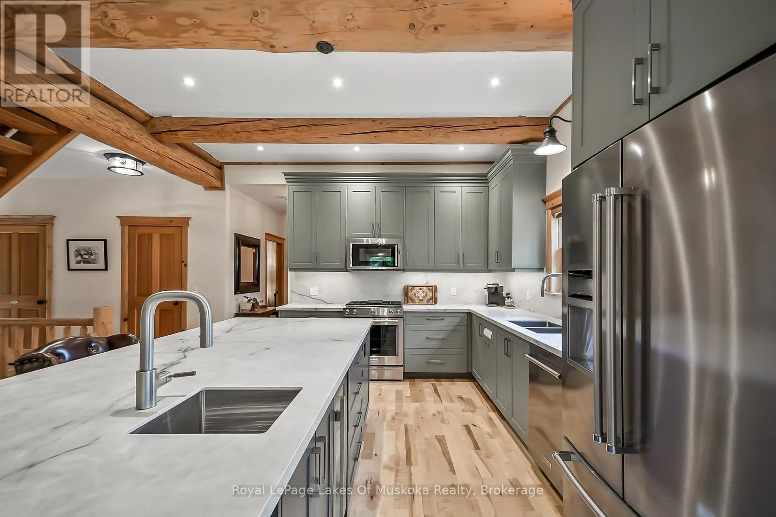 Cross Streets: Alexander St/Brydon's Bay Road. ** Directions: Muskoka Beach Road to Palmer Drive to Alexander to #465. Welcome to this beautiful Cedar Coast Timber Frame home, built in 2006, showcasing large posts and beams, custom timber staircase and railings and cathedral ceilings of tongue and groove cedar. This home exudes charm, warmth and the big Wow factor upon entry. An open concept great room design features a stunning custom kitchen with walk-in pantry, complimented by a spacious, bright dining room and breathtaking living room with a floor-to-ceiling stone wood-burning fireplace, large windows with a mature forest view and a walk out to a private back deck. Main floor living is made easy with a laundry/powder room and primary bedroom, accented with cedar beams, a 4 pc ensuite and walk-in closet. Climb the timber stairs to a gorgeous loft overlooking the living room and forest view, providing a wonderful work, play or quiet space, together with a 2nd generous sized bedroom with large finished storage spaces and a 3 pc. bathroom. Maple flooring on the main level and cedar plank floors on the upper level,. The finished lower level of this well cared for home has a generous sized family room, bright with morning sunlight, a 3rd bedroom with large egress window and an office/den with similar window and storage closet. This level has under-stair storage, two double hallway closets and a 3 pc bathroom, with large walk-in shower. A very large mechanical/storage room completes this level. An automatic back-up Generac Guardian Series generator provides peace of mind during power outages, to almost the entire home. Custom designed to match this wonderful home is a large, bright double car garage with 2-10x10 garage doors, plywood walls, a mezzanine loft and a Trustcore ceiling. Pictures are worth a thousand words but this home must be seen to be appreciated. (id:27476)