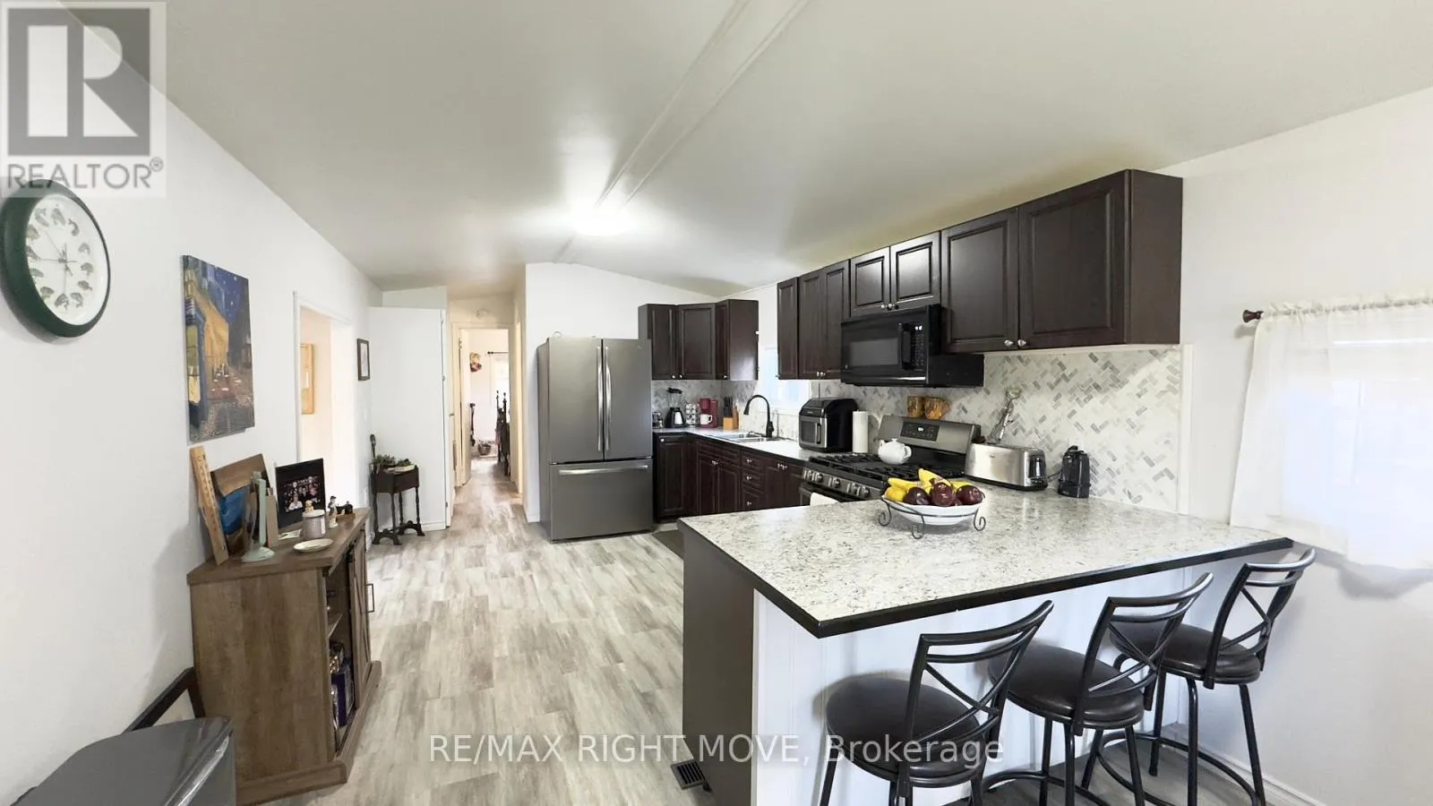 Cross Streets: Sedore road & Beaver Ridge Road. ** Directions: Hwy 11 to Sedore Road to Racoon Road. Affordable Year-Round Living in Beautiful Muskoka - 2 Bedroom Mobile Home in SunPark Beaver Ridge Estates. Enjoy peaceful, affordable living just minutes from Gravenhurst in this charming 2-bedroom, 1-bathroom mobile home located in the sought-after SunPark Beaver Ridge Estates community. Perfect for year-round living, this well-maintained home offers a comfortable and inviting atmosphere surrounded by the natural beauty of Muskoka. Step inside to a spacious kitchen featuring a stainless steel refrigerator, propane gas stove, built-in microwave, and a 3-seat bar counter - ideal for casual dining or entertaining. The home features a mix of hardwood and vinyl/laminate flooring, in-unit laundry, and a large foyer that adds extra space and functionality. Outside, you'll find a paved single driveway and a large outdoor storage shed, perfect for tools, bikes, or seasonal gear. Located within SunPark Beaver Ridge Estates, residents enjoy a friendly, well-managed community with beautifully landscaped grounds, scenic ponds, fishing spots, and nature trails. The on-site recreation centre offers a fully equipped kitchen, pool, patio, and BBQ area, making it easy to relax and connect with neighbours.Experience the best of Muskoka living - peaceful surroundings, natural beauty, and the convenience of being close to the shops and services of Gravenhurst - all at an affordable price. (id:27476)