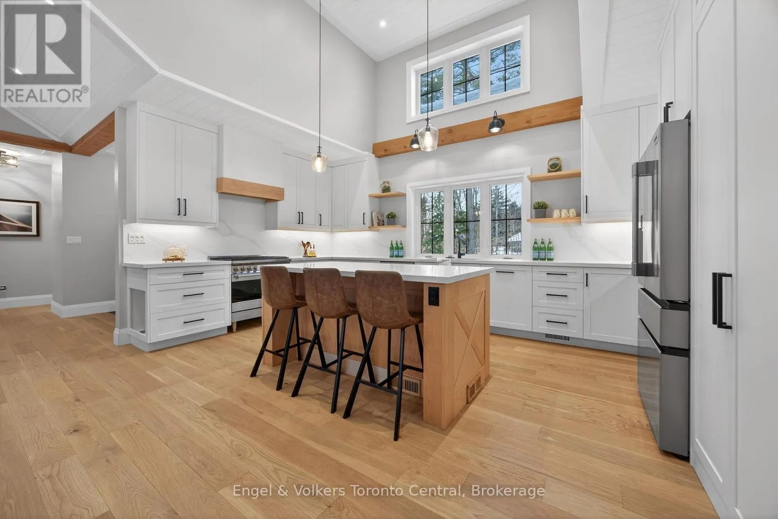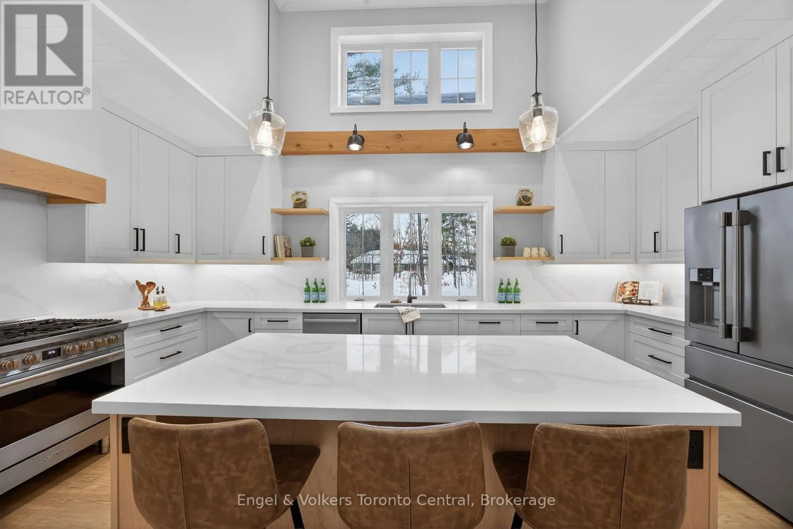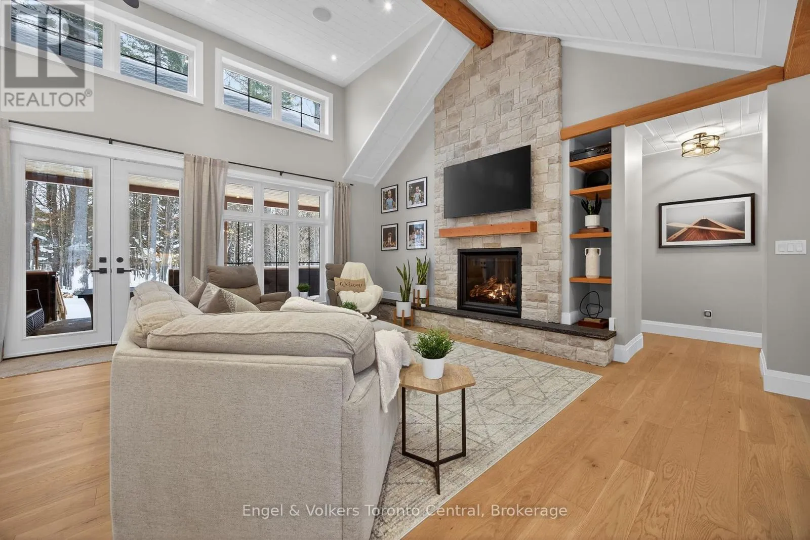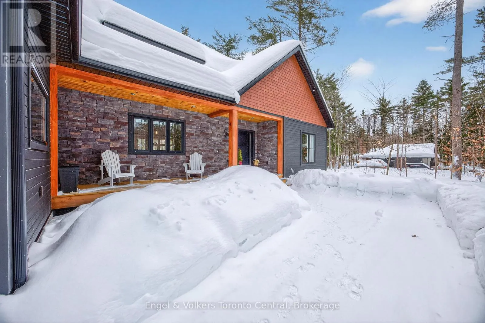 Cross Streets: Hwy 11 & Kilworthy Road. ** Directions: Hwy 11 to Kilworthy Rd. / South Kahshe Lake Rd. across overpass to Kilworthy Rd. west to Xavier St to sign on property. Executive country living just 7 minutes south of Gravenhurst and moments to Hwy 11 - offering seamless access to the GTA while enjoying complete privacy on a wooded 1-acre lot. Recently completed, this custom 5-bedroom residence blends refined Muskoka design with modern efficiency and exceptional build quality - ideal for professionals seeking space without sacrificing convenience. The open-concept main level features wide-plank white oak floors, vaulted v-groove ceilings with exposed beams, and expansive dormers that flood the home with natural light. A 42" gas fireplace anchors the living space, with walkout to a covered rear porch and hot tub for effortless year-round enjoyment. The custom kitchen is designed for both entertaining and everyday ease, showcasing quartz surfaces, premium appliances including a 36" gas range, generous island seating, wine storage and a hidden walk-in pantry with additional refrigerator. The primary suite offers vaulted ceilings, walk-in closet, and spa-inspired ensuite with heated floors and oversized glass shower. Two additional main-floor bedrooms provide flexible space for family or guests. The fully finished lower level with 9.5' ceilings adds 2 large bedrooms, recreation space, gym and full bath. Built for longevity and performance: ICF foundation, insulated slab, ZIP system sheathing, R-60 insulation, high-efficiency mechanicals, HRV, generator transfer switch and water filtration system. Oversized heated 2-car garage with car-lift potential plus a fully serviced detached shop with 100-amp service, washroom and in-floor heat - ideal for collectors, entrepreneurs, or home-based professionals. Private, polished, and purposefully designed - executive Muskoka living at its finest. (id:27476)