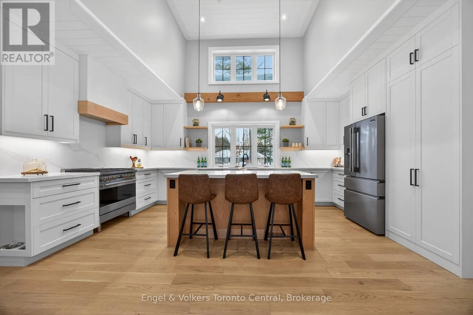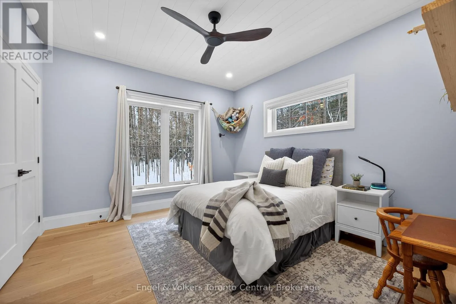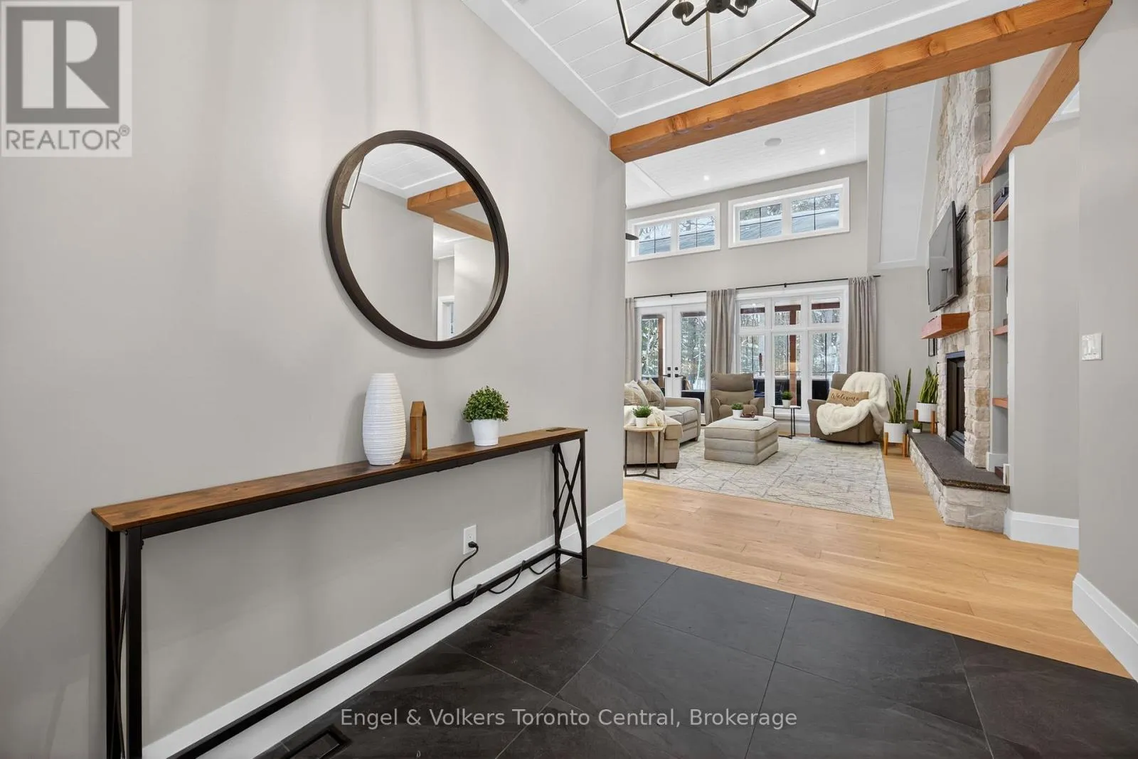 Cross Streets: Hwy 11 & Kilworthy Road. ** Directions: Hwy 11 to Kilworthy Rd. / South Kahshe Lake Rd. across overpass to Kilworthy Rd. west to Xavier St to sign on property. Executive country living just 7 minutes south of Gravenhurst and moments to Hwy 11 - offering seamless access to the GTA while enjoying complete privacy on a wooded 1-acre lot. Recently completed, this custom 5-bedroom residence blends refined Muskoka design with modern efficiency and exceptional build quality - ideal for professionals seeking space without sacrificing convenience. The open-concept main level features wide-plank white oak floors, vaulted v-groove ceilings with exposed beams, and expansive dormers that flood the home with natural light. A 42" gas fireplace anchors the living space, with walkout to a covered rear porch and hot tub for effortless year-round enjoyment. The custom kitchen is designed for both entertaining and everyday ease, showcasing quartz surfaces, premium appliances including a 36" gas range, generous island seating, wine storage and a hidden walk-in pantry with additional refrigerator. The primary suite offers vaulted ceilings, walk-in closet, and spa-inspired ensuite with heated floors and oversized glass shower. Two additional main-floor bedrooms provide flexible space for family or guests. The fully finished lower level with 9.5' ceilings adds 2 large bedrooms, recreation space, gym and full bath. Built for longevity and performance: ICF foundation, insulated slab, ZIP system sheathing, R-60 insulation, high-efficiency mechanicals, HRV, generator transfer switch and water filtration system. Oversized heated 2-car garage with car-lift potential plus a fully serviced detached shop with 100-amp service, washroom and in-floor heat - ideal for collectors, entrepreneurs, or home-based professionals. Private, polished, and purposefully designed - executive Muskoka living at its finest. (id:27476)