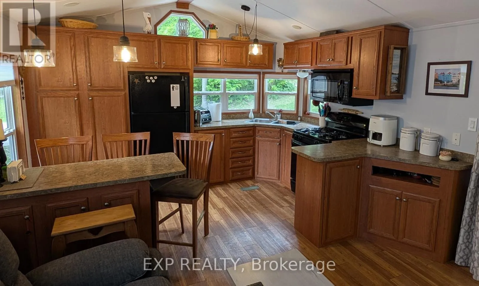 Cross Streets: Hwy 11 & Southwood Rd. ** Directions: Hwy 11 to Southwood Rd to Graham Rd to Shamrock Marina Rd. Peace, Tranquility, and Relaxation await. Welcome to your new 3-season home located in Shamrock Bay Resort. The resort is open May 1st to October 31st, and has all of the summer amenities you could ask for. This well maintained, open concept modular home is situated on the perfect lot for someone wanting privacy within nature. Your neighbour is the forest. Enter into a 3 year old sunroom (20' x 10'), allowing ample space to enjoy the outdoors from inside. Inside you will find a front facing kitchen with ample cupboard storage and an eat-in bar with stools. Opening up to the living room before walking down the hall to the guest bedroom, 3-piece bathroom, and master bedroom at the back. The master is complete with built in storage, including an office area, and a large window facing the back of the lot to enjoy more of natures beauty. Outside you find a large deck (16' x 10') for entertaining, a firepit for those cozy summer nights, and a beautifully maintained garden along the forest edge. Just down the road into the community you find a community room, inground pool, sports court, and playground. In addition there is a small library and apay per use laundry facility and a beach along the river. Have a boat? There is a boat launch area and a marina (check with the resort on availability and costs). This resort is conveniently located just off Hwy 11, but far enough that you can lose yourself in the joys of cottage living. Annual fees ($8115 in 2024) cover hydro, water, sewer, garbage collection, outside maintenance, community living maintenance and property taxes. (id:27476)