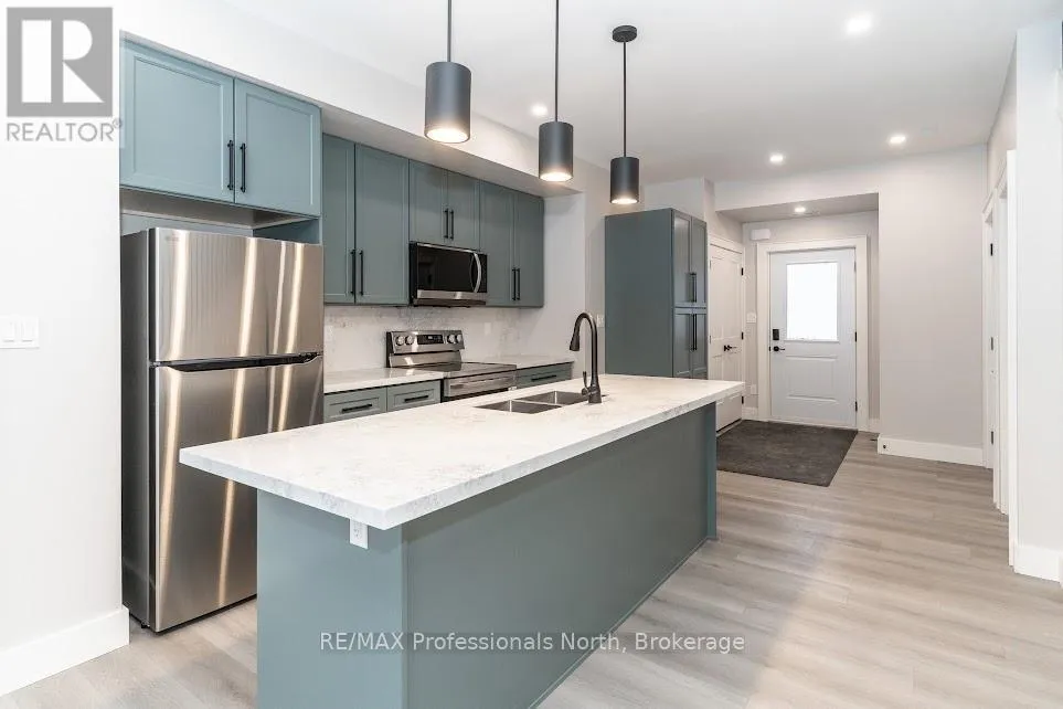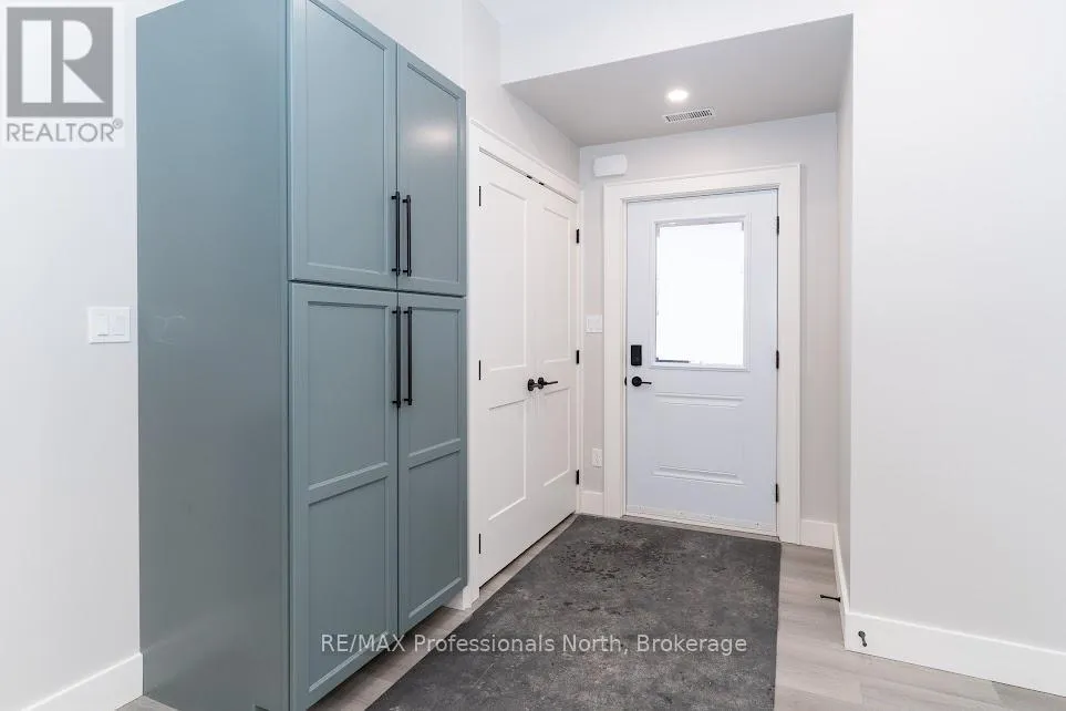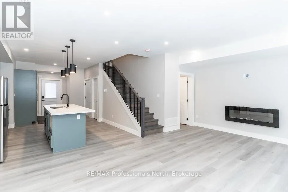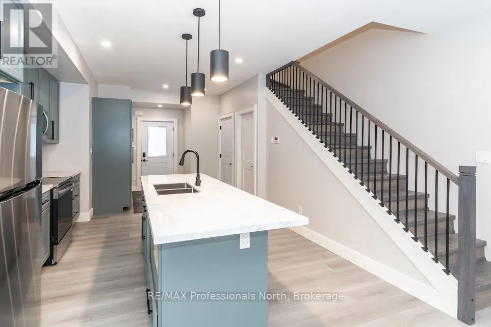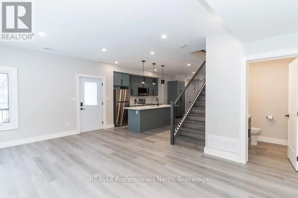 Cross Streets: Winewood Avenue E & Muskoka Beach Road. ** Directions: Bethune Dr to Winewood Avenue E to Muskoka Beach Road to #371. Brand New 3-Bedroom Unit in Gravenhurst 4-Plex - Single Car Garage - Immediate Occupancy! Discover modern Muskoka living in this pristine, never-lived-in 3-bedroom, 2.5-bathroom unit within a brand-new 4-plex building in beautiful Gravenhurst! This spacious, contemporary unit feels like your own home, featuring private entry and high-end finishes throughout: Bright, open-concept main floor with a spacious gourmet kitchen boasting a large centre island, stylish teal cabinetry, sleek black hardware, durable quartz countertops, and a full suite of stainless steel appliances. Generous living and dining areas flow seamlessly together, accented by high ceilings, recessed lighting, modern pendant lights, and large windows offering serene views of wooded surroundings and winter snowscapes. Convenient main-floor 2-piece powder room for guests - ideal for everyday convenience and entertaining. Three bedrooms on the upper level, including a primary suite with abundant natural light, and a private ensuite bathroom for added luxury. Two stylish full bathrooms (upper level): the primary ensuite with sleek glass-enclosed shower plus a second full bath featuring a relaxing tub, arched LED-lit mirrors, floating vanities in soft teal tones, and crisp tile. Convenient upper-level laundry room equipped with front-load washer and dryer, plus a bright window for natural light. Single-car attached garage (dedicated to the unit) plus additional driveway parking. High-end finishes throughout: durable grey-toned laminate flooring, energy-efficient new construction, keyless smart entry, and thoughtful details for comfort and style. This premium unit in a 4-plex blends contemporary elegance with Muskoka charm - centrally located in Gravenhurst with easy access to downtown shops, restaurants, trails, lakes, and outdoor adventures. (id:27476)