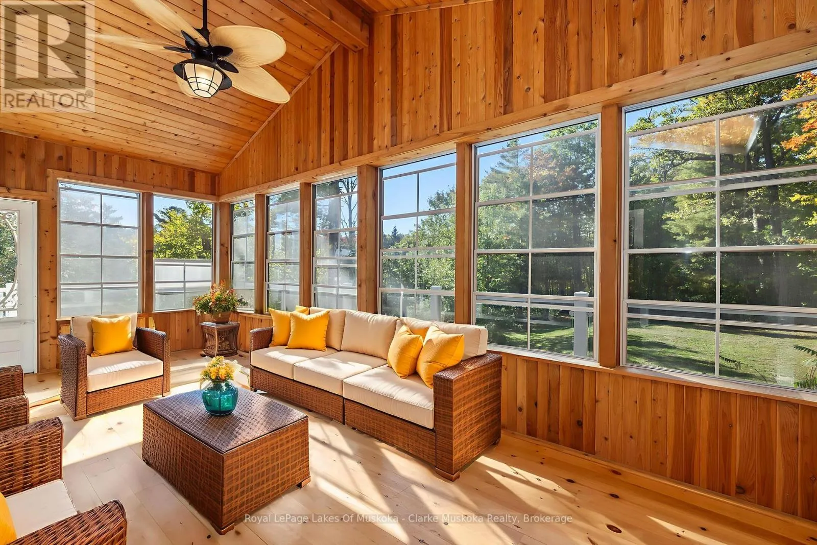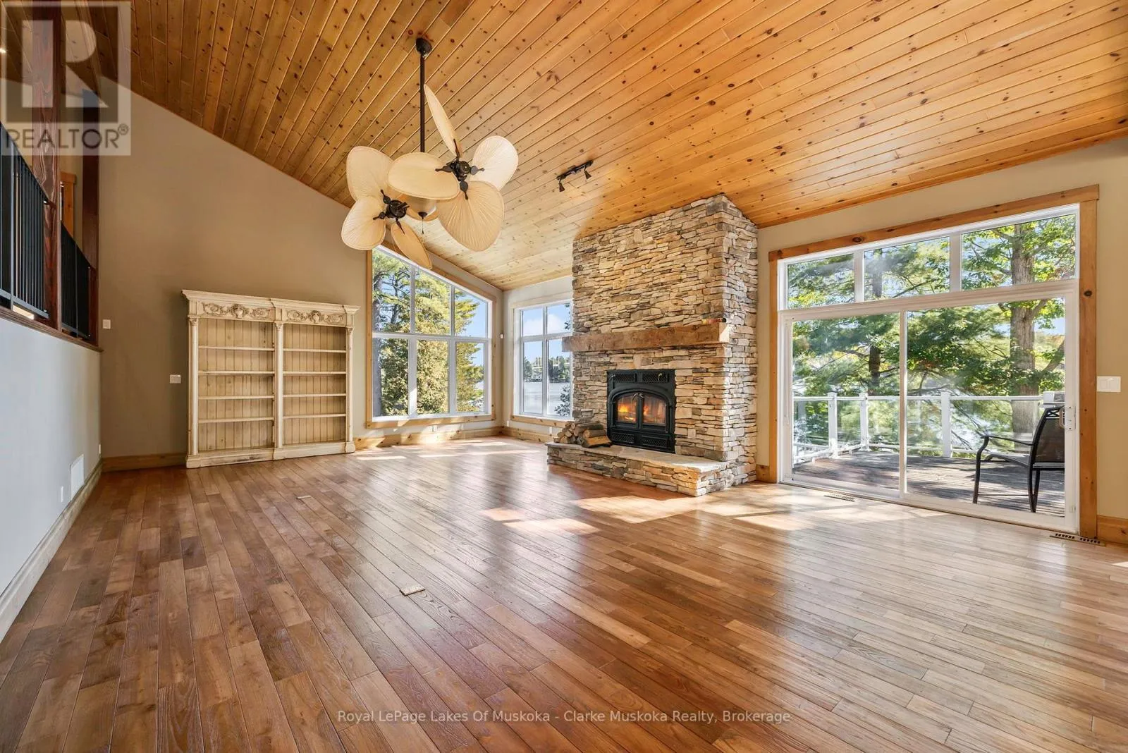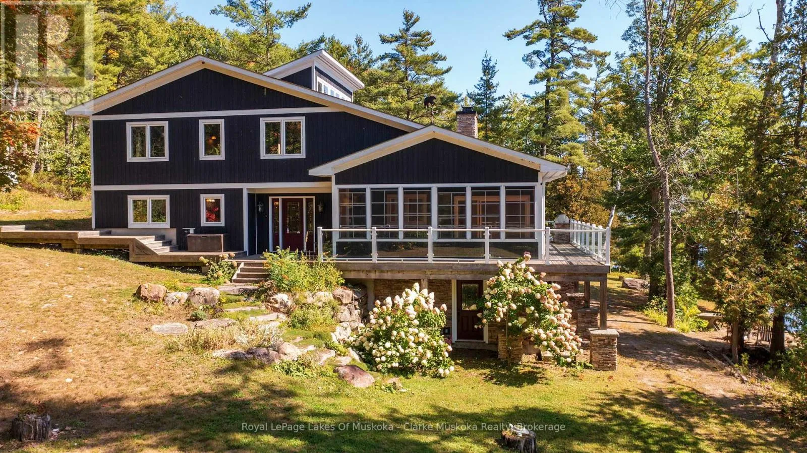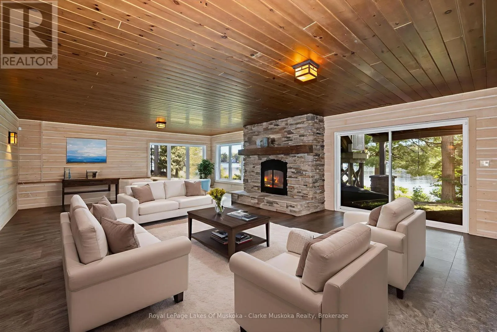 Cross Streets: Parkers Point Road / Hwy 169. ** Directions: Parkers Point Road to Road 3200. Experience the ultimate Muskoka lifestyle with this rare offering: a stunning 6,432 sq. ft. cottage on 3.2 acres with 540 feet of shoreline, combined with an exceptional 41.5-acre lot in Gravenhurst featuring 260 feet of water frontage. This unique package offers privacy, space, and endless possibilities for family living, entertaining, and year-round enjoyment. The main cottage boasts 6 bedrooms, 5 bathrooms, and sun-soaked open living areas on both main and lower levels, the main floor is anchored by a gorgeous stone wood fireplace, while the basement living area features a stone propane fireplace. The chef's kitchen features a Sub-Zero fridge/freezer, KitchenAid island cooktop, double oven, and bar fridge, while a cozy cigar/TV lounge provides a perfect spot for relaxing. Step outside to a wrap-around patio with a built-in Viking BBQ or unwind in the 3-season sunroom with breathtaking lake views. The primary suite is a private retreat, complete with fireplace, walk-in closet, private deck, and spa-like ensuite with jacuzzi and glass shower. Additional features include a bunkie, two-storey garage, and ultimate privacy. Adjacent, the 41 acre lot offers a perfect balance of lush forest, open space, and natural beauty. Towering trees create a private, peaceful setting, while hydro services are available for convenience. Ideal for enjoying the lake, exploring nature, and embracing the Muskoka lifestyle. (id:27476)