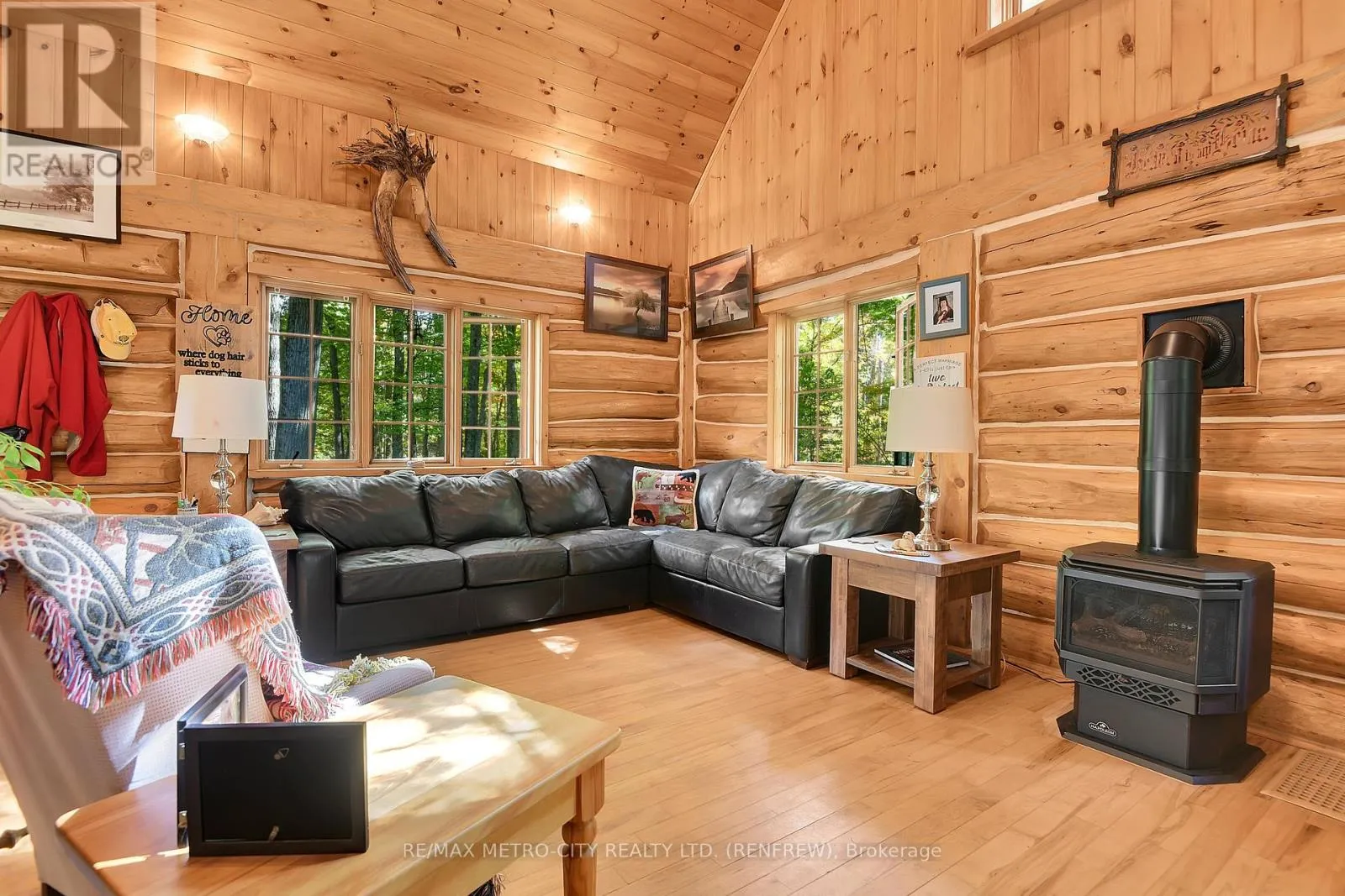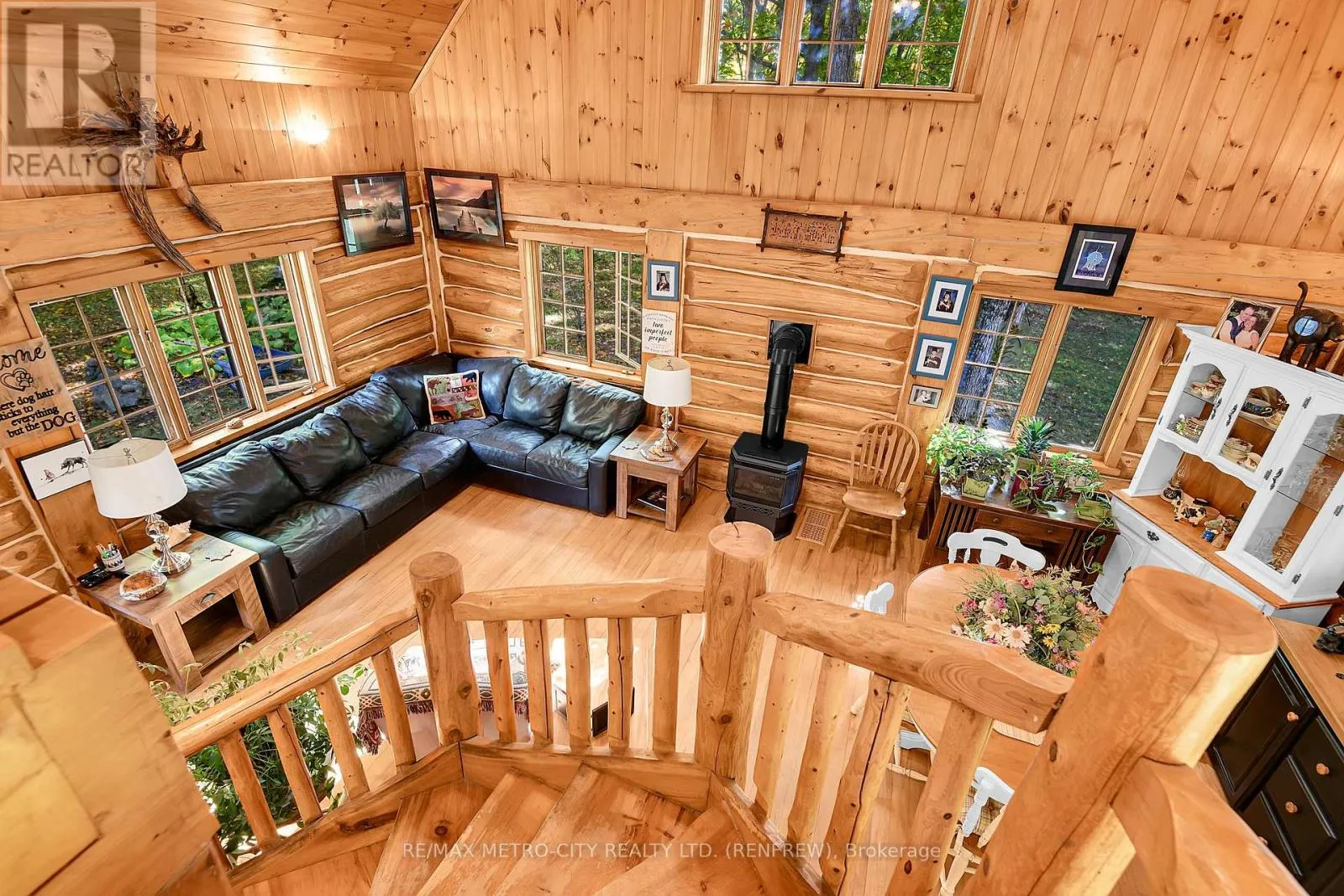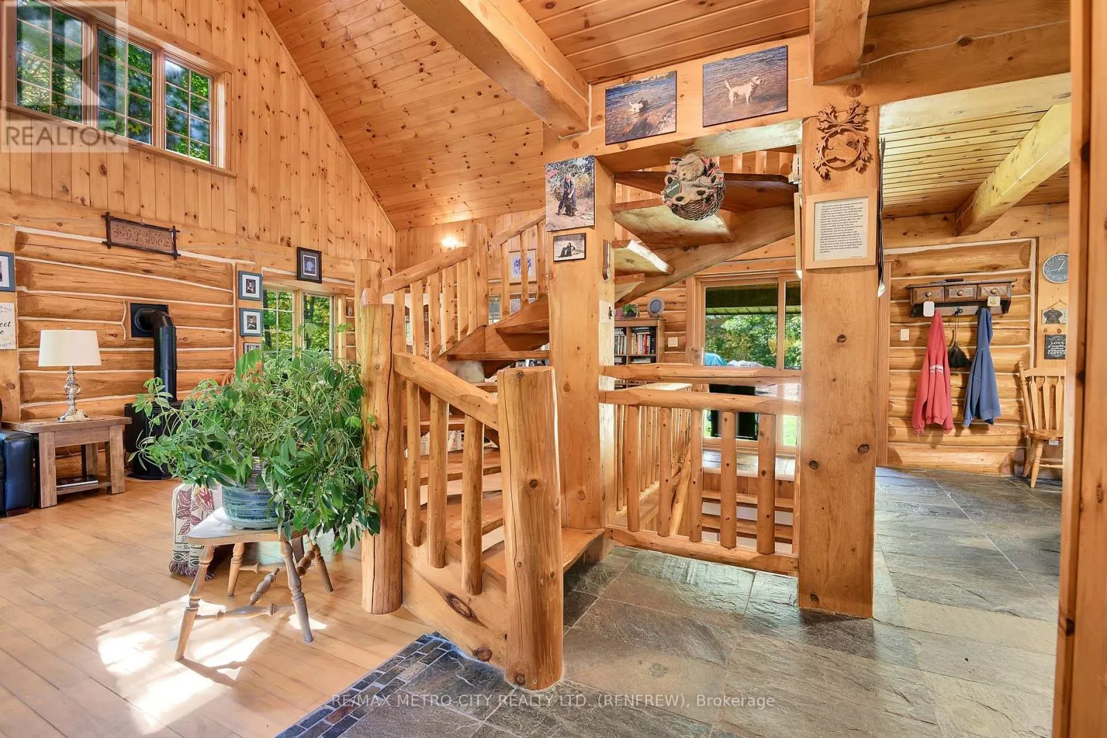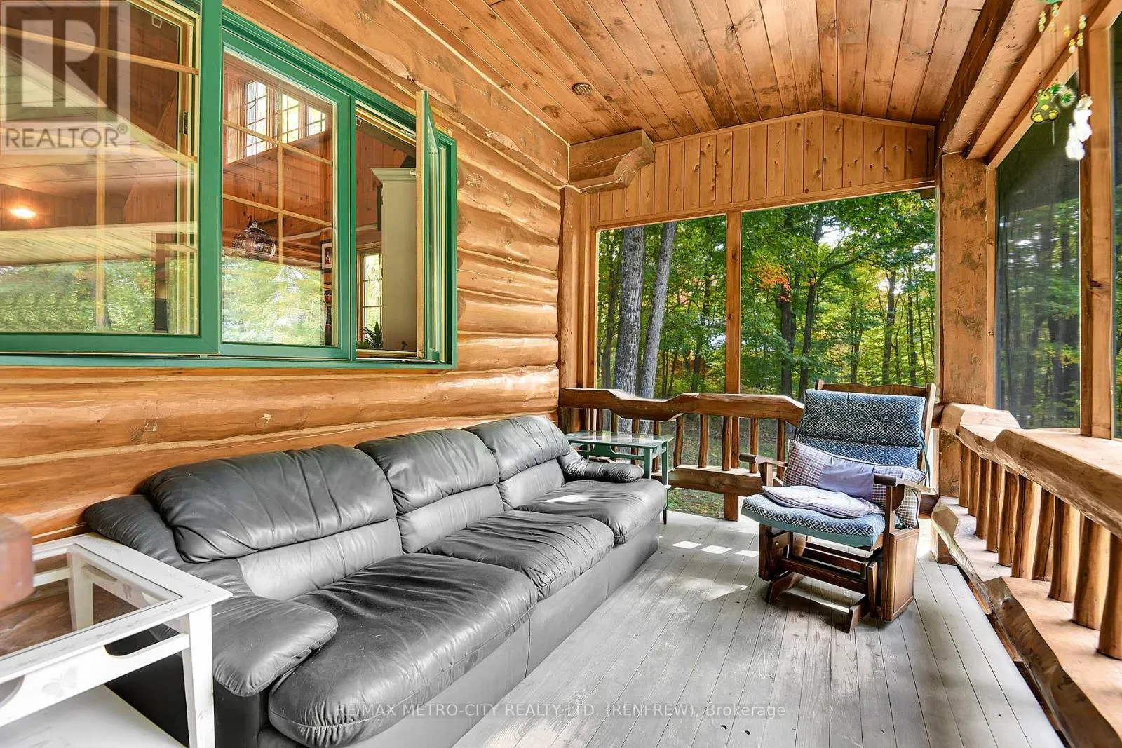 Cross Streets: Bagot Long Lake Rd/HWY 511. ** Directions: Take HWY 511 to Bagot Long Lake Rd, turn onto Bagot Long Lake, follow to Scharf Lane, turn onto Scharf Lane, follow to home of the right. Welcome to 109 Scharf Lane a charming, custom built cedar log home with exposed posts and beams situated on just under 4 private acres, only minutes from the village of Calabogie. Located on a quiet, year-round maintained road, this property offers the perfect blend of privacy, comfort, and convenience. Step inside to an open-concept main floor featuring a bright eat-in kitchen, a formal dining area, and a cozy living room warmed by a gas fireplace and opened up by vaulted ceilings. The main floor also features a full bath equipped with laundry. A central curved stairway leads you to the primary suite, complete with bedroom and ensuite bath, creating a peaceful retreat. The finished walkout basement expands your living space with a second bedroom, a welcoming family room highlighted by an airtight woodstove, and plenty of storage options. Enjoy the convenience of never running out of power with a back-up Generac Propane Generator. Outdoors, enjoy both a covered front porch and a screened-in porch, ideal for relaxing and taking in the natural surroundings. Whether it's morning coffee, evening gatherings, or simply unwinding and enjoying evening sunsets, the outdoor living spaces enhance the charm of this log home. Perfect for year-round amenities, this home places you less than 15 minutes from Calabogie Peaks Ski Resort and Highlands Golf Course, with many lakes and rivers offering public access nearby, including Bagot Long Lake, only a 5 minute walk to the boat launch. Just 10 minutes into the village and an hour to Ottawa's west end, the location combines country tranquility with easy access to amenities. Winter road maintenance is private for Scharf Lane and costs $1,000 annually, this includes plowing of laneway and parking area of the home. (id:27476)