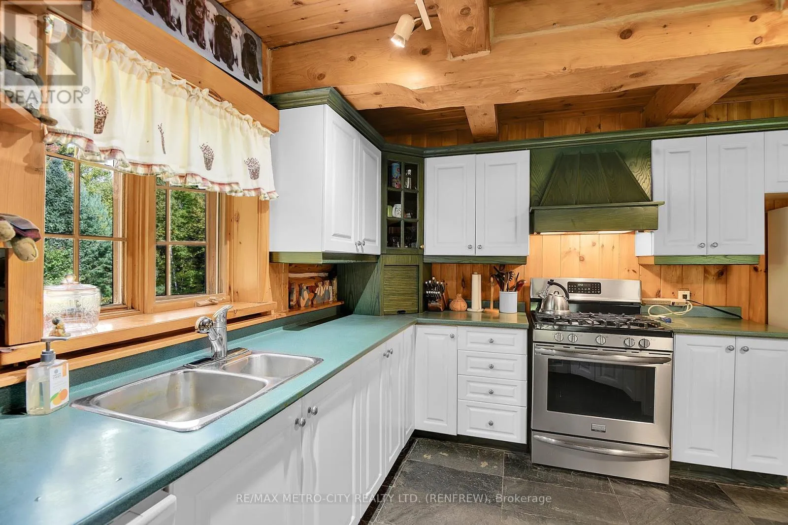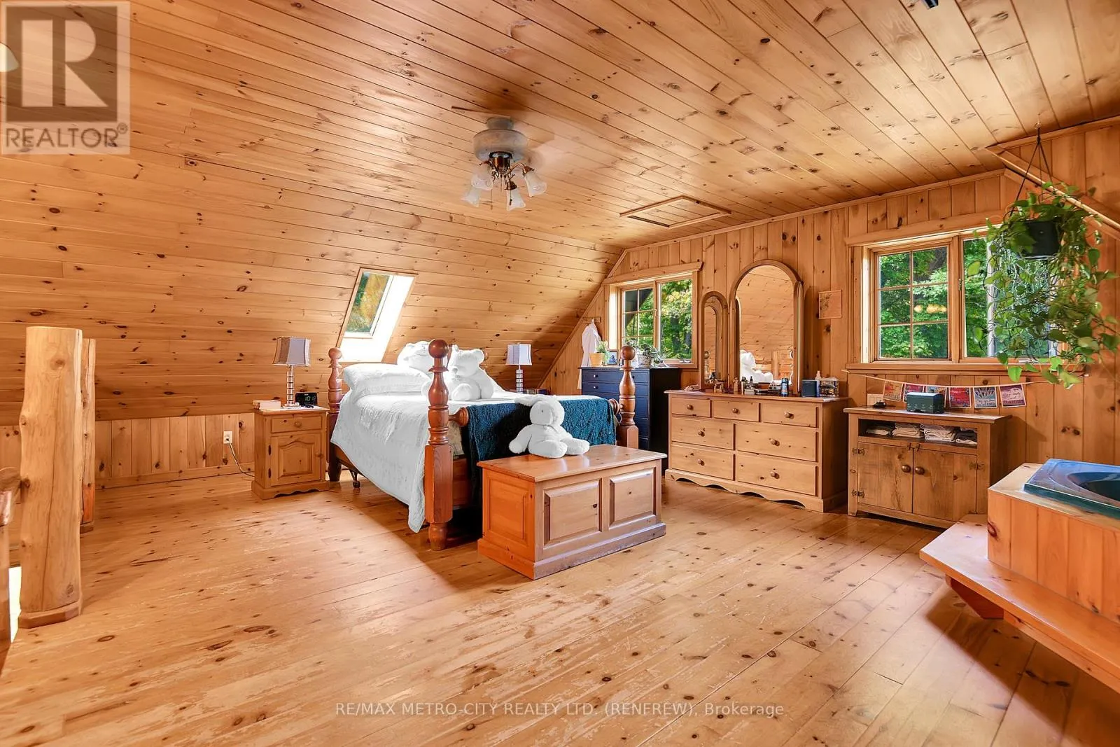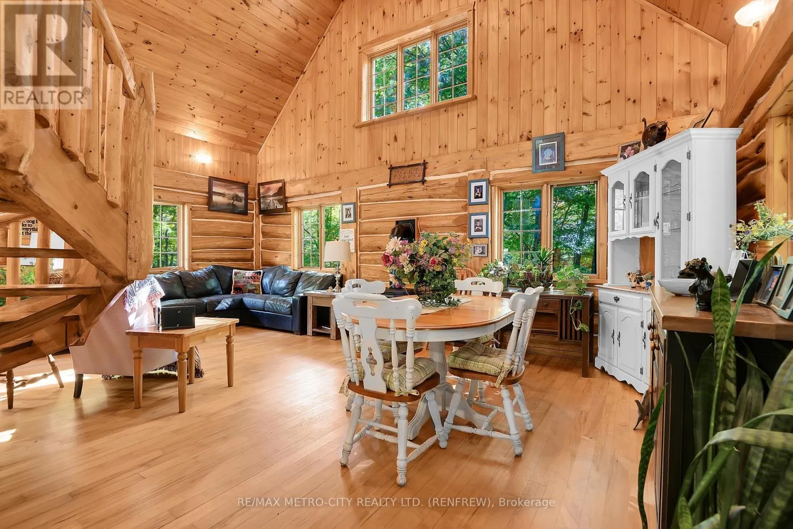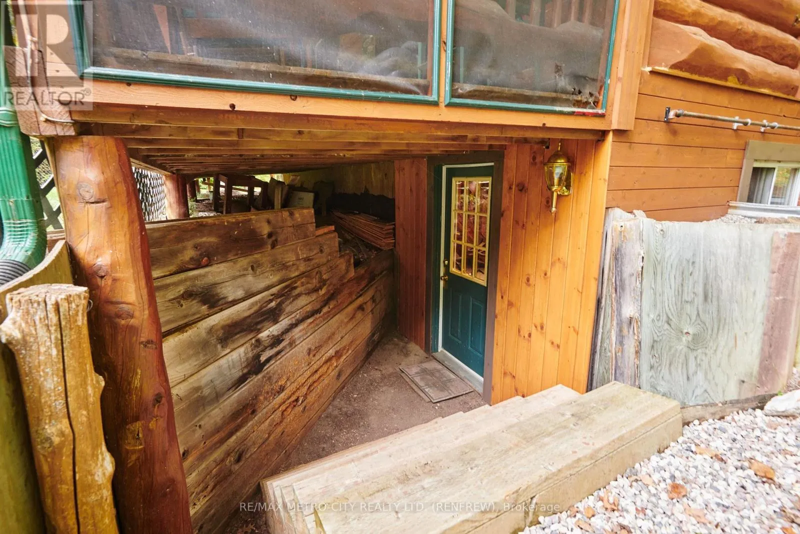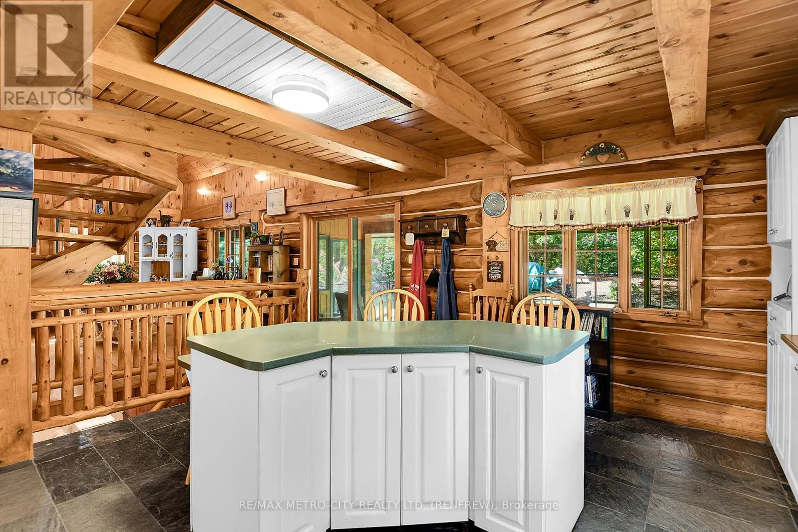 Cross Streets: Bagot Long Lake Rd/HWY 511. ** Directions: Take HWY 511 to Bagot Long Lake Rd, turn onto Bagot Long Lake, follow to Scharf Lane, turn onto Scharf Lane, follow to home of the right. Welcome to 109 Scharf Lane a charming, custom built cedar log home with exposed posts and beams situated on just under 4 private acres, only minutes from the village of Calabogie. Located on a quiet, year-round maintained road, this property offers the perfect blend of privacy, comfort, and convenience. Step inside to an open-concept main floor featuring a bright eat-in kitchen, a formal dining area, and a cozy living room warmed by a gas fireplace and opened up by vaulted ceilings. The main floor also features a full bath equipped with laundry. A central curved stairway leads you to the primary suite, complete with bedroom and ensuite bath, creating a peaceful retreat. The finished walkout basement expands your living space with a second bedroom, a welcoming family room highlighted by an airtight woodstove, and plenty of storage options. Enjoy the convenience of never running out of power with a back-up Generac Propane Generator. Outdoors, enjoy both a covered front porch and a screened-in porch, ideal for relaxing and taking in the natural surroundings. Whether it's morning coffee, evening gatherings, or simply unwinding and enjoying evening sunsets, the outdoor living spaces enhance the charm of this log home. Perfect for year-round amenities, this home places you less than 15 minutes from Calabogie Peaks Ski Resort and Highlands Golf Course, with many lakes and rivers offering public access nearby, including Bagot Long Lake, only a 5 minute walk to the boat launch. Just 10 minutes into the village and an hour to Ottawa's west end, the location combines country tranquility with easy access to amenities. Winter road maintenance is private for Scharf Lane and costs $1,000 annually, this includes plowing of laneway and parking area of the home. (id:27476)