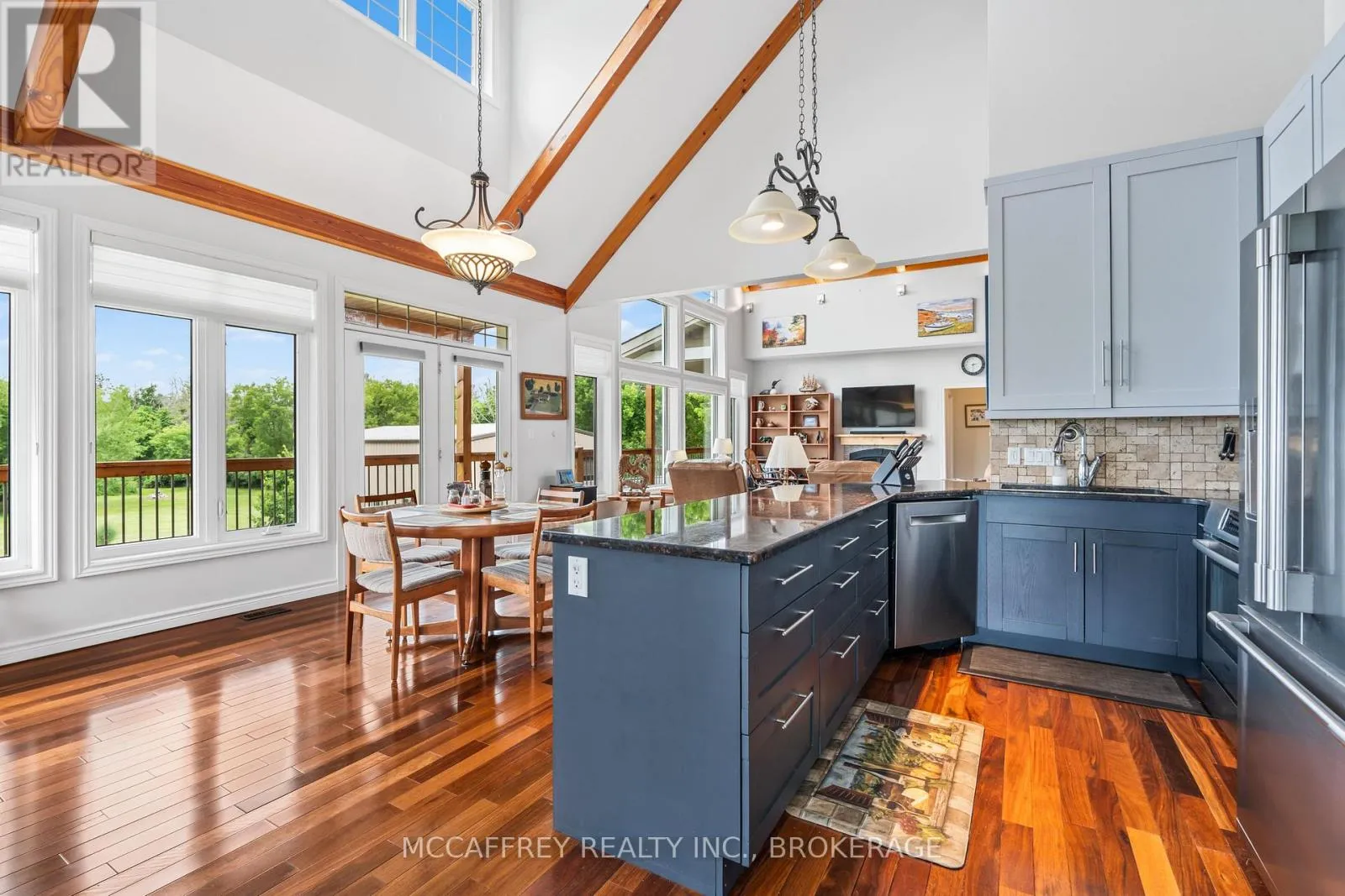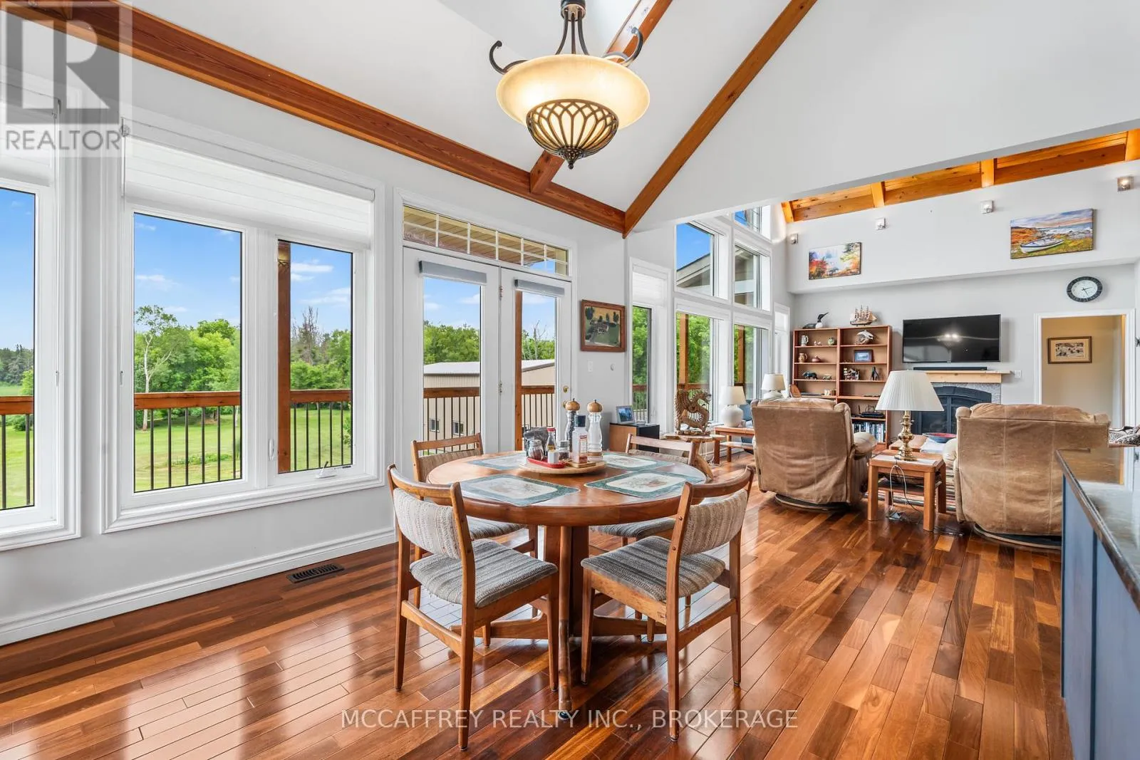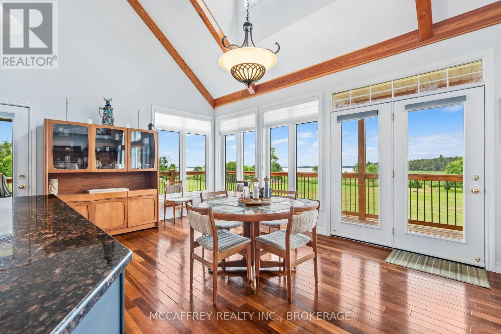 Cross Streets: County Rd 8/County Rd 9. ** Directions: Take County rd 8 south from Napanee, then turn right onto County Rd 9. Welcome to your dream home on the shores of Hay Bay! This custom-built two-story masterpiece, constructed in 2012, blends luxury, comfort, and scenic beauty. Set on a 1.72-acre lot with 202 ft of waterfront, it offers unparalleled living. As you arrive, a double wide paved driveway leads to an attached 2-car garage and a distinctive detached 40' x 58' garage, complete with hydro and oversized doors (12'x14' & 12'x12'), ideal for boats, RVs, or a workshop. Inside, the main level impresses with 28 ft high cathedral ceilings adorned with BC Fir wood beams. Expansive windows illuminate interiors and offer picturesque views of the landscaped backyard and sparkling waters. This level includes a cozy living room with a gas fireplace, an office/den, and a gourmet kitchen with granite countertops, oak cabinetry, and a breakfast bar. The dining room and easy deck access enhance indoor-outdoor living, as well as entrances from the laundry room, and connections to the garage. Two spacious bedrooms, one with deck access, plus a 3 pc and a 4 pc bath, complete this level. Ascend the beautiful wooden staircase to discover the private sanctuary of the Primary suite. Here, you'll find a spacious bedroom complemented by two walk-in closets and a 4 pc ensuite, providing the ultimate retreat. The finished lower level enhances the home's entertainment and storage capabilities. The rec room features a wet bar, 2 pc bath, cold cellar, substantial storage room, and a utility room. Additionally, a semi-finished bedroom with walk-out offers flexibility for your needs. The outdoor space is nothing short of spectacular, with meticulously designed flower gardens and a 10'x24' floating dock invites you to embrace the waterfront lifestyle. Located just minutes from downtown Napanee, this home provides the perfect combination of convenient access to amenities and the privacy and tranquility of waterfront living. (id:27476)