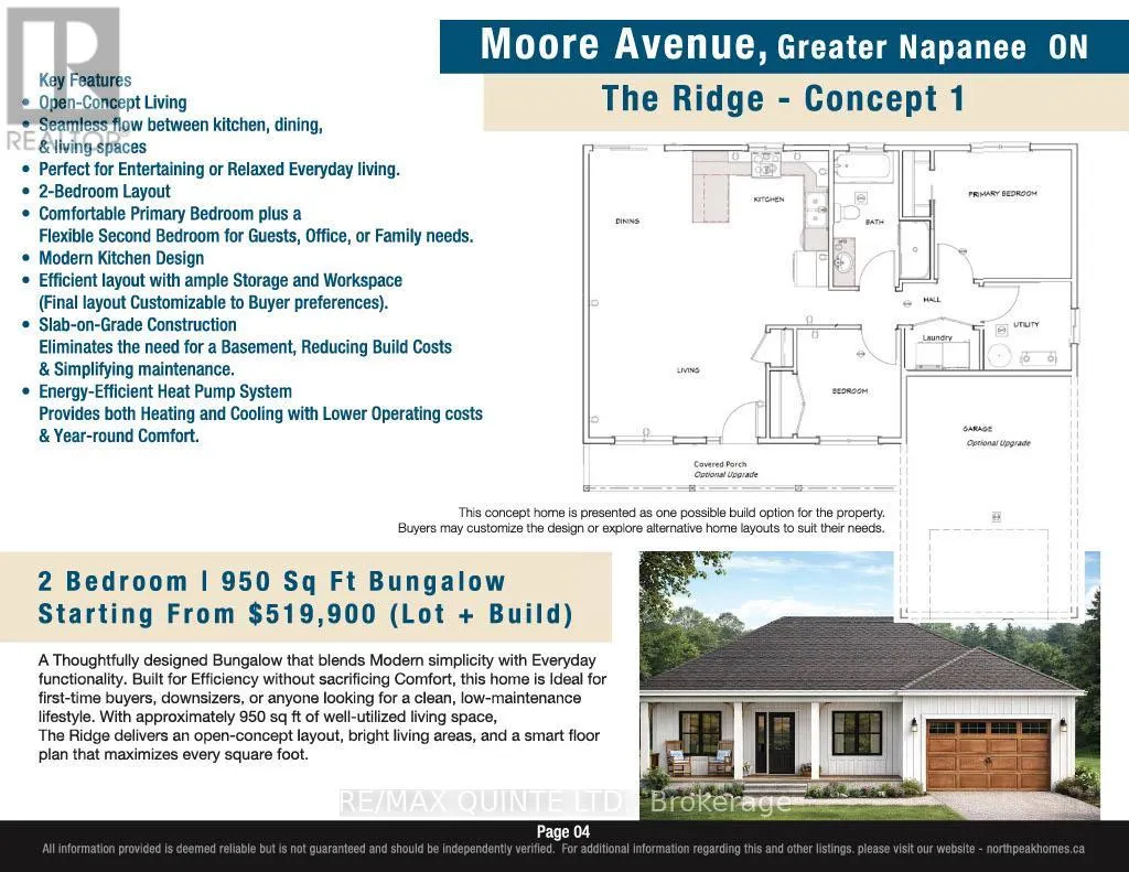 Moore Ave/Concession Rd 3 If you have been looking for an affordable, newly built home in the Greater Napanee area complete with a drilled well boasting an impressive tested flow rate of 15 GPM - then this home is for you!!! Perfectly positioned just 20 minutes from Napanee, 35 minutes to Kingston, and only 5 minutes to the Glenora Ferry, this property places you at the doorstep of everything Prince Edward County has to offer - at a fraction of the price. Imagine waking up to a quiet county lifestyle while still being within easy reach of world-class restaurants, award-winning wineries, and vibrant cultural events. Boating and fishing enthusiasts will love the fact that a boat launch into the stunning Hay Bay is just minutes from your door. Partnering with NorthPeak Homes, buyers can rest easy knowing that their home will be fully warrantied under Ontario's Tarion home warranty program. The Ridge, is a thoughtfully designed 950 sq ft, 2-bedroom bungalow. This modern bungalow offers an open-concept living, dining, and kitchen layout, a primary bedroom, a flexible second bedroom, slab-on-grade construction to reduce costs, and an energy-efficient heat pump system for year-round comfort. Optional upgrades include a covered front porch and attached garage. Taxes are yet to be assessed. Don't miss this chance to take advantage of the Ontario governments new HST incentive program and build your dream home in one of Eastern Ontario's most desirable and growing communities. A full package that includes a builders feature sheet is available upon request. (id:27476)