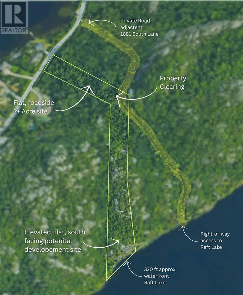 South Lane Road - Raft Lake Waterfront. Over 7 acres of private land with 320+ feet of frontage on Raft Lake, just minutes from the South Endâs Four Corners. Approximately 2 acres of flat land at the roadside offer an ideal starting point for an initial build. Toward the back of the lot, a raised plateau overlooks the lake to the south, providing a second, elevated build site with long views and excellent sun exposure. Substantional clearing already pushed in off private road. Possibility to develop flat land at roadside. Hydro, natural gas, garbage and recycling pickup, snow removal, and school bus service are all available at the road. Whether you're planning a year-round home, a seasonal retreat, or both, the layout offers flexibility, privacy, and long-term value a chance to build something truly special in a peaceful, well-connected setting. (id:27476)