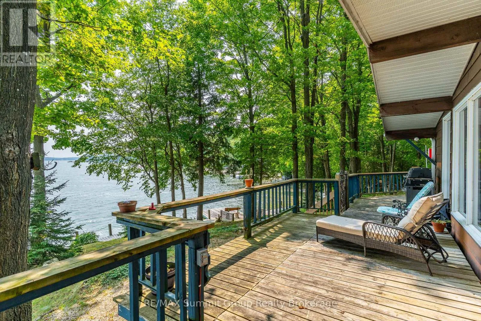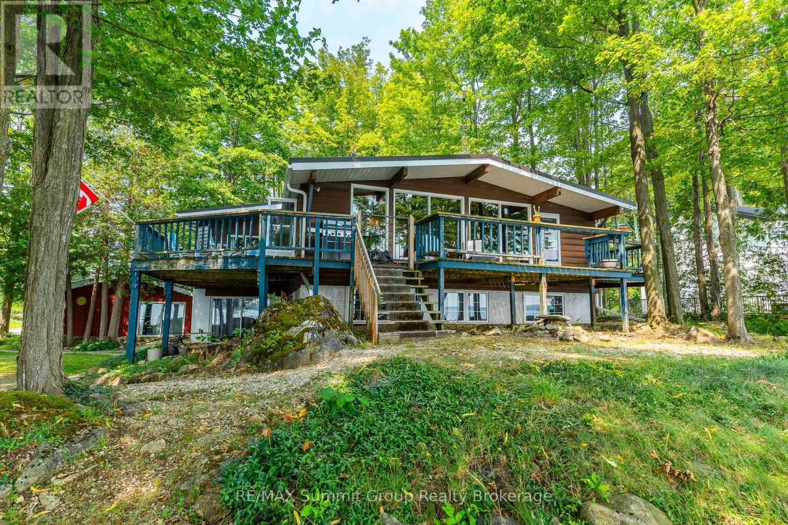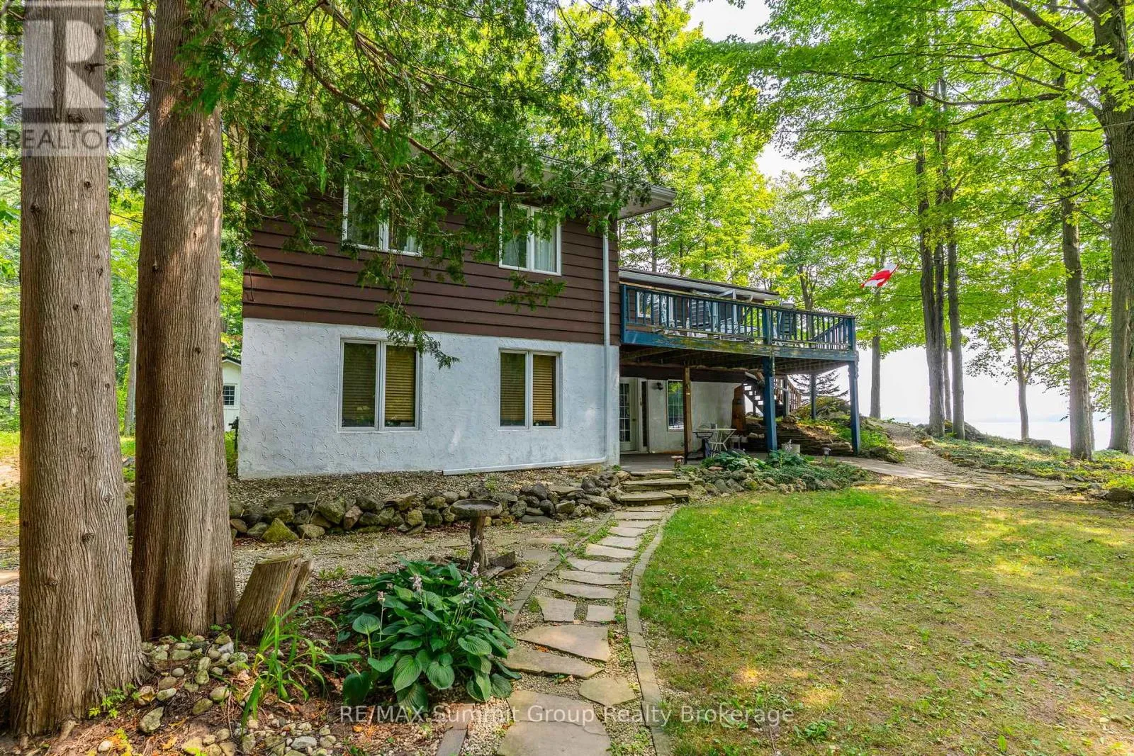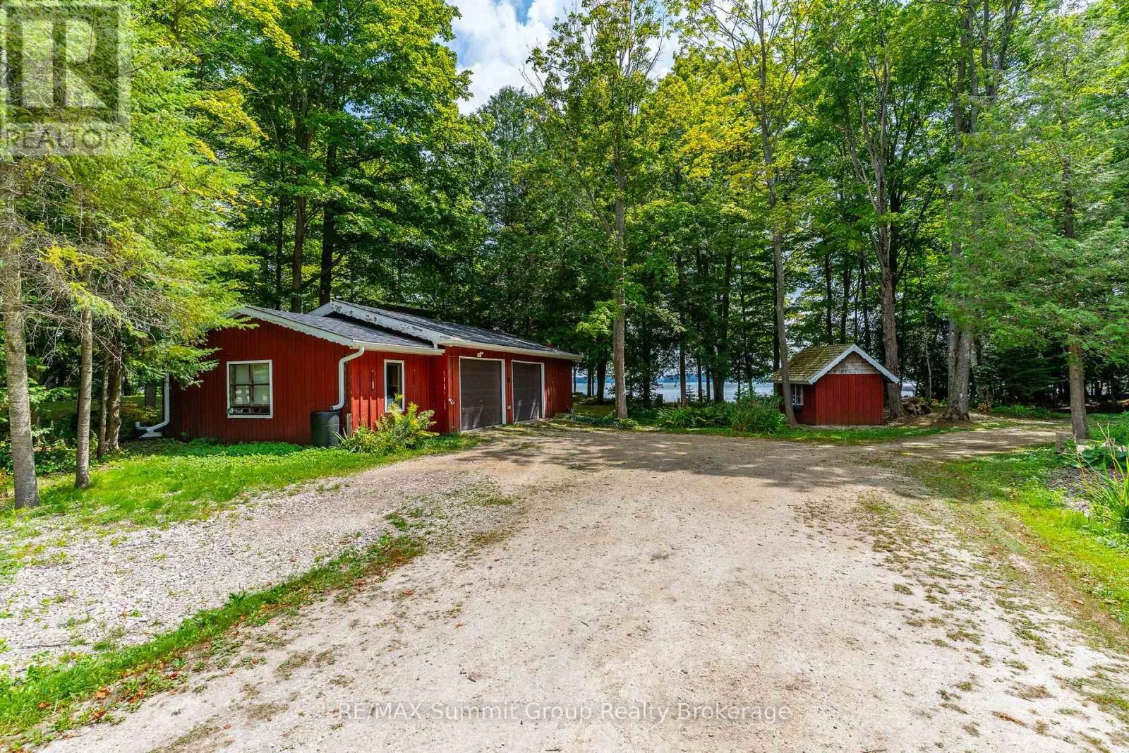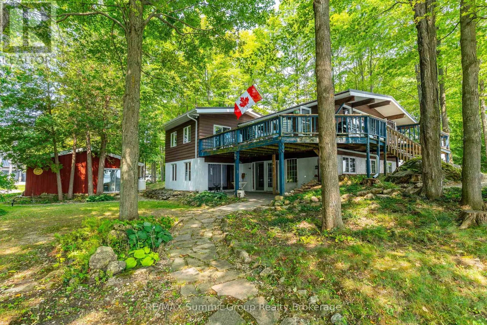 Cross Streets: Baragar Rd & Point Road. ** Directions: From Grey Rd 13 (Beaver Valley Rd) turn east onto 12th Concession B, then right/south onto Point Rd, then left/east onto Baragar Rd to property on the right/south. Where the shoreline stretches wide and the seasons play out at your front door, this Lake Eugenia property delivers space, privacy, and four-season fun. At least 180 feet of south-facing shoreline sets the stage for year-round living or your future build. Once an original double lot, this 0.639-acre property is mostly treed and natural, with a forest floor that blends seamlessly into the shoreline. A full-length walkway stretches across the water's edge, set over a stone wall, leading to a dock for deeper-water access. At the west end, a sandy beach with a gentle, shallow entry is perfect for children or relaxed wading. The Viceroy-style bungalow, built in 1968 with a later-added basement, offers a total of five bedrooms and two bathrooms. The main floor features three bedrooms and a five-piece bath, along with a galley kitchen that opens to the dining and living rooms. Expansive windows frame the lake views, and multiple walkouts lead to a wraparound deck, perfect for morning coffee, summer meals, or simply soaking in the scenery. The walkout lower level includes two additional bedrooms, a three-piece bath, and a laundry area, plus a spacious rec room warmed by a propane fireplace with direct access to the outdoors. The main heat source is electric baseboard throughout, and the septic system was replaced in 2021 and a Hy-Grade metal roof in 2006. A detached, uninsulated, oversized double-car garage provides space for vehicles and gear. This property is ideal for those seeking a premium lot with an affordable cottage to enjoy as-is, or for anyone planning to build a custom waterfront retreat now or in the future. Whether your days are spent swimming, paddling, or fishing from your dock, skiing at nearby Beaver Valley Ski Club, or hiking the Bruce Trail, this location offers four seasons of recreation and the rare privacy that comes with such generous frontage on Lake Eugenia. (id:27476)