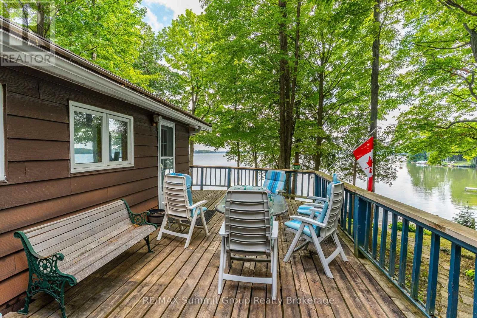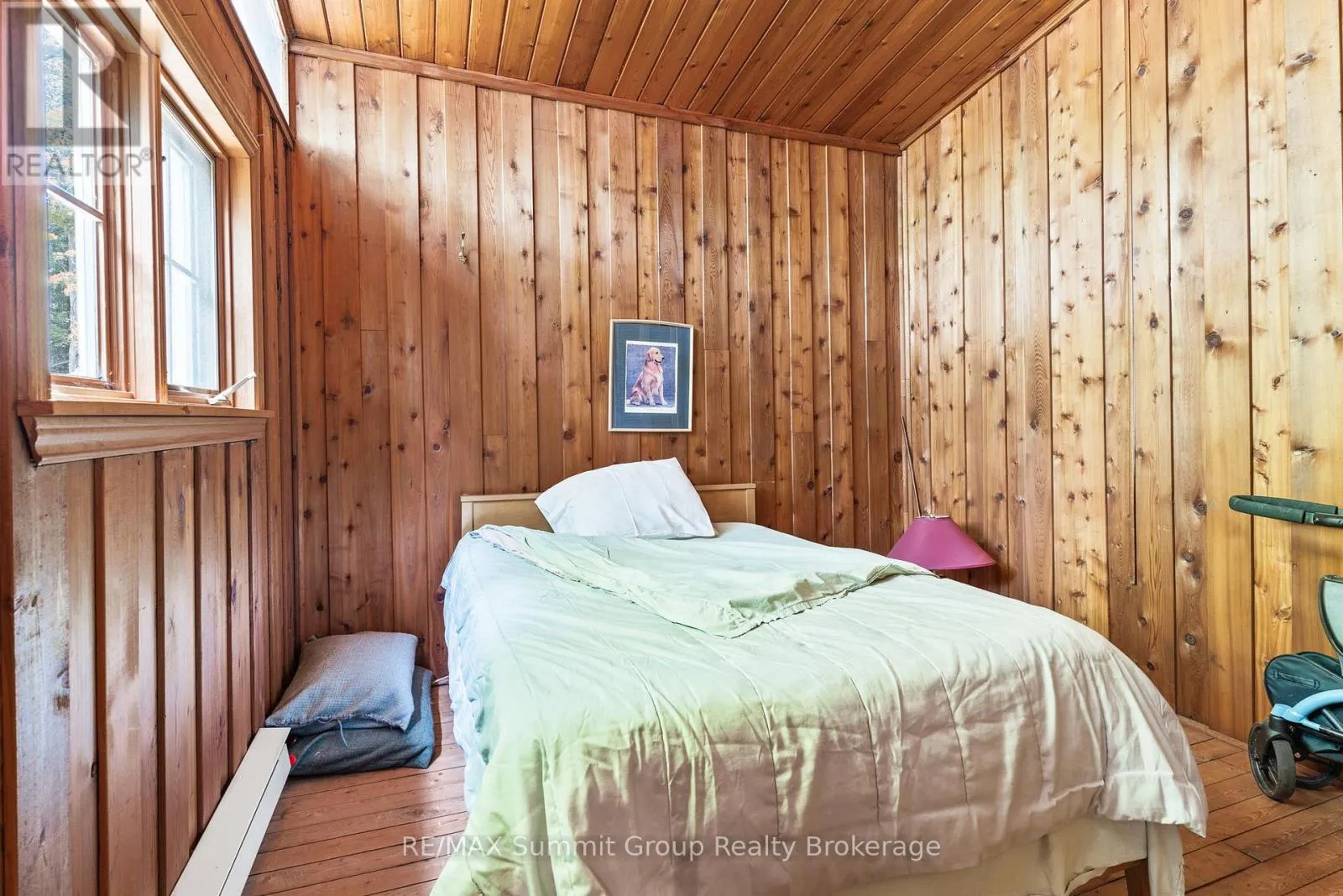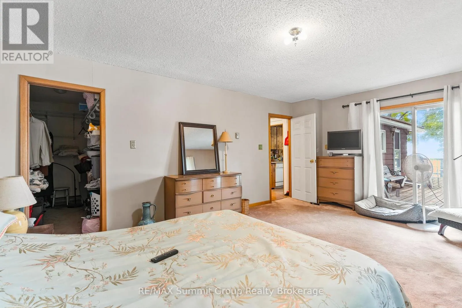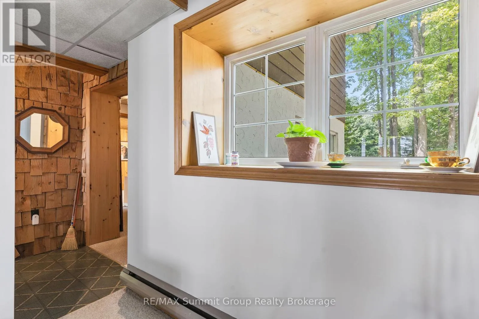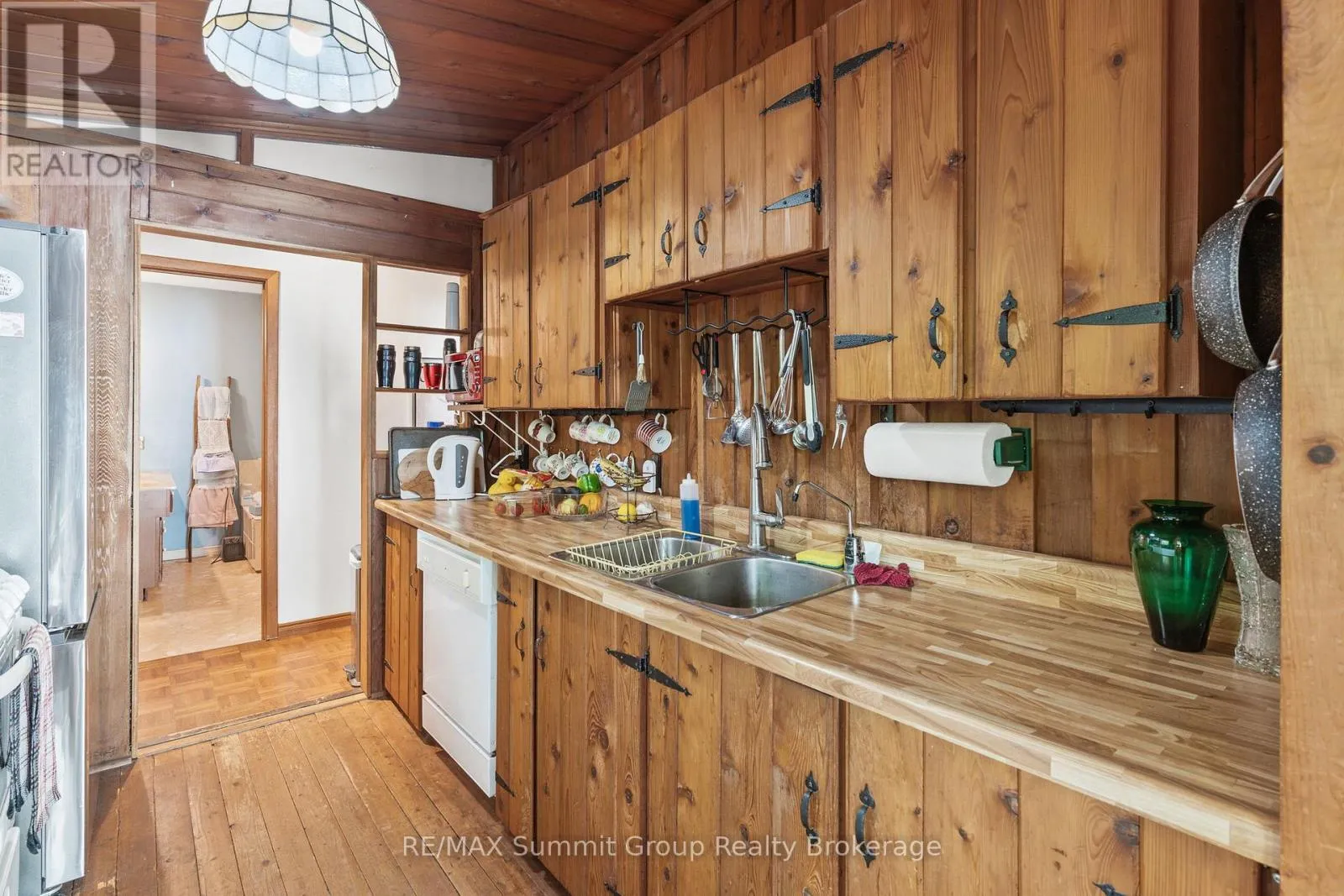 Cross Streets: Baragar Rd & Point Road. ** Directions: From Grey Rd 13 (Beaver Valley Rd) turn east onto 12th Concession B, then right/south onto Point Rd, then left/east onto Baragar Rd to property on the right/south. Where the shoreline stretches wide and the seasons play out at your front door, this Lake Eugenia property delivers space, privacy, and four-season fun. At least 180 feet of south-facing shoreline sets the stage for year-round living or your future build. Once an original double lot, this 0.639-acre property is mostly treed and natural, with a forest floor that blends seamlessly into the shoreline. A full-length walkway stretches across the water's edge, set over a stone wall, leading to a dock for deeper-water access. At the west end, a sandy beach with a gentle, shallow entry is perfect for children or relaxed wading. The Viceroy-style bungalow, built in 1968 with a later-added basement, offers a total of five bedrooms and two bathrooms. The main floor features three bedrooms and a five-piece bath, along with a galley kitchen that opens to the dining and living rooms. Expansive windows frame the lake views, and multiple walkouts lead to a wraparound deck, perfect for morning coffee, summer meals, or simply soaking in the scenery. The walkout lower level includes two additional bedrooms, a three-piece bath, and a laundry area, plus a spacious rec room warmed by a propane fireplace with direct access to the outdoors. The main heat source is electric baseboard throughout, and the septic system was replaced in 2021 and a Hy-Grade metal roof in 2006. A detached, uninsulated, oversized double-car garage provides space for vehicles and gear. This property is ideal for those seeking a premium lot with an affordable cottage to enjoy as-is, or for anyone planning to build a custom waterfront retreat now or in the future. Whether your days are spent swimming, paddling, or fishing from your dock, skiing at nearby Beaver Valley Ski Club, or hiking the Bruce Trail, this location offers four seasons of recreation and the rare privacy that comes with such generous frontage on Lake Eugenia. (id:27476)