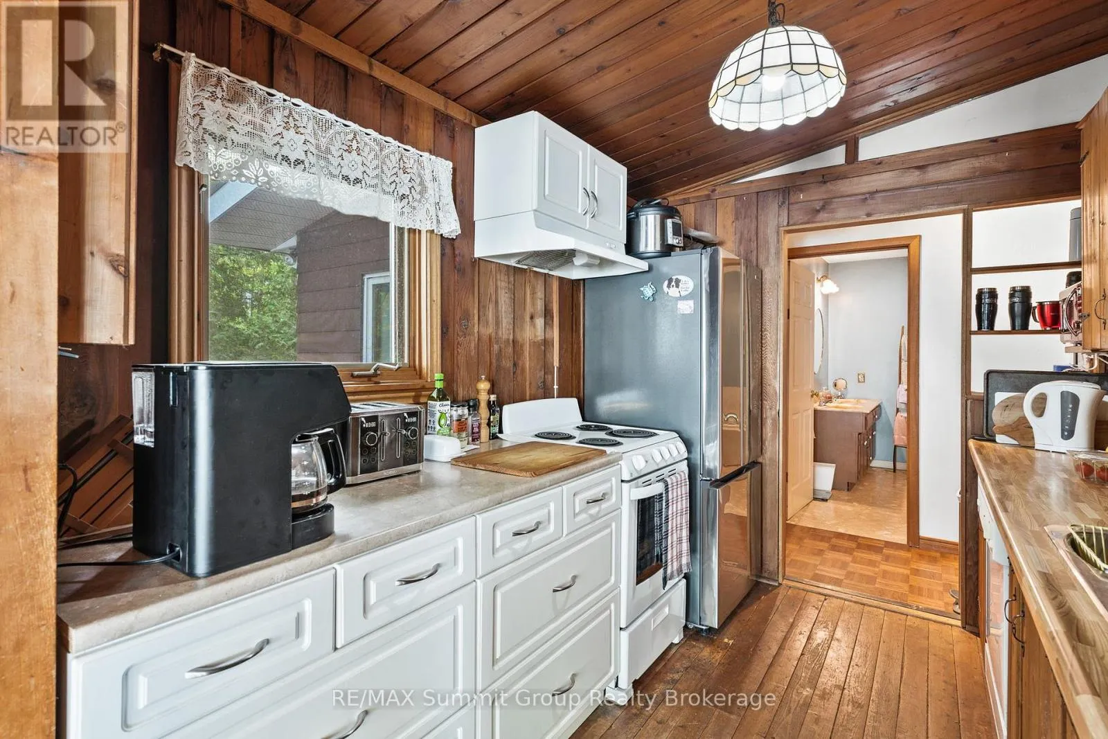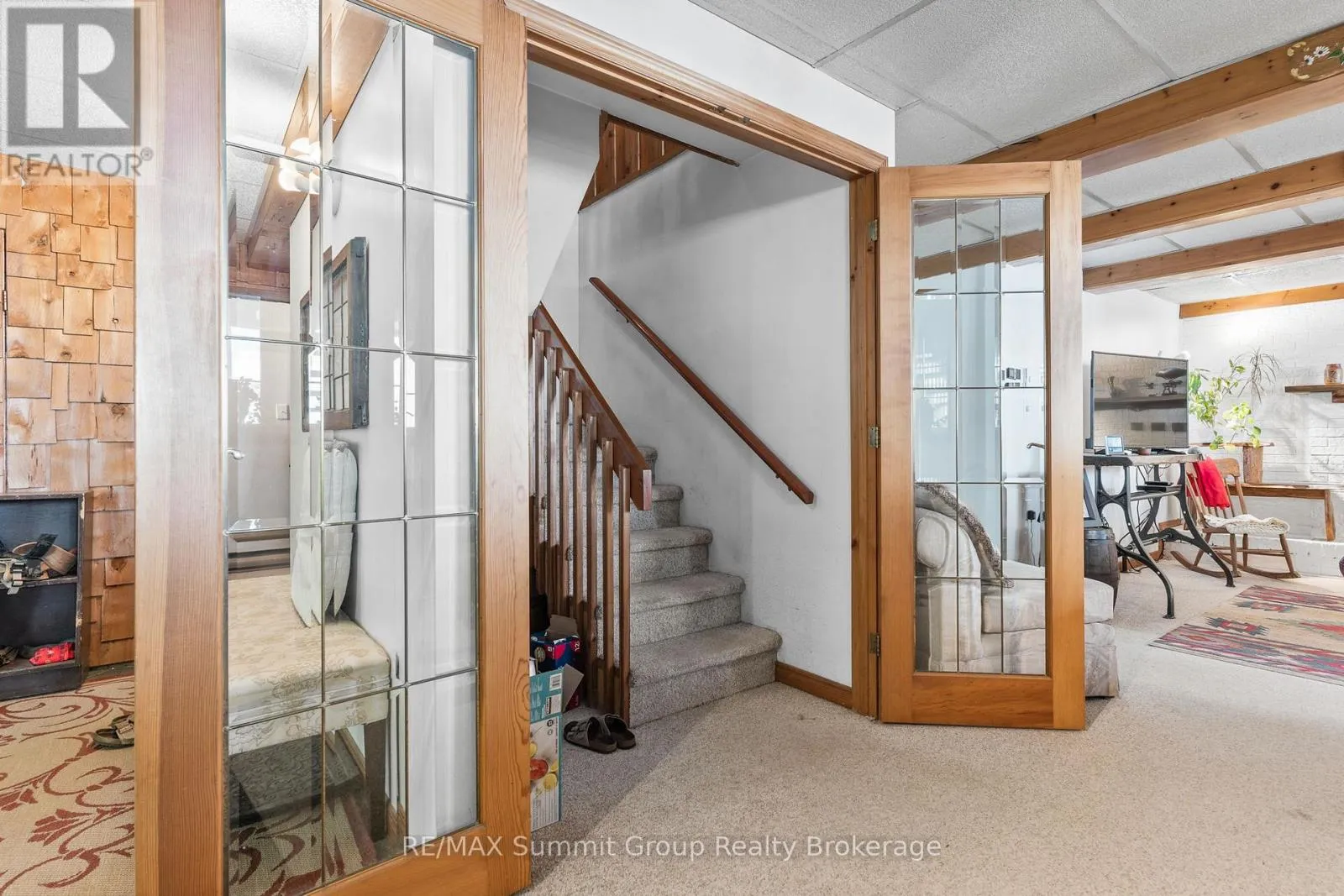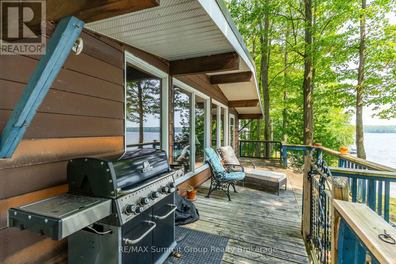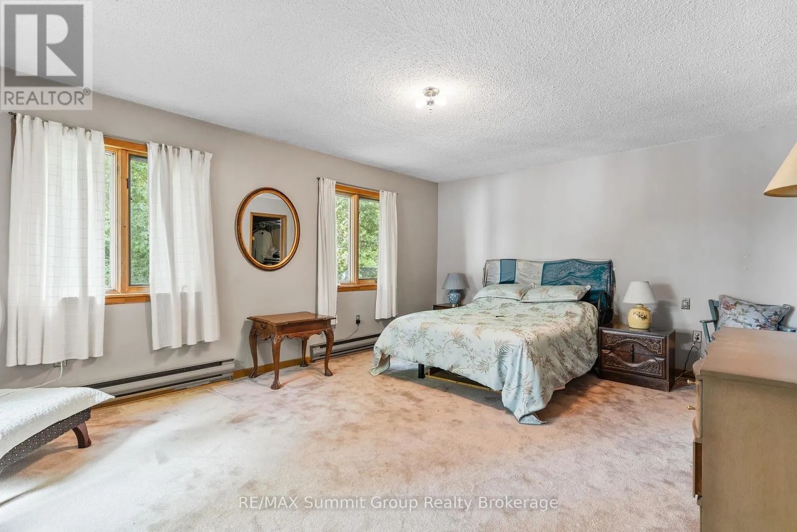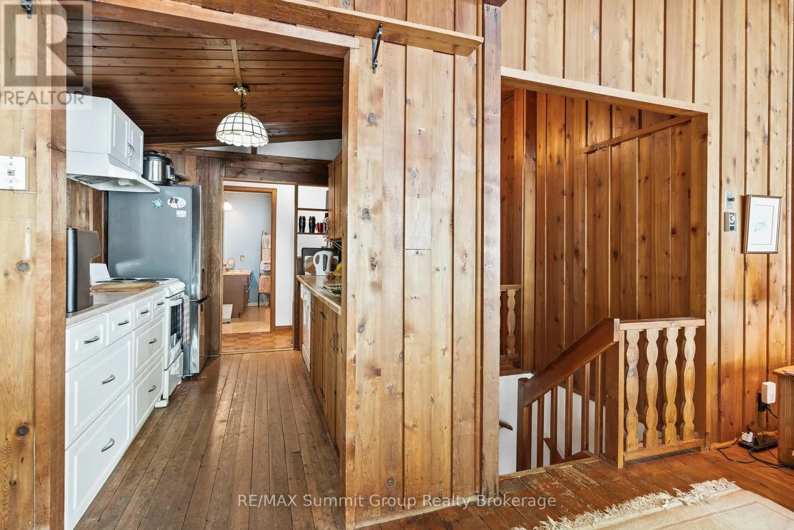 Cross Streets: Baragar Rd & Point Road. ** Directions: From Grey Rd 13 (Beaver Valley Rd) turn east onto 12th Concession B, then right/south onto Point Rd, then left/east onto Baragar Rd to property on the right/south. Where the shoreline stretches wide and the seasons play out at your front door, this Lake Eugenia property delivers space, privacy, and four-season fun. At least 180 feet of south-facing shoreline sets the stage for year-round living or your future build. Once an original double lot, this 0.639-acre property is mostly treed and natural, with a forest floor that blends seamlessly into the shoreline. A full-length walkway stretches across the water's edge, set over a stone wall, leading to a dock for deeper-water access. At the west end, a sandy beach with a gentle, shallow entry is perfect for children or relaxed wading. The Viceroy-style bungalow, built in 1968 with a later-added basement, offers a total of five bedrooms and two bathrooms. The main floor features three bedrooms and a five-piece bath, along with a galley kitchen that opens to the dining and living rooms. Expansive windows frame the lake views, and multiple walkouts lead to a wraparound deck, perfect for morning coffee, summer meals, or simply soaking in the scenery. The walkout lower level includes two additional bedrooms, a three-piece bath, and a laundry area, plus a spacious rec room warmed by a propane fireplace with direct access to the outdoors. The main heat source is electric baseboard throughout, and the septic system was replaced in 2021 and a Hy-Grade metal roof in 2006. A detached, uninsulated, oversized double-car garage provides space for vehicles and gear. This property is ideal for those seeking a premium lot with an affordable cottage to enjoy as-is, or for anyone planning to build a custom waterfront retreat now or in the future. Whether your days are spent swimming, paddling, or fishing from your dock, skiing at nearby Beaver Valley Ski Club, or hiking the Bruce Trail, this location offers four seasons of recreation and the rare privacy that comes with such generous frontage on Lake Eugenia. (id:27476)