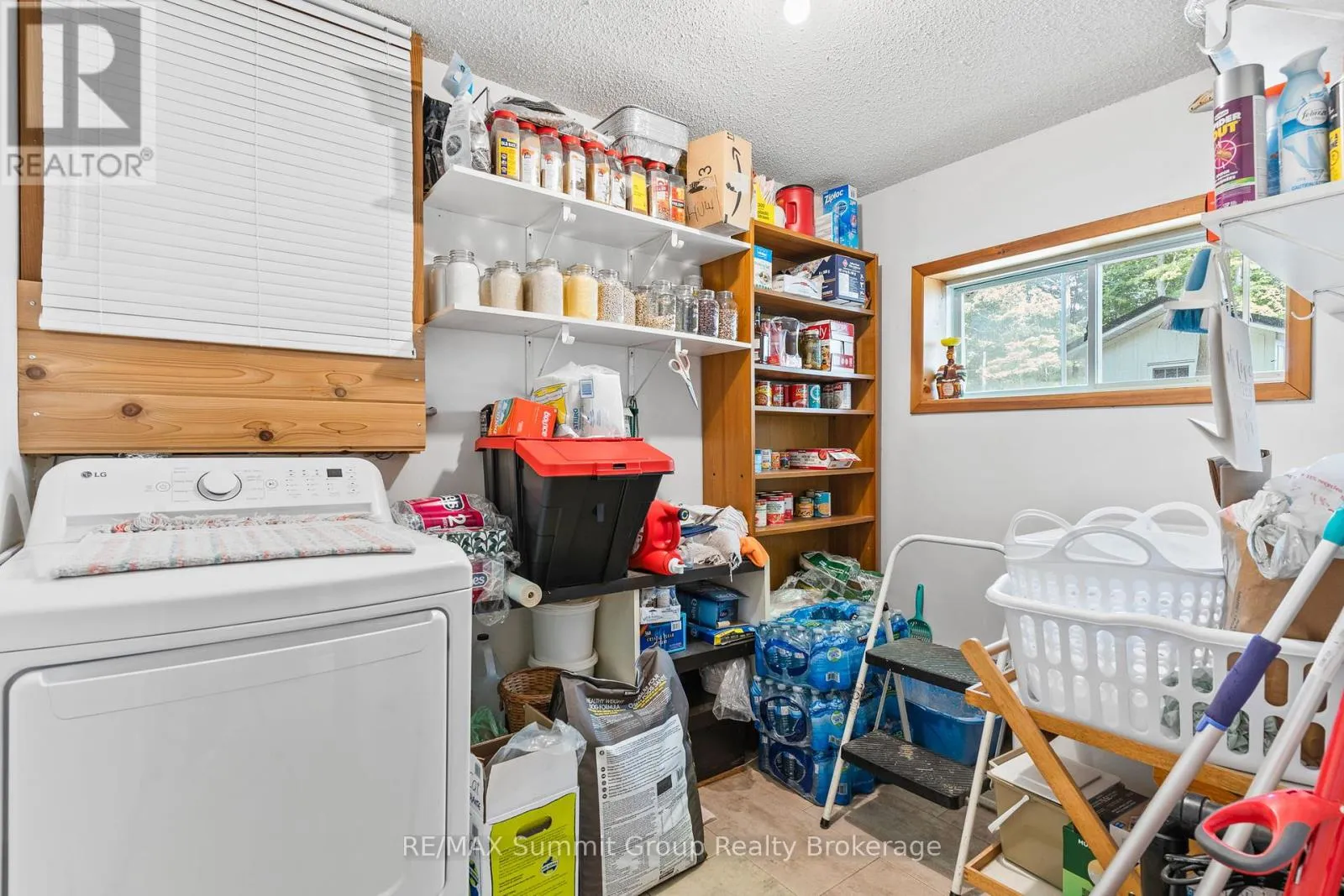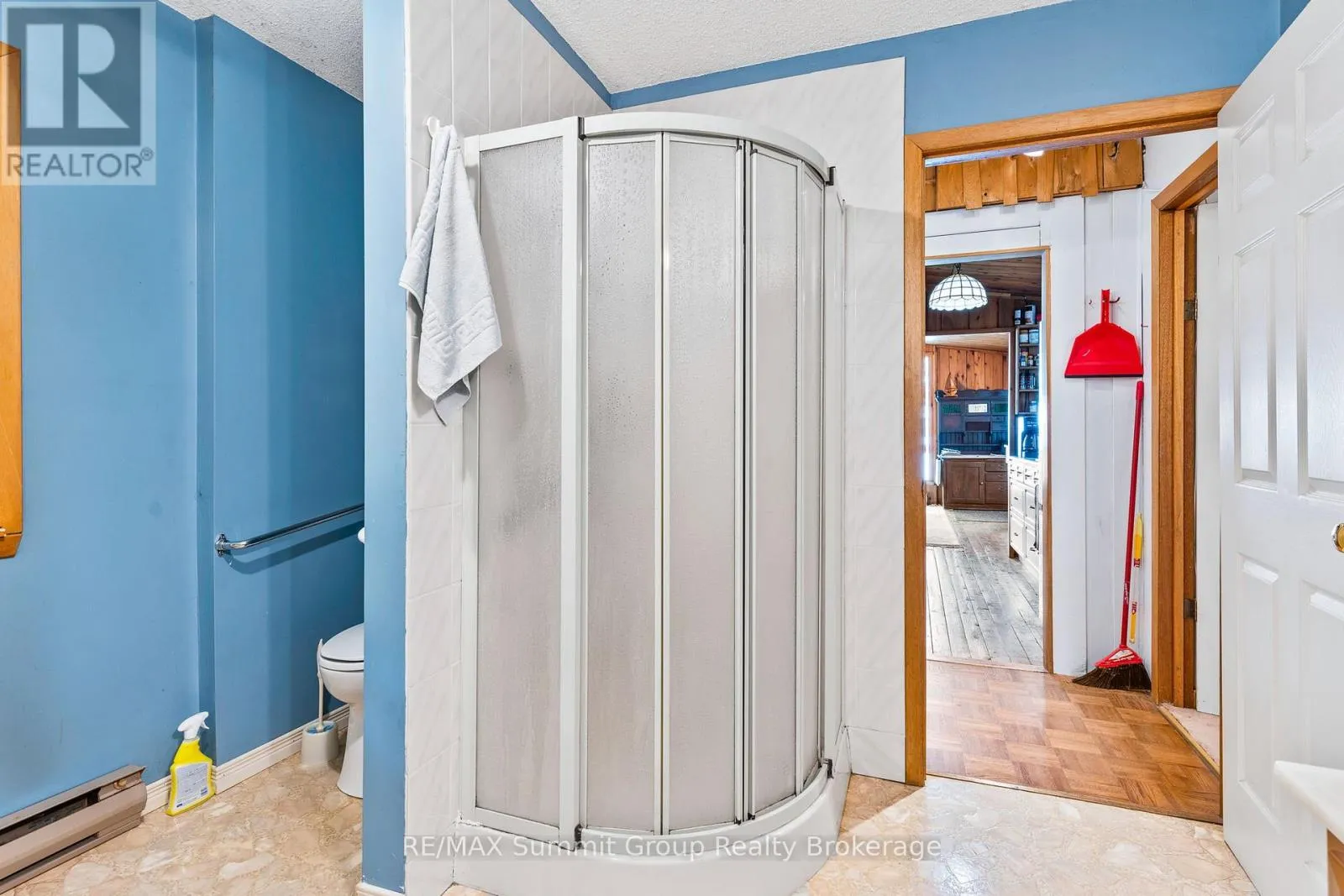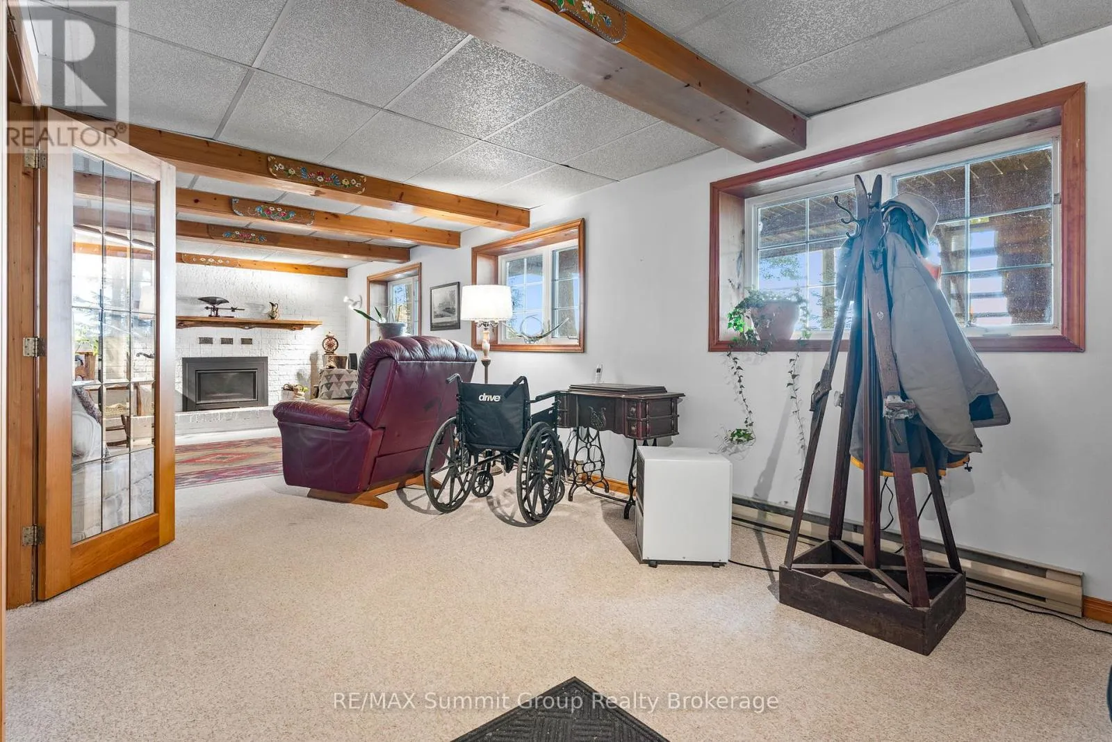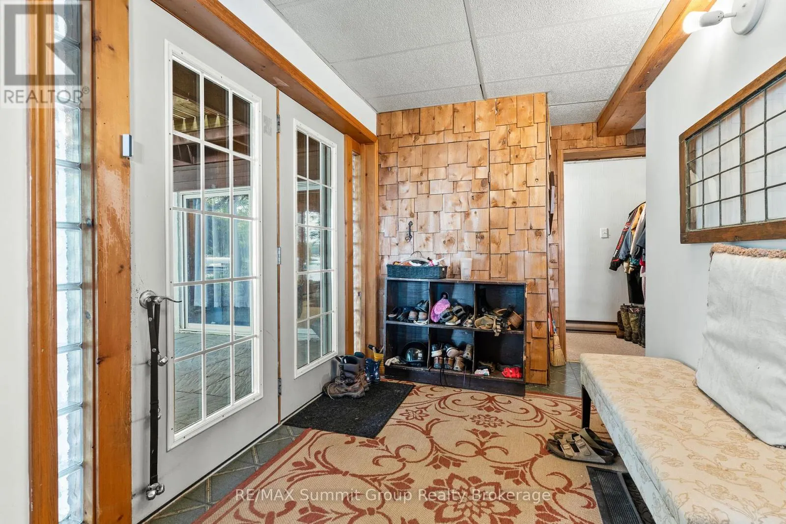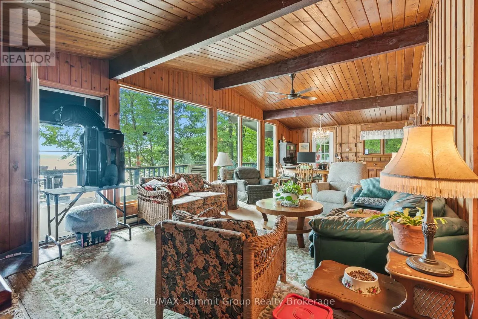 Cross Streets: Baragar Rd & Point Road. ** Directions: From Grey Rd 13 (Beaver Valley Rd) turn east onto 12th Concession B, then right/south onto Point Rd, then left/east onto Baragar Rd to property on the right/south. Where the shoreline stretches wide and the seasons play out at your front door, this Lake Eugenia property delivers space, privacy, and four-season fun. At least 180 feet of south-facing shoreline sets the stage for year-round living or your future build. Once an original double lot, this 0.639-acre property is mostly treed and natural, with a forest floor that blends seamlessly into the shoreline. A full-length walkway stretches across the water's edge, set over a stone wall, leading to a dock for deeper-water access. At the west end, a sandy beach with a gentle, shallow entry is perfect for children or relaxed wading. The Viceroy-style bungalow, built in 1968 with a later-added basement, offers a total of five bedrooms and two bathrooms. The main floor features three bedrooms and a five-piece bath, along with a galley kitchen that opens to the dining and living rooms. Expansive windows frame the lake views, and multiple walkouts lead to a wraparound deck, perfect for morning coffee, summer meals, or simply soaking in the scenery. The walkout lower level includes two additional bedrooms, a three-piece bath, and a laundry area, plus a spacious rec room warmed by a propane fireplace with direct access to the outdoors. The main heat source is electric baseboard throughout, and the septic system was replaced in 2021 and a Hy-Grade metal roof in 2006. A detached, uninsulated, oversized double-car garage provides space for vehicles and gear. This property is ideal for those seeking a premium lot with an affordable cottage to enjoy as-is, or for anyone planning to build a custom waterfront retreat now or in the future. Whether your days are spent swimming, paddling, or fishing from your dock, skiing at nearby Beaver Valley Ski Club, or hiking the Bruce Trail, this location offers four seasons of recreation and the rare privacy that comes with such generous frontage on Lake Eugenia. (id:27476)