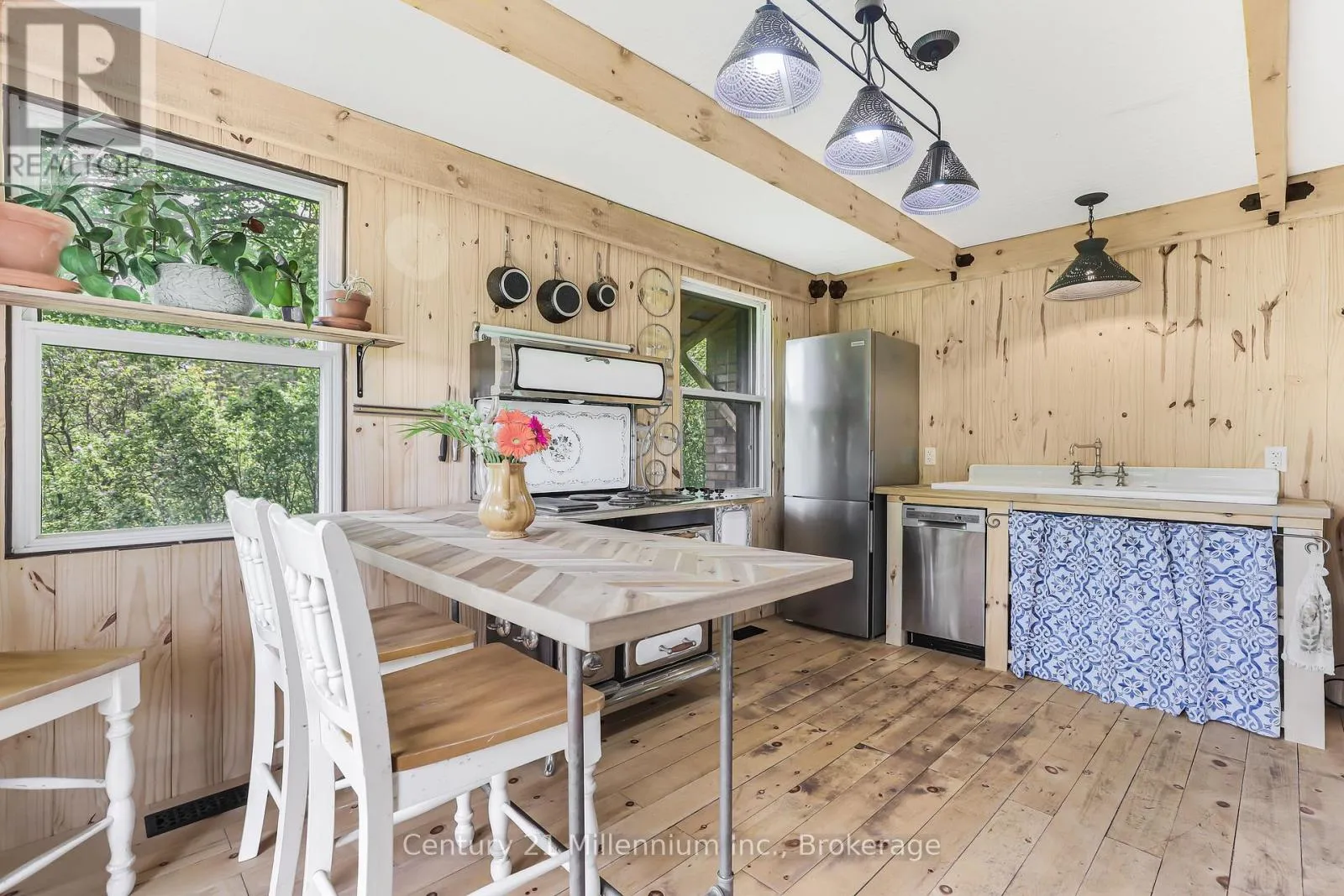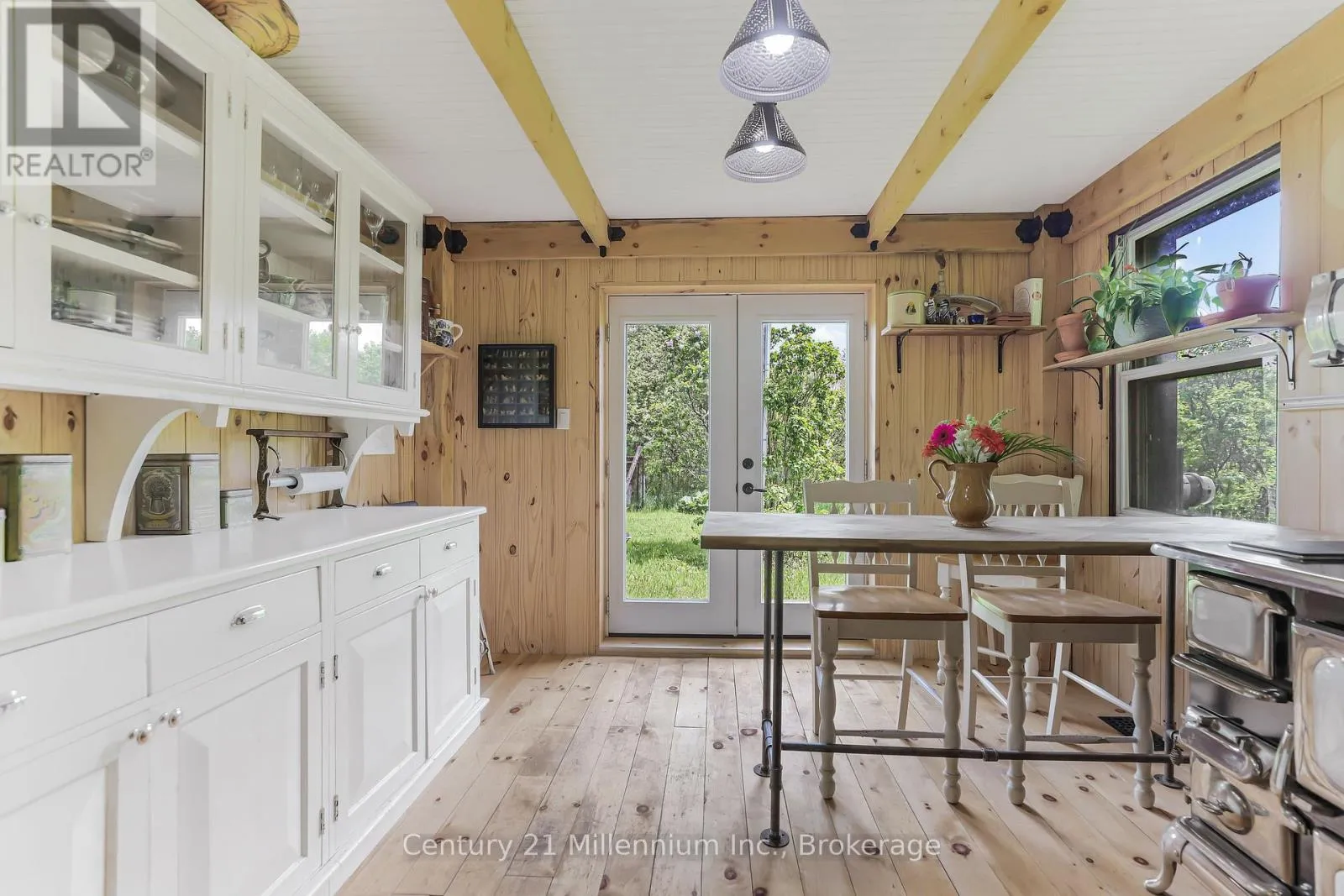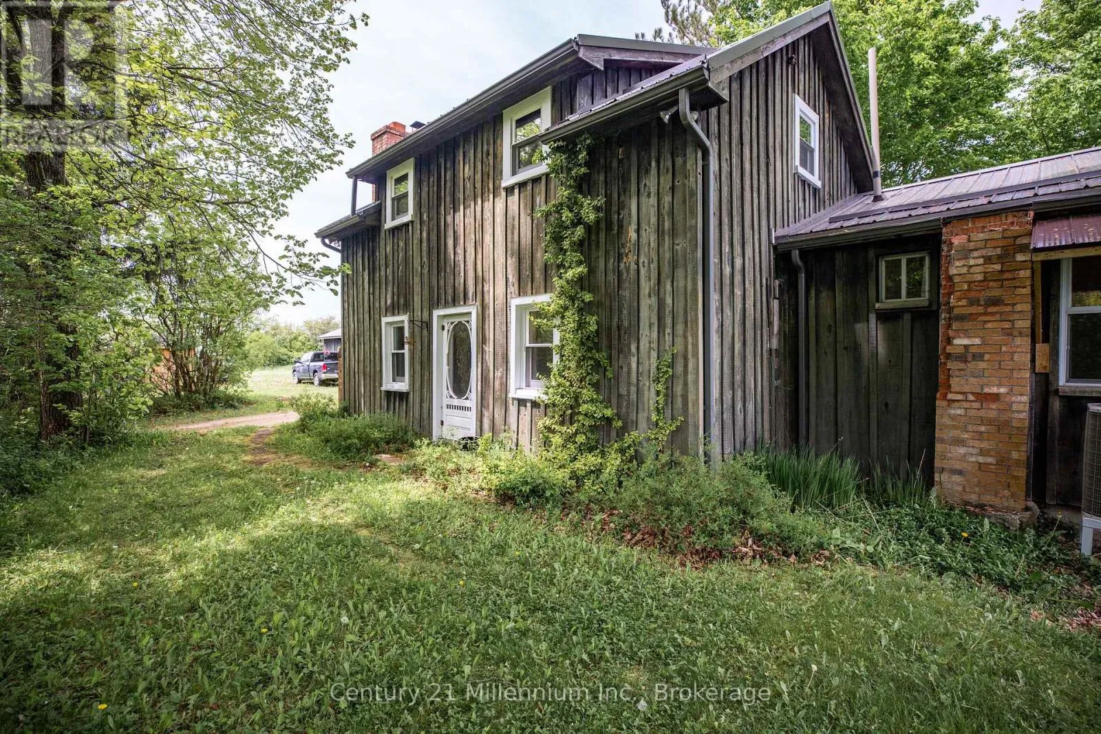 Cross Streets: Artemesia Euphrasia Townline & Grey Rd 12. ** Directions: From Markdale North/East on Grey Rd 12, Turn North on East Back Line(will turn into Artemesia Euphrasia Townline)Property is located on the right side. Set on 46 acres along the clean, cool waters of the Rocky Saugeen River, this log farmhouse is one of the last remaining century farms in Grey Highlands . Originally built in the 1880s and expanded in the 1970s, it combines historic features with modern upgrades. The main level of the home features an updated kitchen with a new garden door that brings in natural light. Upstairs, the primary bedroom offers wide plank floors, a walk-in closet, a 2-piece bathroom and could be converted back into 2 bedrooms. The home also includes a den that could be used as an office or guest room, and a modern laundry area with a new washer and dryer. Updates include a steel roof (2021), a 200-amp electrical panel, a generator plug, and a 2022heat/cooling pump with a backup electric furnace. A wood insert stove adds extra heat during the winter. The land includes approximately 25 workable acres currently seeded in regenerative hay crops. Approximately 15 acres are securely fenced and ready for hobby farming or equestrian pursuits. There are five paddocks with two electric outlets and one no-freeze hydrant for easy winter care. Original fence rows and walking trails lead to the Rocky Saugeen river. Outbuildings include a 60' x 88' board and batten barn built in 2020 with hydro and water, and a 30' x 50' detached garage/shop, also serviced with hydro and water. Additional structures include a chicken coop, woodshed, and a small animal shelter cat condo. Located just minutes from Markdale and a 35-minute drive to Owen Sound, this home places you in the heart of four-season recreation with skiing, hiking, fishing, paddling, snowmobiling, and more surrounded by the natural beauty of waterfalls, trails, and rivers. (id:27476)