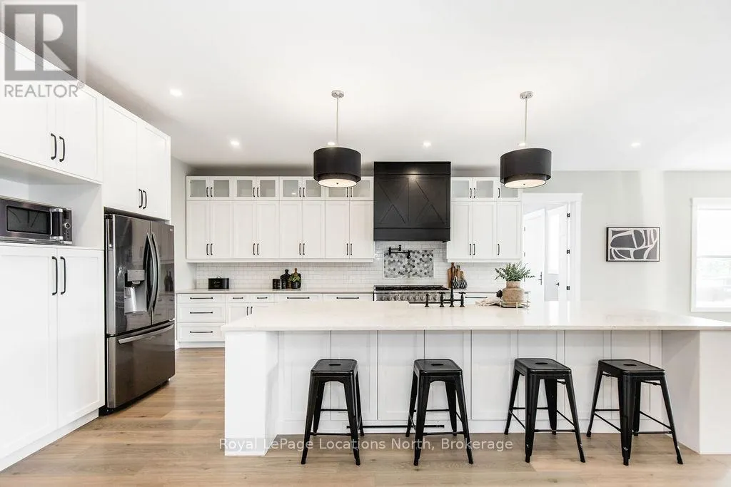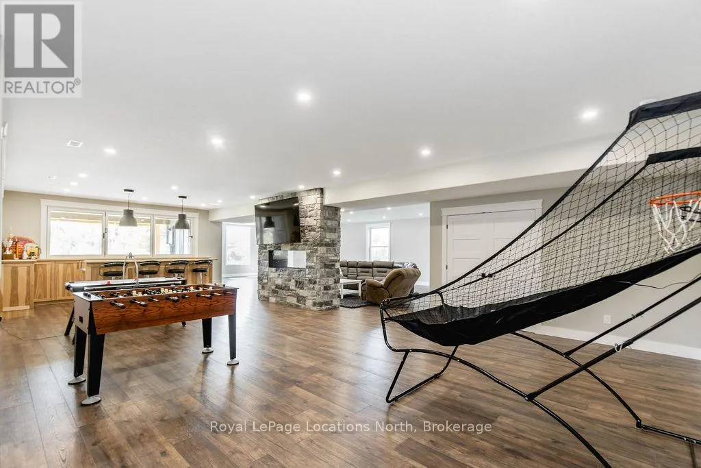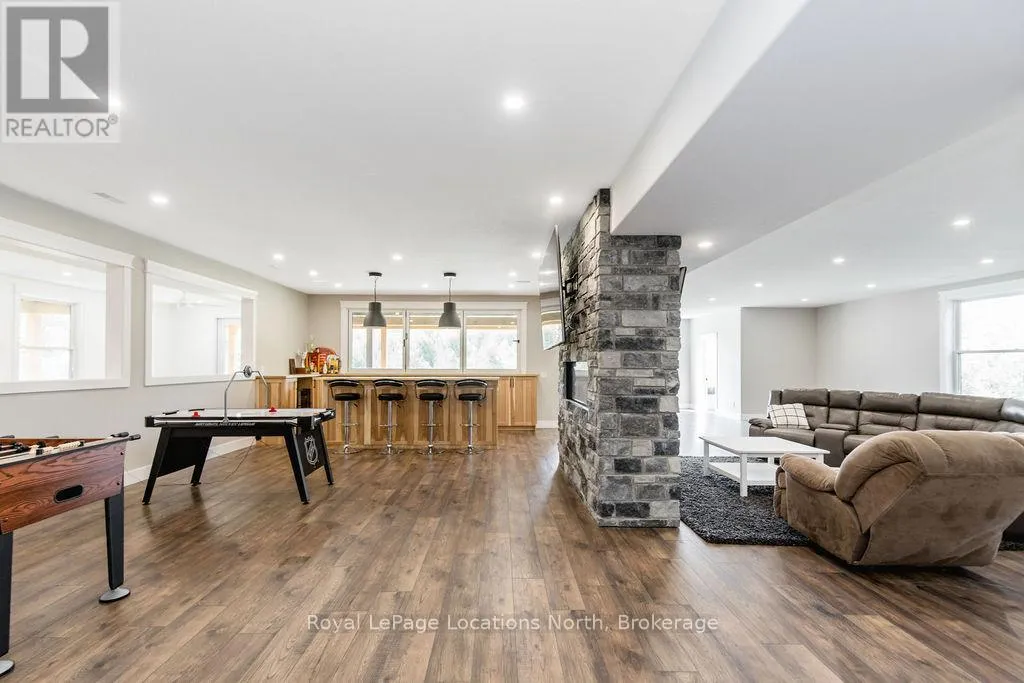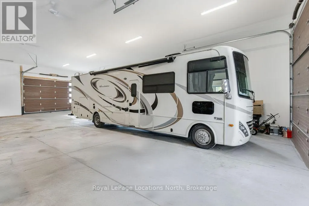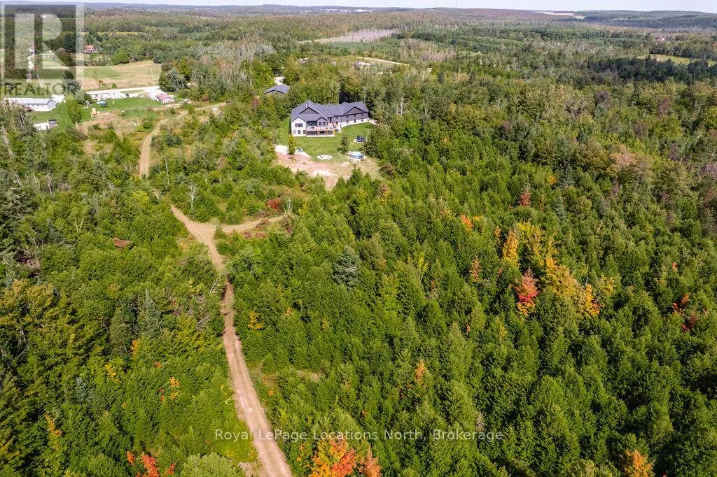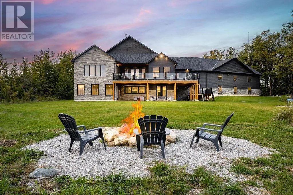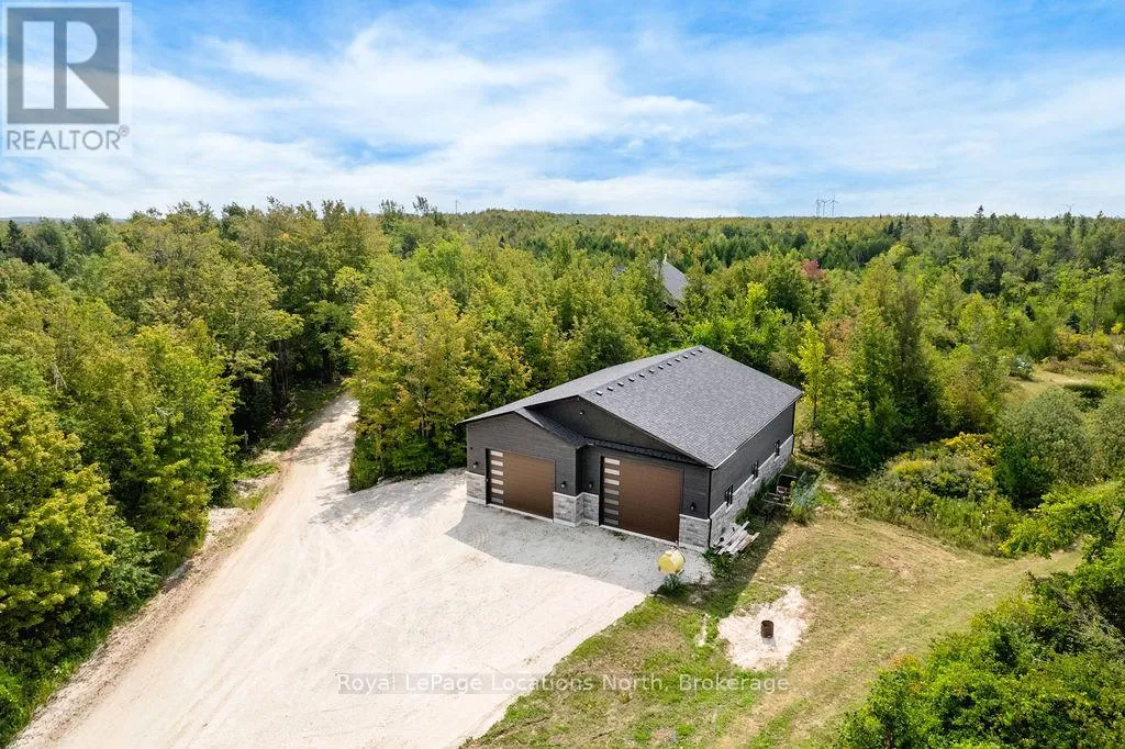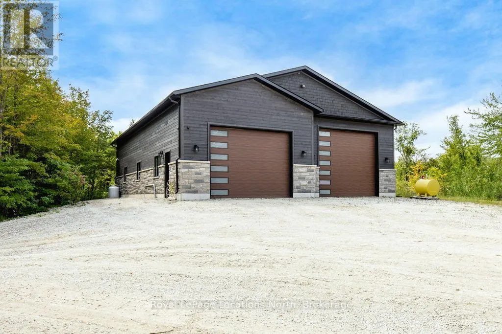 Cross Streets: Road 63 and 8th Concession B. ** Directions: Road 63 to 8th Concession B. Welcome to a truly rare private estate set on 92 acres of pristine countryside with kilometres of private trails, mature forest, and an operational sugar shack built from on-site harvested timber with 300 maple taps. This 8,000+ total sq ft custom-built luxury home offers potential for 7-8 bedrooms plus an in-law suite, ideal for a multi-generational family compound, luxury retreat, or estate property.Designed for comfort and efficiency, the home features in-floor radiant heating throughout, two furnaces, and an oversized 3-car garage with inside entry to a spacious mudroom, mezzanine storage, and workshop area. The grand open-concept living space showcases vaulted ceilings, wide-plank flooring, pot lights, and large custom windows overlooking the property.The custom kitchen features a commercial-grade 46" Kucht gas range with 8 burners, oversized island, quartz countertops, custom hood, designer pendant lighting, butler's pantry, large laundry/pantry room, and built-in desk workspace. The home offers 3+2 bedrooms and 5 full plus 2 half bathrooms, all finished with quartz counters, custom vanities, tile surrounds, and designer lighting. A formal office with French doors supports remote work with strong high-speed internet.The primary suite includes its own heating zone, walk-in closet, and spa-inspired ensuite with floating tub, glass shower, and double vanity. The lower level offers 9-ft ceilings, a bar with folding window for indoor-outdoor entertaining, double-sided stone fireplace, wired theatre room, games room, gym with walkout, and a separate garage entrance with future locker or mudroom potential. Integrated sound system throughout the home, deck, and gym.Outside, enjoy a covered front porch with glass railings, armour stone steps, gardens, vegetable beds, and a cleared area for campouts or future use. The 3,000 sq ft heated shop features radiant floors, 16-ft ceilings, its own propane tank, and oversized garage doors. (id:27476)