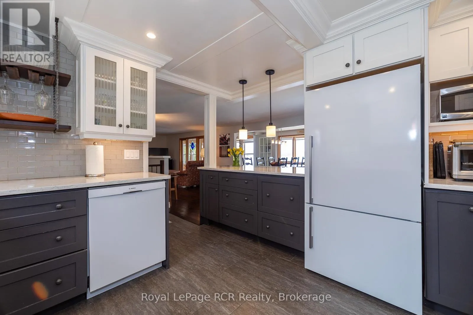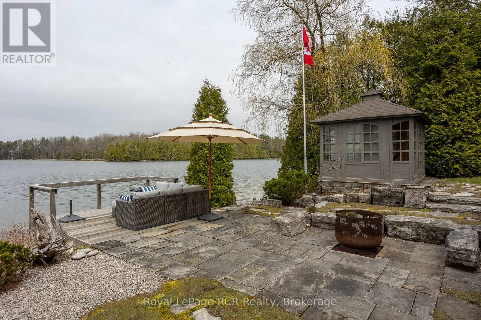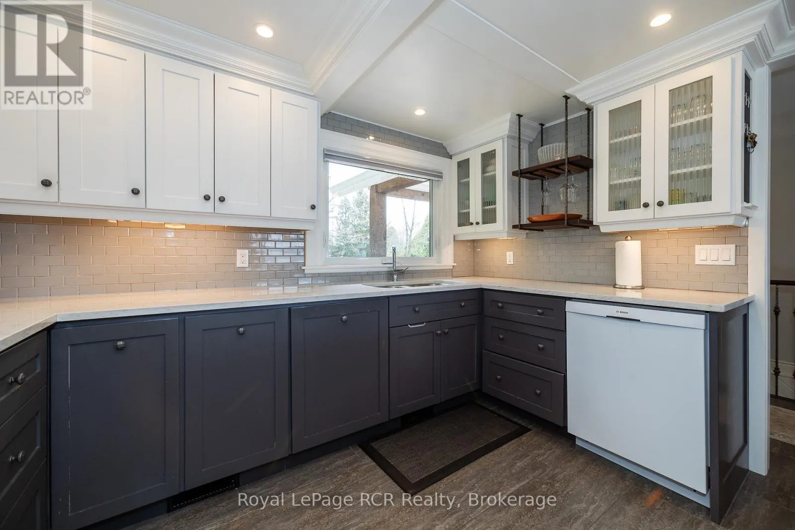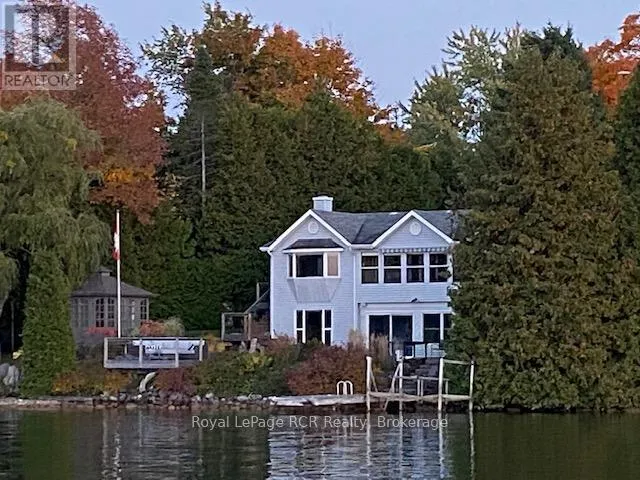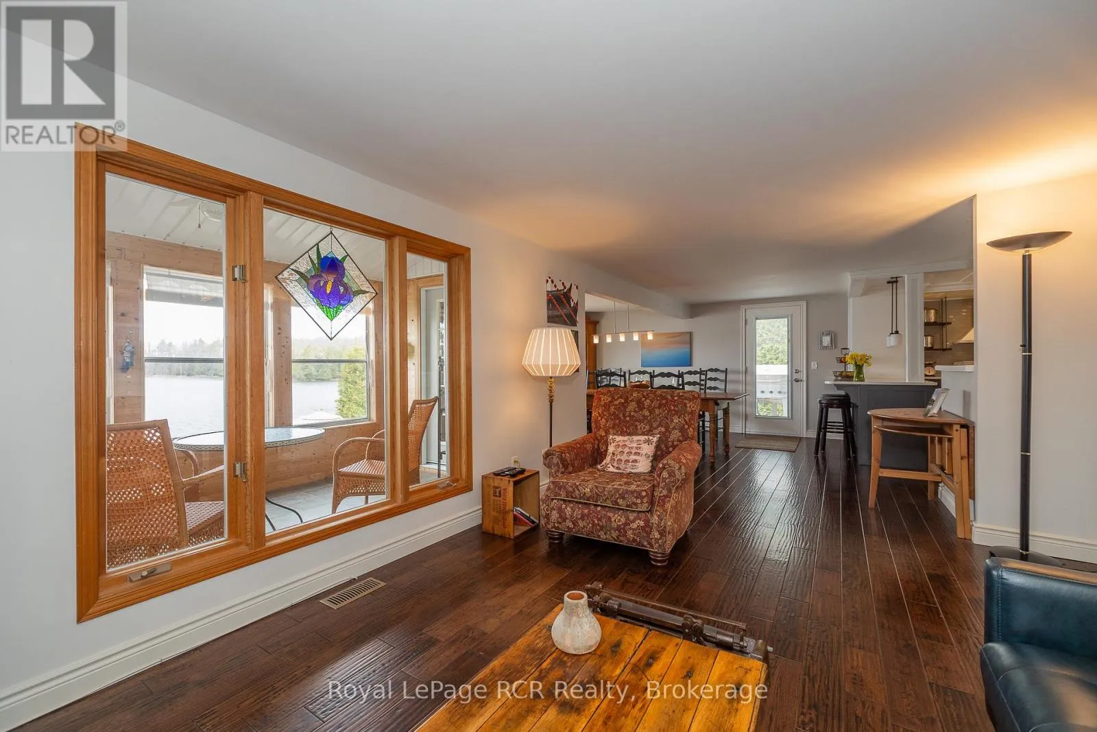 Sideroad 30 to Sunset Point 123' waterfront on Sunset Point, Lake Eugenia with unobstructed views from nearly every room on both levels. Enjoy the open kitchen, dining and living areas with direct access to the light-filled sunroom. Lower level walkout features a family room with propane free-standing stove, second kitchen, 2nd bath and great coat room with access to the attached garage. Walkout to stone patio, waterside deck, sheltered dock, enclosed gazebo, sandy beach area and everything desired in a waterfront property. Thoroughly enjoyed and lovingly maintained including updated kitchen and bath (2017), hot water tank (2023), sewage pump (2024), shingles (2010), eavestrough with leaf guard (2023). Shared ownership and use of Macdonald Farm with 127 acres of trails for recreational use. (id:27476)